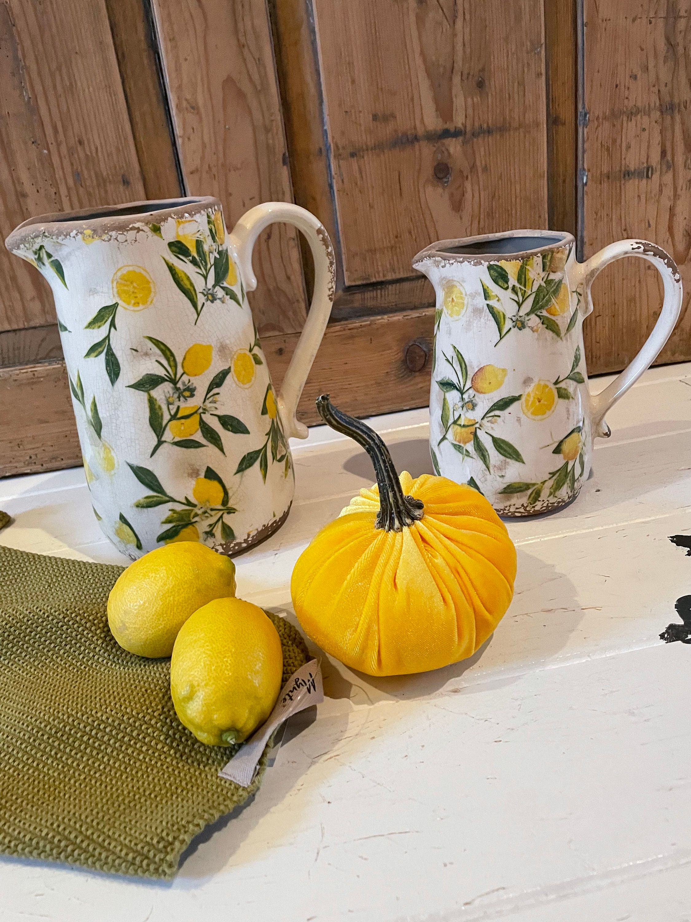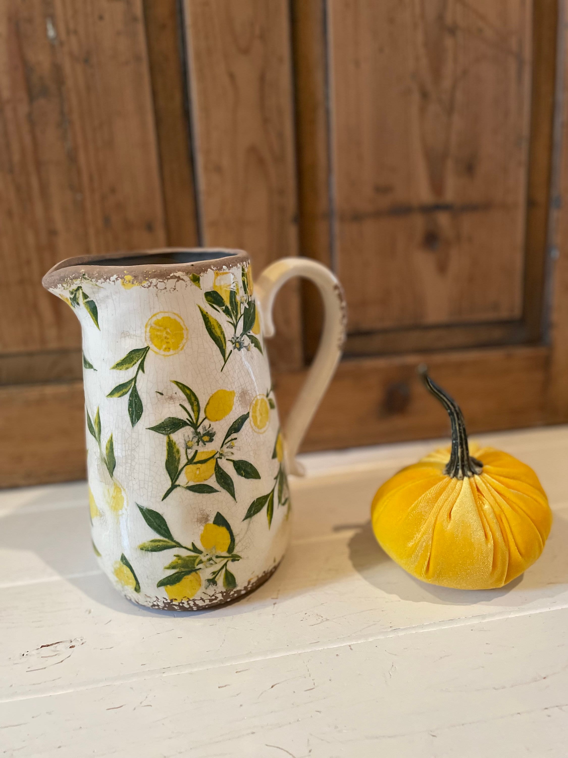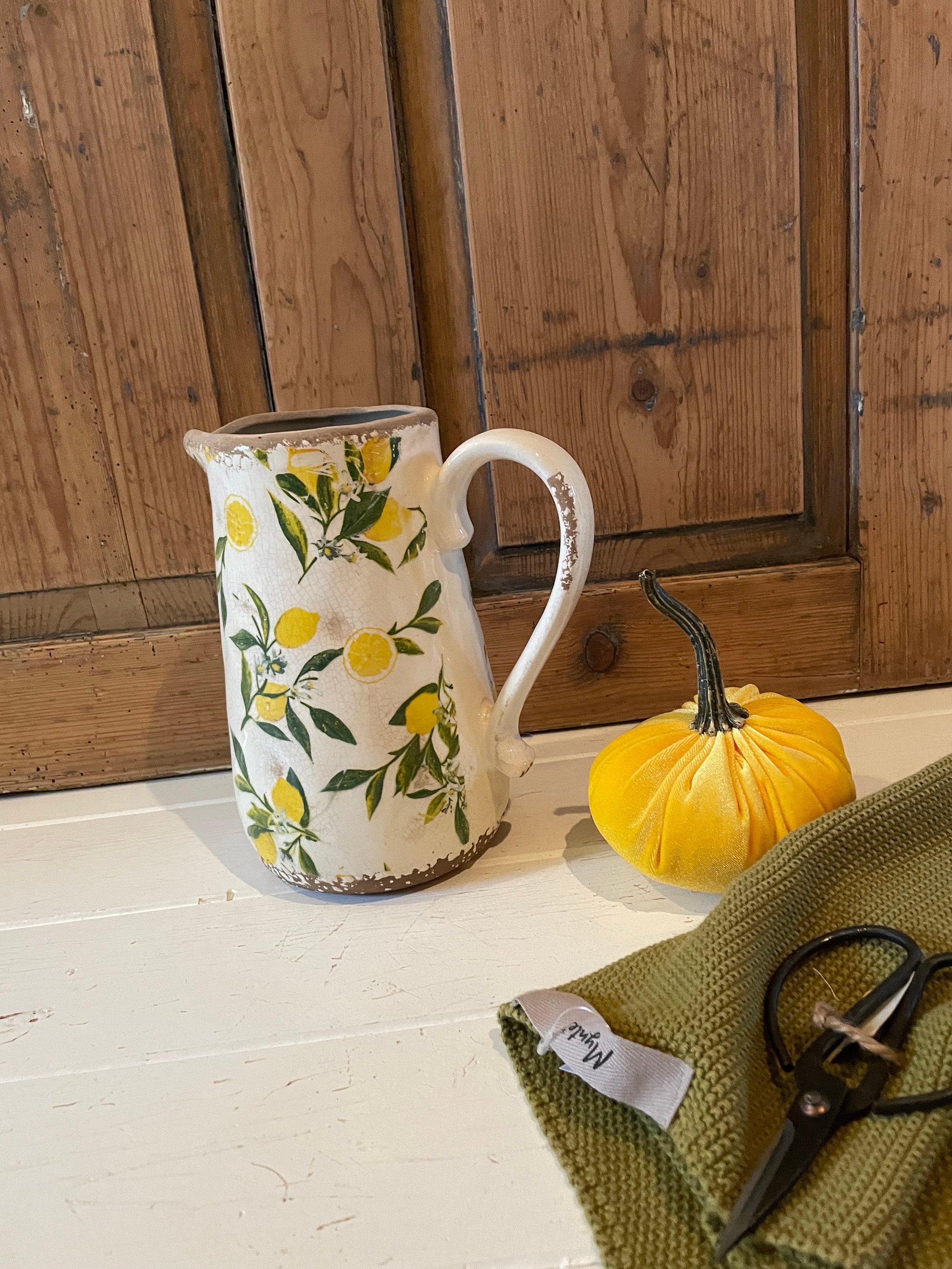 A ceramic jug - this enchanting jug was modeled on the French country house look - a lovely lemon pattern combined with this beautiful old cracked patina, as if the jug were decades old - it reminds you of times gone by and is a beautiful companion for fresh meadow bouquets, branches or dried grasses - create your own ambience.