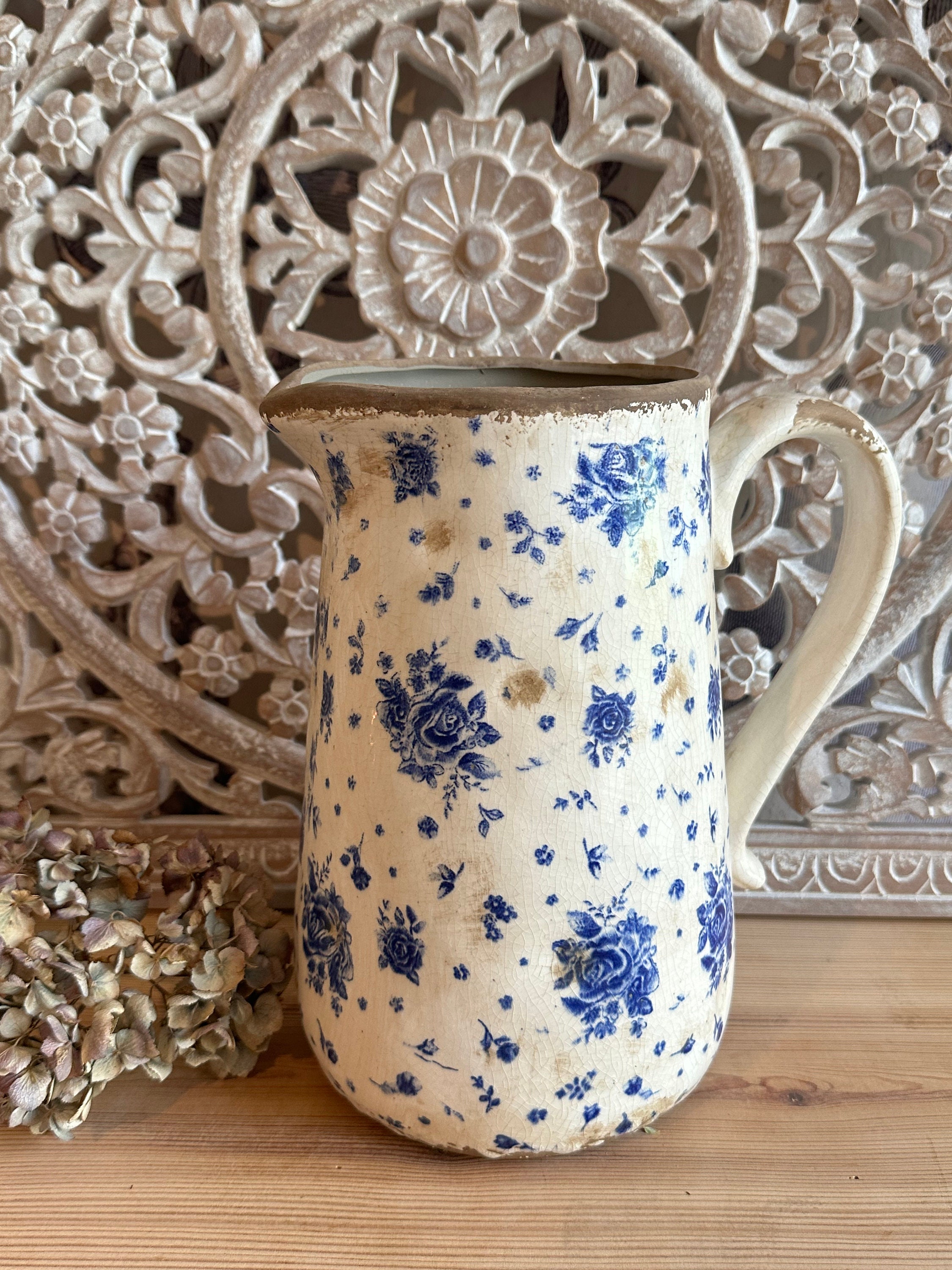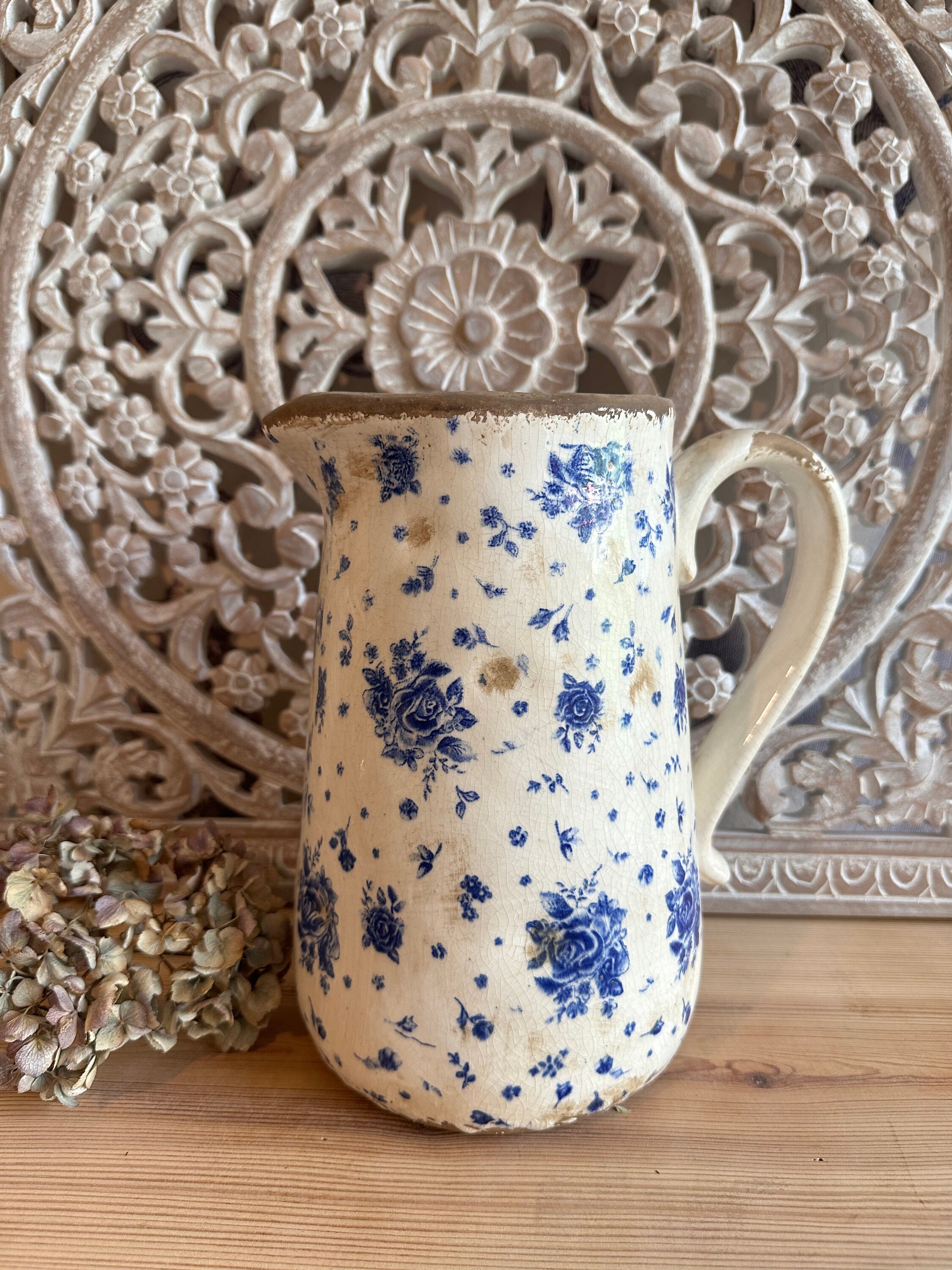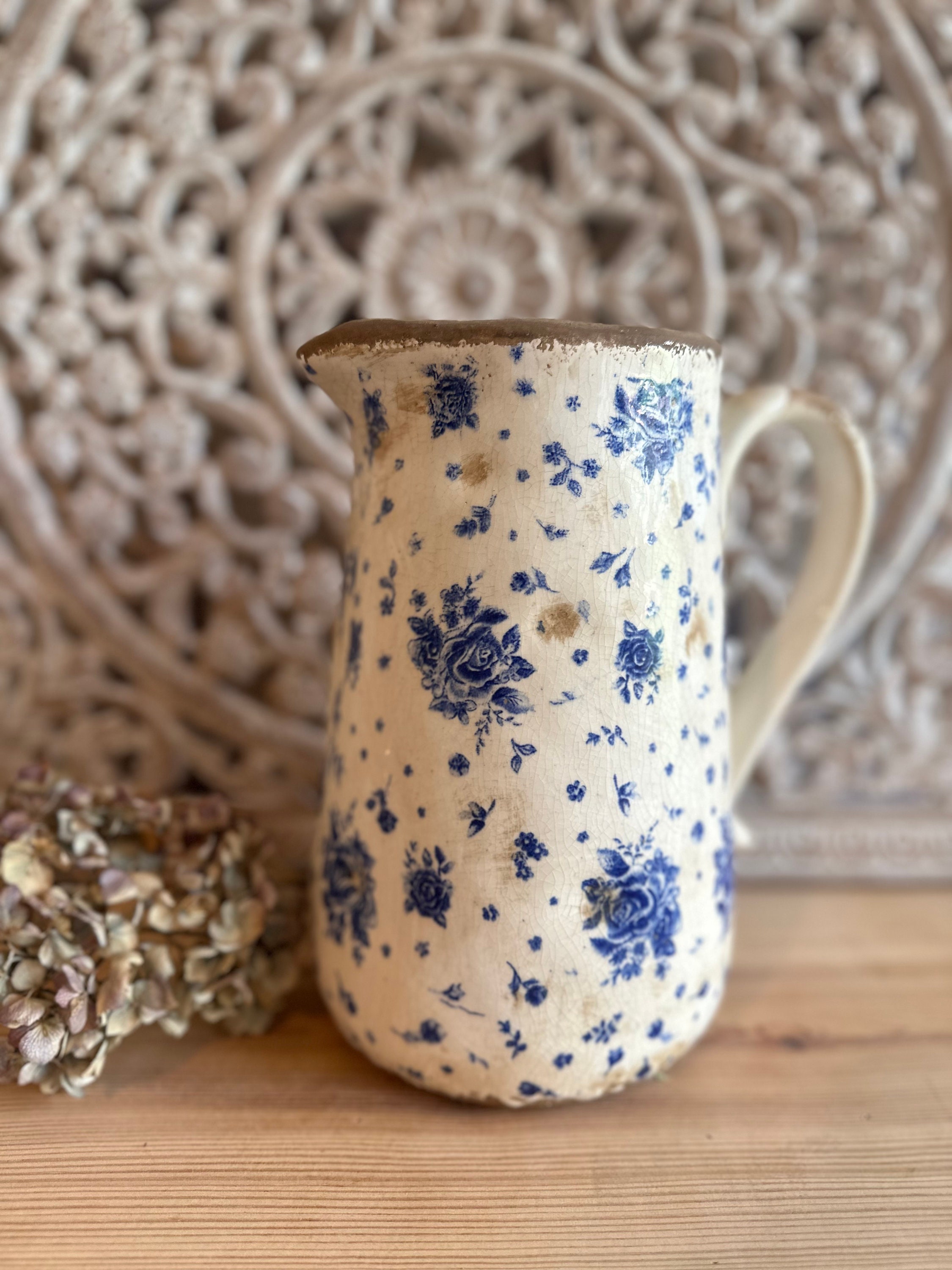 A ceramic jug - this enchanting jug was modeled after the French country house look - a lovely rose pattern combined with this beautiful old cracked patina, as if the jug were already decades old - it evokes memories of bygone times and is a beautiful companion for fresh meadow bouquets, branches or dried grasses - create your own ambience.
