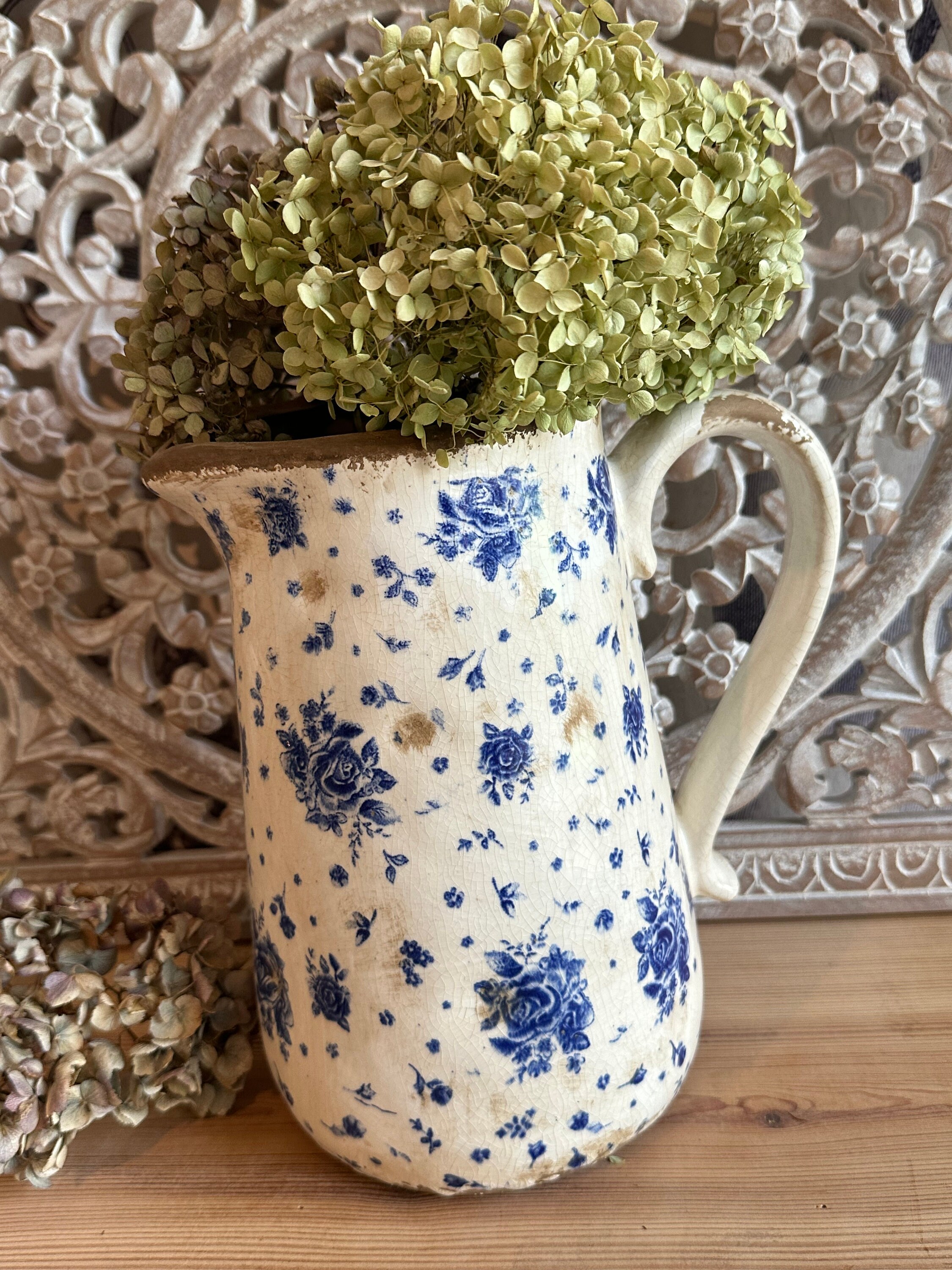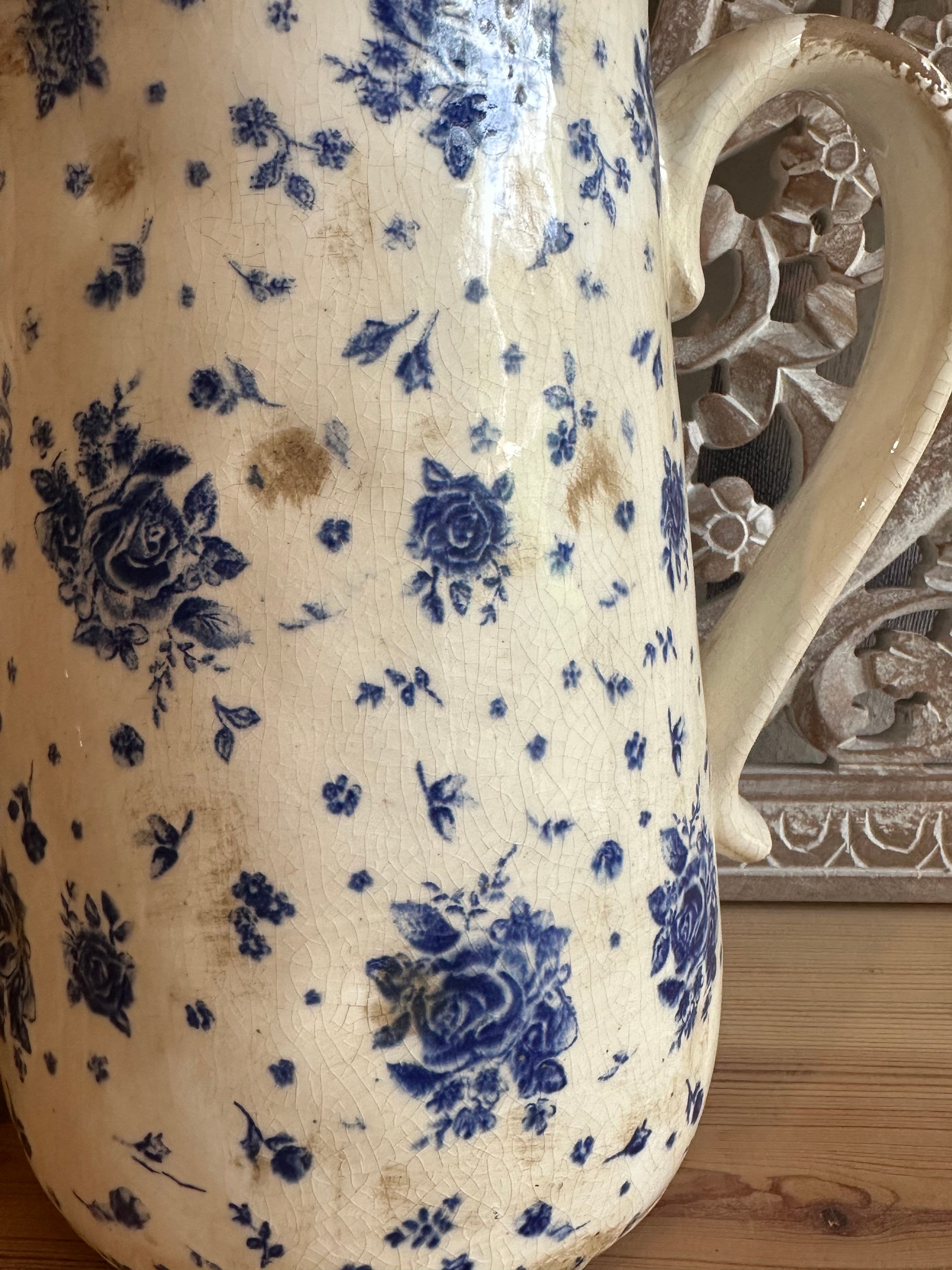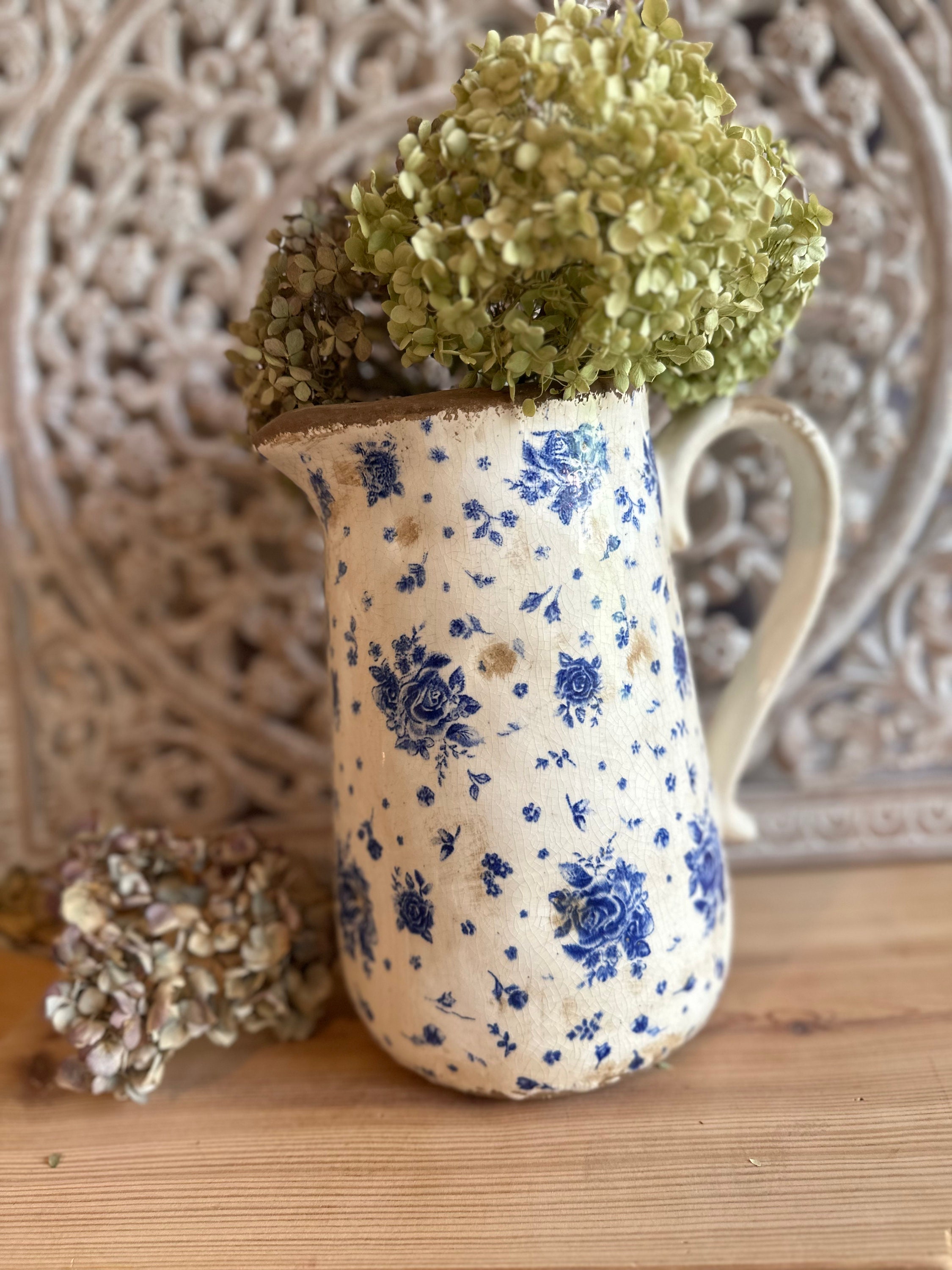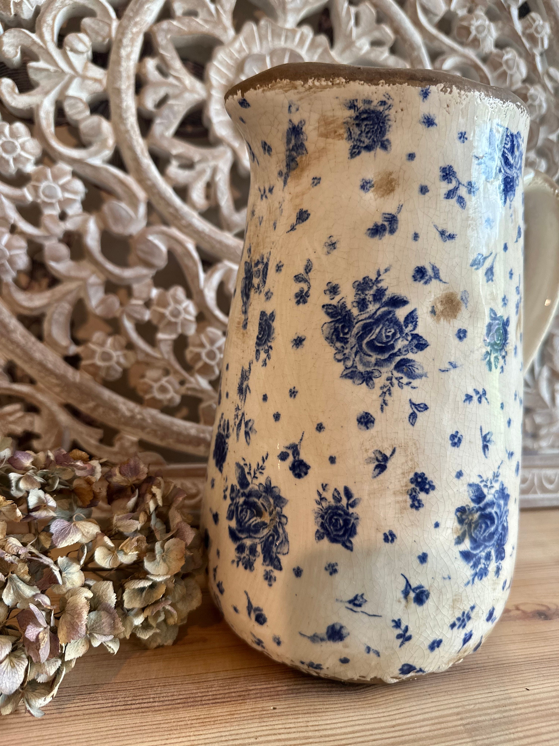A ceramic jug - this enchanting jug was modeled after the French country house look - a lovely rose pattern combined with this beautiful old cracked patina, as if the jug were already decades old - it evokes memories of bygone times and is a beautiful companion for fresh meadow bouquets, branches or dried grasses - create your own ambience.