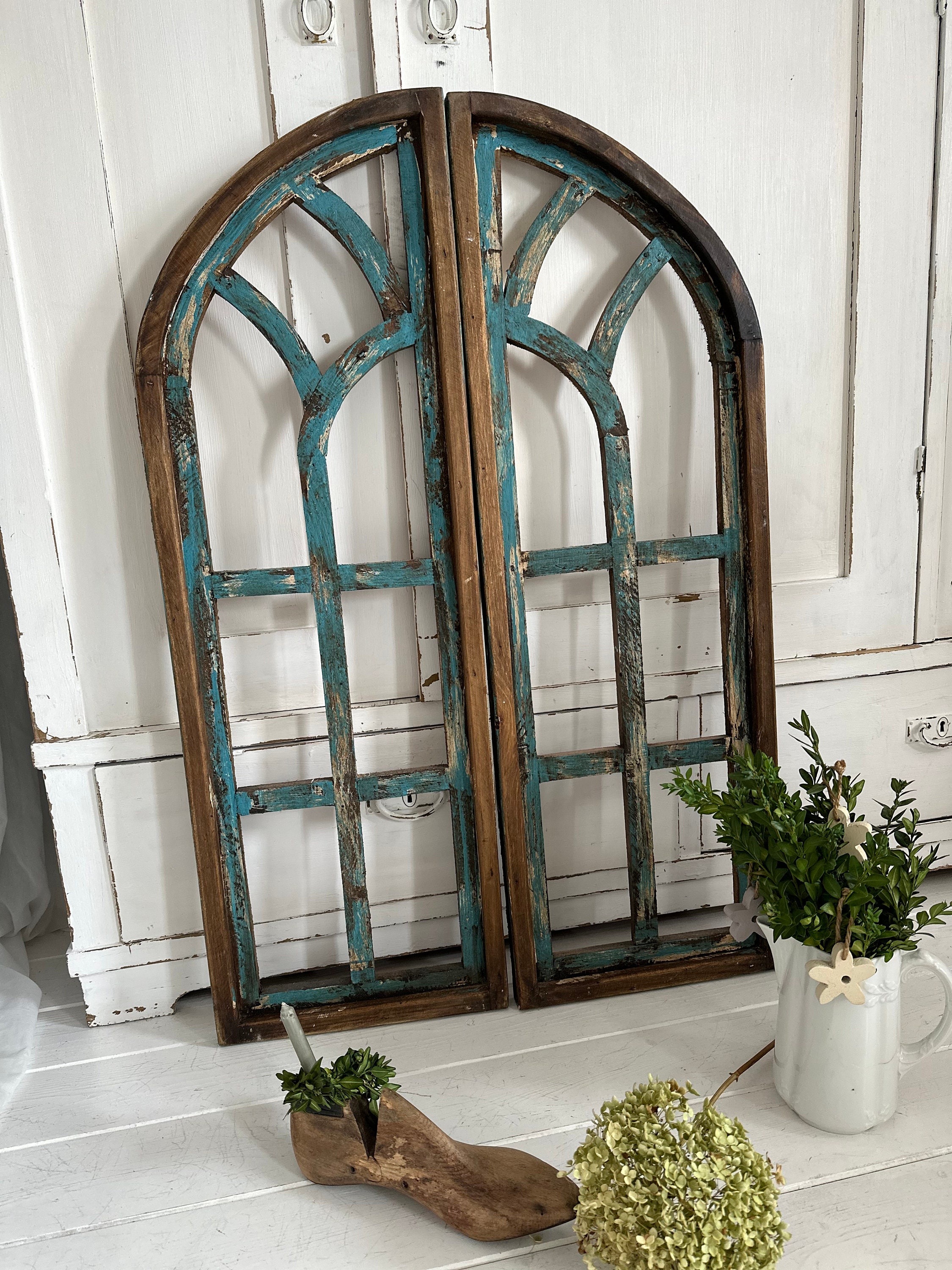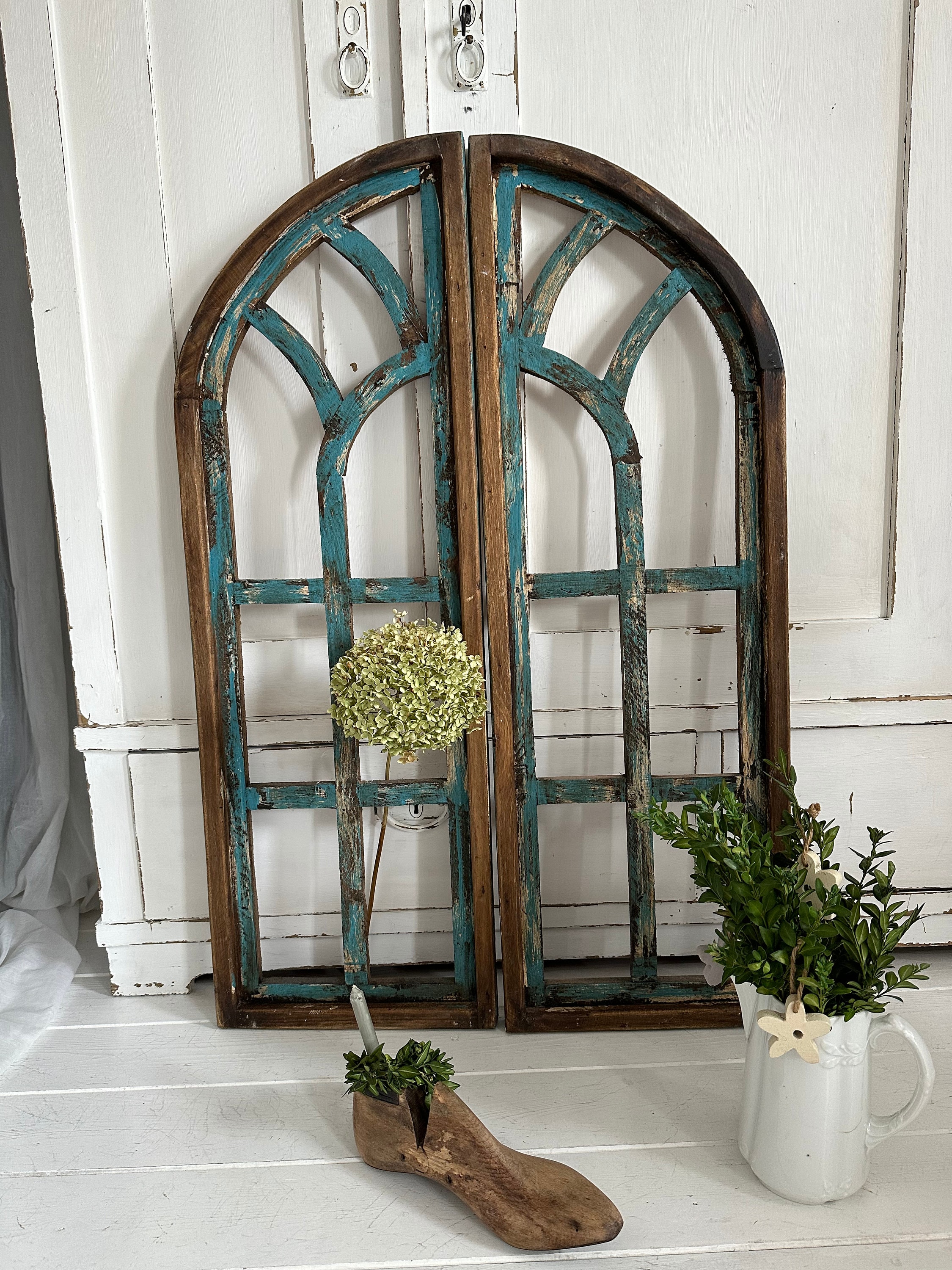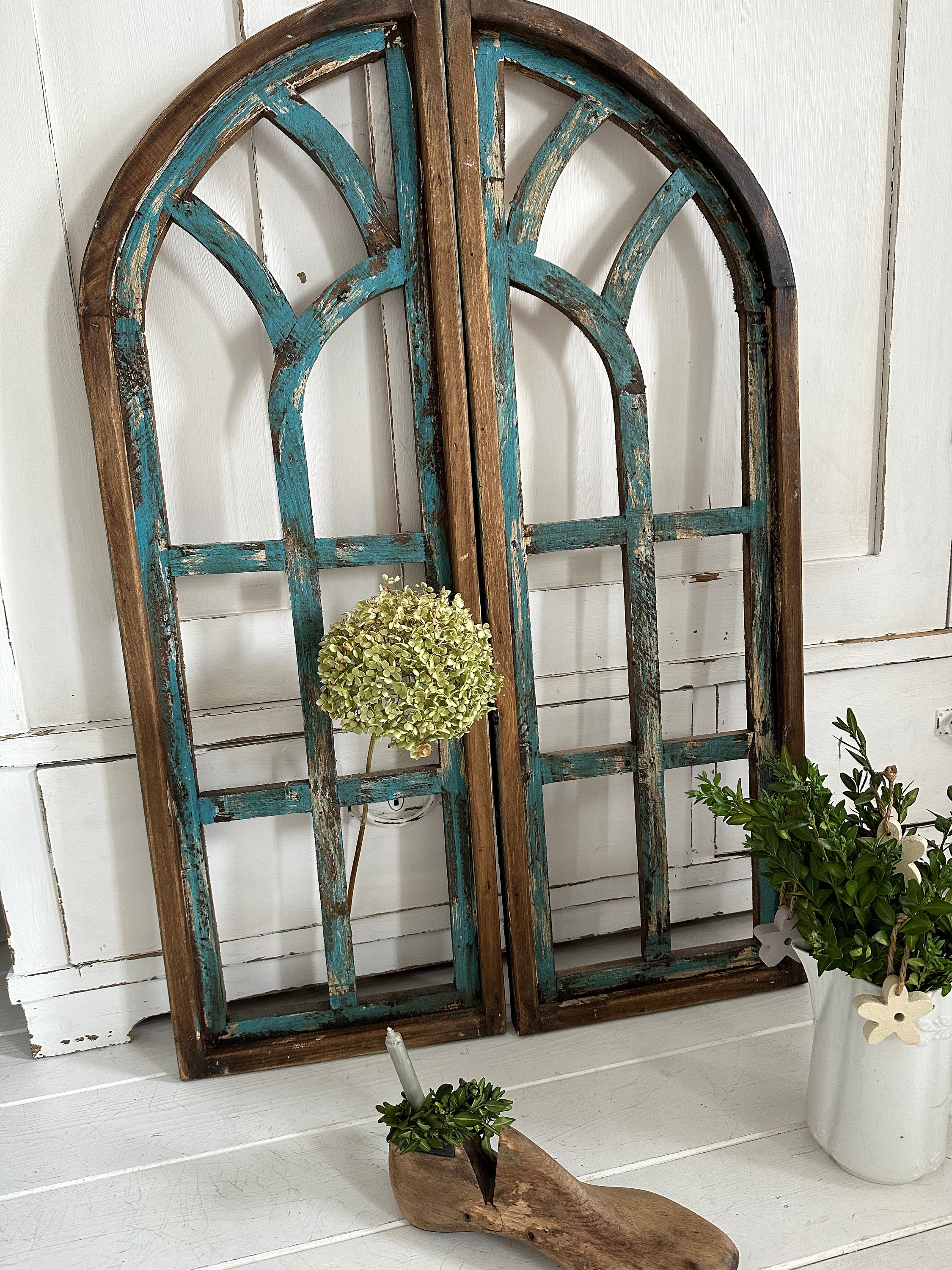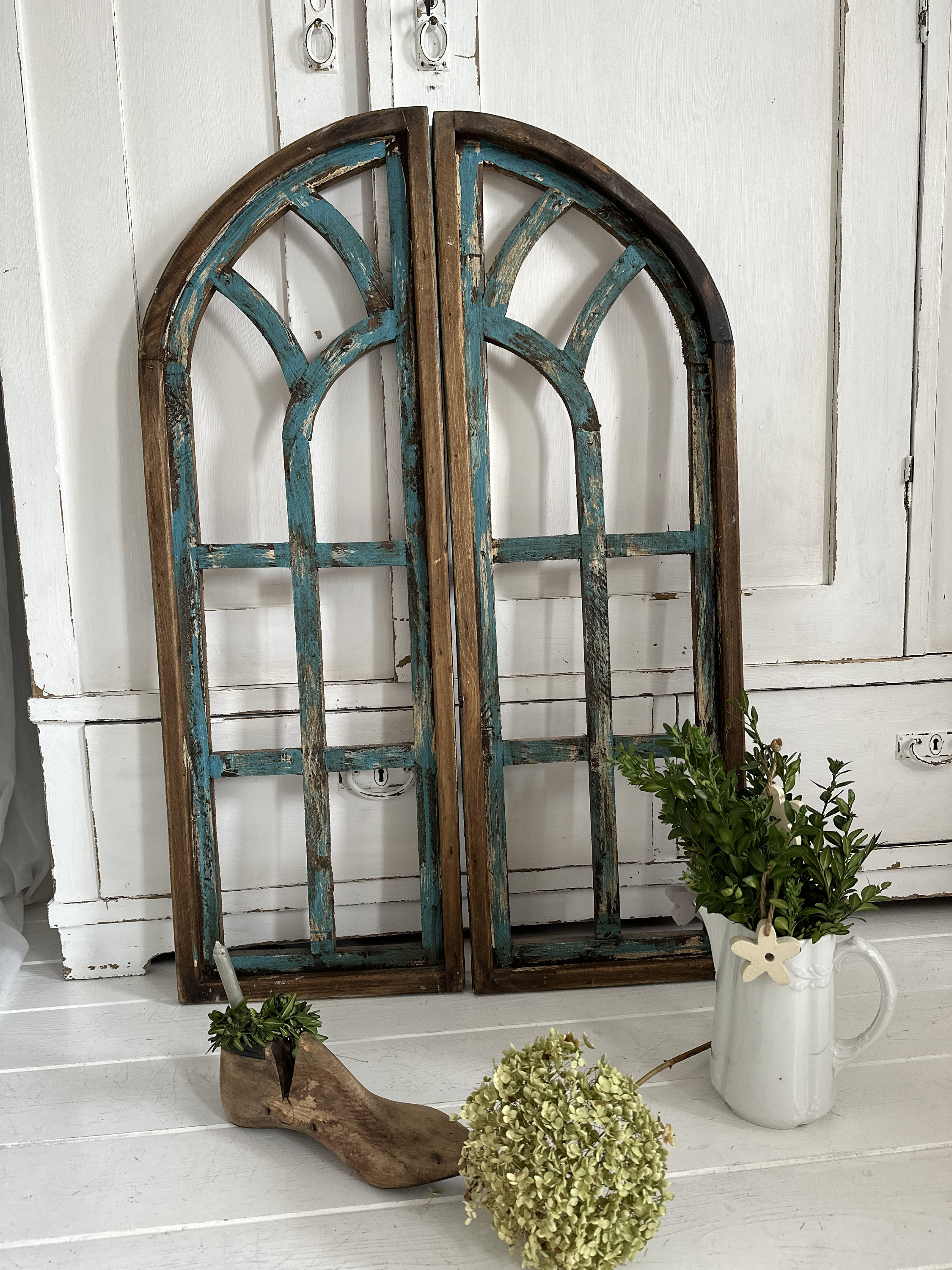 Arched windows – with plenty of patina. Do you love to wander back in time with your thoughts and surround yourself with accessories that bring a bit of the flair of earlier times into our present? How about this window, which looks as if it had been in the ladies' room of a southern French country house for many years and offered a view of the nearby park? These windows once adorned houses and served as protection from rain, sun, and wind. Now they have outlived their usefulness, but not entirely. These window decorations can be wonderfully integrated into an individual living ambiance, for indoors or outdoors in the garden as a trellis, or built into an old stone wall… your creativity is called for ❤️