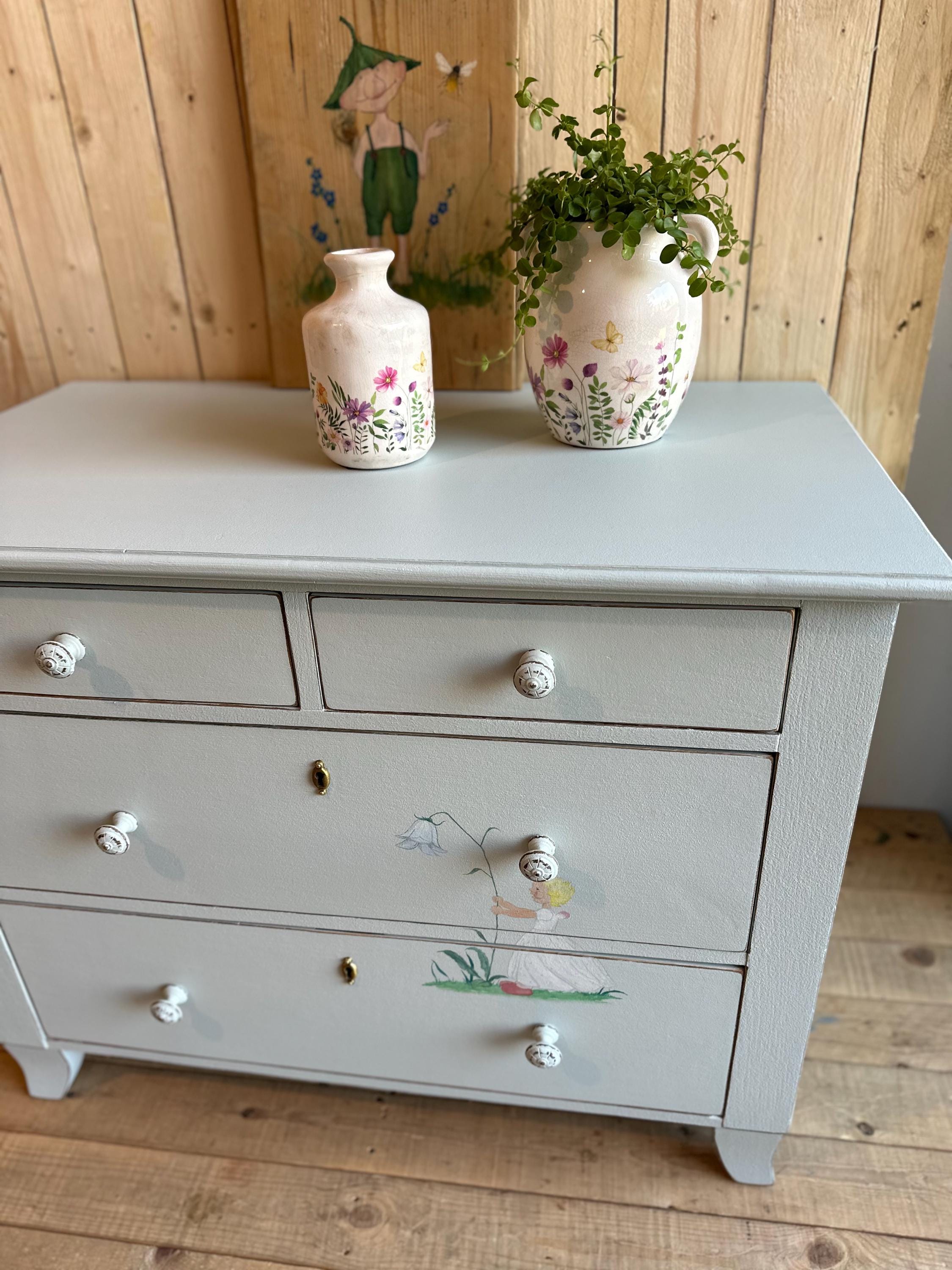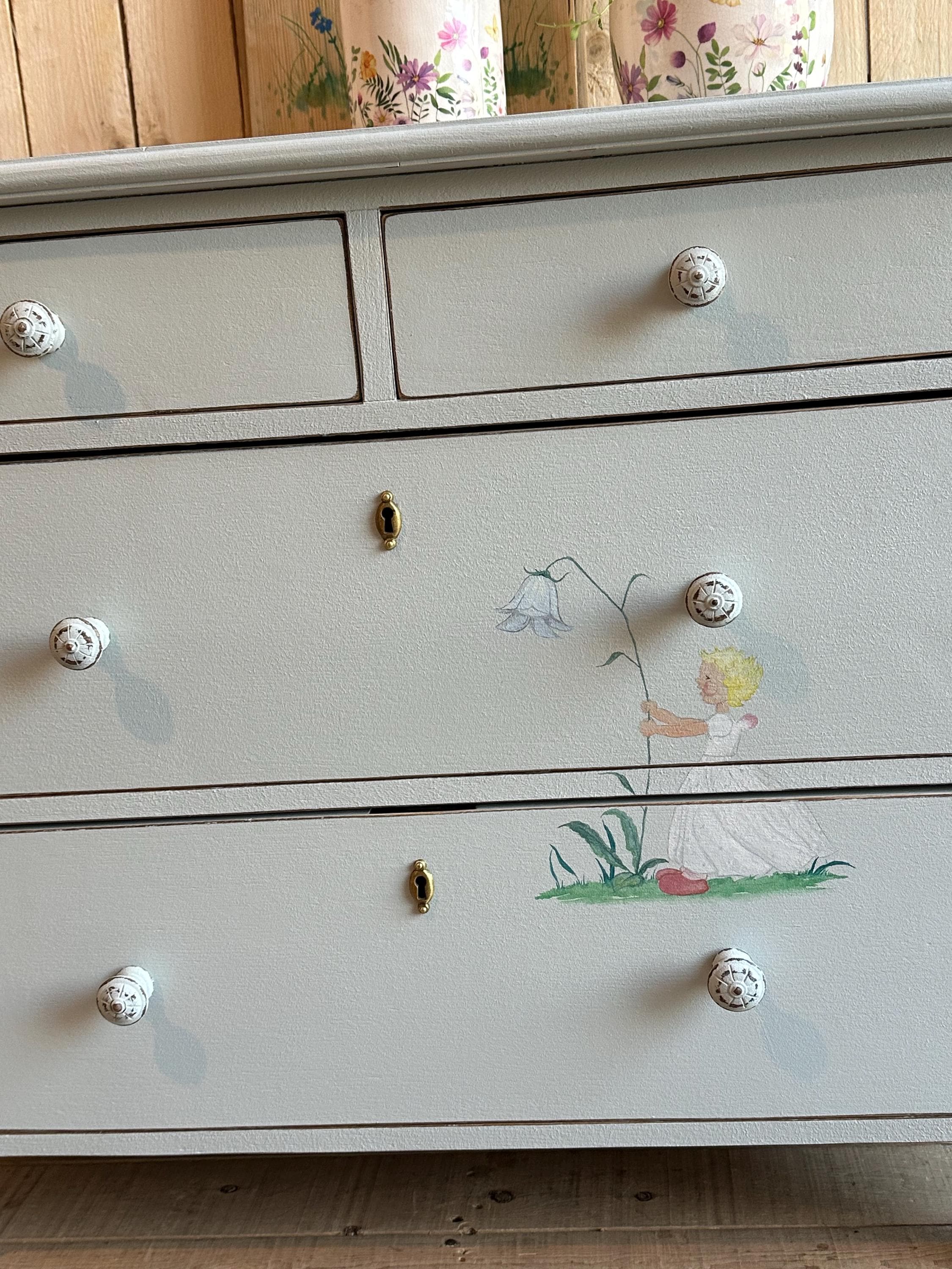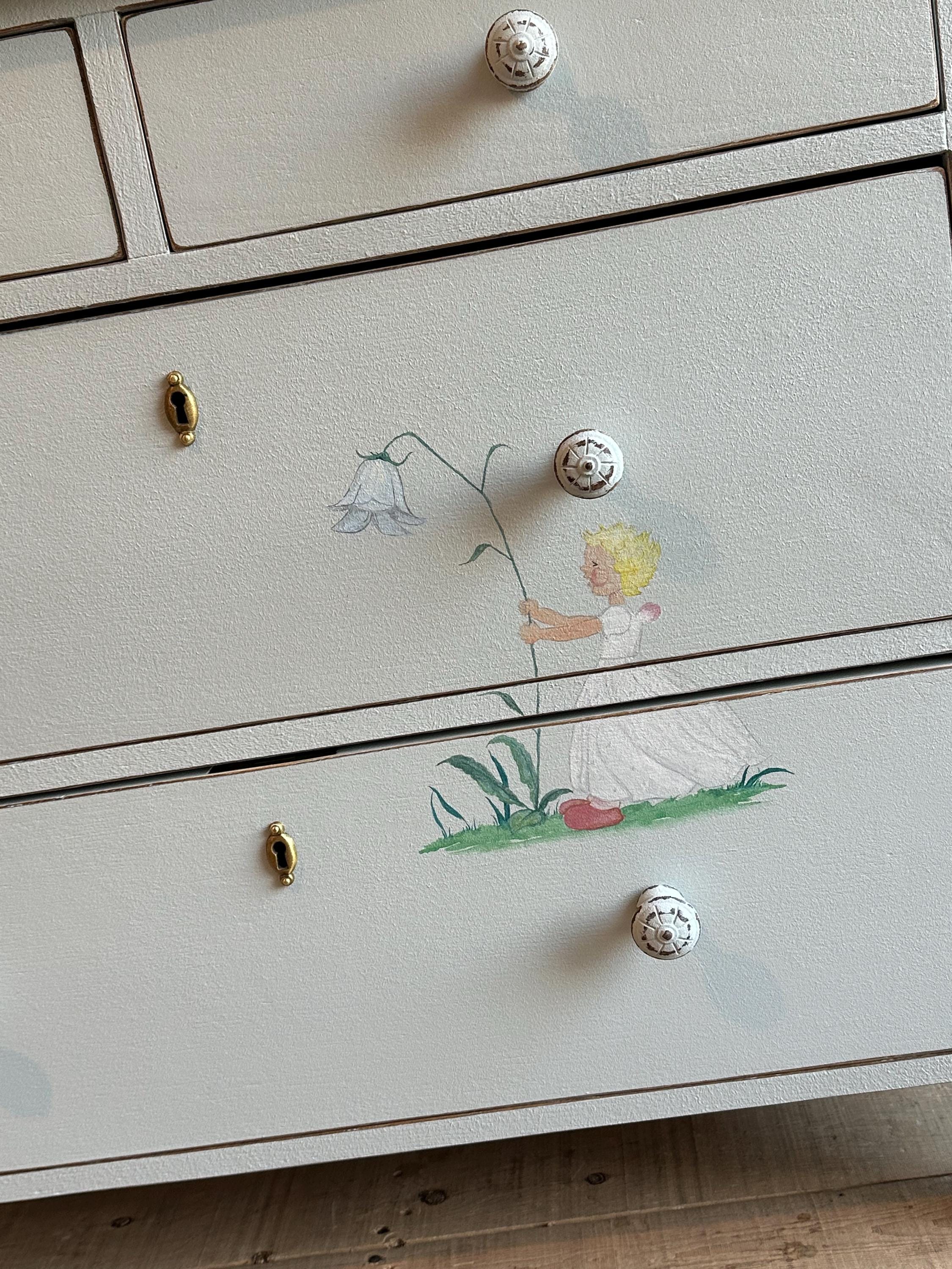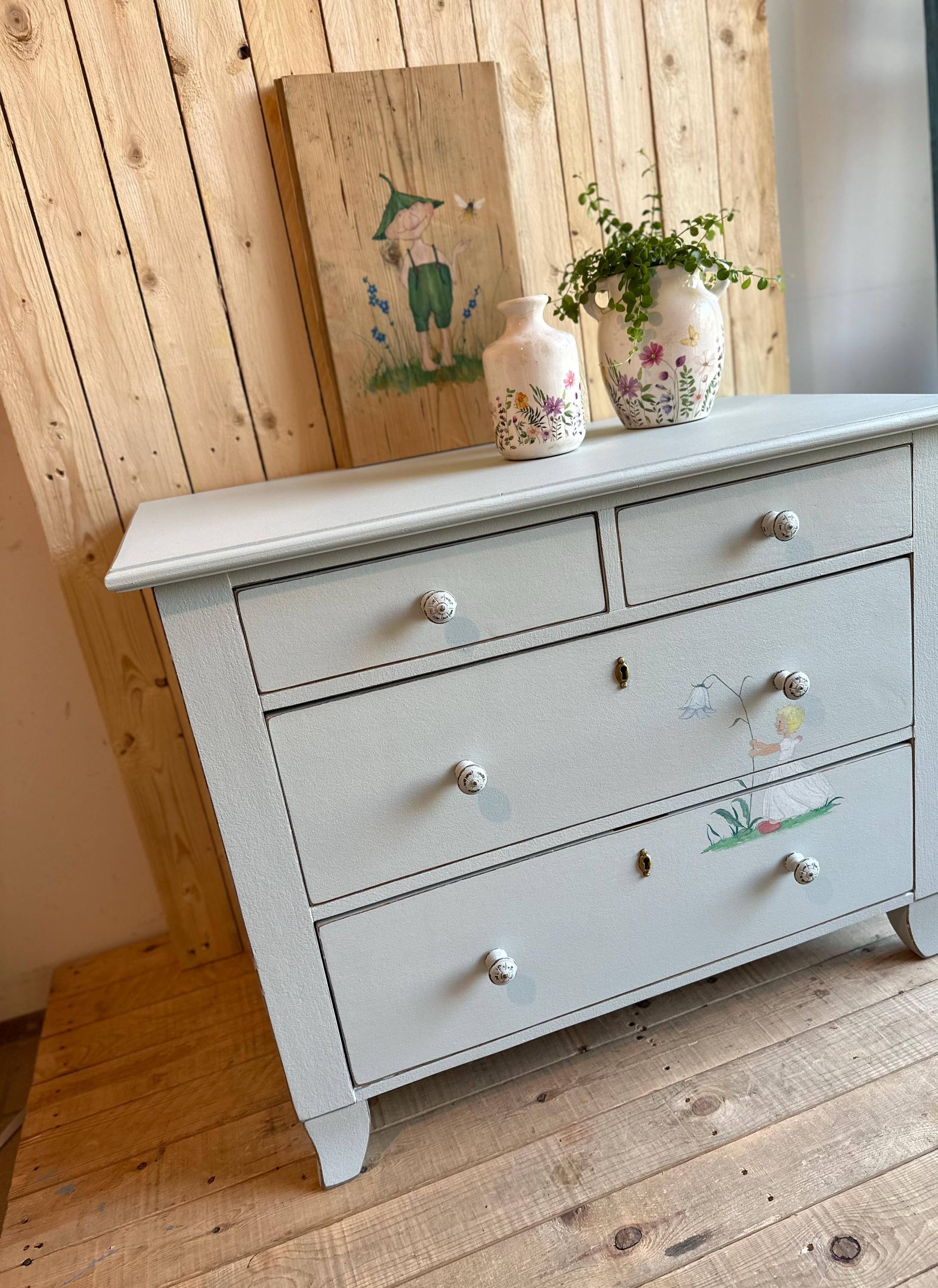Greta's dance of life - a fascination and a spectacle of colors, that's the effect of this unique, old chest of drawers, it exudes an intoxicating mood in its delicate neutral colors, a cool winter gray-blue - fresh and bright in combination with a colorful flower girl, which resembles the old Erzgebirge carvings of the flower girls....artistically enchantingly drawn by hand - uniquely beautiful and lovely to look at - the sight enchants every viewer.