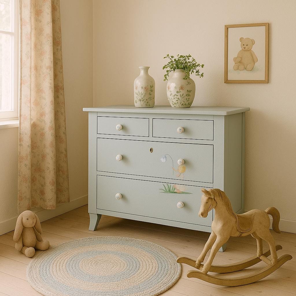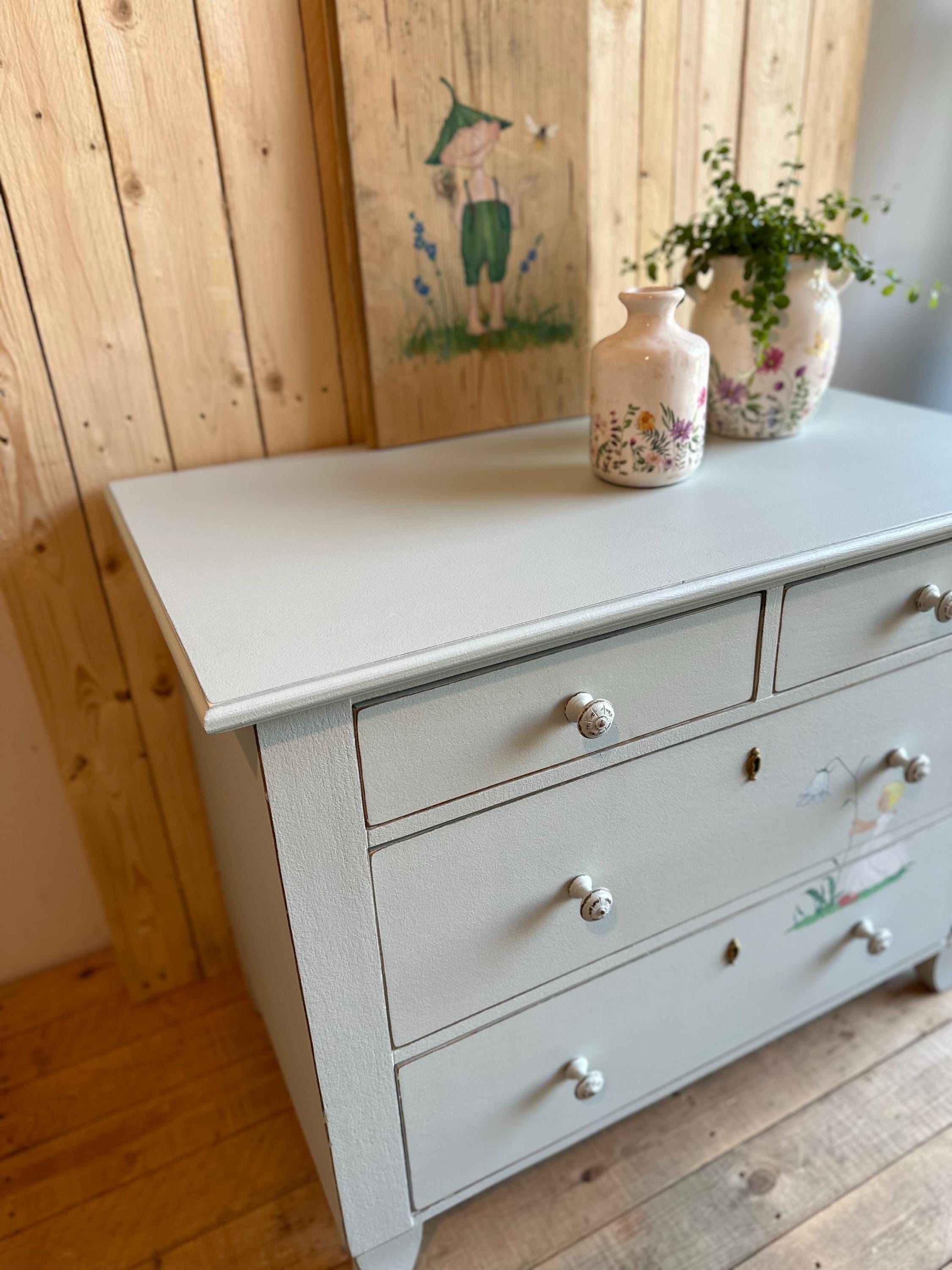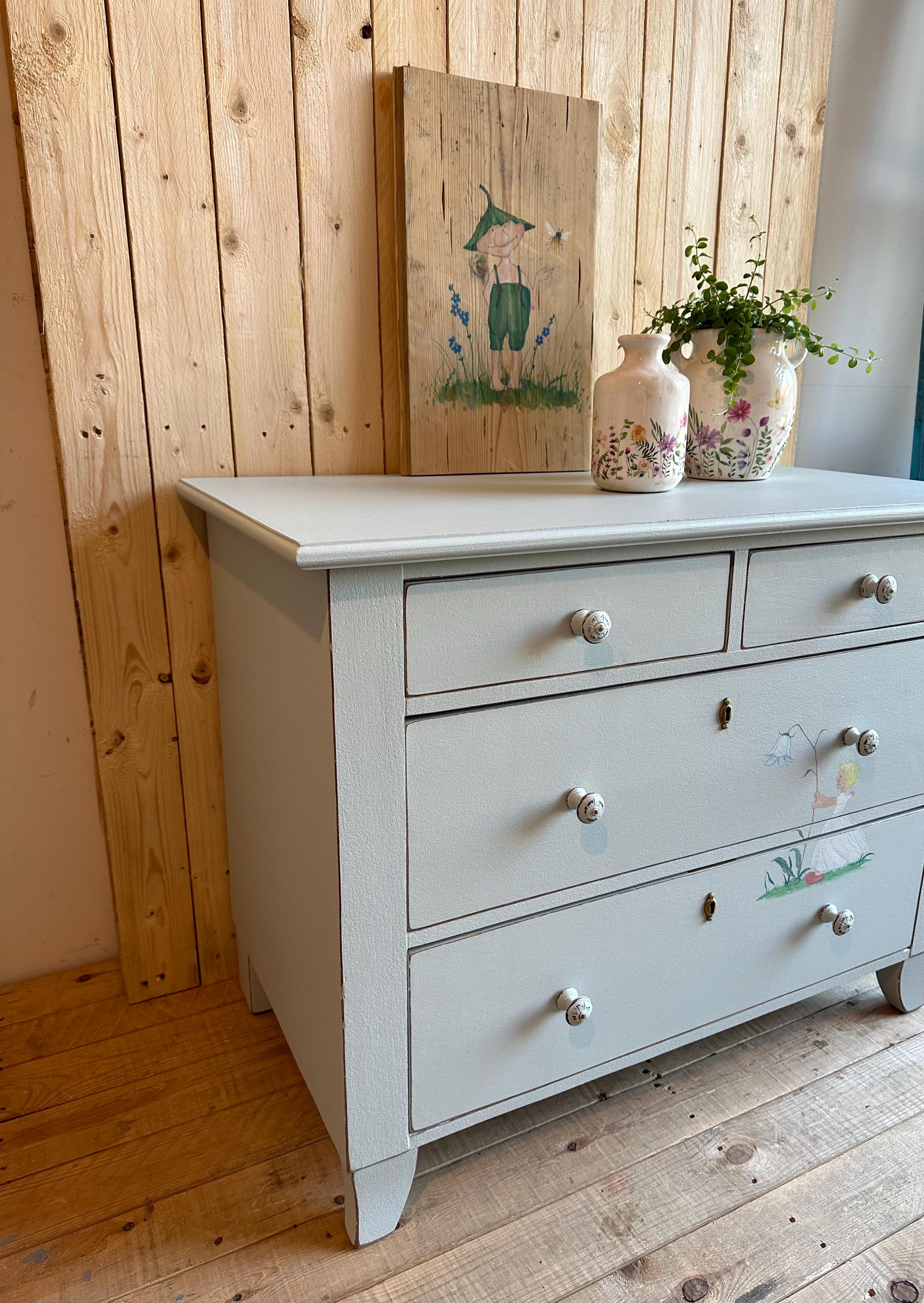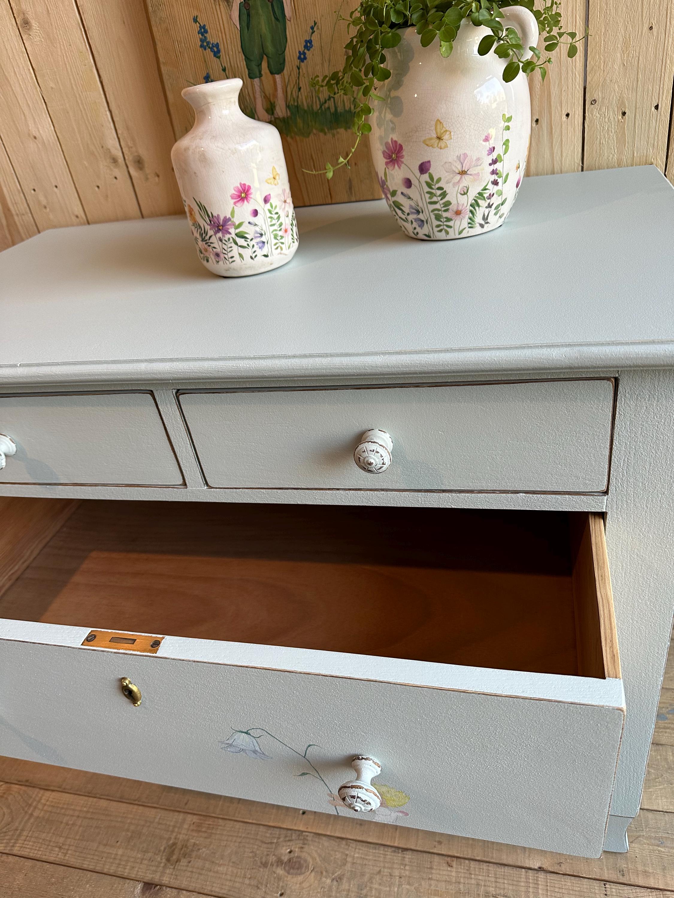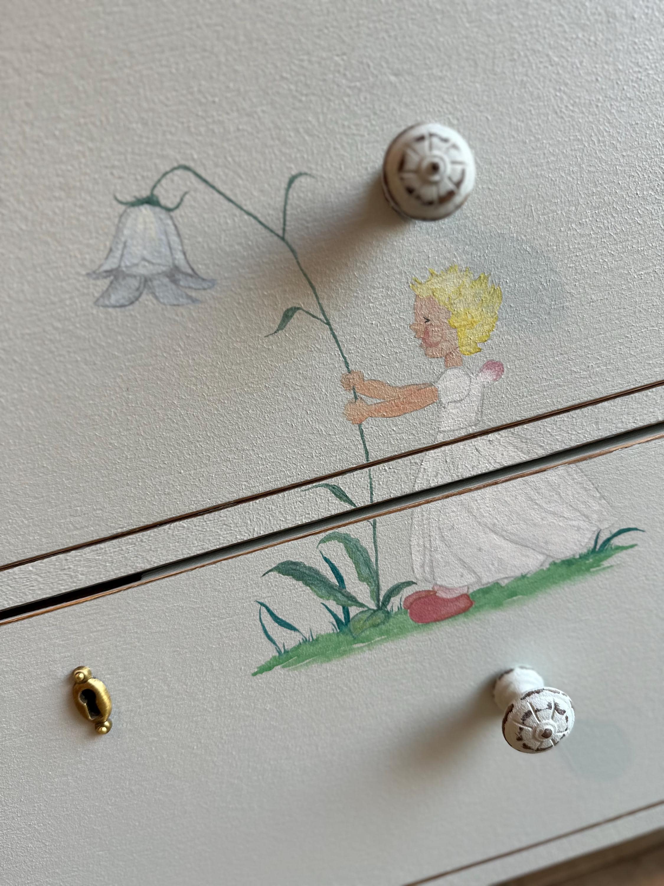 Greta's dance of life - a fascination and a spectacle of colors, that's the effect of this unique, old chest of drawers, it exudes an intoxicating mood in its delicate neutral colors, a cool winter gray-blue - fresh and bright in combination with a colorful flower girl, which resembles the old Erzgebirge carvings of the flower girls....artistically enchantingly drawn by hand - uniquely beautiful and lovely to look at - the sight enchants every viewer.