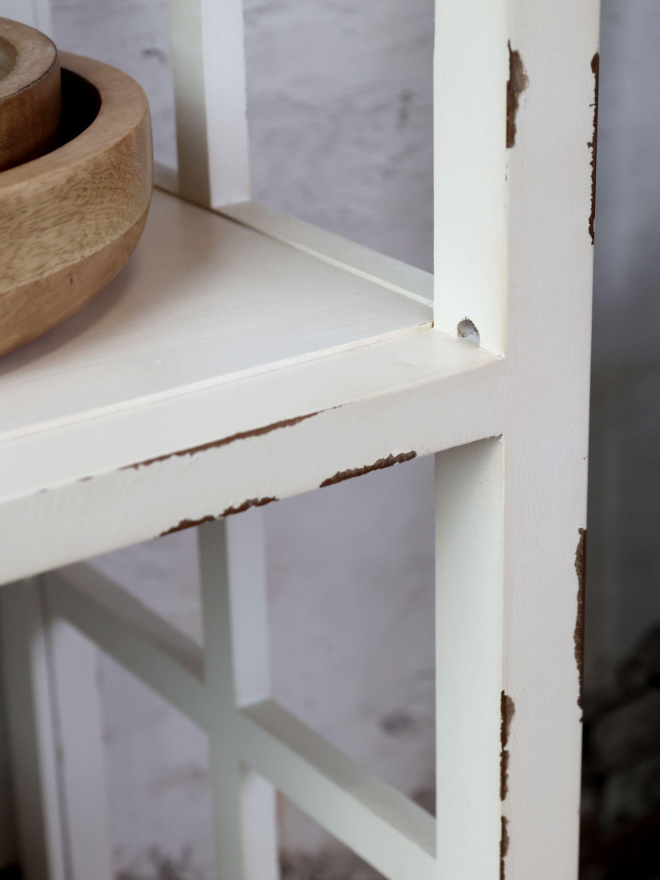 This vintage-style shelf from Chic Antique, Denmark, is made of fir wood and offers ample storage space on its shelves. This shelf also features elegant decorative details that complete the overall look of this stunning piece.