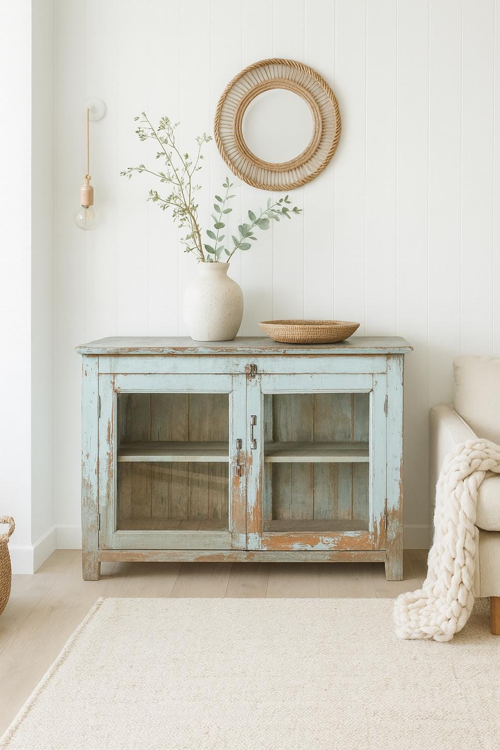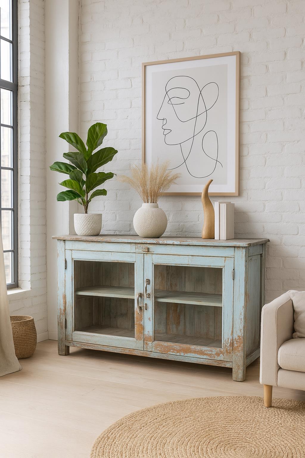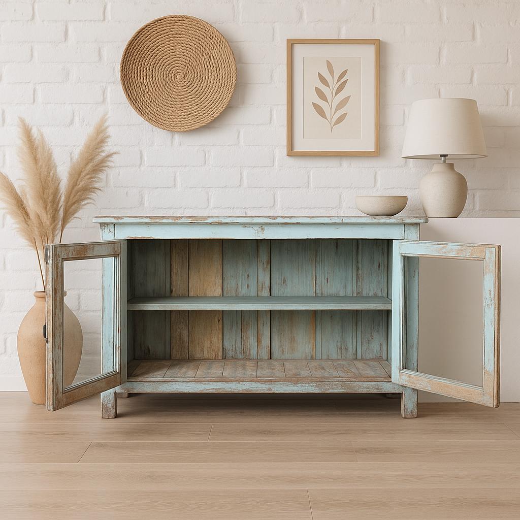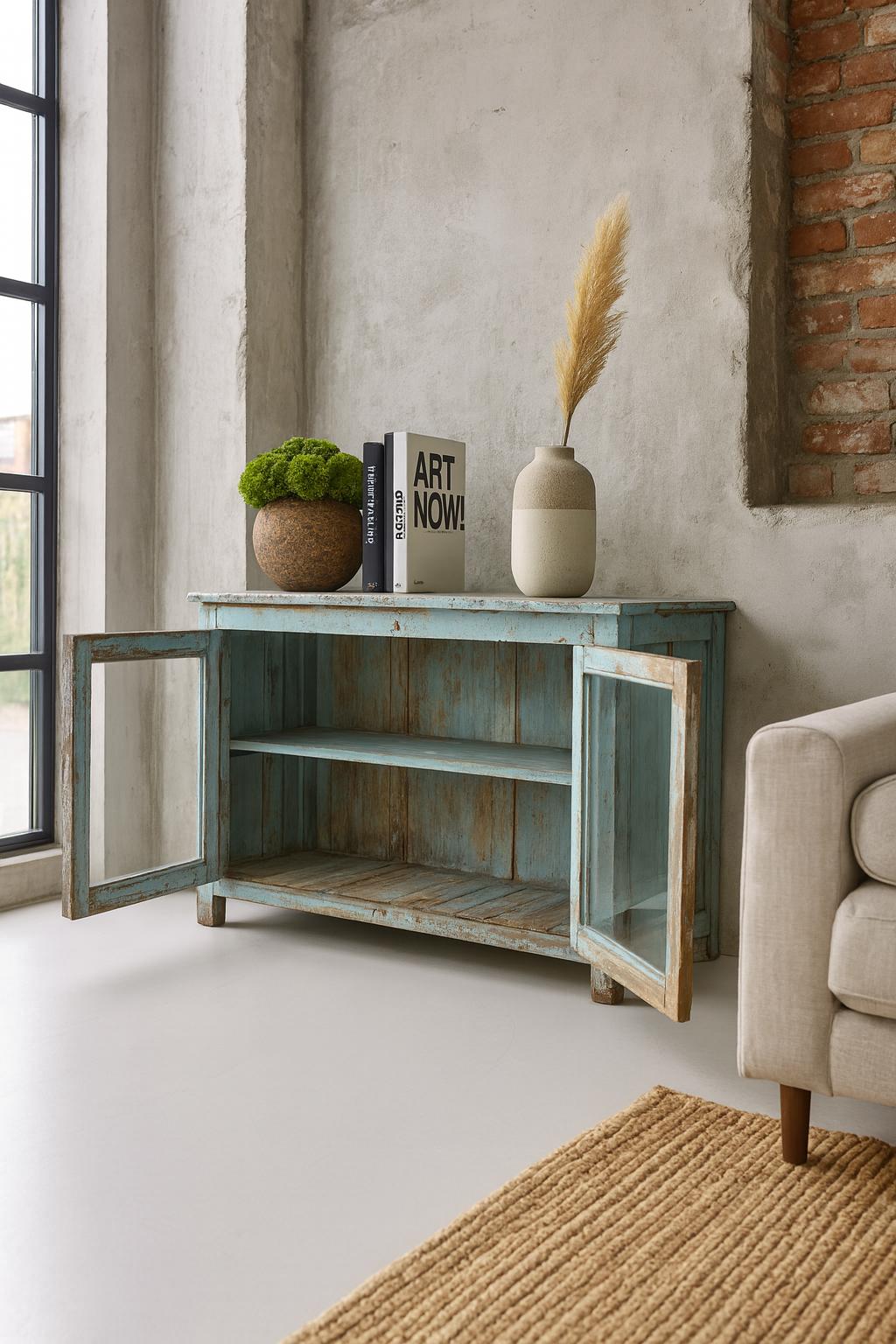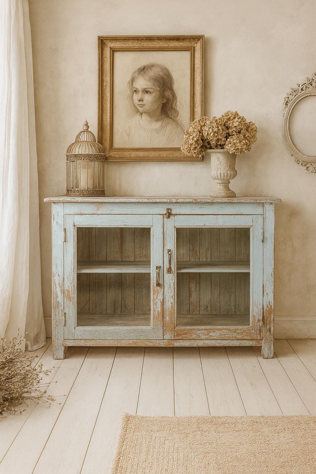 Greta's dreamy chest of drawers - an incredibly beautiful blue chest of drawers with glass doors, for storing your favorite items.
