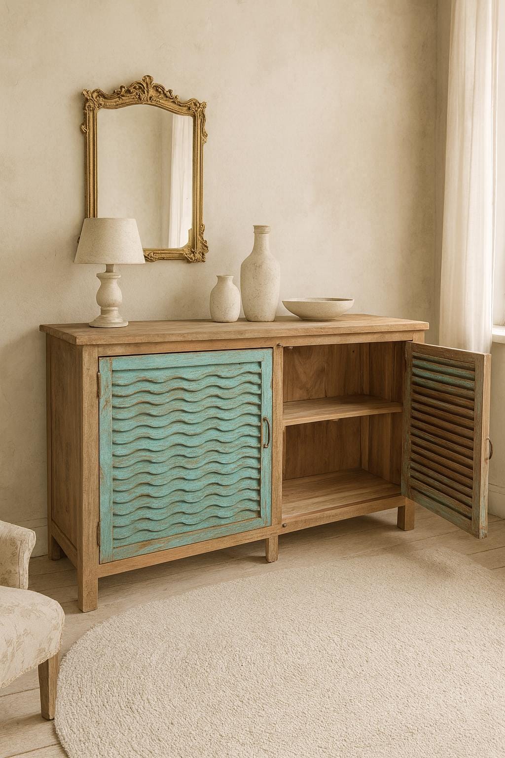 Greta's fresh chest of drawers - an incredibly beautiful sideboard with its worn flair and dreamy patina combined with natural wood and with plenty of space to store many utensils.