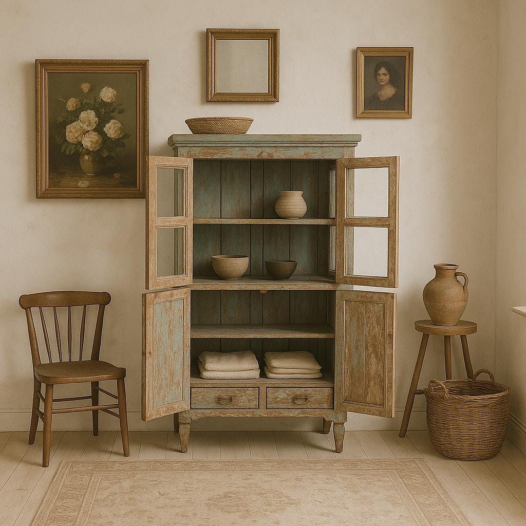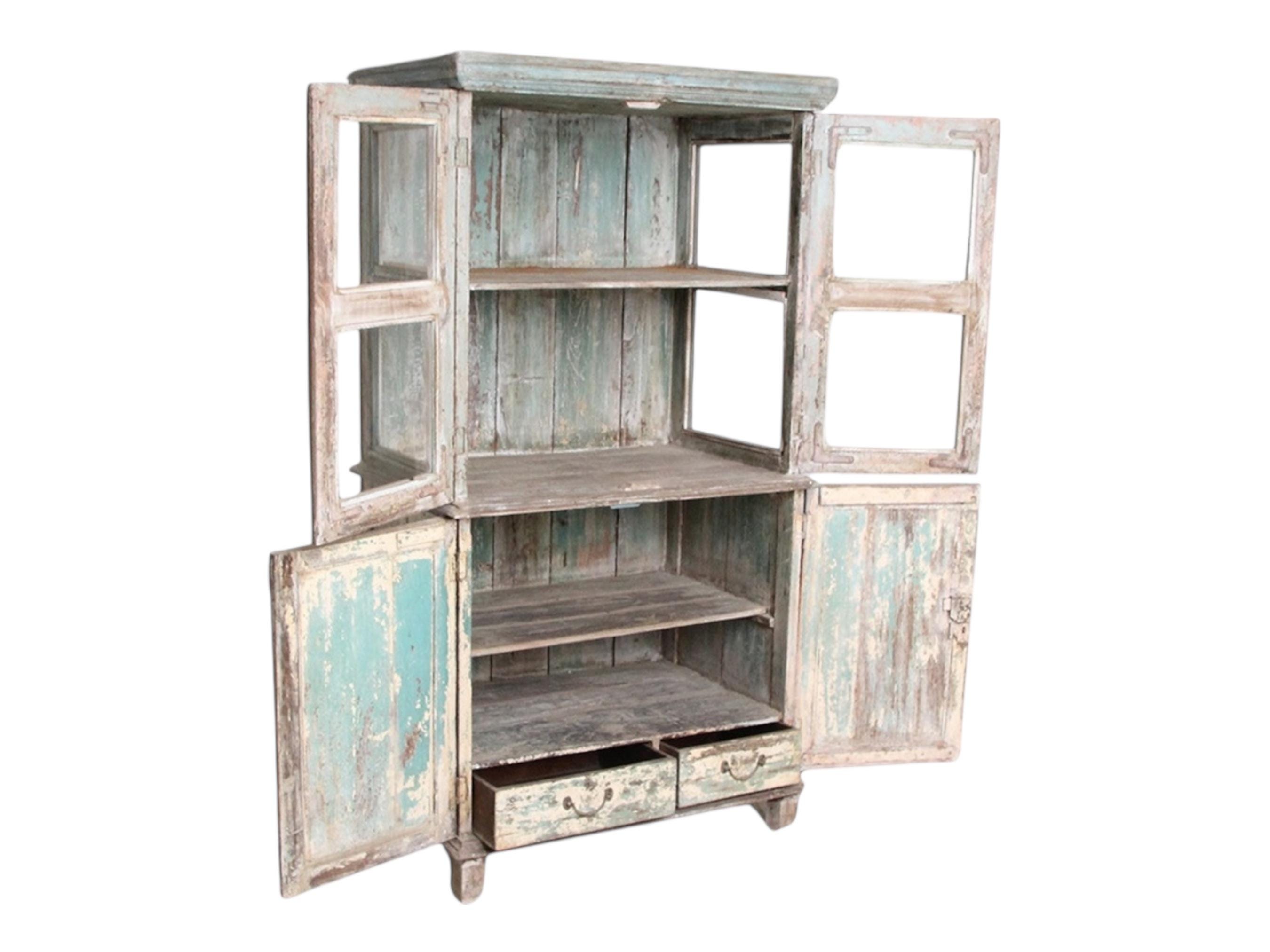 This display cabinet presents the old, rustic living feeling, not perfect but unique and dreamy in its charisma in its vintage soft blue, the old fittings and the funny closure - small details with a big impact, if you are looking for something special this is exactly the right one.