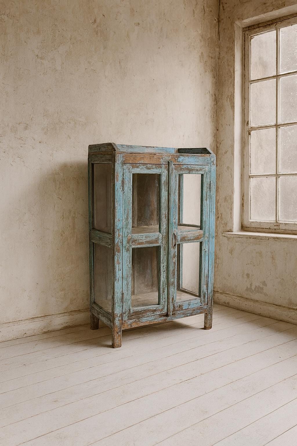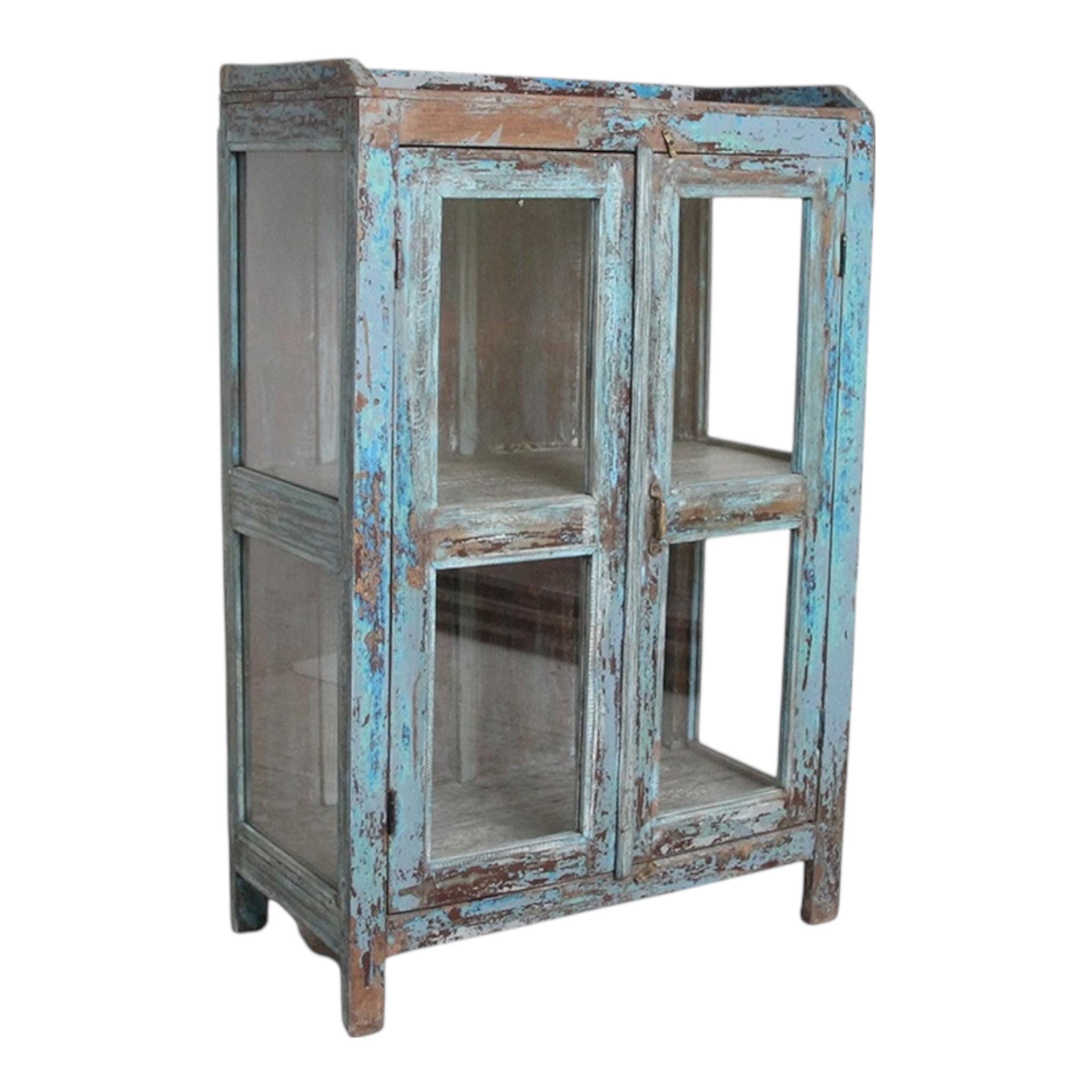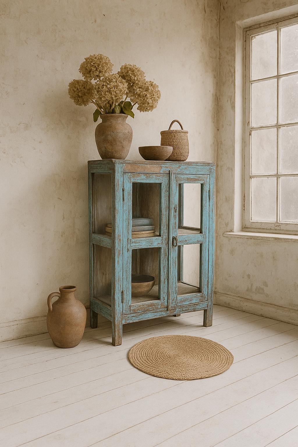 This display cabinet presents the old, rustic feeling of living, not perfect but unique and dreamy in its charisma with its vintage azure blue, the old fittings and the funny closure - small details with a big effect, if you are looking for something special this is exactly the right thing.