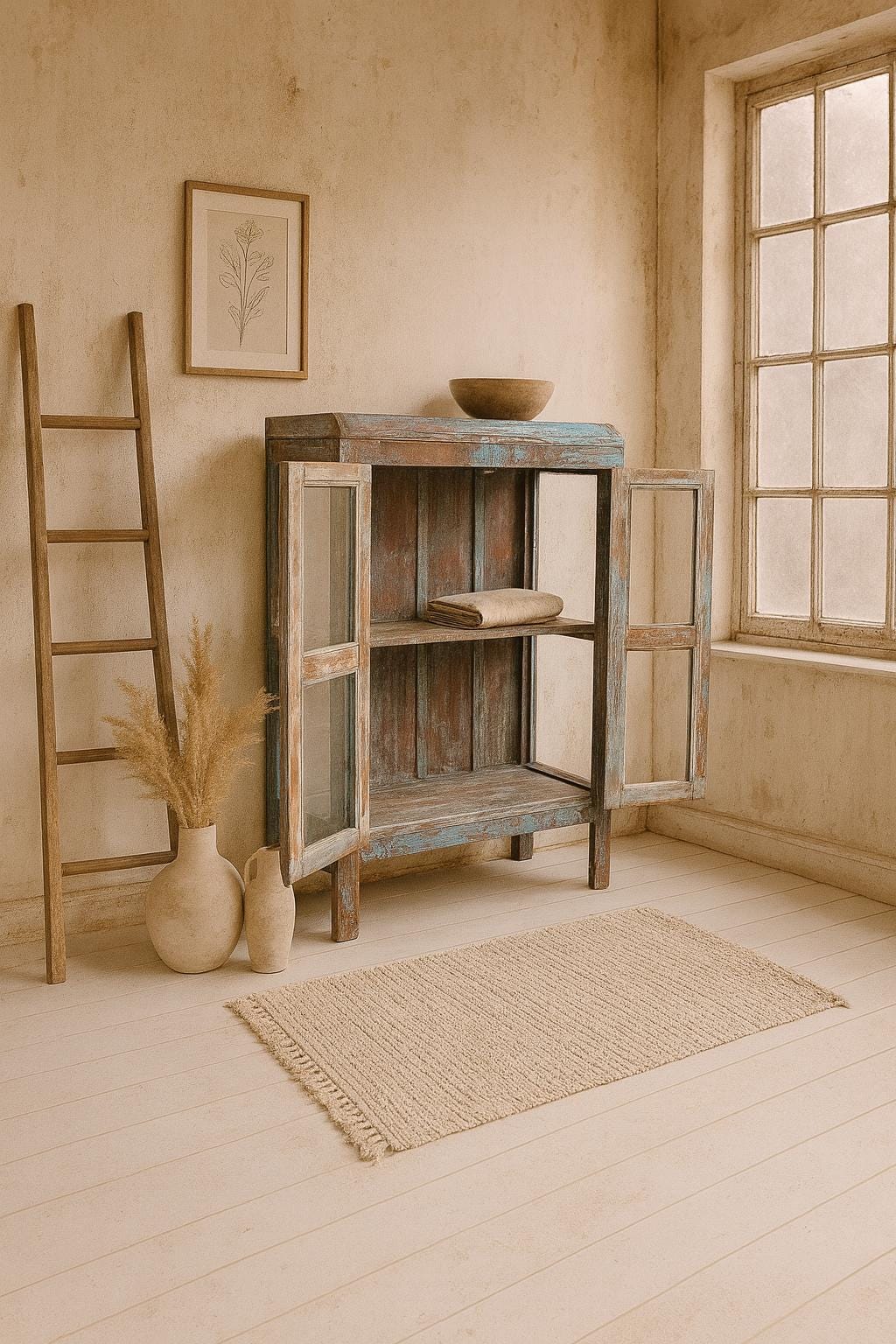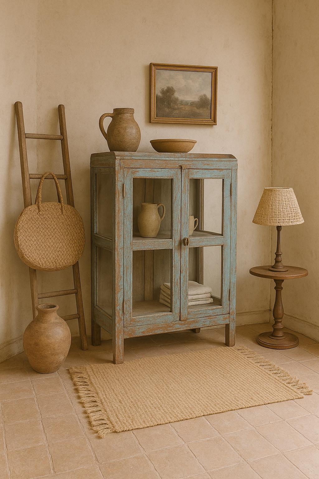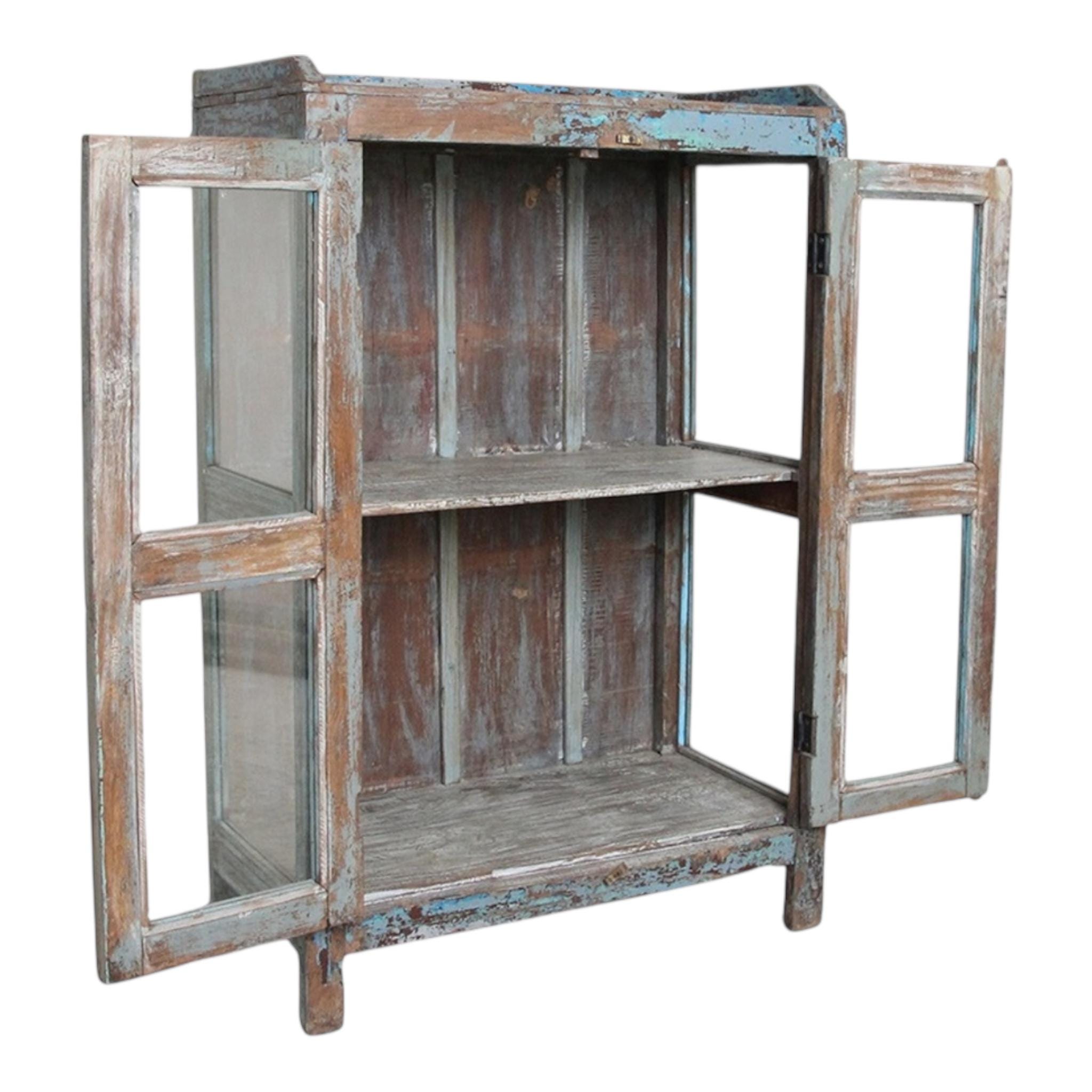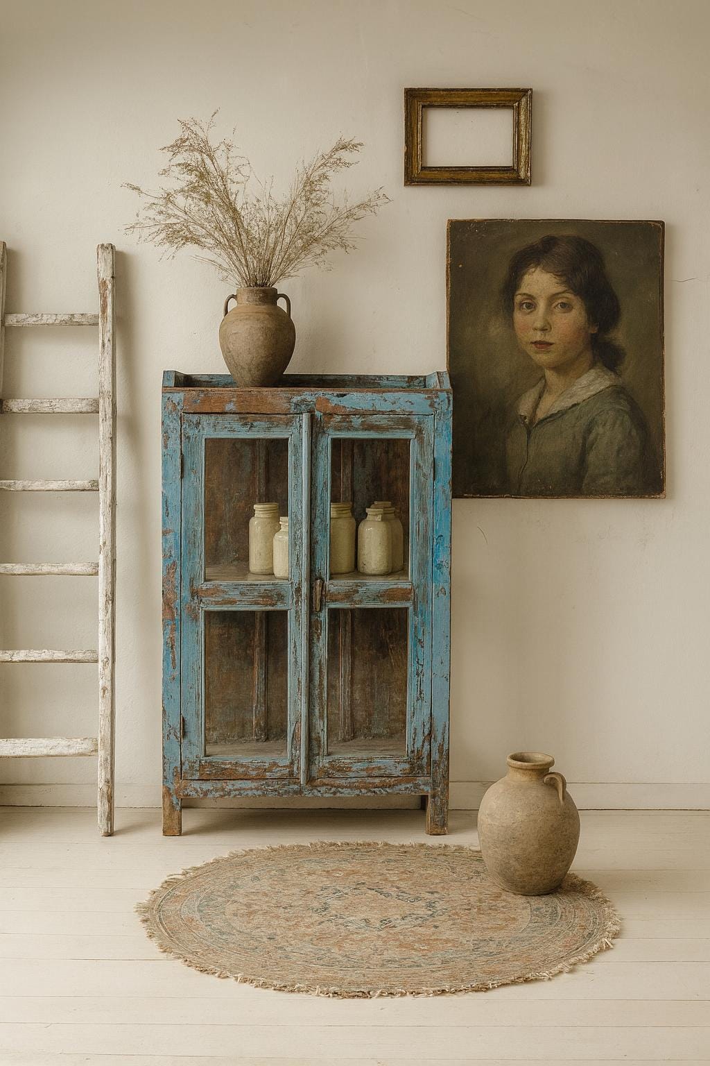 This display cabinet presents the old, rustic feeling of living, not perfect but unique and dreamy in its charisma with its vintage azure blue, the old fittings and the funny closure - small details with a big effect, if you are looking for something special this is exactly the right thing.