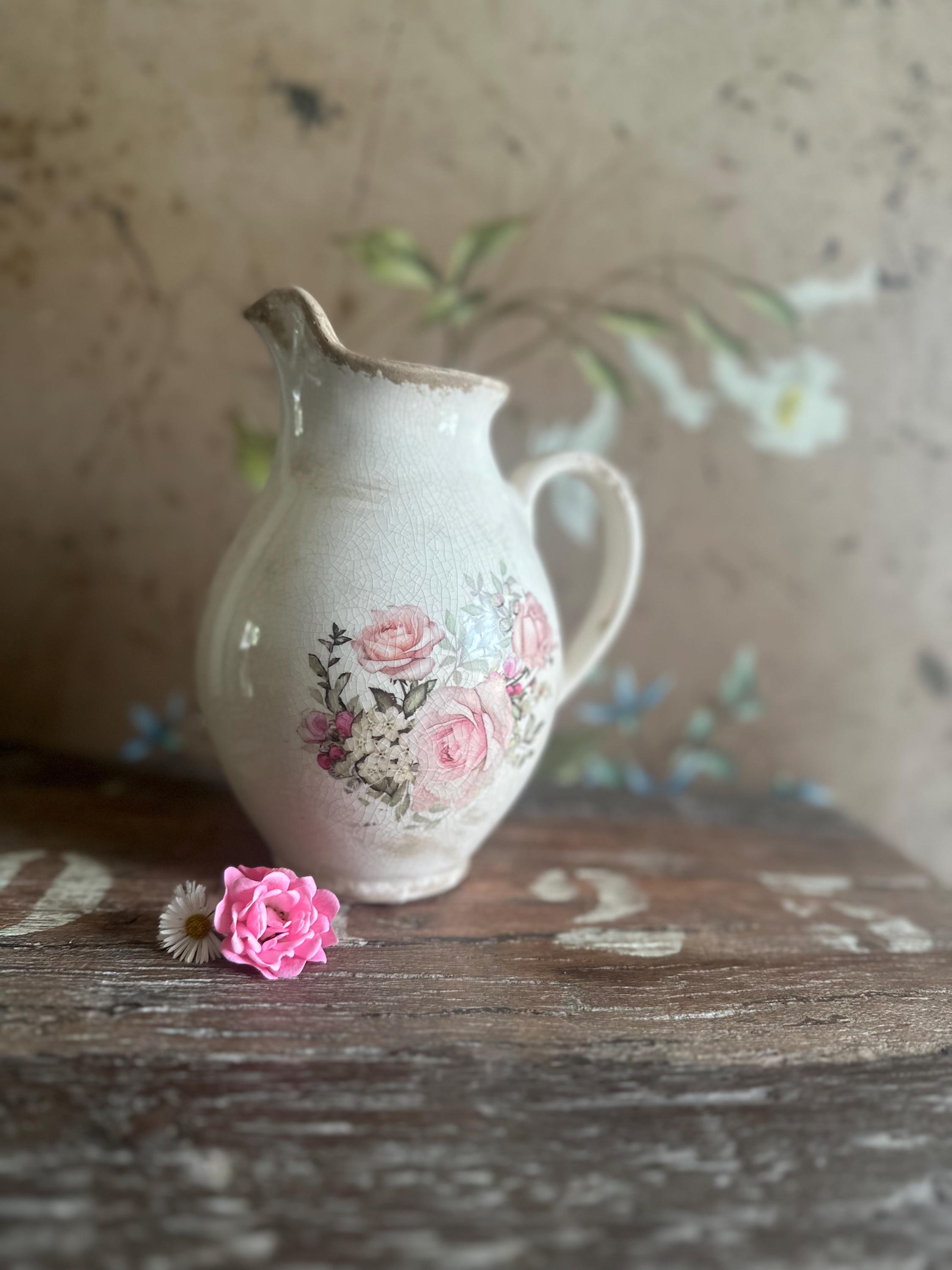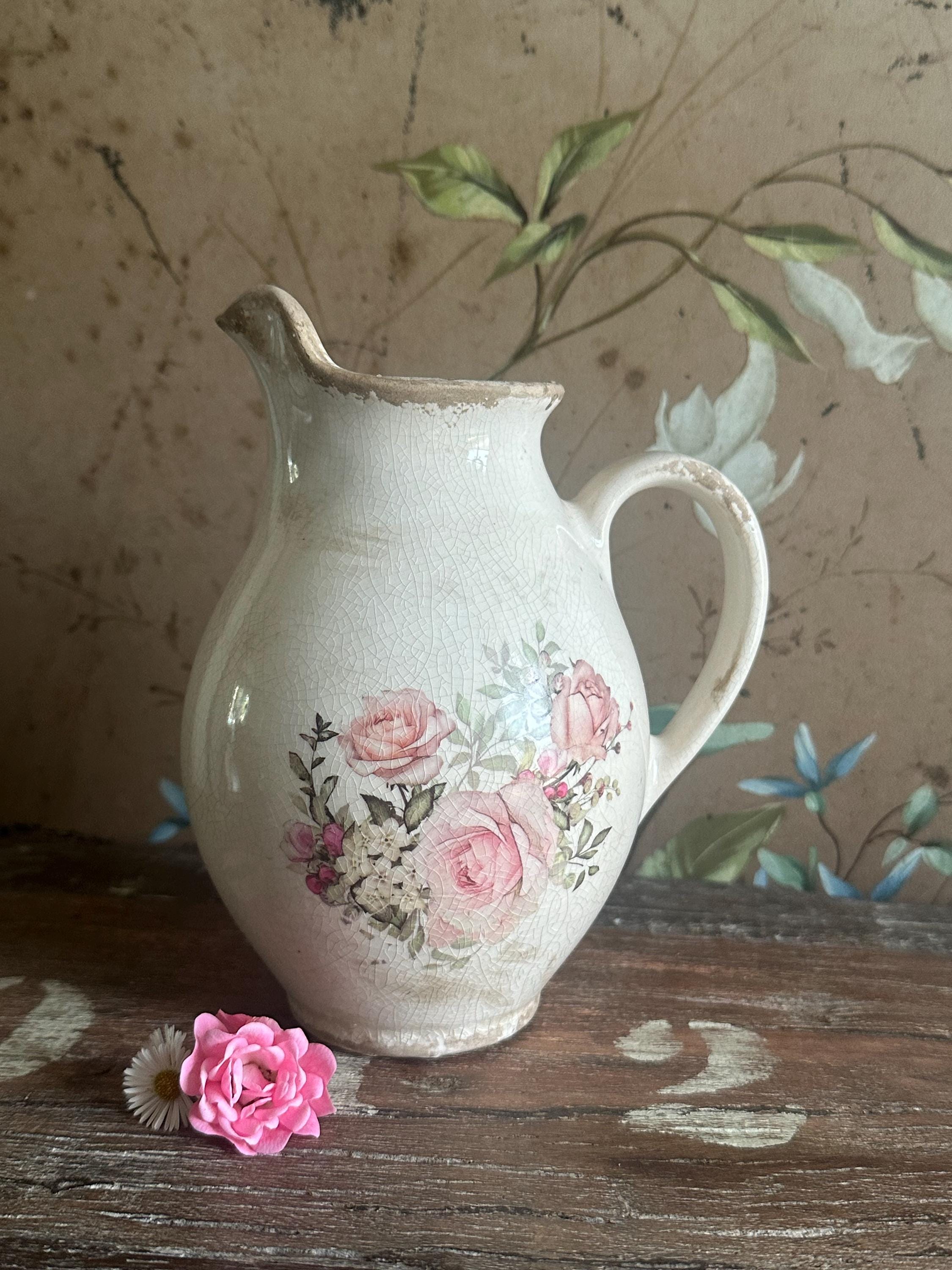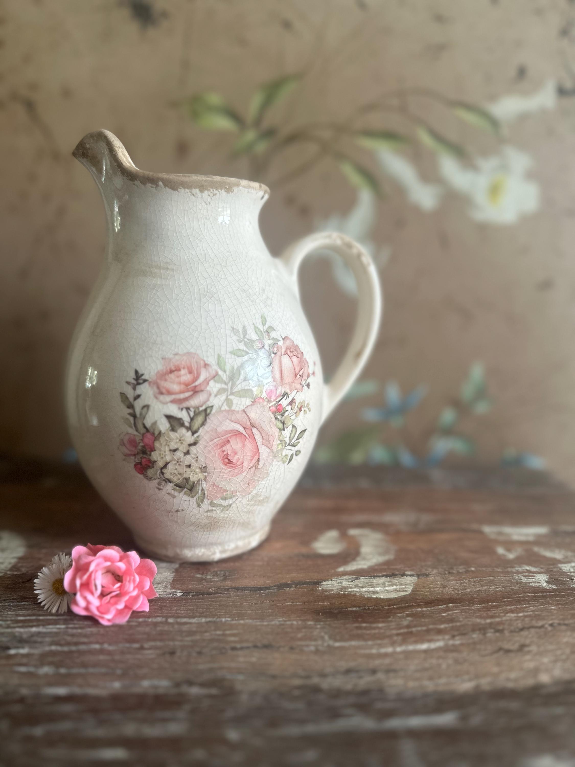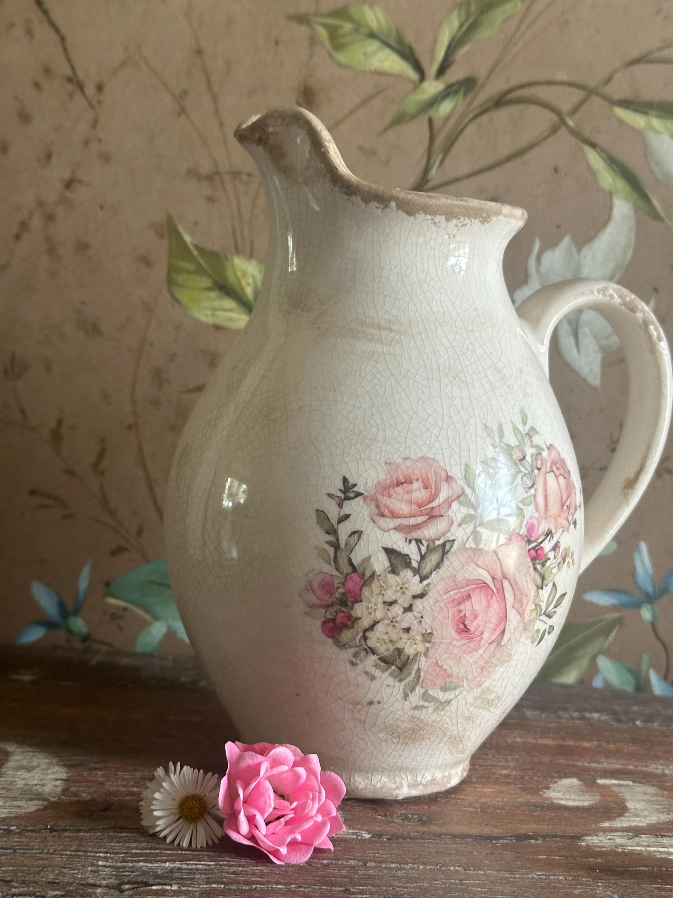 A ceramic jug - this enchanting jug was modeled after the French country house look - a lovely rosy nostalgic pattern combined with this beautiful old cracked patina, as if the jug were decades old - it reminds you of times gone by and is a beautiful companion for fresh meadow bouquets, branches or dried grasses - create your own ambience.