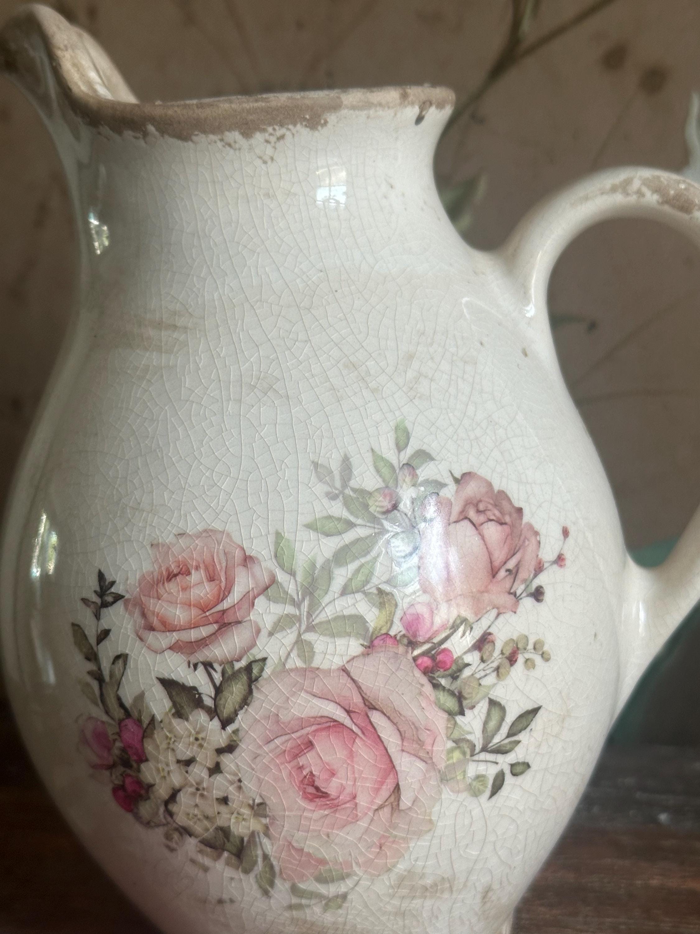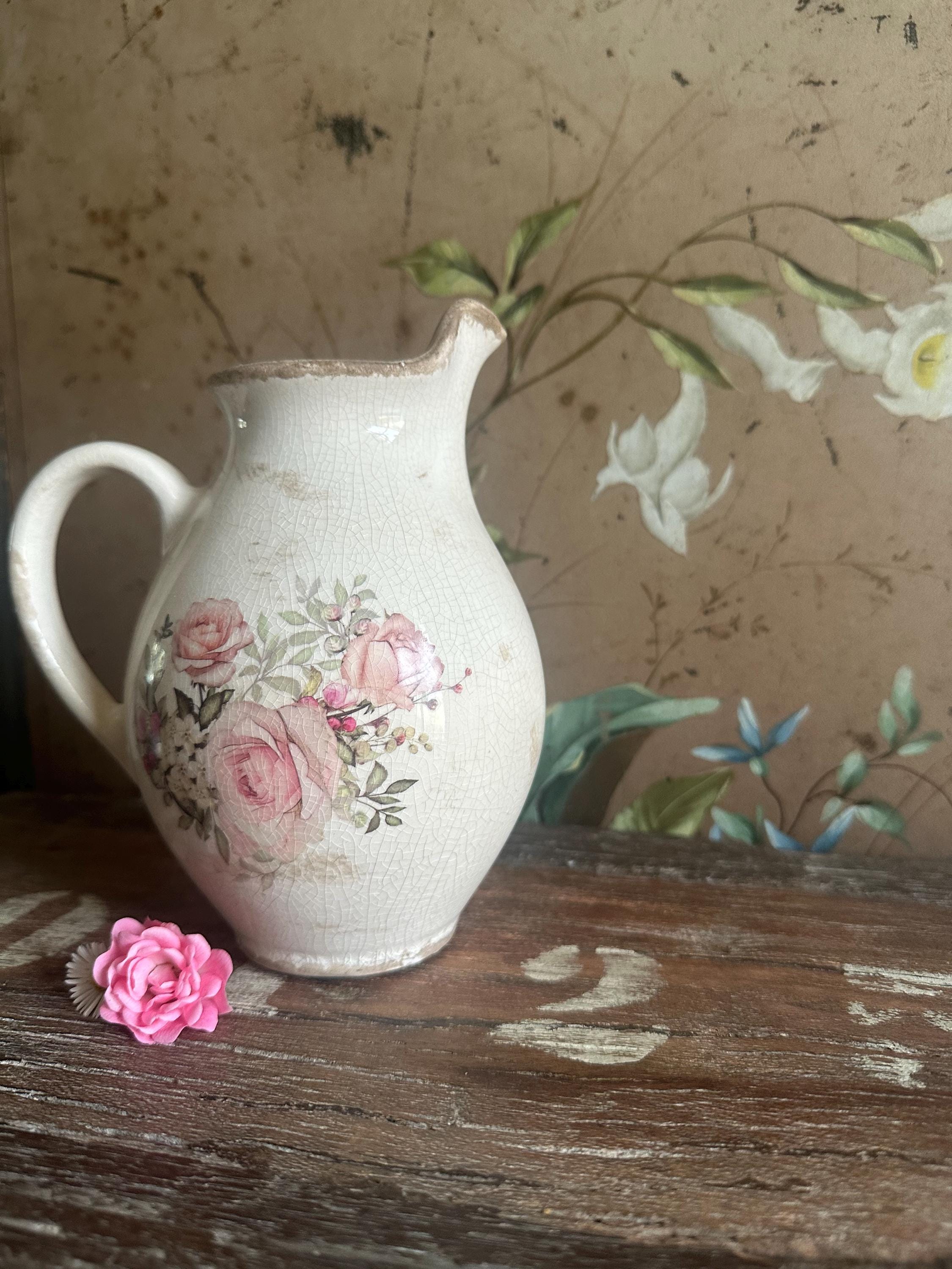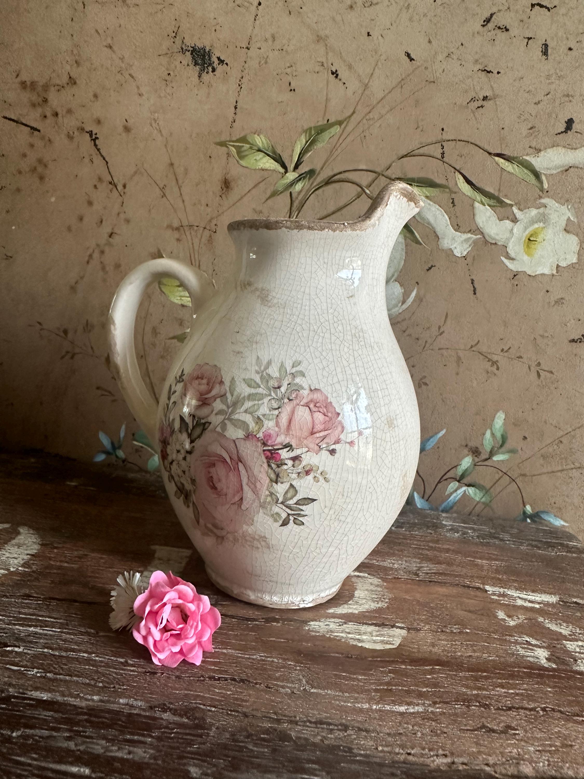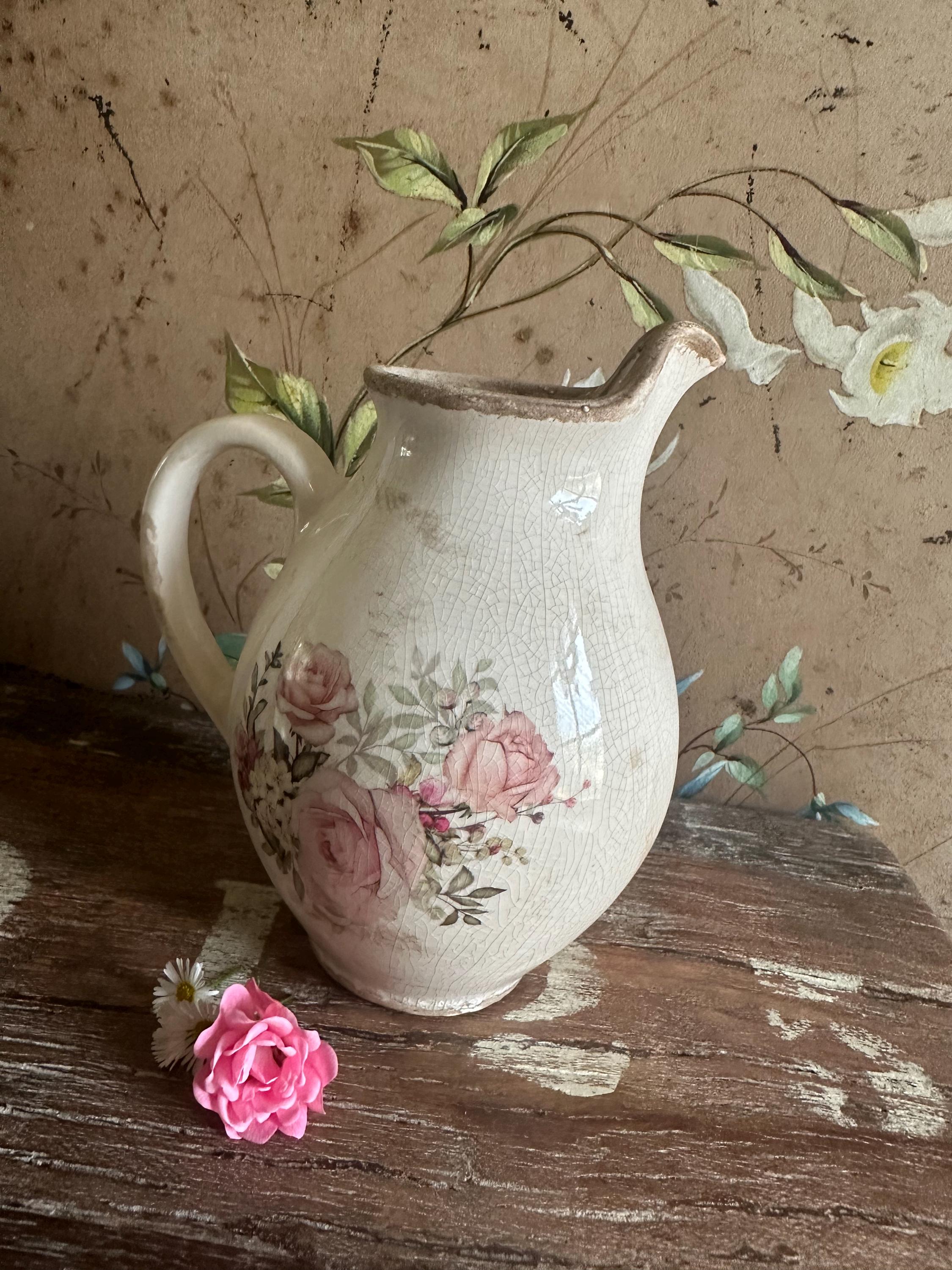 A ceramic jug - this enchanting jug was modeled after the French country house look - a lovely rosy nostalgic pattern combined with this beautiful old cracked patina, as if the jug were decades old - it reminds you of times gone by and is a beautiful companion for fresh meadow bouquets, branches or dried grasses - create your own ambience.