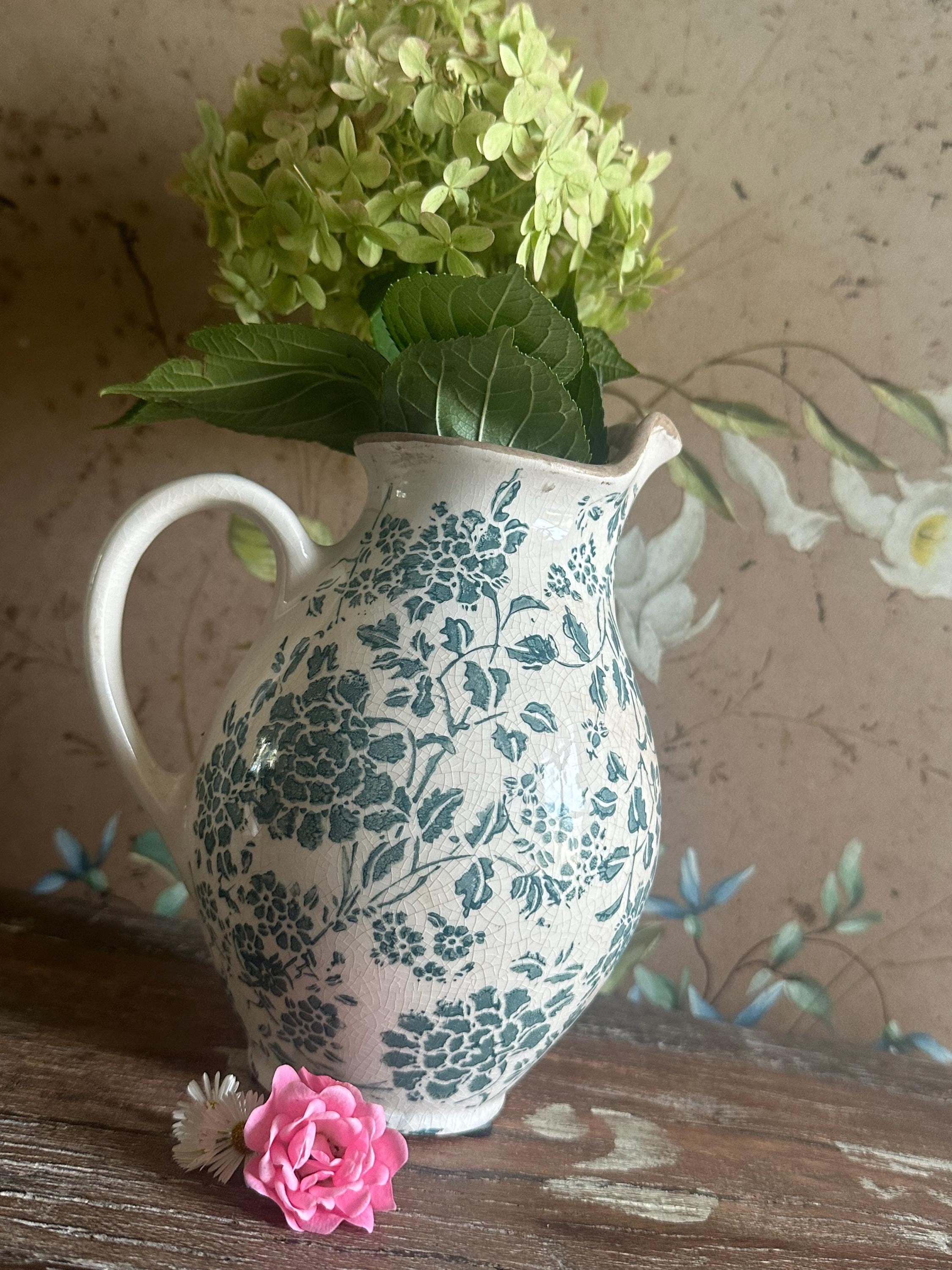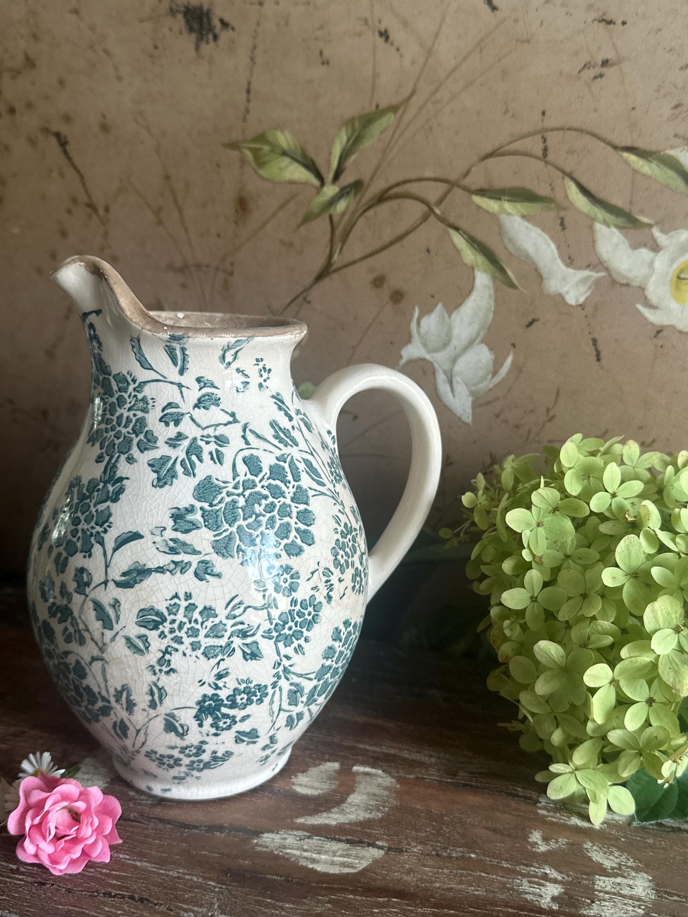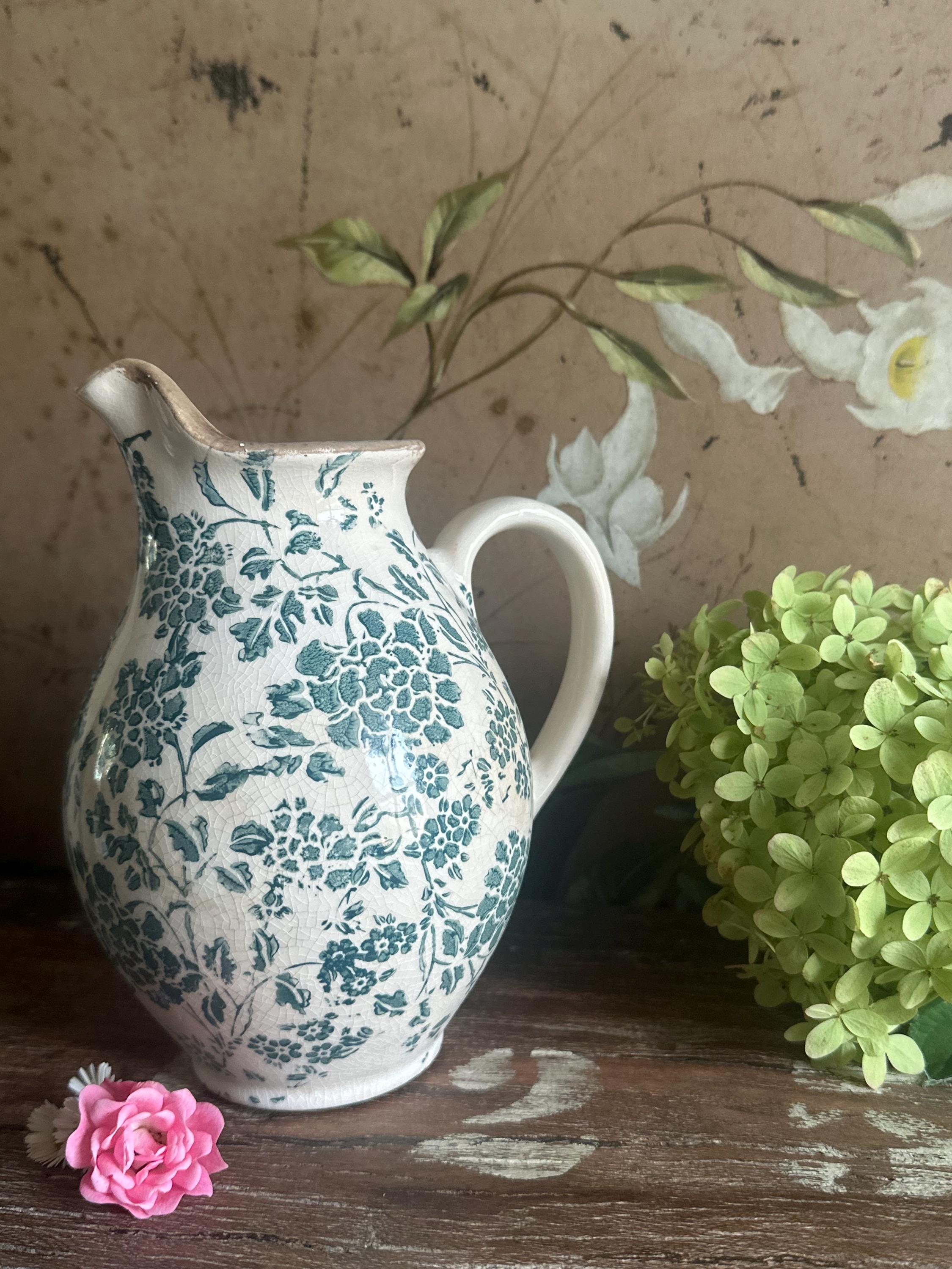 A ceramic jug - this enchanting jug was modeled on the French country house look - a lovely green nostalgic pattern combined with this beautiful old cracked patina, as if the jug were decades old - it reminds you of times gone by and is a beautiful companion for fresh meadow bouquets, branches or dried grasses - create your own ambience.