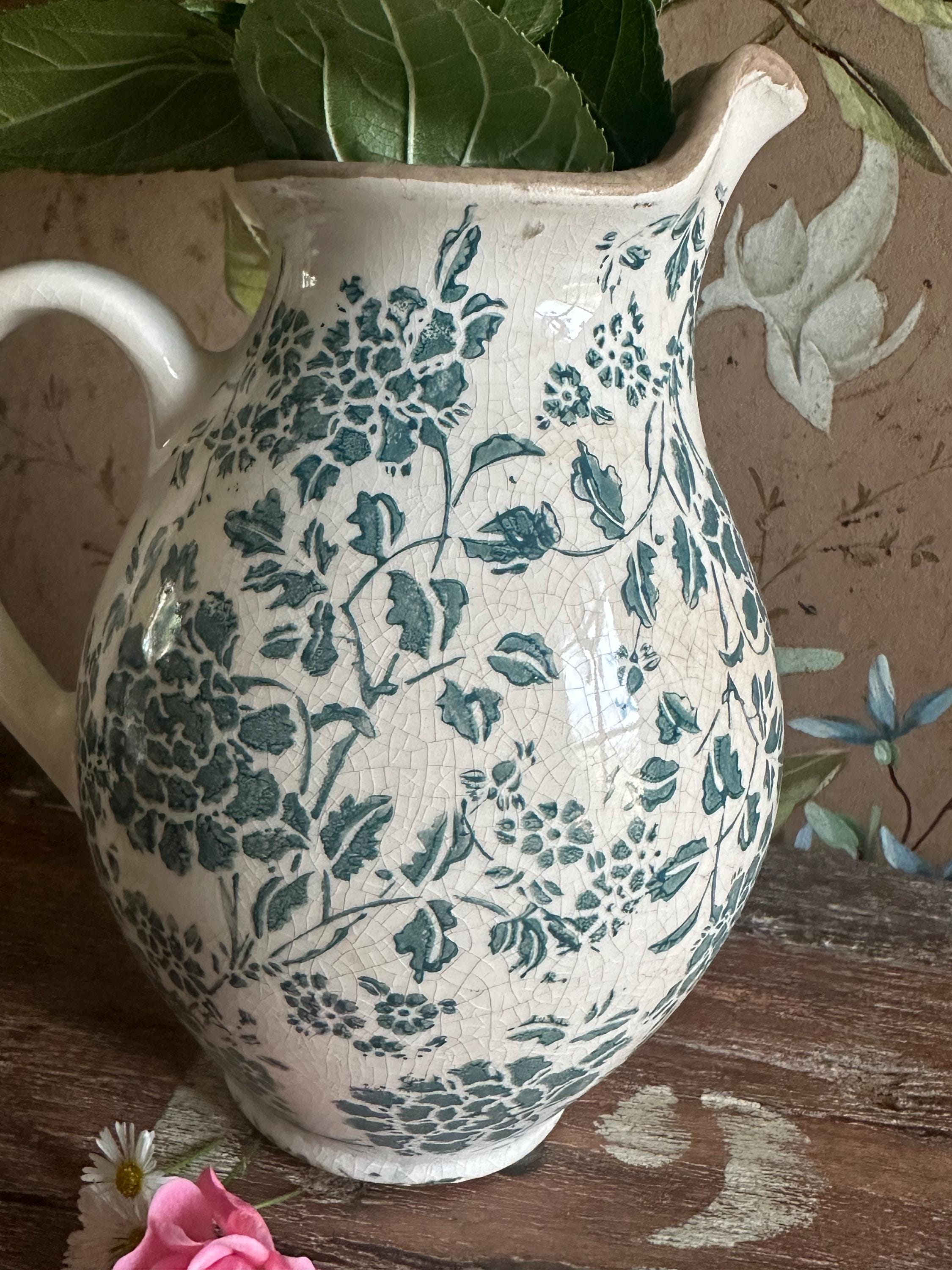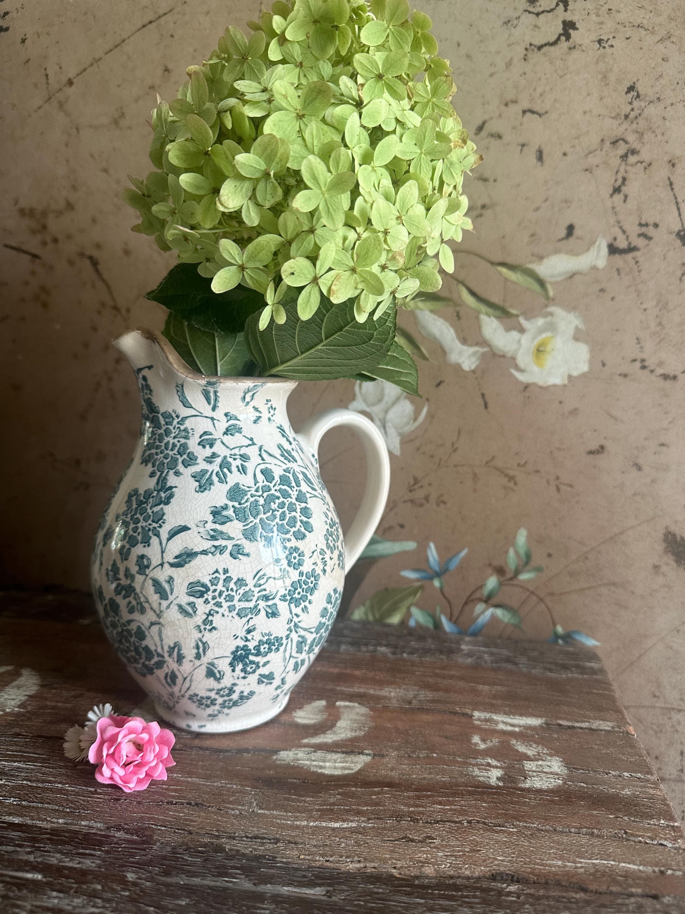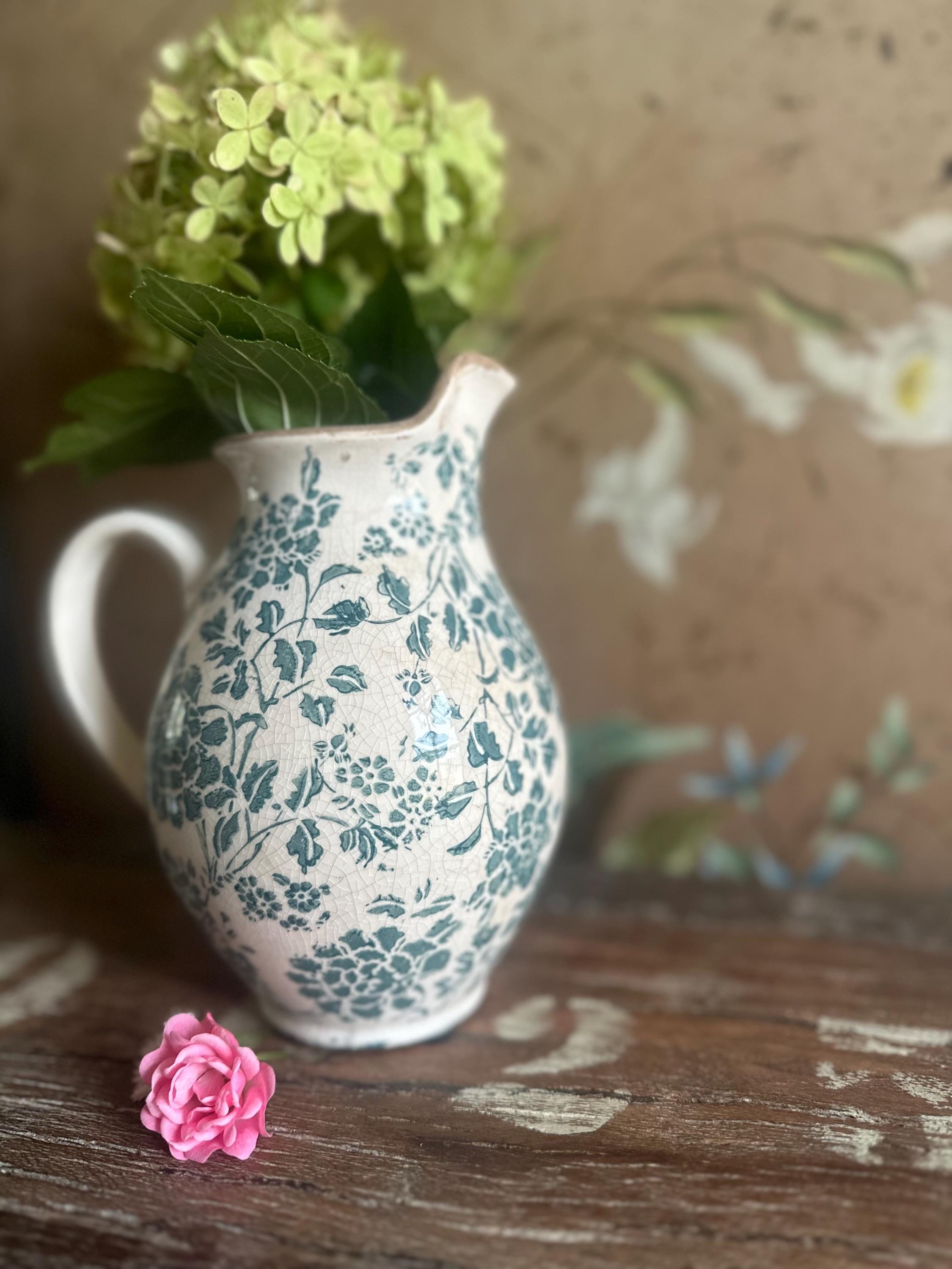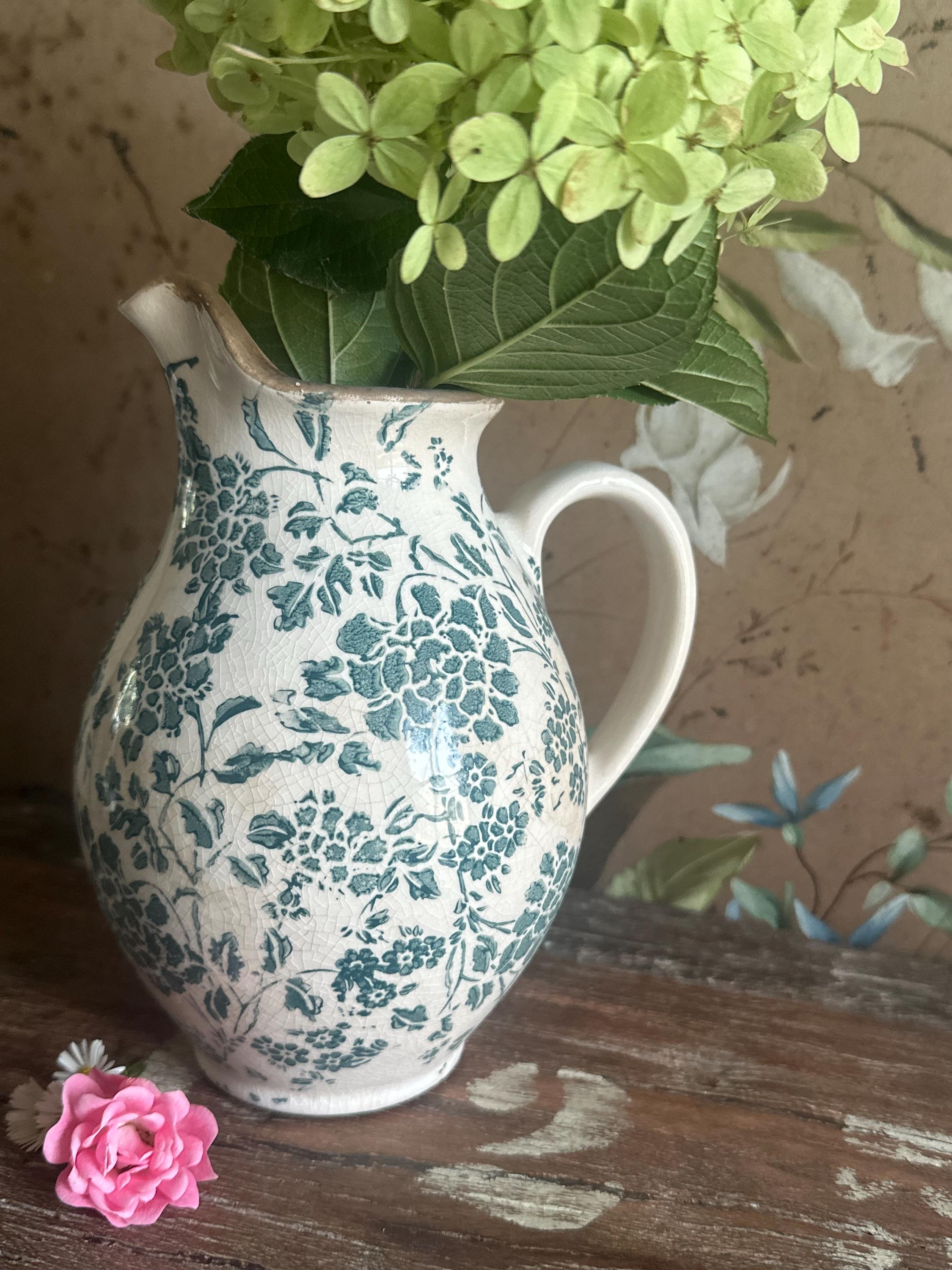 A ceramic jug - this enchanting jug was modeled on the French country house look - a lovely green nostalgic pattern combined with this beautiful old cracked patina, as if the jug were decades old - it reminds you of times gone by and is a beautiful companion for fresh meadow bouquets, branches or dried grasses - create your own ambience.