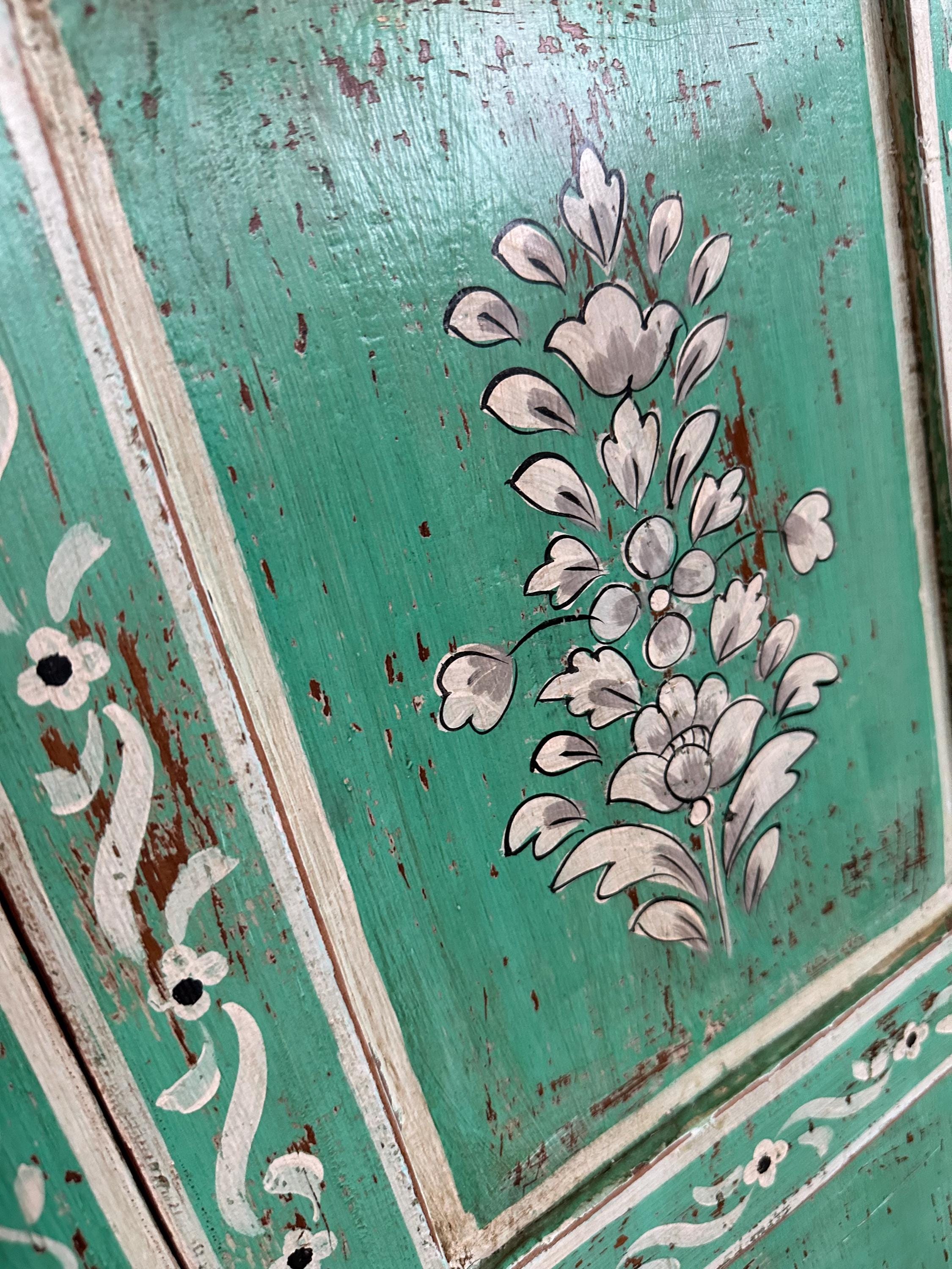 Greta's dreamy hand-painted chest of drawers - an incredibly beautiful green patina with this floral painting, for storing your favorite pieces.