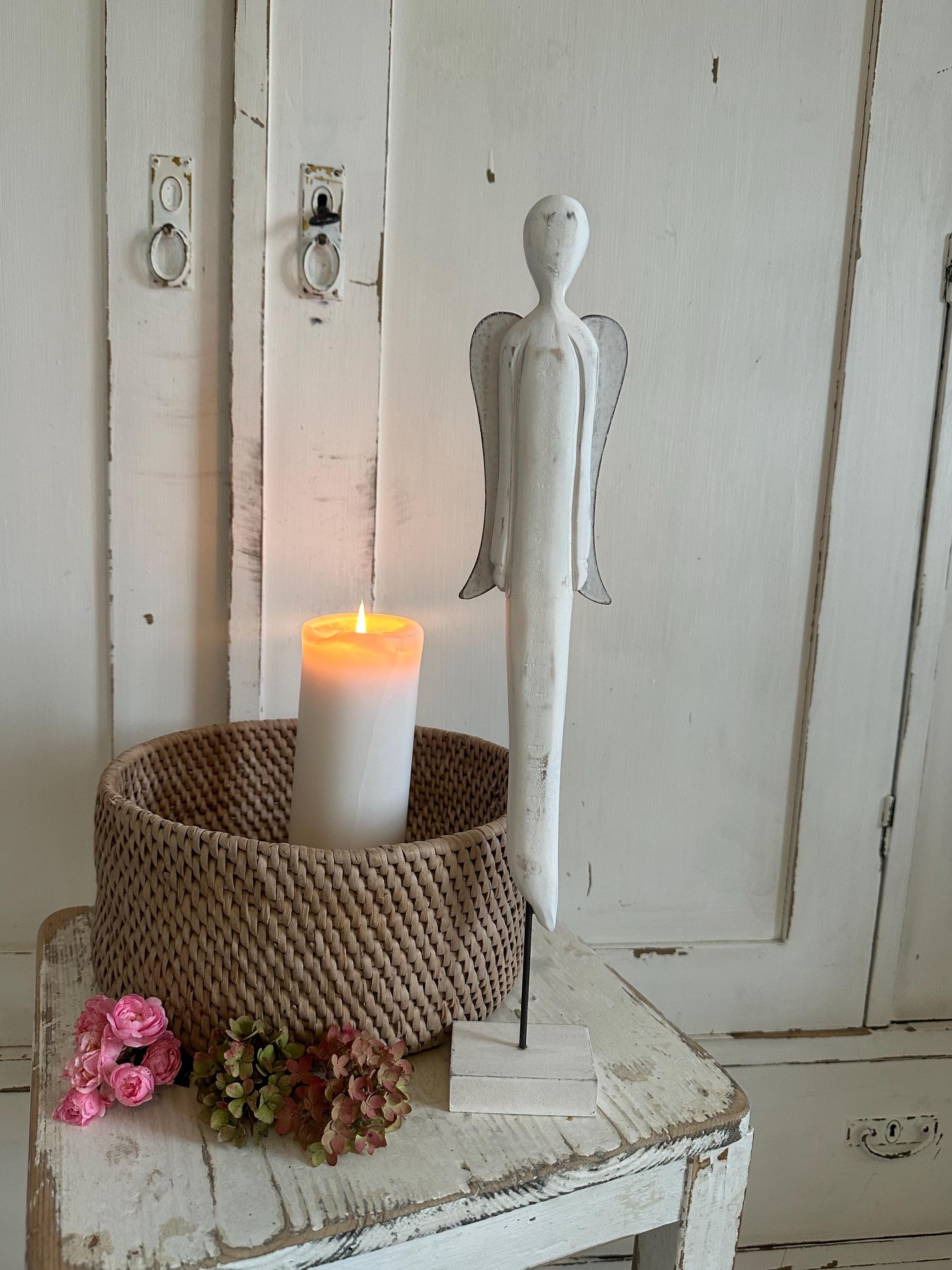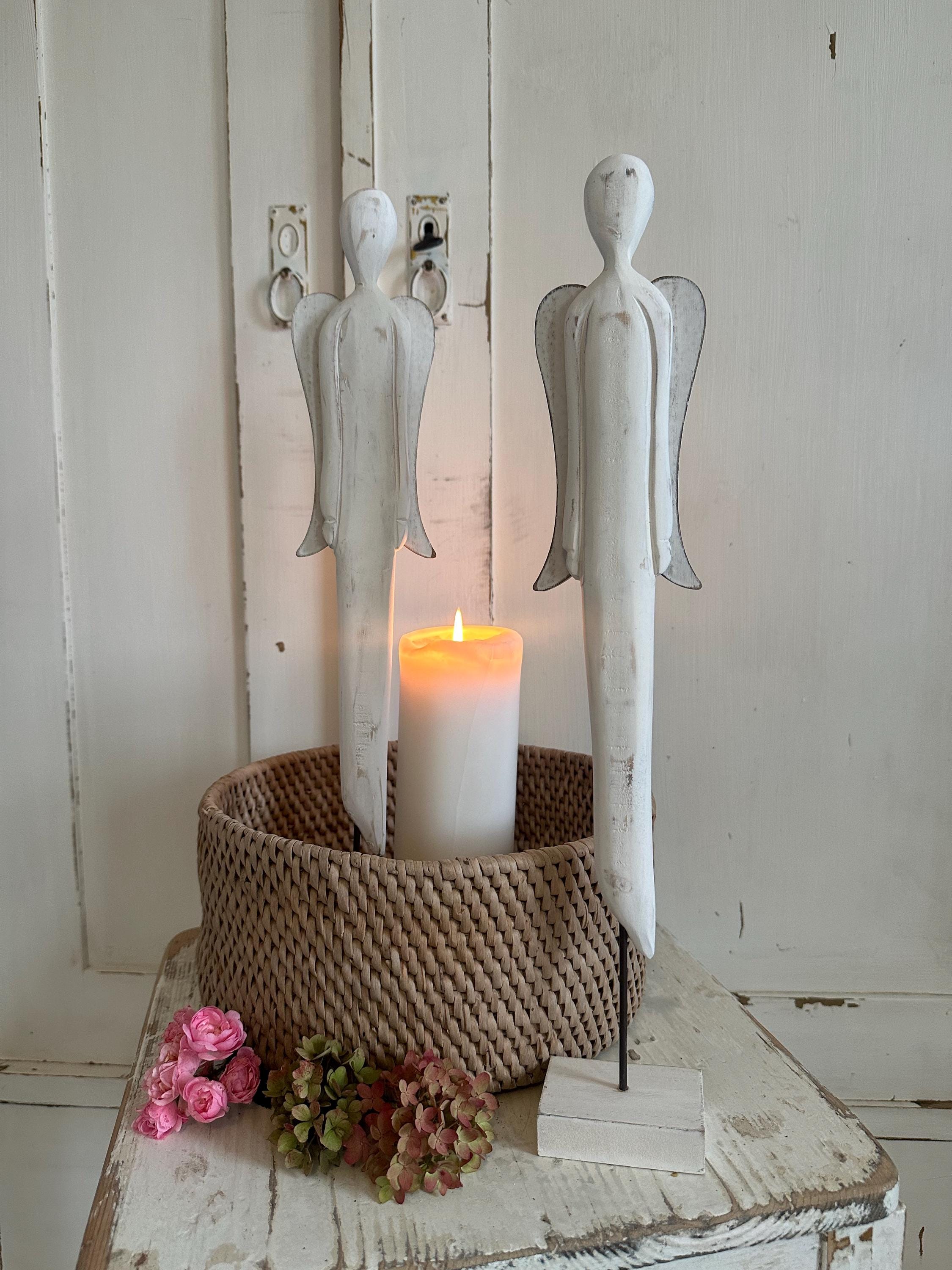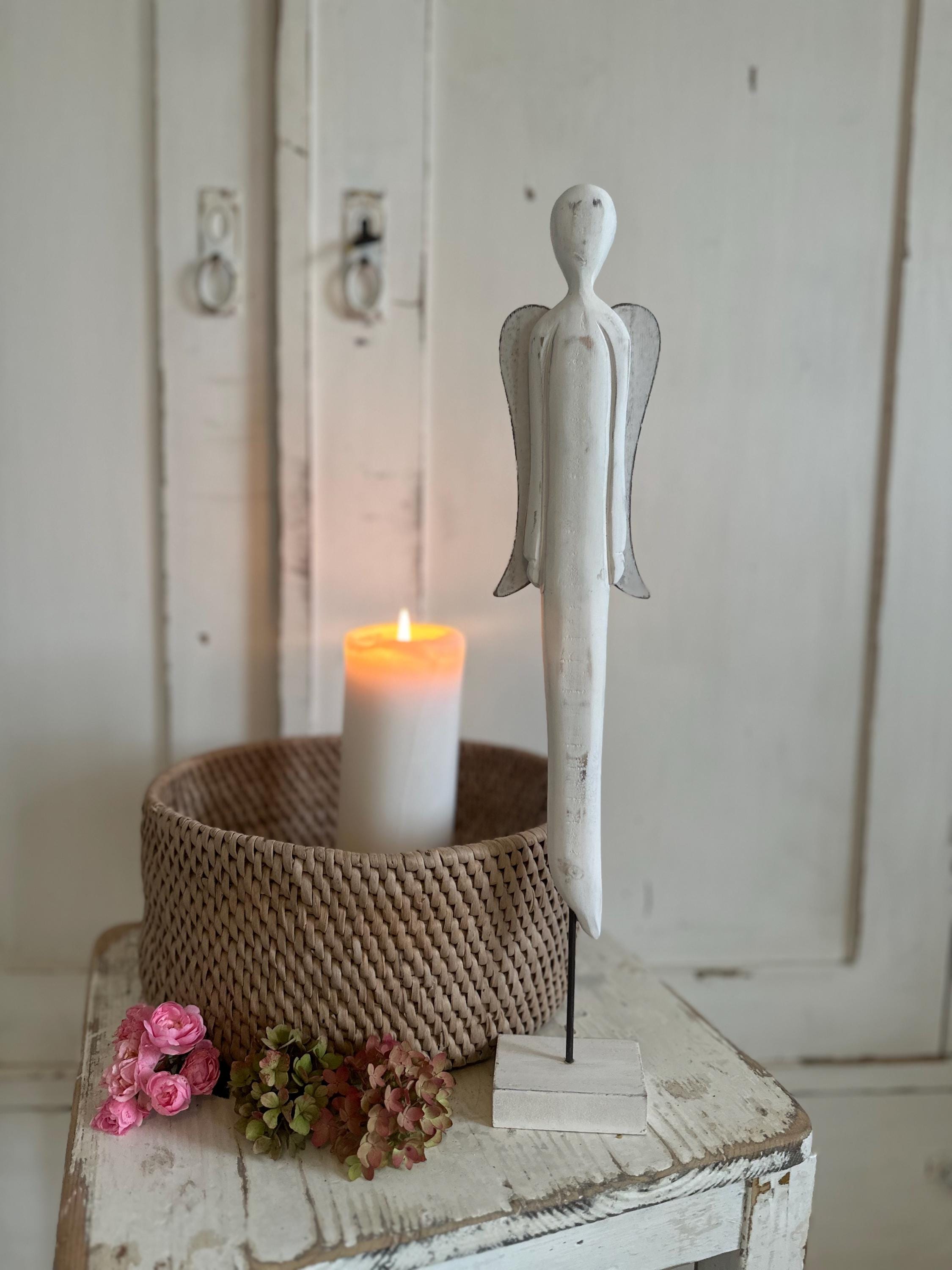 This is a beautiful wooden angel with an elegant and rustic look. The white color gives it a light and soft appearance, while the wood adds a natural and warm touch. This angel would be a beautiful addition to any room, whether it's a living room, bedroom, or entryway. The design is simple yet full of character, creating a timeless and stylish accent. This angel is a beautiful decorative element that fits into a variety of interior styles, both modern and traditional.