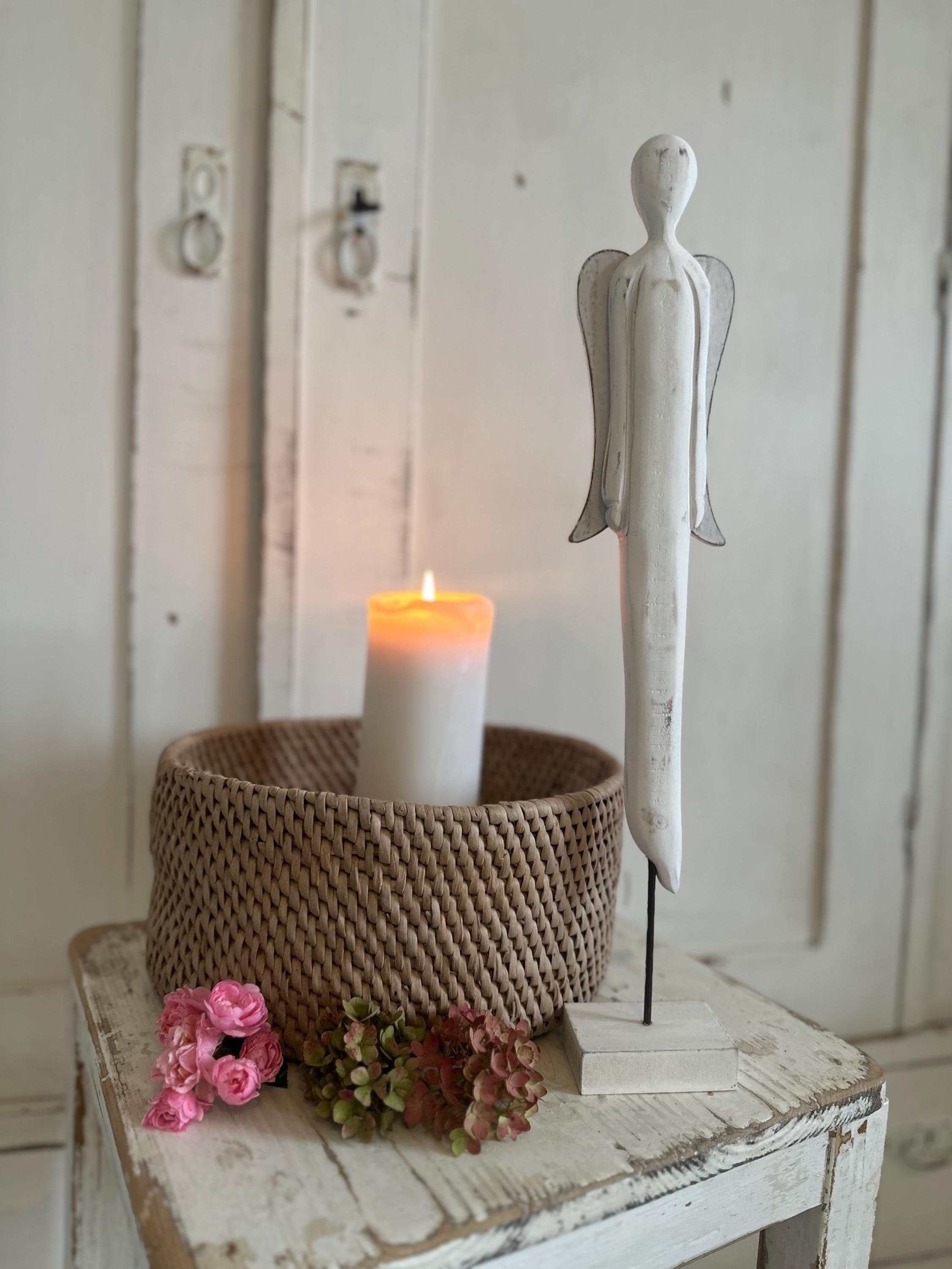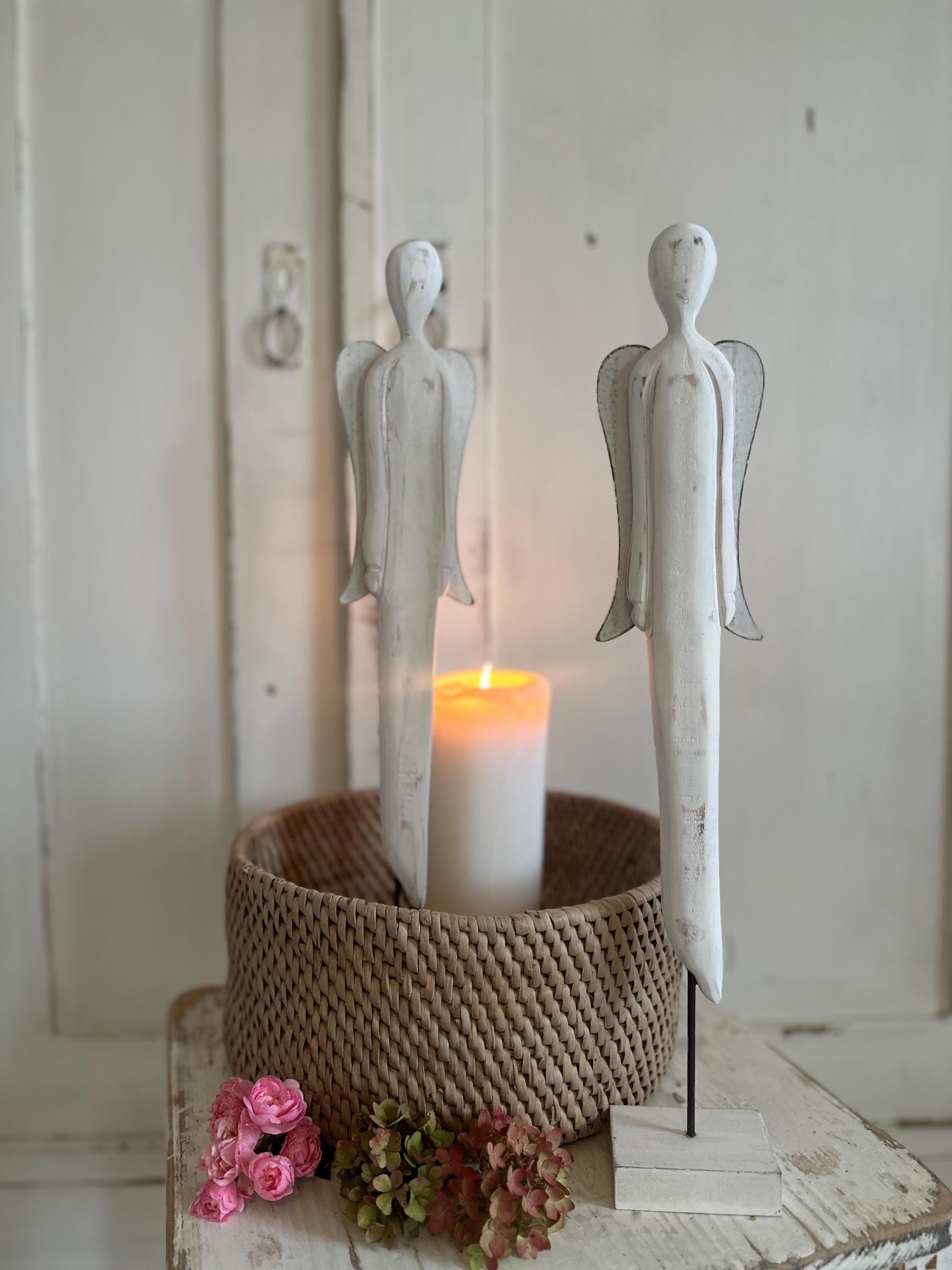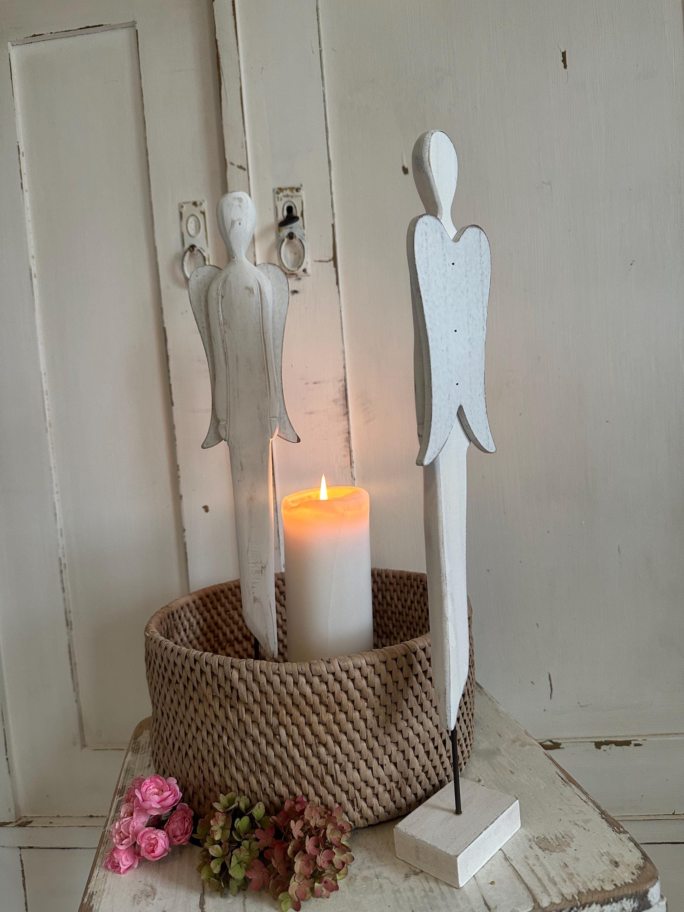 This is a beautiful wooden angel with an elegant and rustic look. The white color gives it a light and soft appearance, while the wood adds a natural and warm touch. This angel would be a beautiful addition to any room, whether it's a living room, bedroom, or entryway. The design is simple yet full of character, creating a timeless and stylish accent. This angel is a beautiful decorative element that fits into a variety of interior styles, both modern and traditional.
