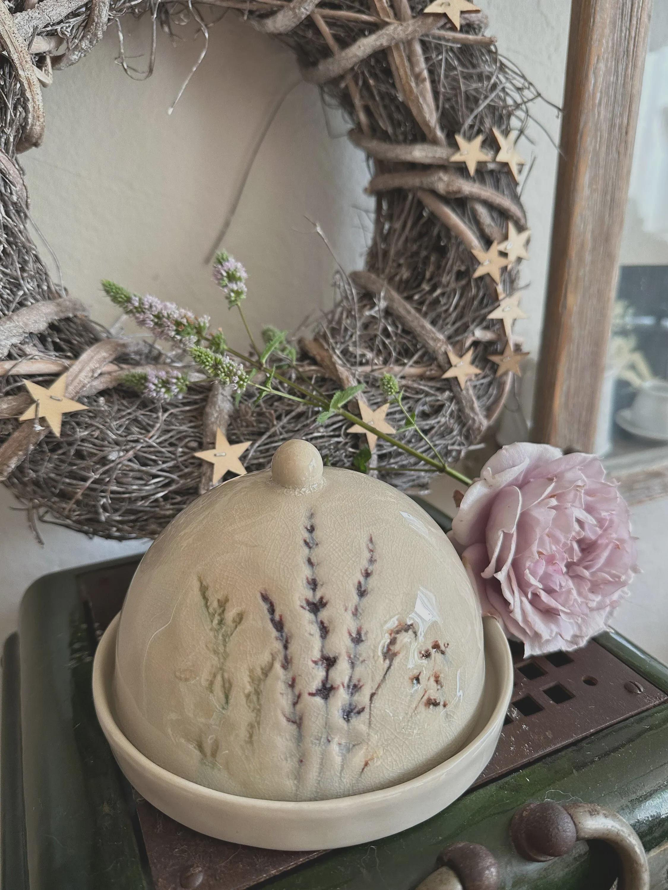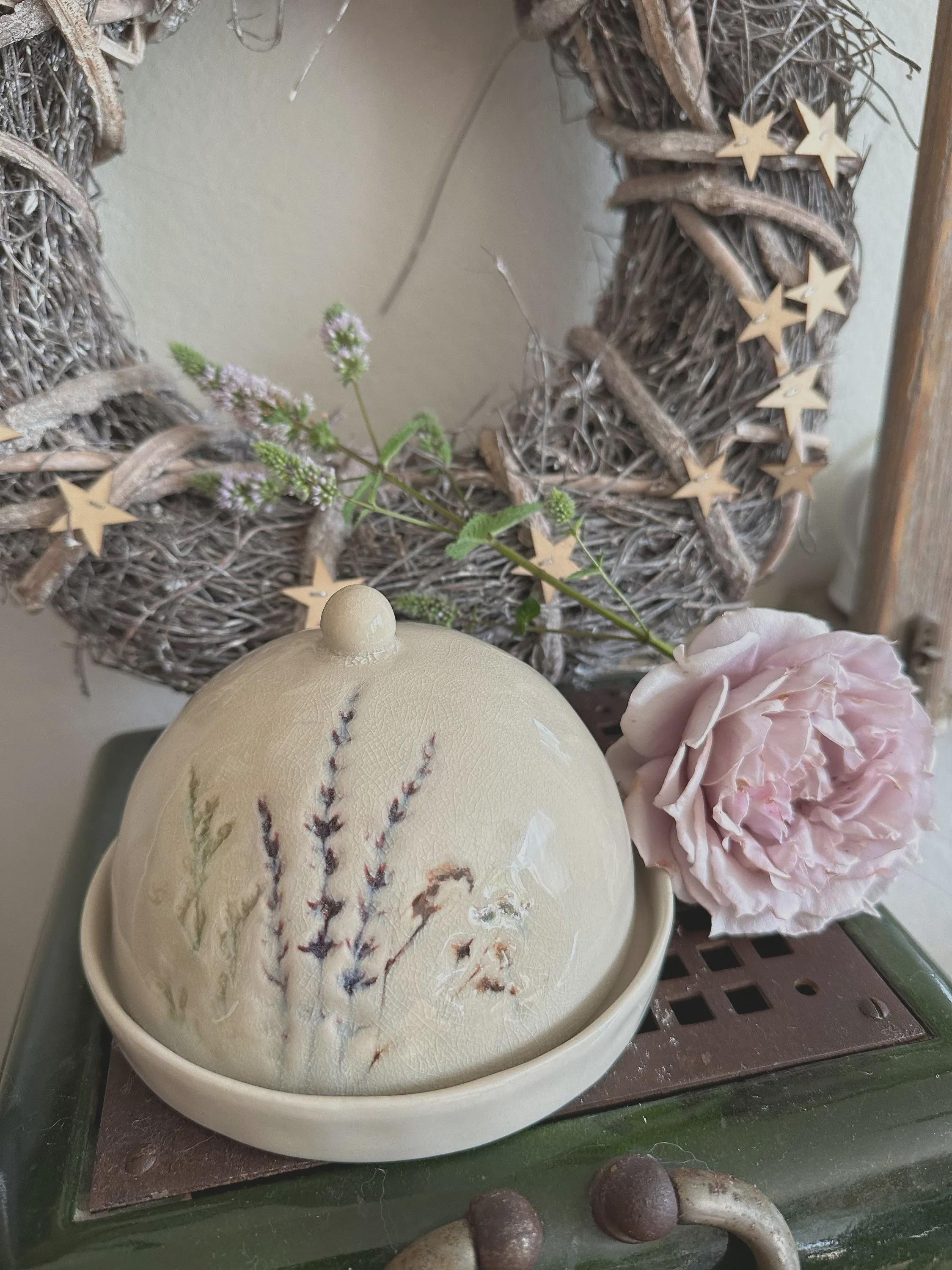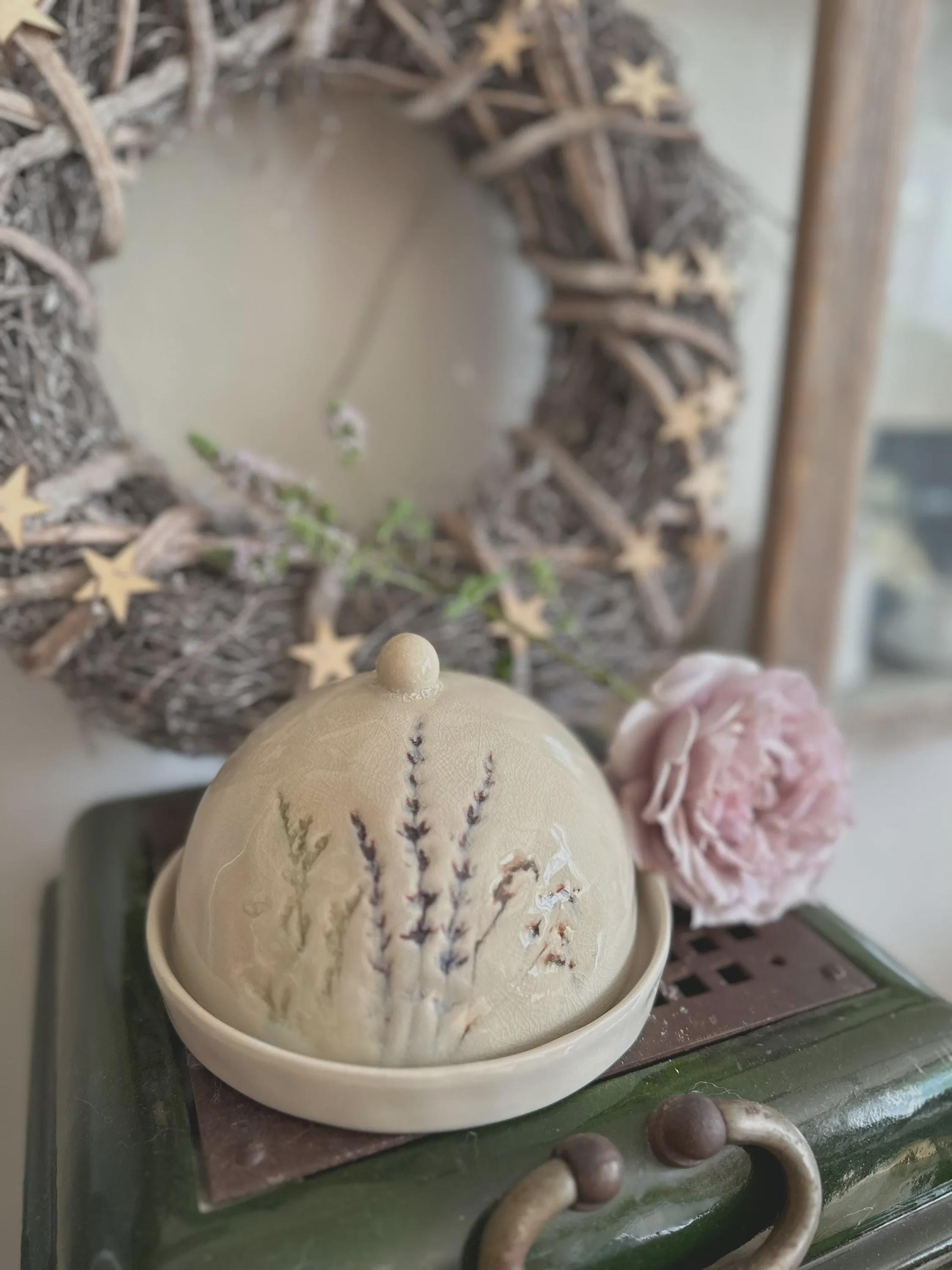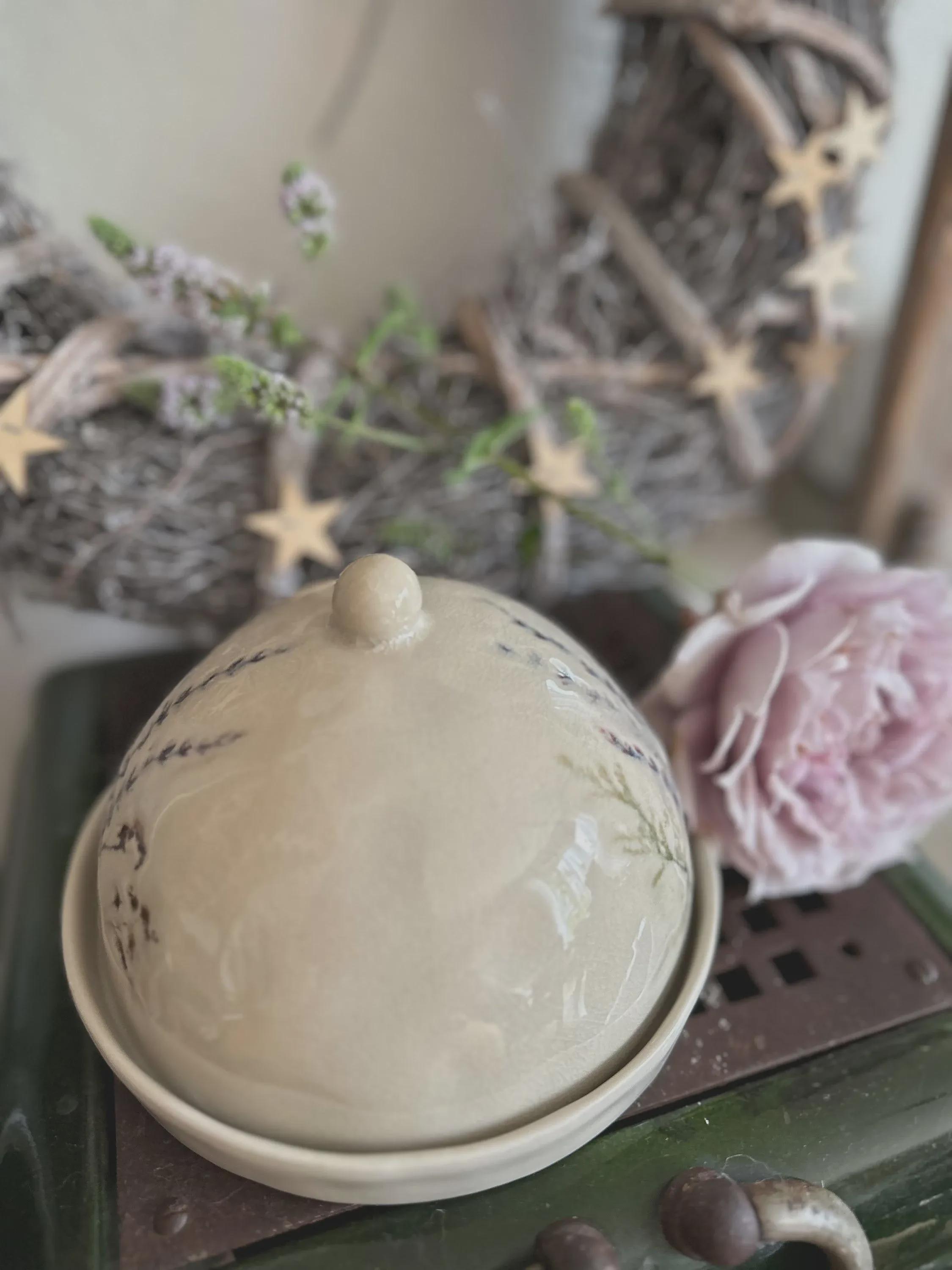 A butter dish – a beautiful stoneware item in natural colors, with a delicate floral motif printed on the crackle glaze. You can use it for butter, cheese, or many other storage items, or simply as a beautiful serving tray. The dish is handmade, so each piece is unique. Dishwasher safe.