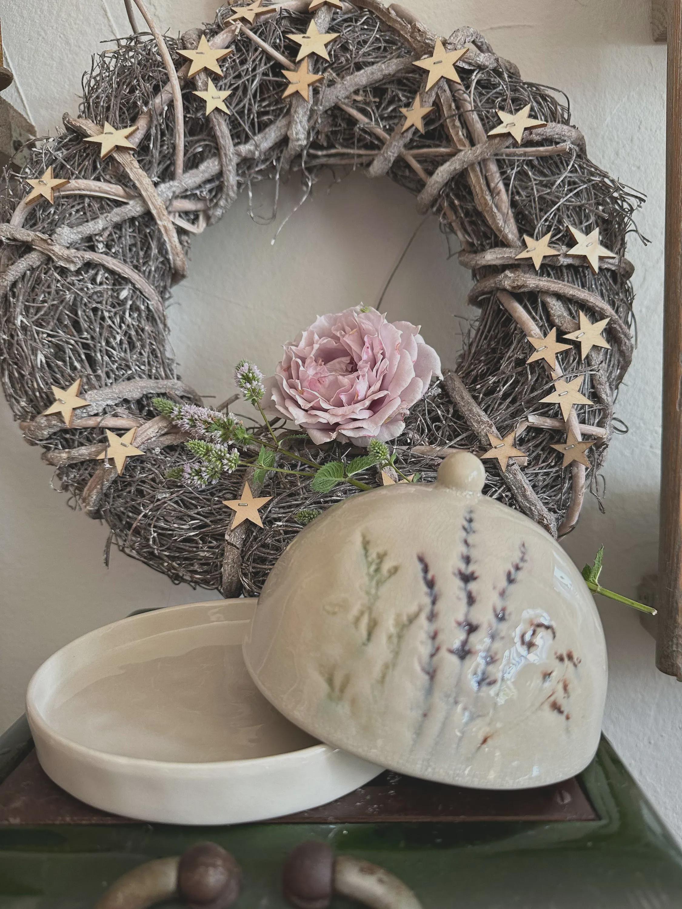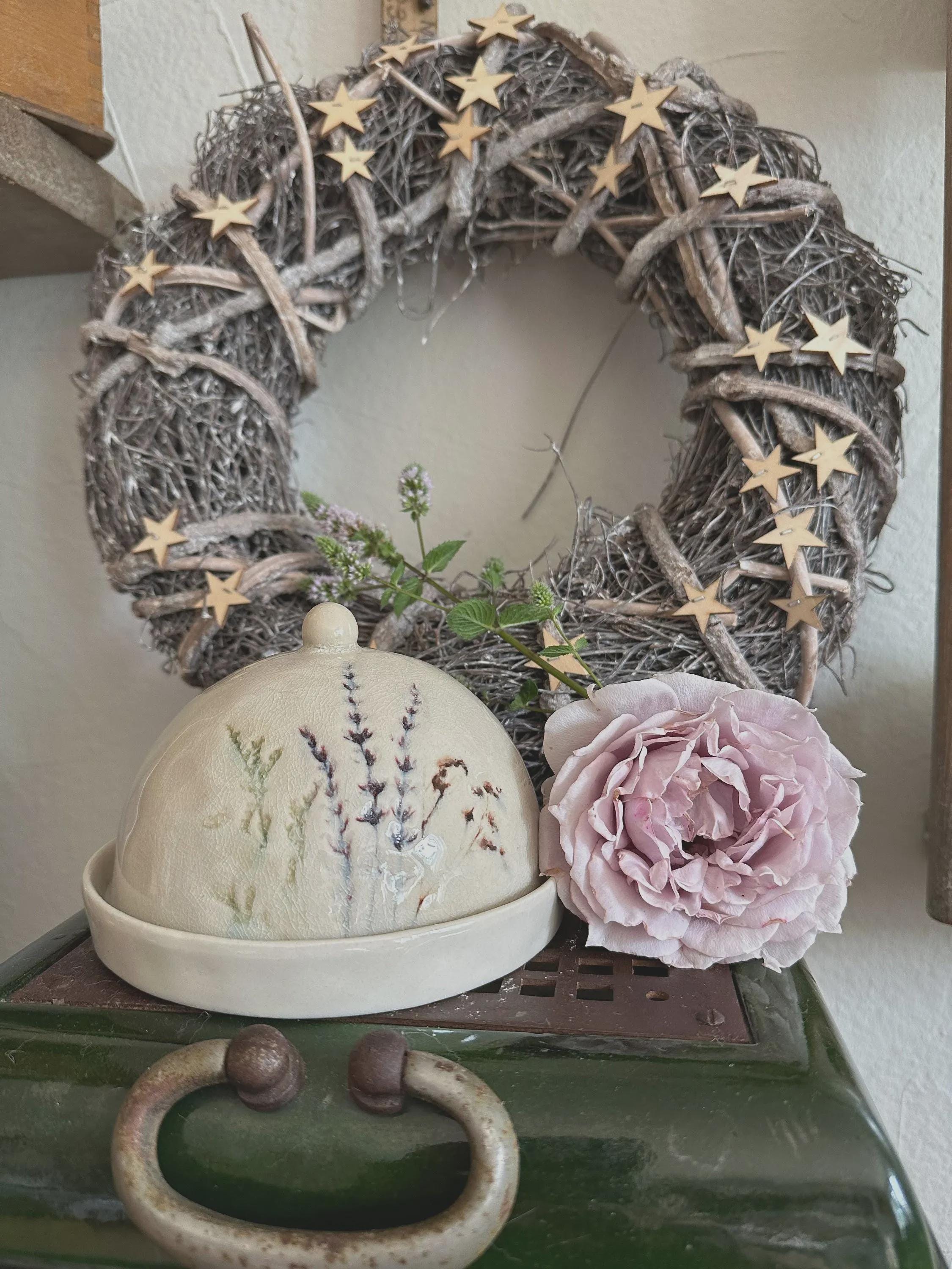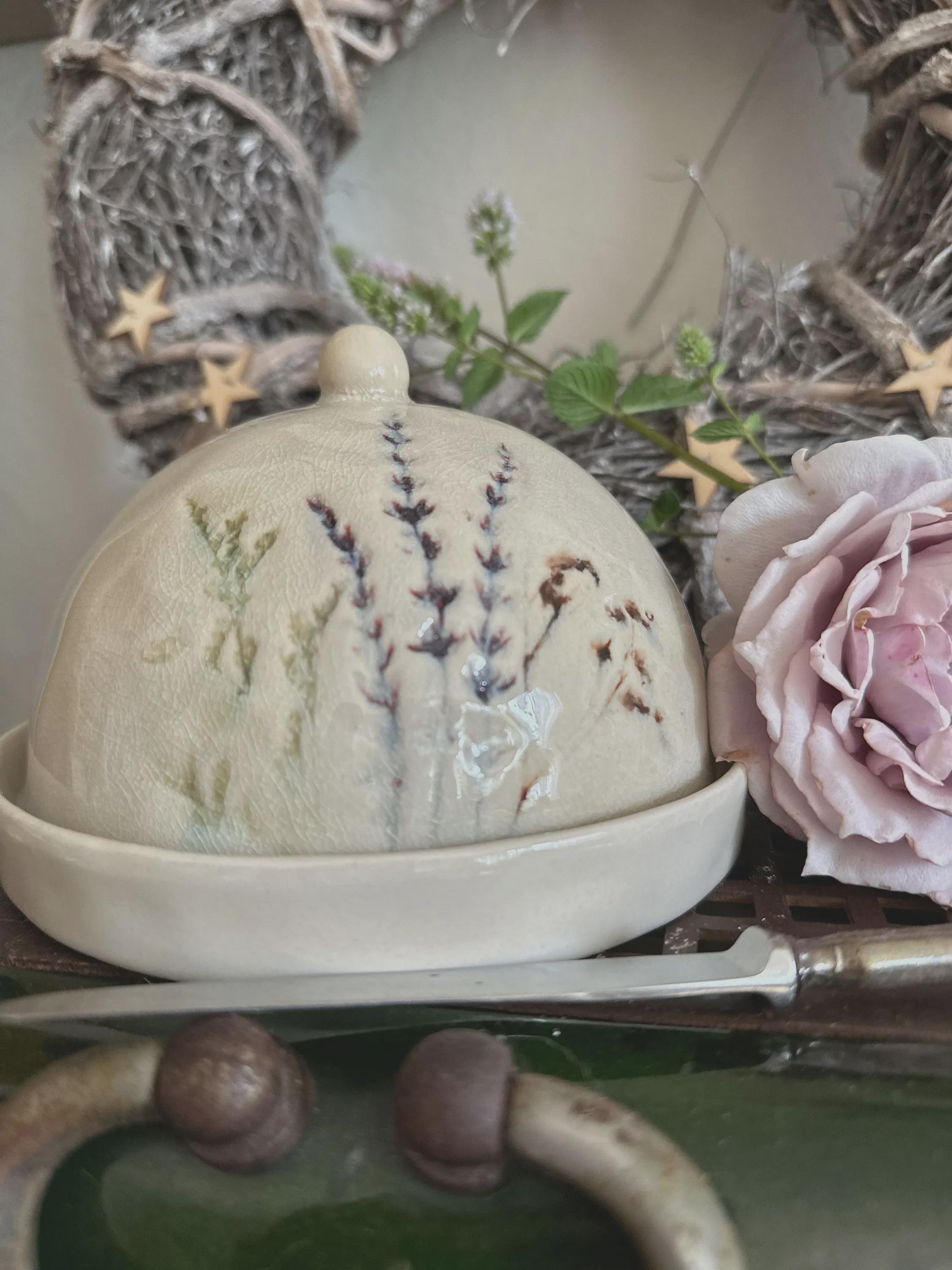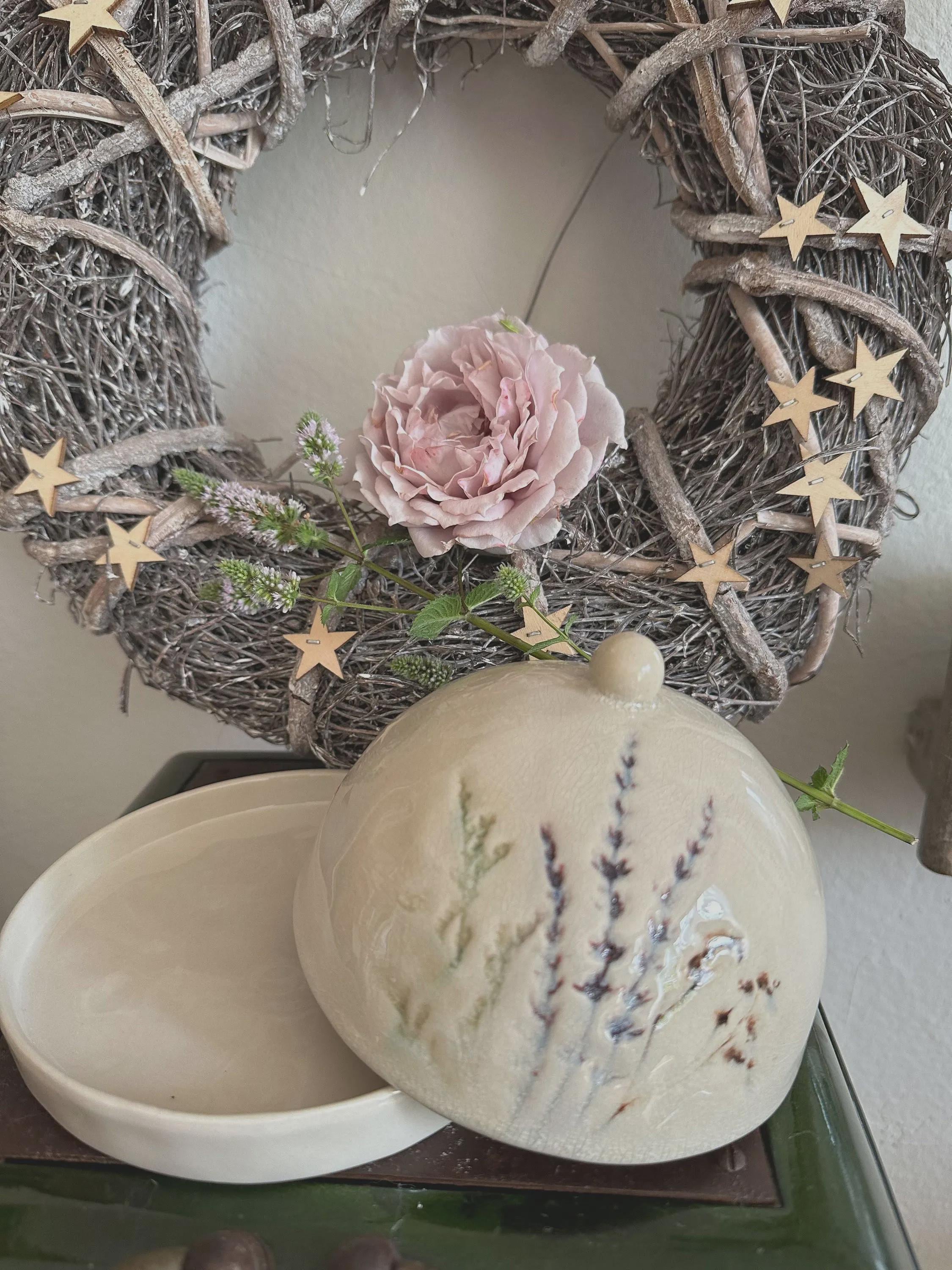 A butter dish – a beautiful stoneware item in natural colors, with a delicate floral motif printed on the crackle glaze. You can use it for butter, cheese, or many other storage items, or simply as a beautiful serving tray. The dish is handmade, so each piece is unique. Dishwasher safe.