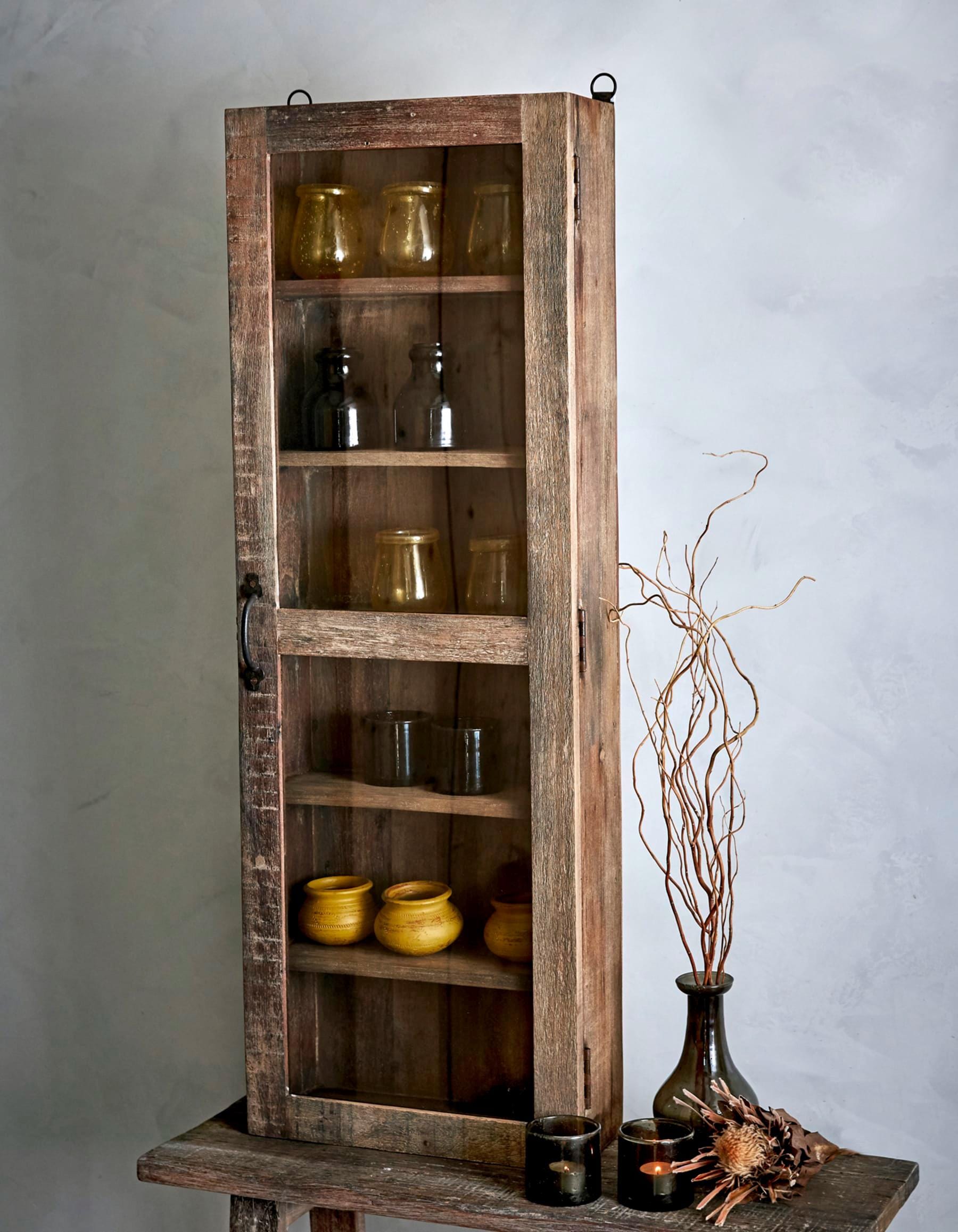 Greta's extravagant cabinet – a dream with a touch of industrial style paired with shabby chic and Nordic touches. A display case for standing or hanging, with an ambiance perfect for daydreaming. Friendly and cozy, it blends into a variety of interior styles and is an eye-catcher on your wall, whether in the bathroom, kitchen, or living room. An extravagant soloist with its lovely brown color – lovely little pieces of furniture can enhance your paradise. Inside, small treasures can be stylishly displayed and admired.