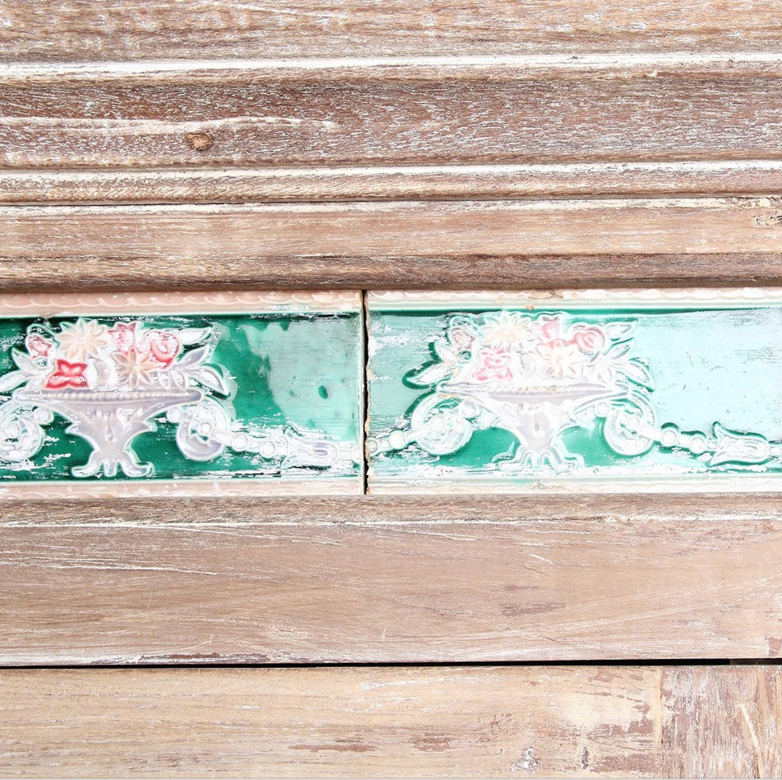 The distressed look exudes coziness and harmonizes beautifully with other wooden furniture. The iron handles skillfully complete the vintage look.