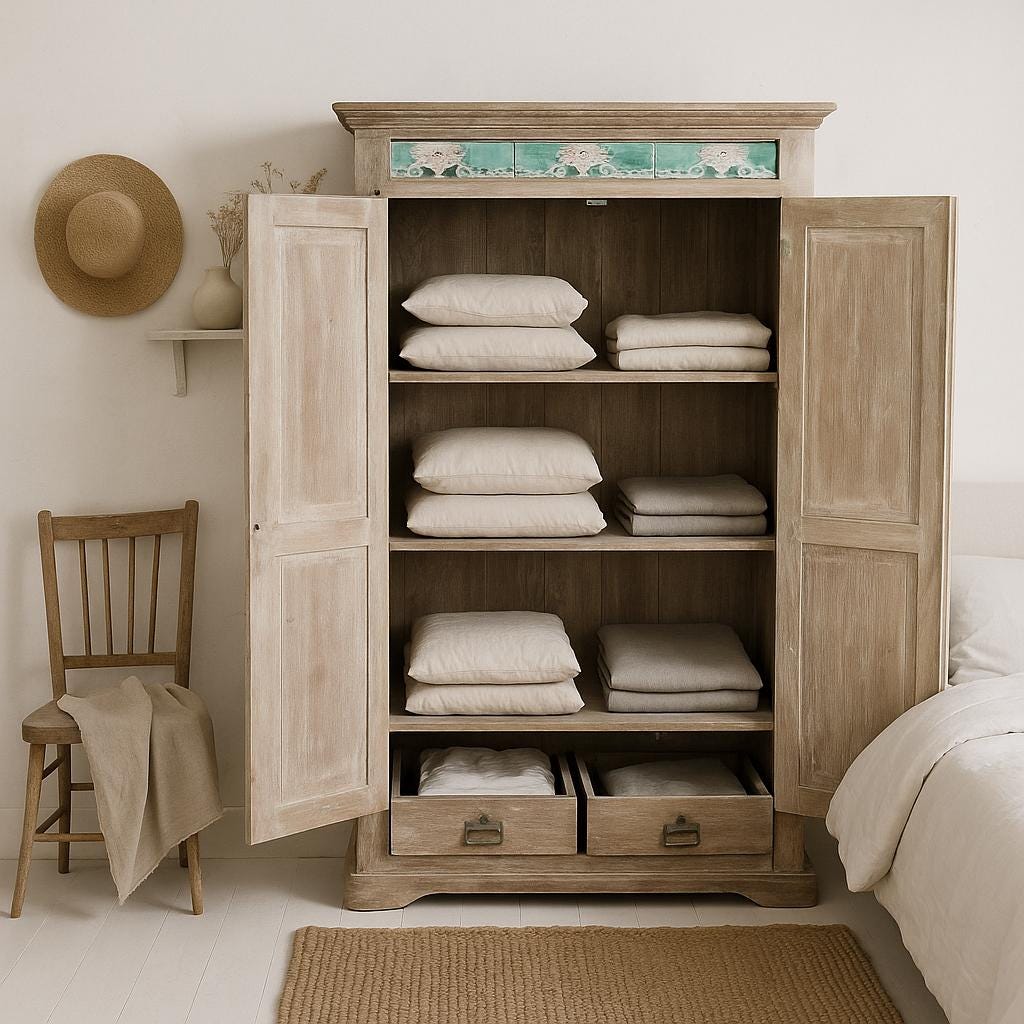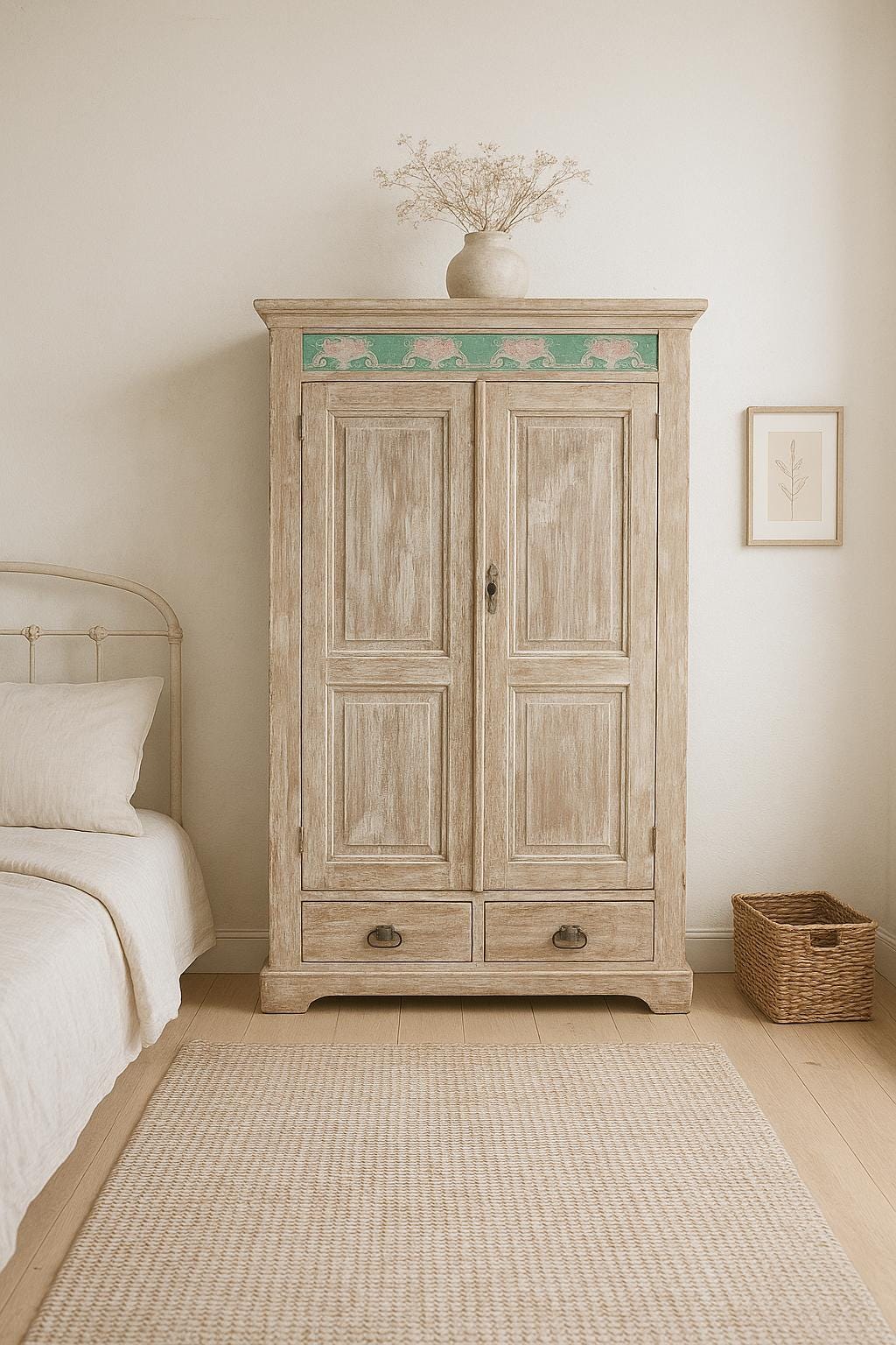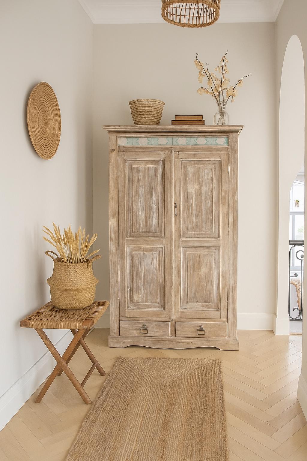 It offers space for many things, laundry, dishes, books... This delightful, unique cupboard in the light wood with a limewash look deserves a very special place.