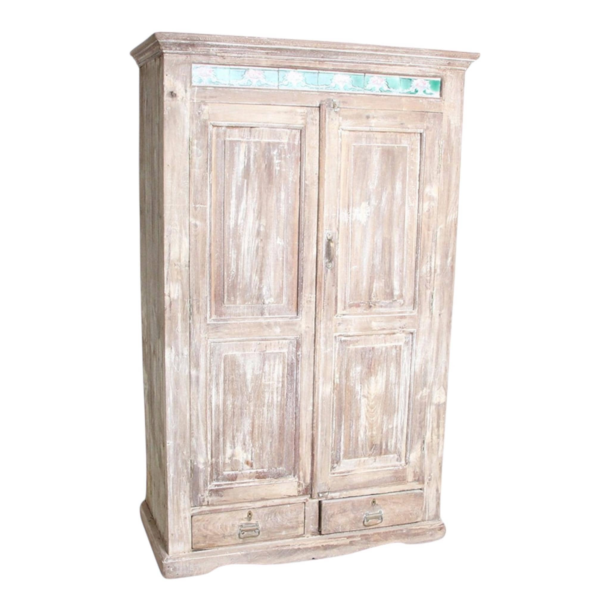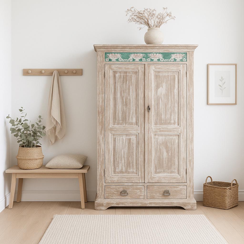 A unique pantry or linen cabinet - With a touch of vintage, this antique-looking cabinet offers ample storage space behind two doors with a comfortable depth of 42 cm. A truly unique cabinet with its ornamentation and light solid wood in a whitewash look.