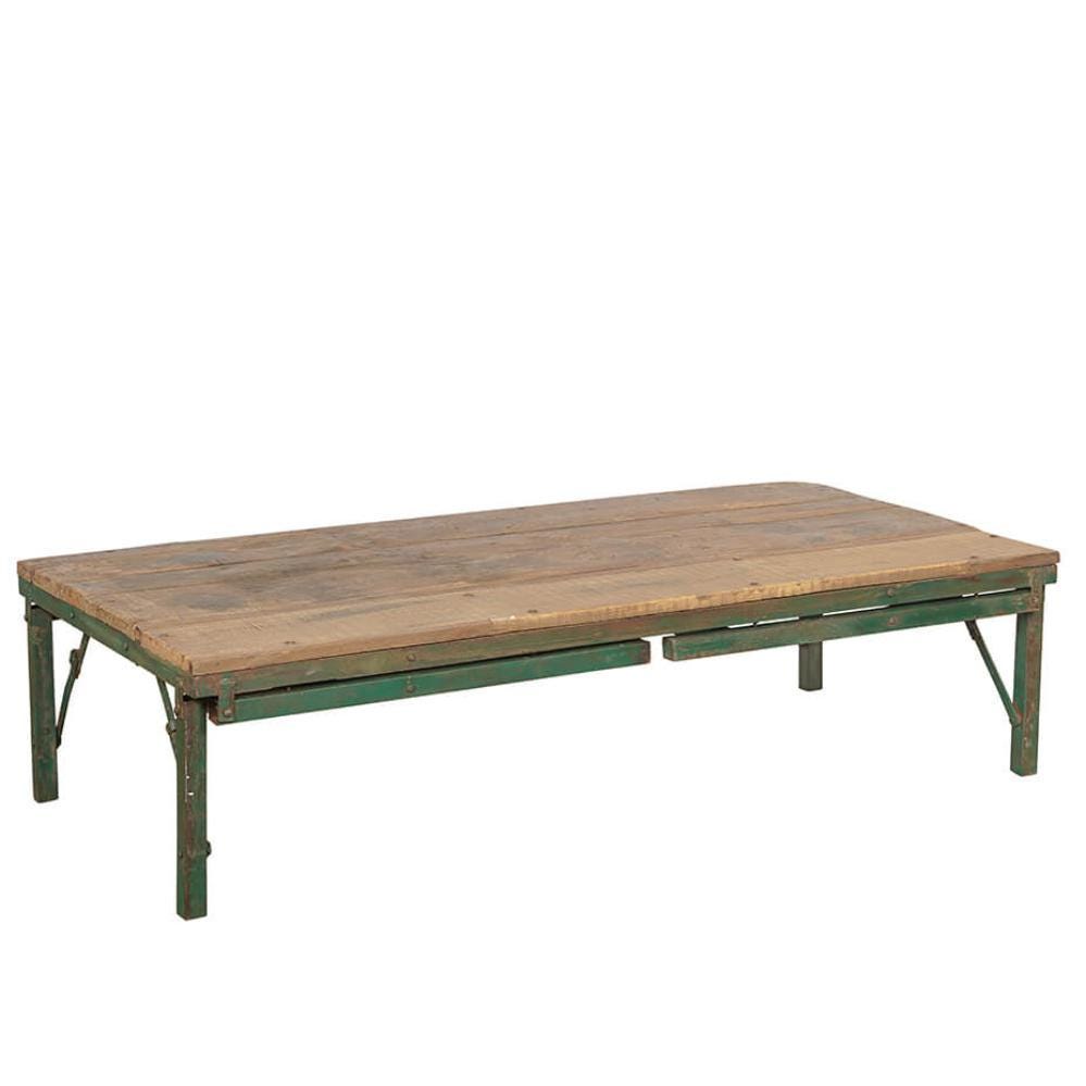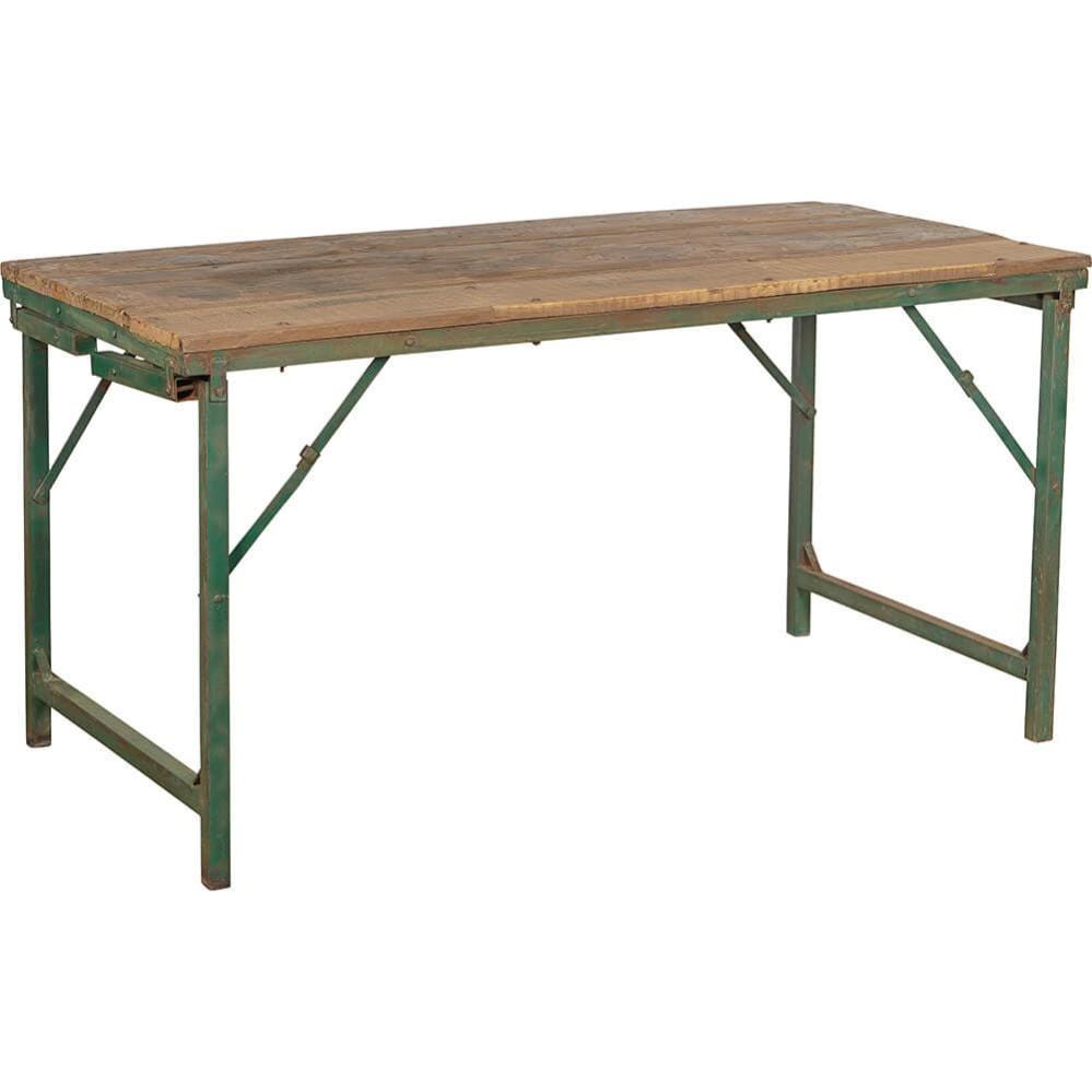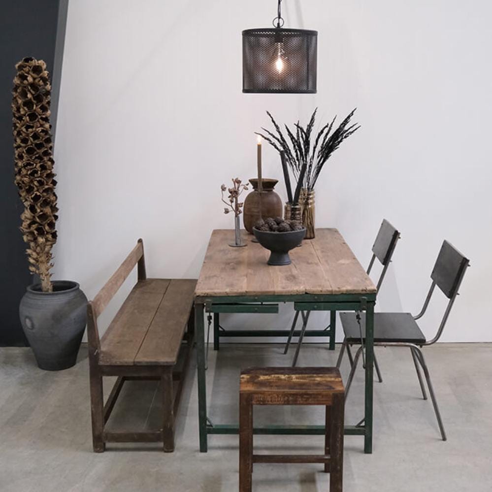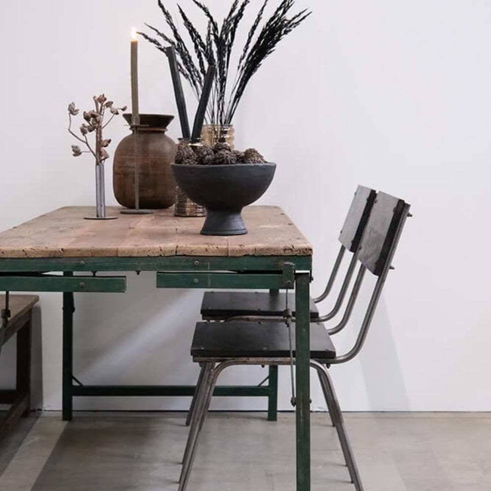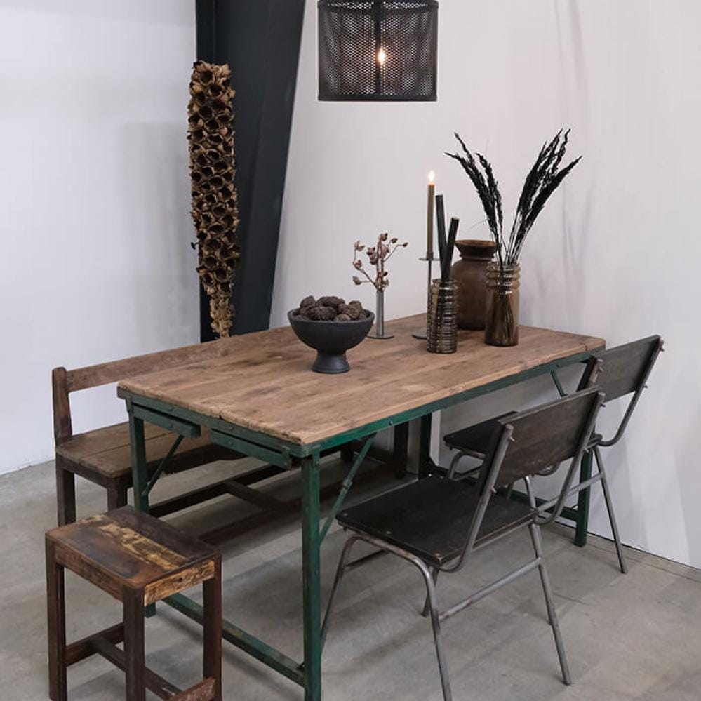 Greta's folding table, combining reclaimed wood and iron, evokes industrial style, reminiscent of old factories... reclaimed wood combined with iron and a beautiful patina – a real eye-catcher for your dream home. A table that defies categorization. With its foldable green iron frame and rustic wooden top, it can be used as a full-height dining table or a low coffee table – depending on how the legs are unfolded. Practical, rustic, and versatile.
