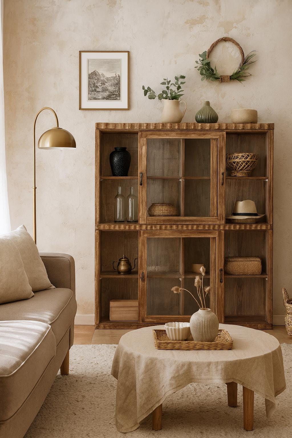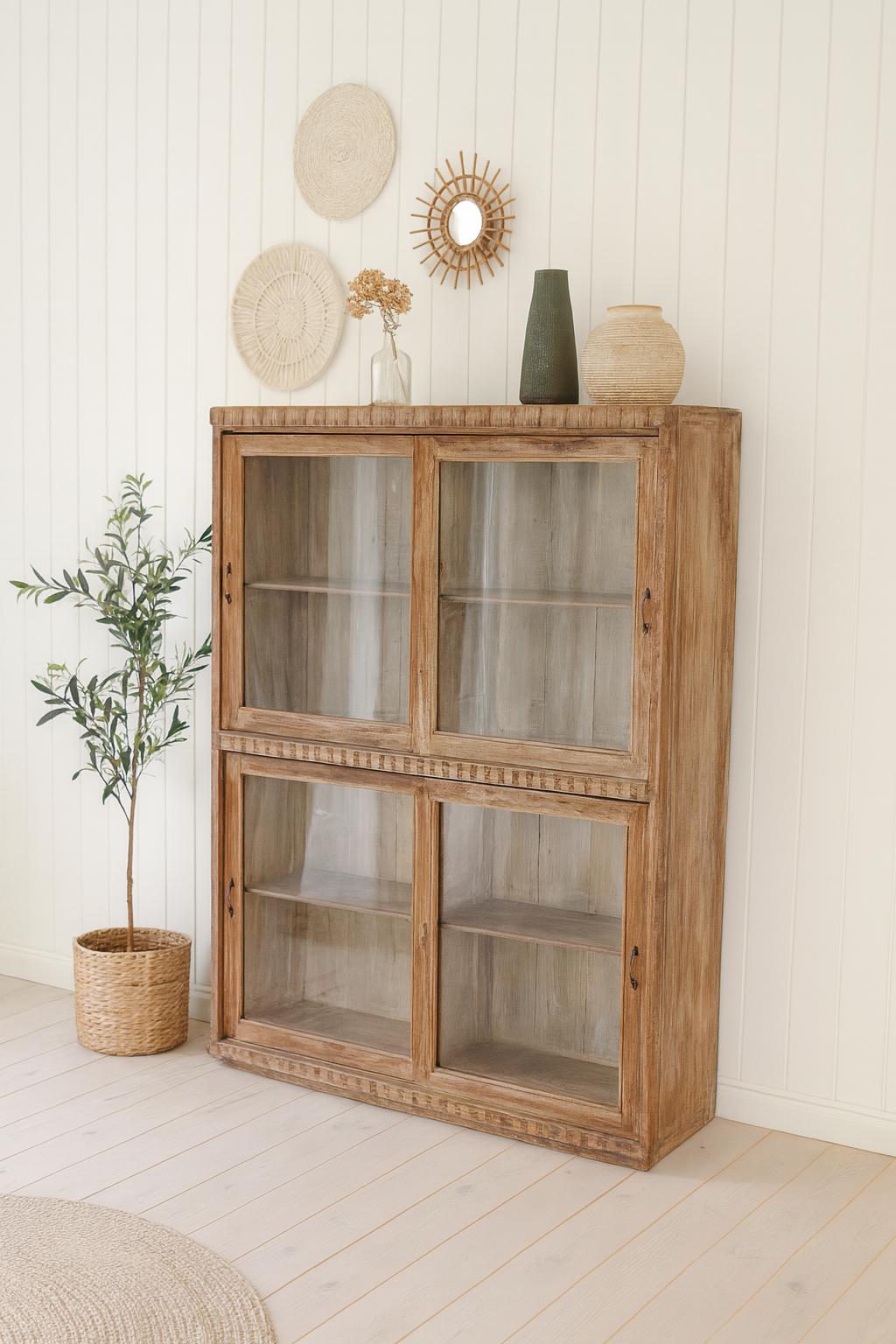 A spacious display cabinet with a comfortable depth of 36 cm... a truly enchanting gem from its era, with many exceptional extras and details... crafted with love and a flair for unique, unusual furniture. A breathtaking natural wood patina, exceptional latches and handles, ample storage space with four shelves, and the special feature: sliding doors. ❤️ A piece of furniture brimming with positive energy, a delight and eye-catcher for various living spaces... let yourself be enchanted and invited in!