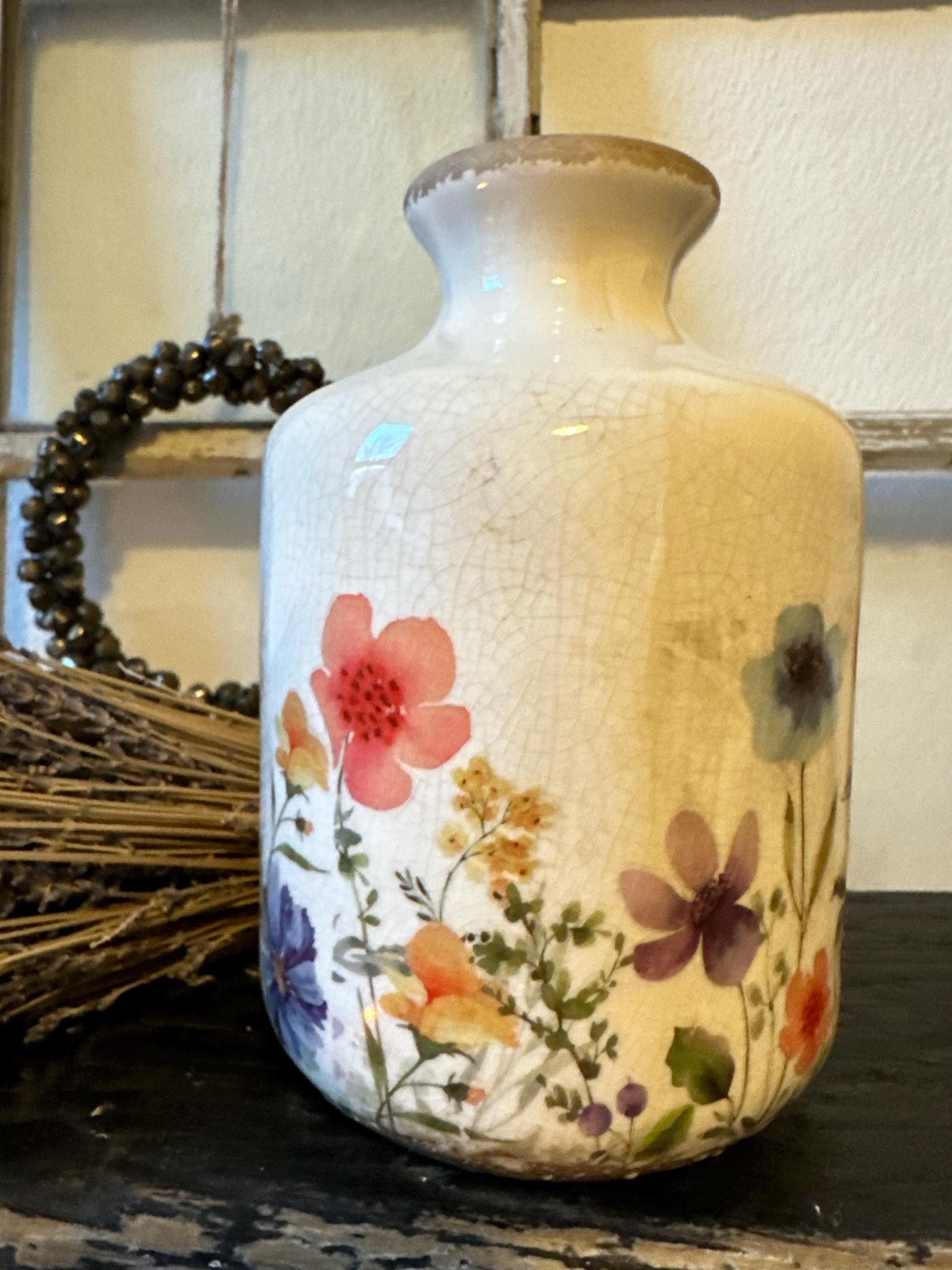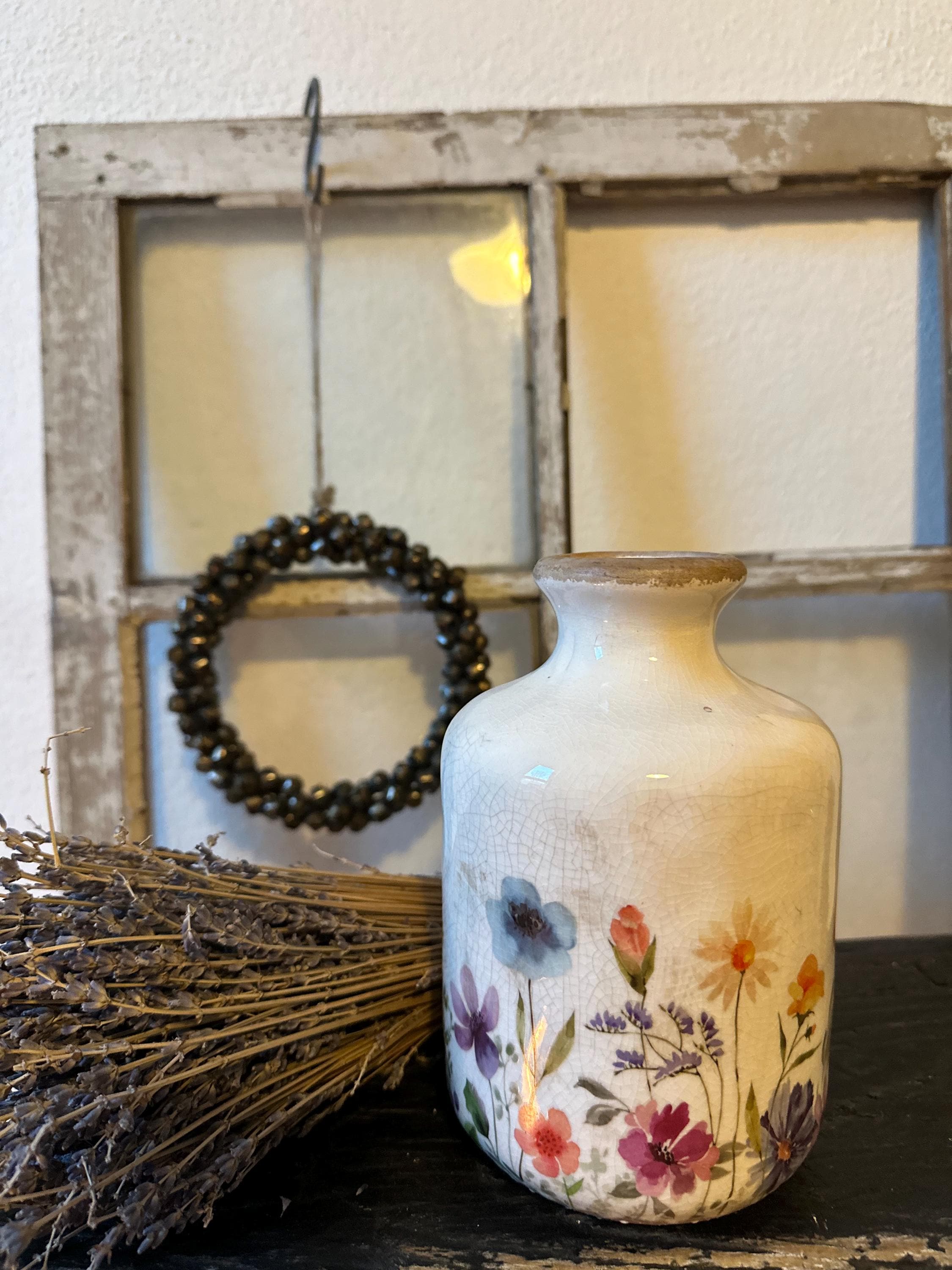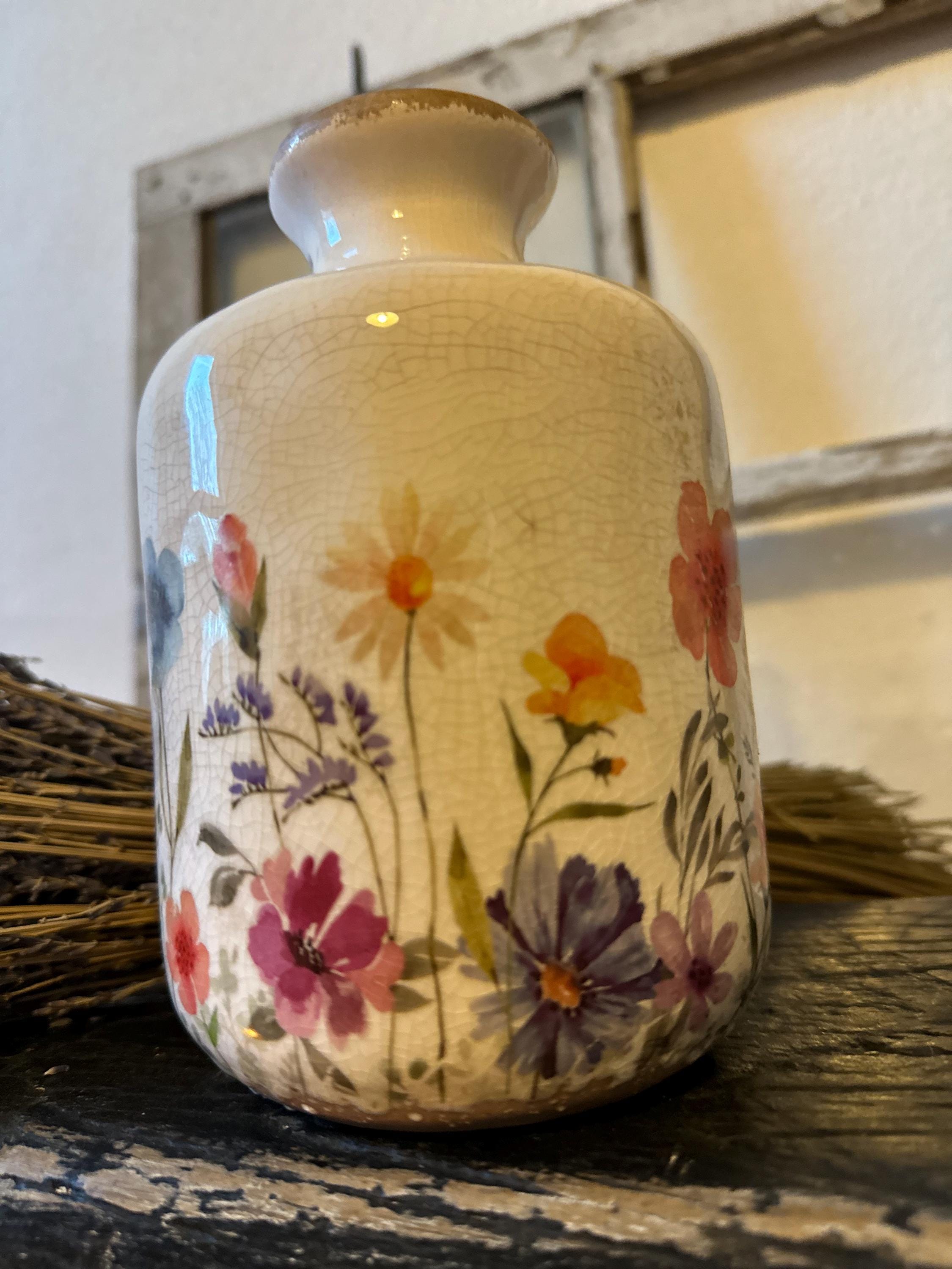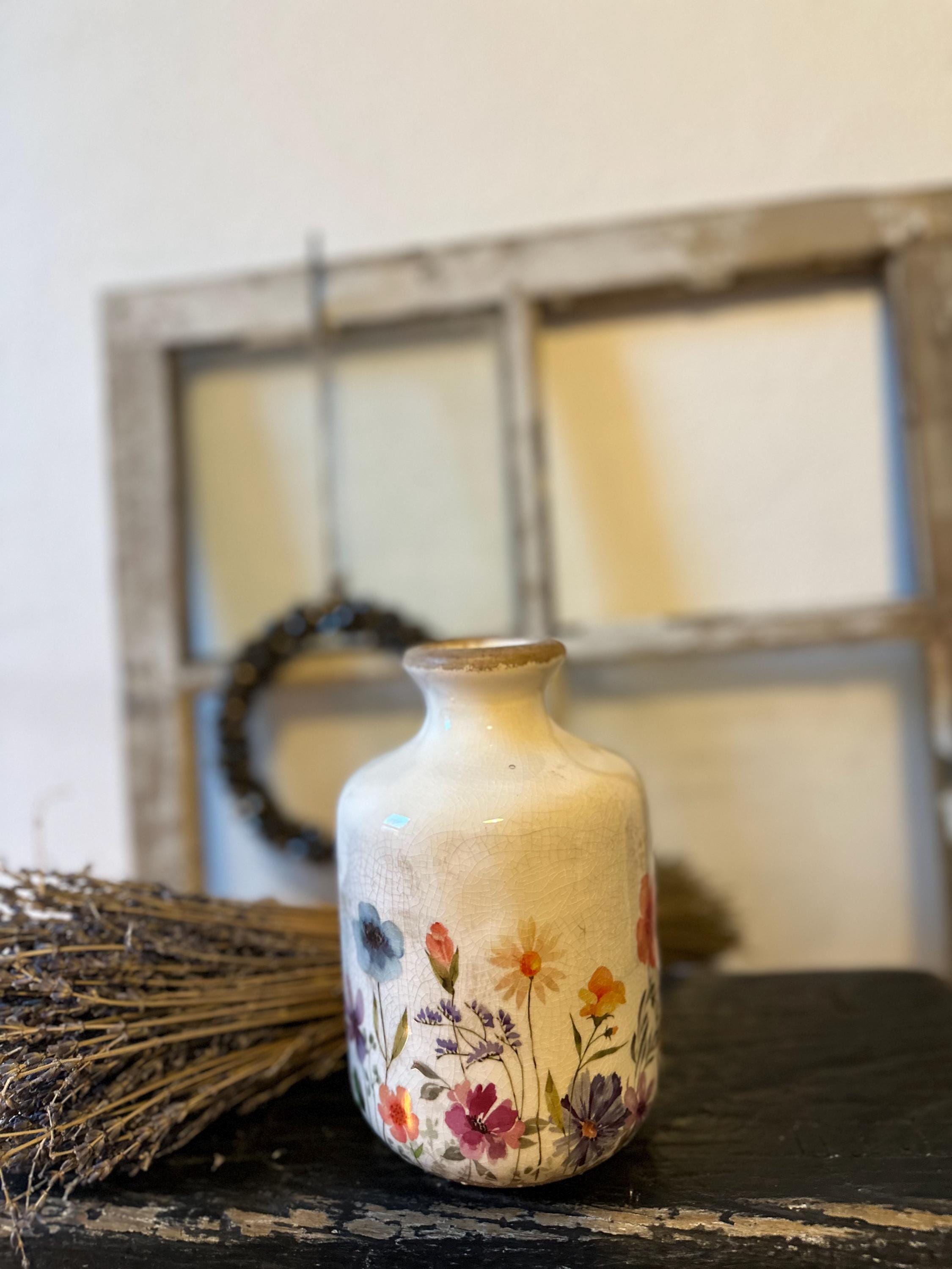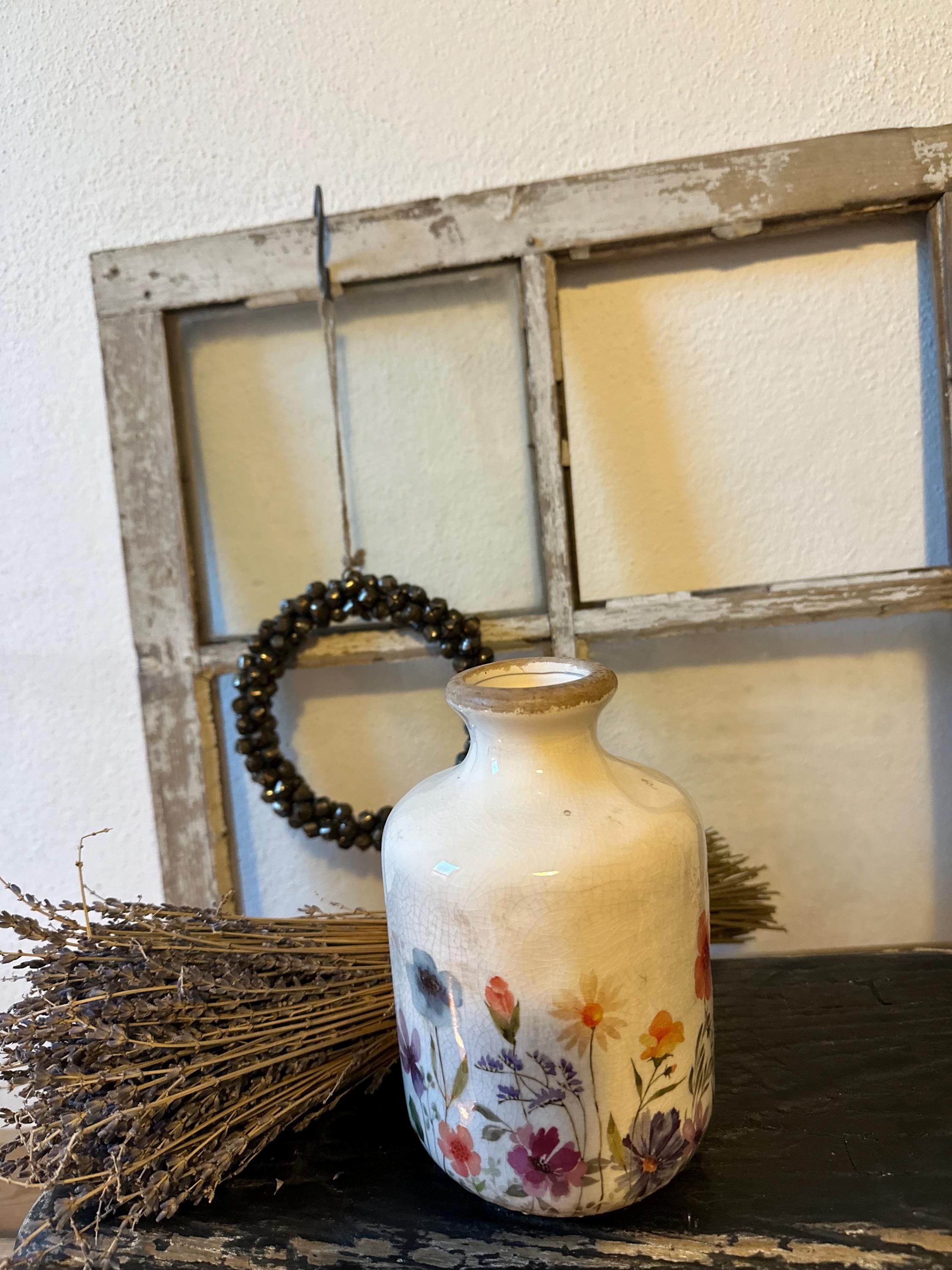 Greta's decor for your favorite places - a heart amidst happiness and clutter - in love with beautiful home accessories - here are beautiful bottle vases with a summery meadow pattern, modeled after old French originals - with the graceful pattern and the old cracked patina - enjoy the arranged view.