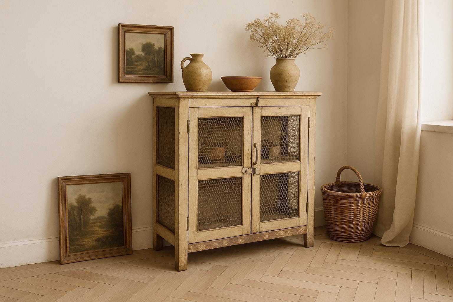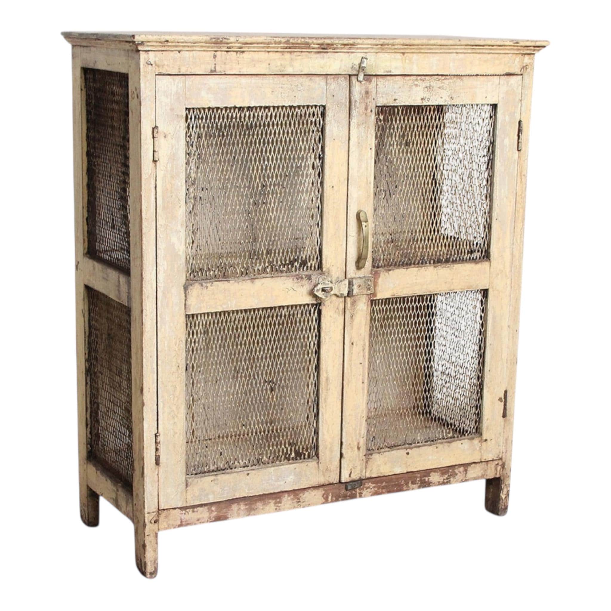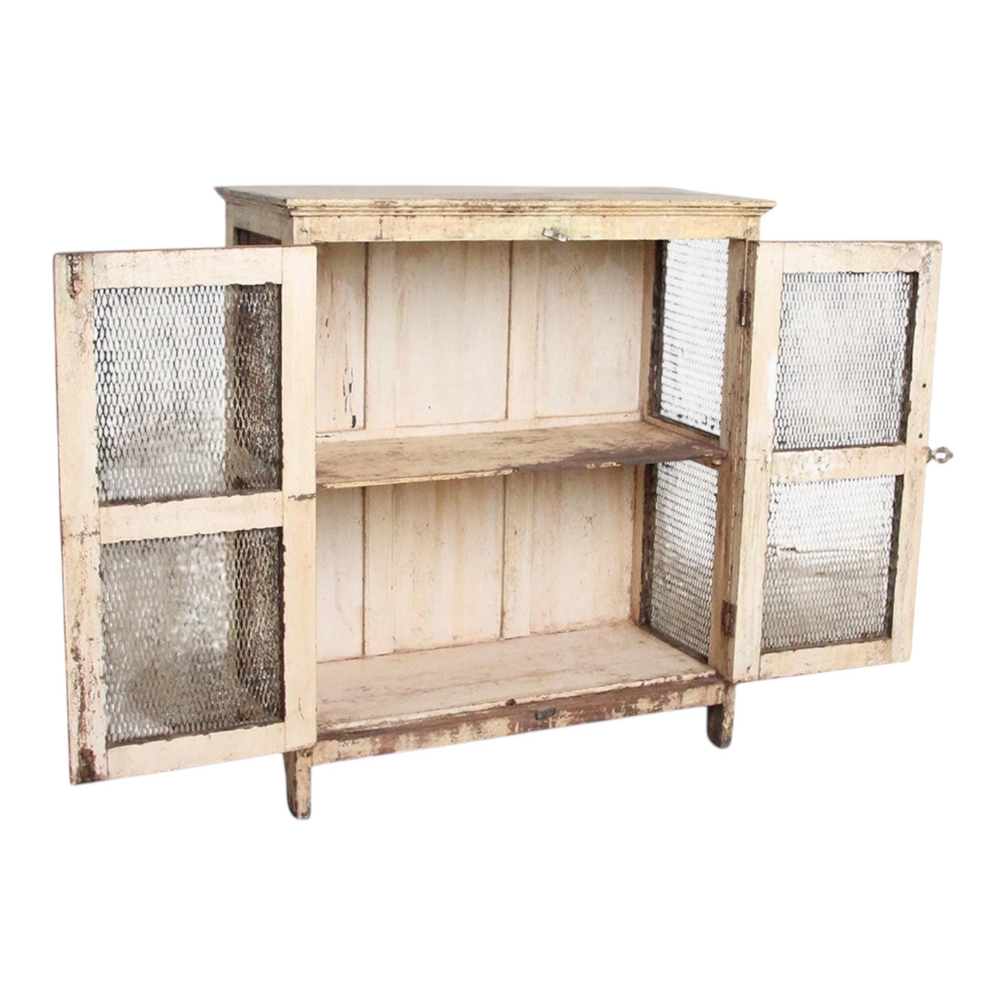 A favorite display cabinet – a small cabinet with great charisma! A dreamy old wooden cabinet with lattice doors, old-fashioned, refined latches and fittings. A worn patina gives it a charming, atmospheric look. A beautiful use for your favorite knick-knacks, dishes, linens, or even books. This piece of furniture adds a touch of vintage charm to any room and is the perfect choice for an exceptional interior. You can easily combine it with modern or antique pieces – exceptionally beautiful with its many loving details and unique patina. Let yourself be inspired.