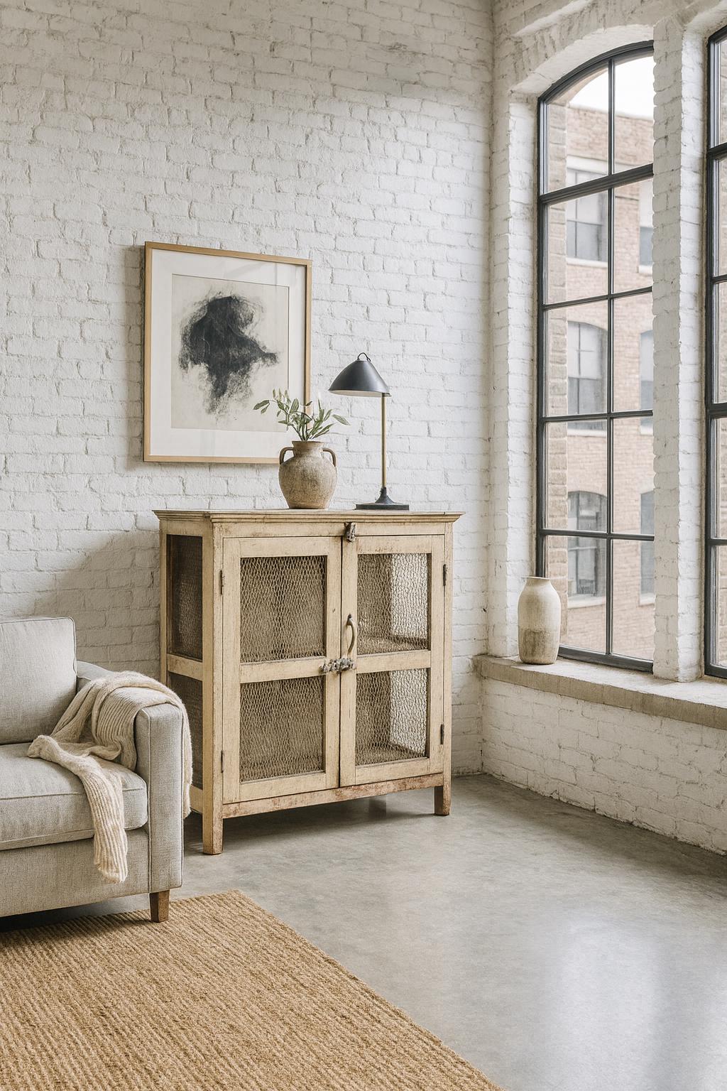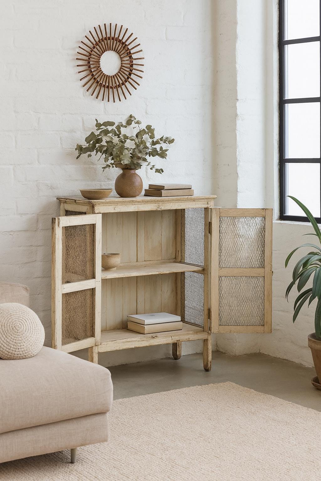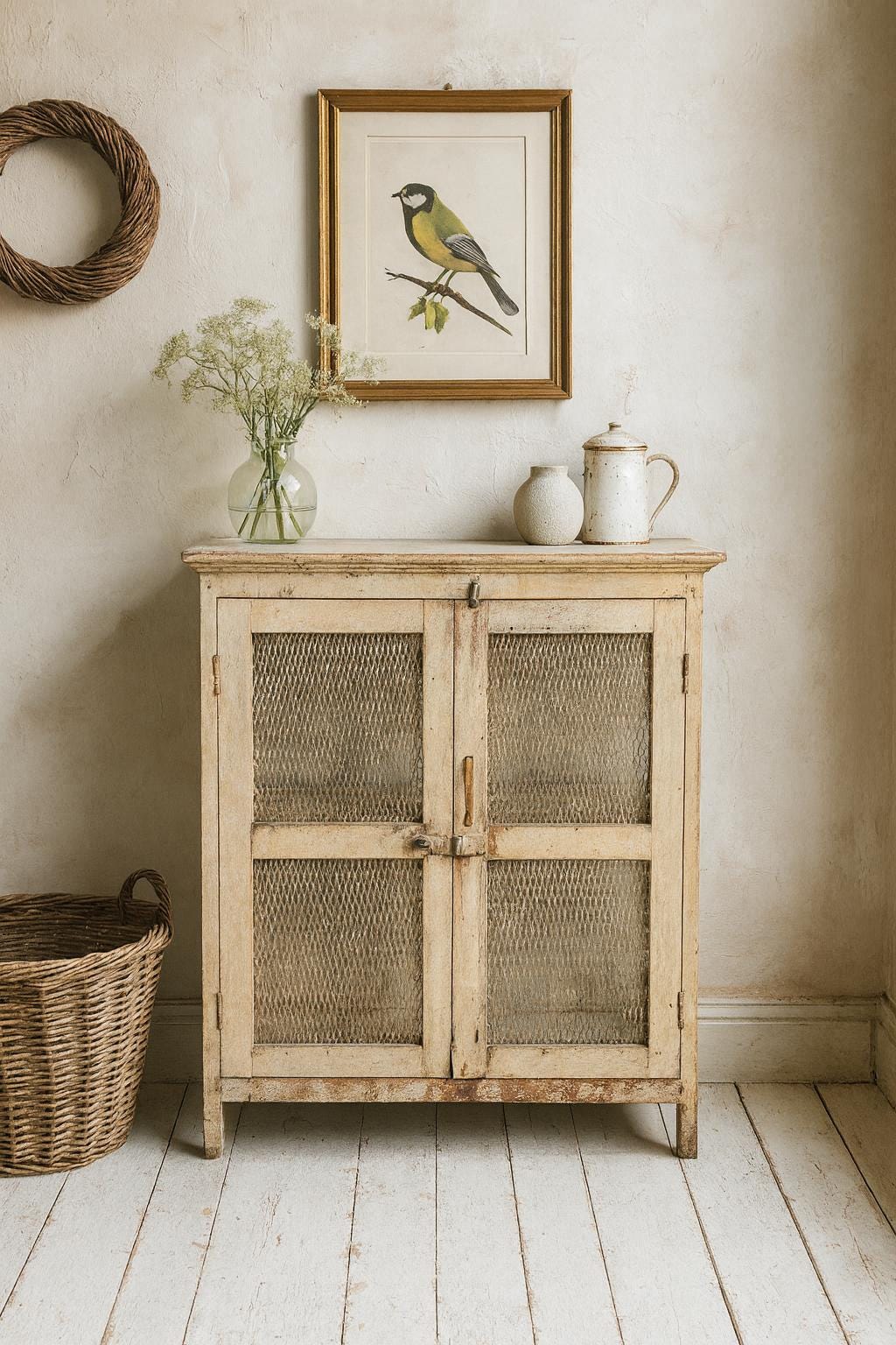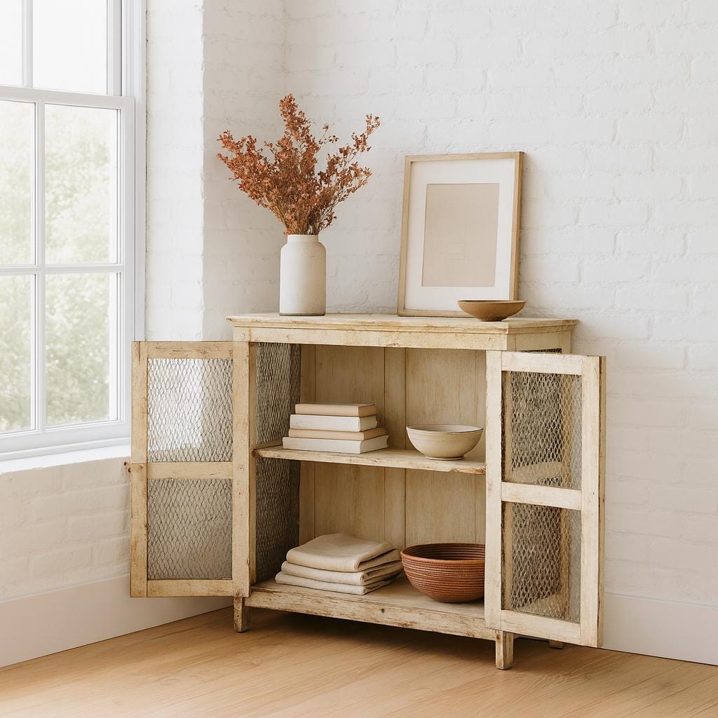 A favorite display cabinet – a small cabinet with great charisma! A dreamy old wooden cabinet with lattice doors, old-fashioned, refined latches and fittings. A worn patina gives it a charming, atmospheric look. A beautiful use for your favorite knick-knacks, dishes, linens, or even books. This piece of furniture adds a touch of vintage charm to any room and is the perfect choice for an exceptional interior. You can easily combine it with modern or antique pieces – exceptionally beautiful with its many loving details and unique patina. Let yourself be inspired.