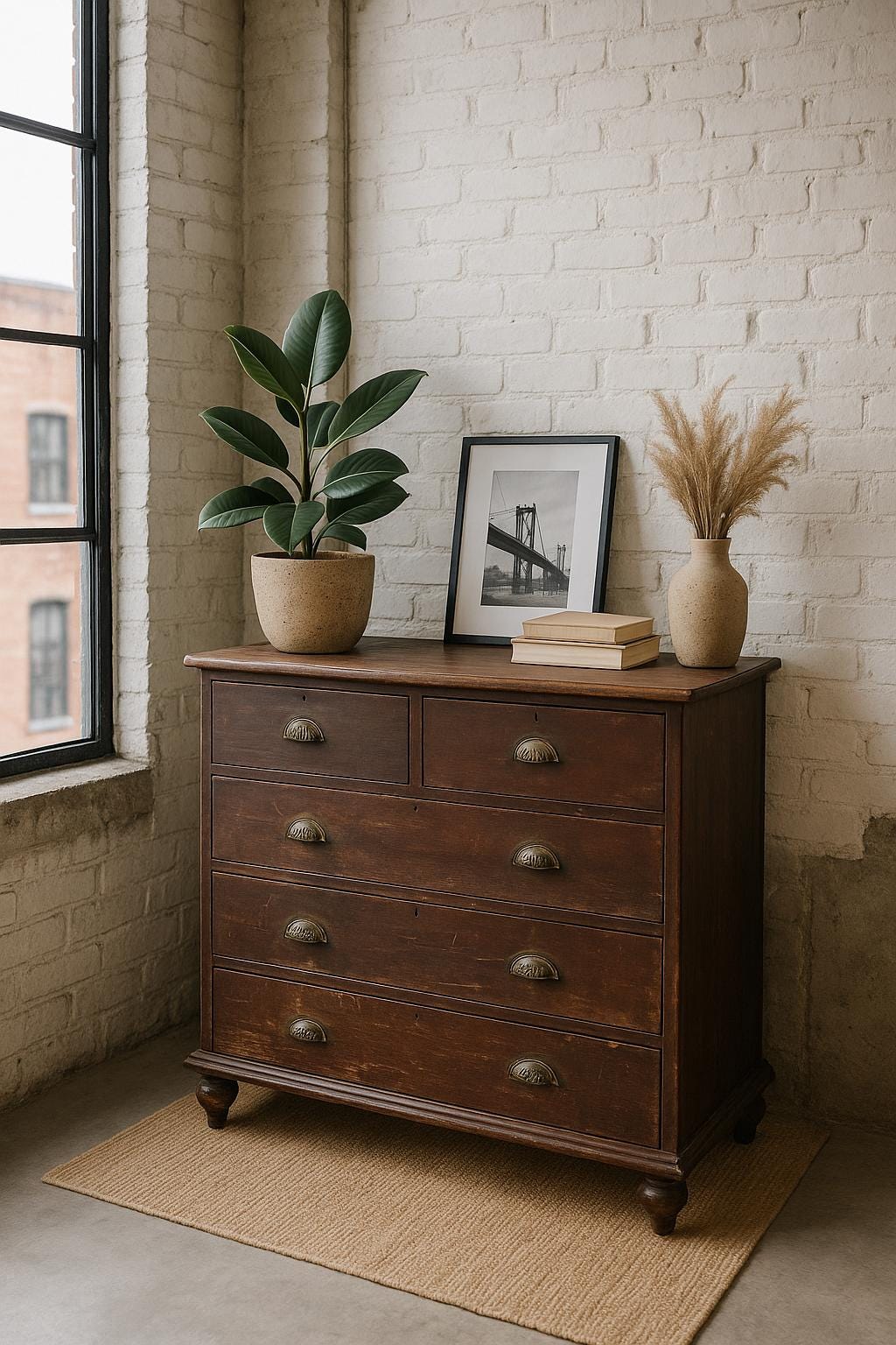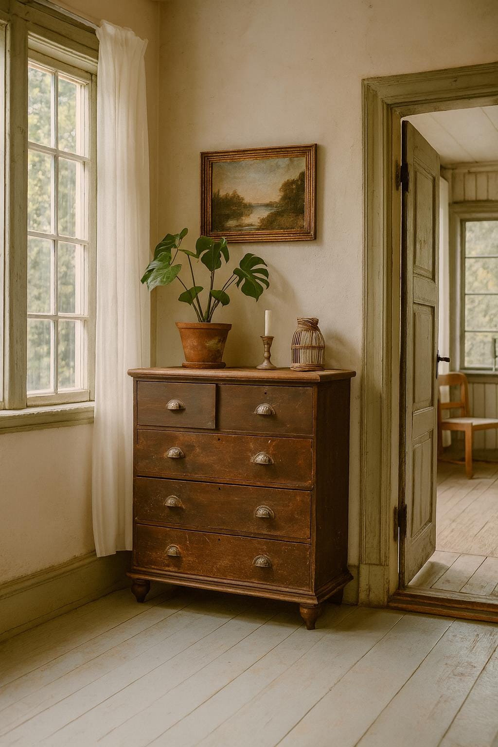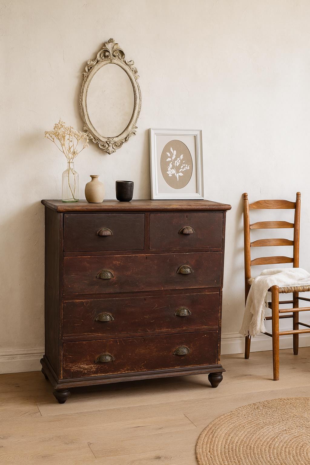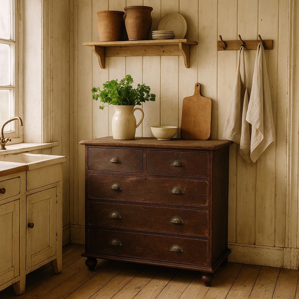 The old brown chest of drawers with its natural finish is a true gem - a unique piece of furniture made of solid wood, sturdy with all its nooks and crannies... a very special treasure awaits its use... in every room it will be an eye-catcher and not just another piece of furniture.