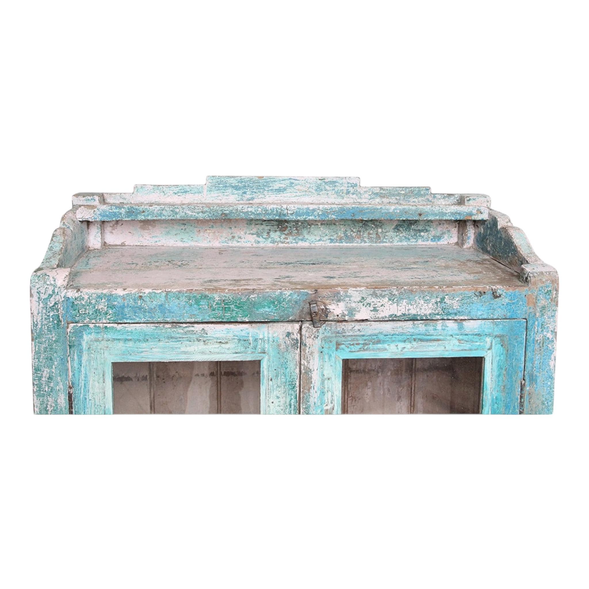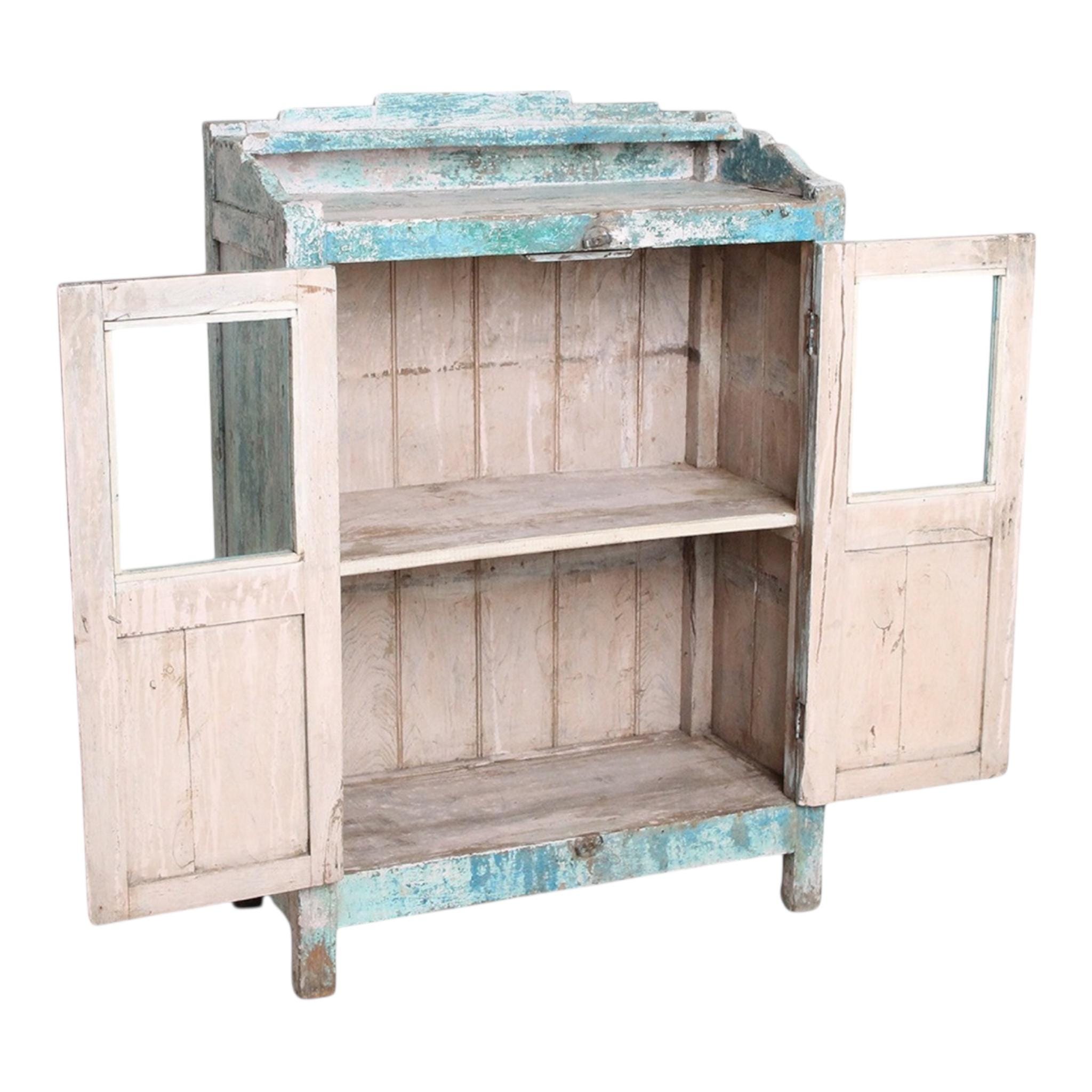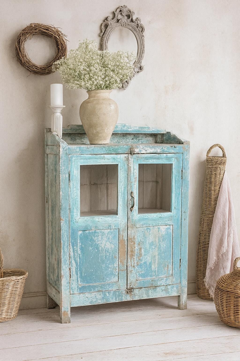 This display cabinet presents the old, rustic feeling of home, not perfect but unique and dreamy in its vintage green ambiance, the old fittings and the witty clasp - small details with a big impact, if you are looking for something special this is exactly the right thing.