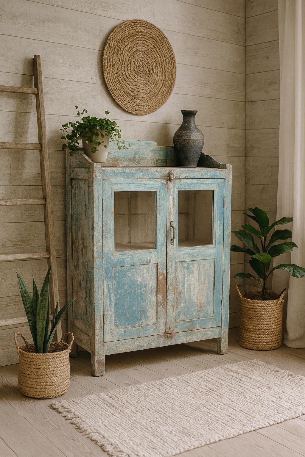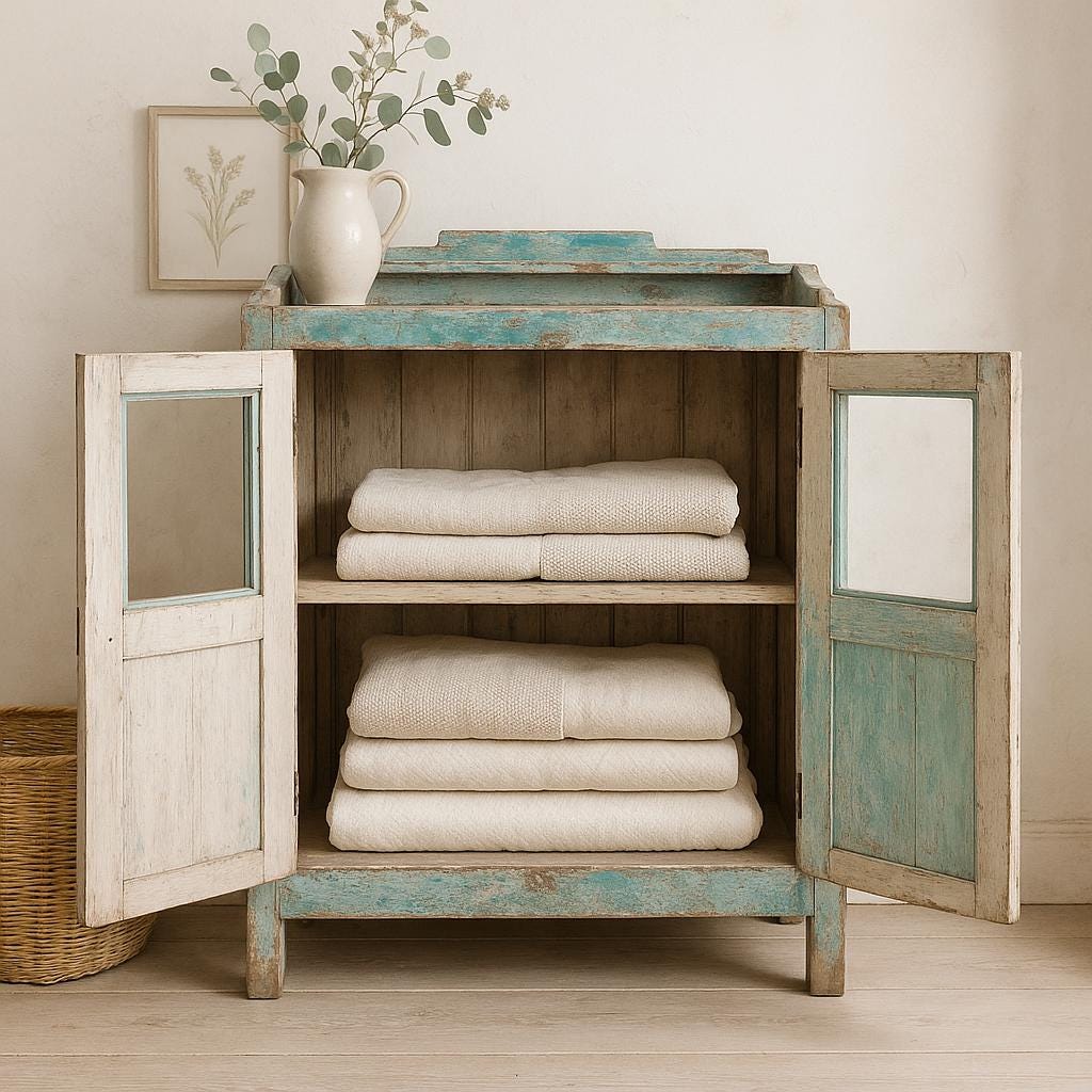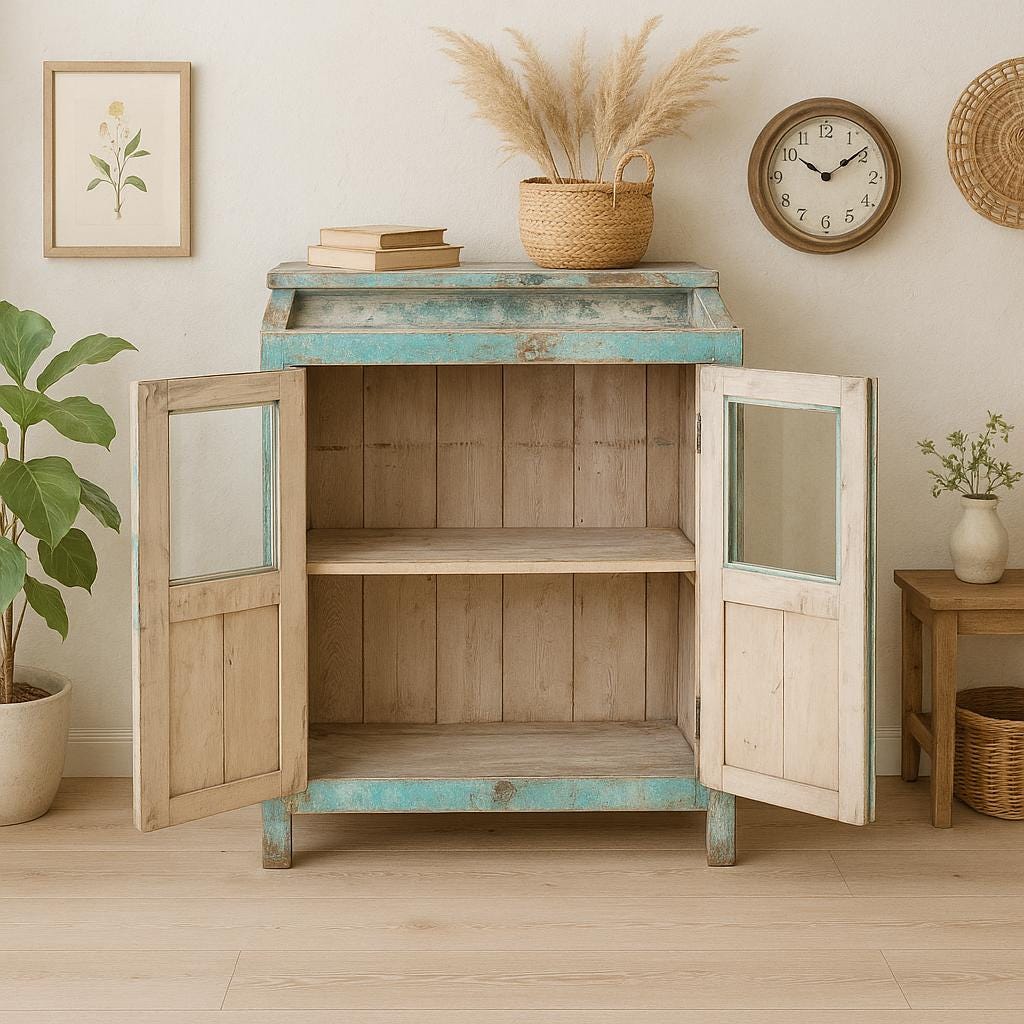 This display cabinet presents the old, rustic feeling of home, not perfect but unique and dreamy in its vintage green ambiance, the old fittings and the witty clasp - small details with a big impact, if you are looking for something special this is exactly the right thing.