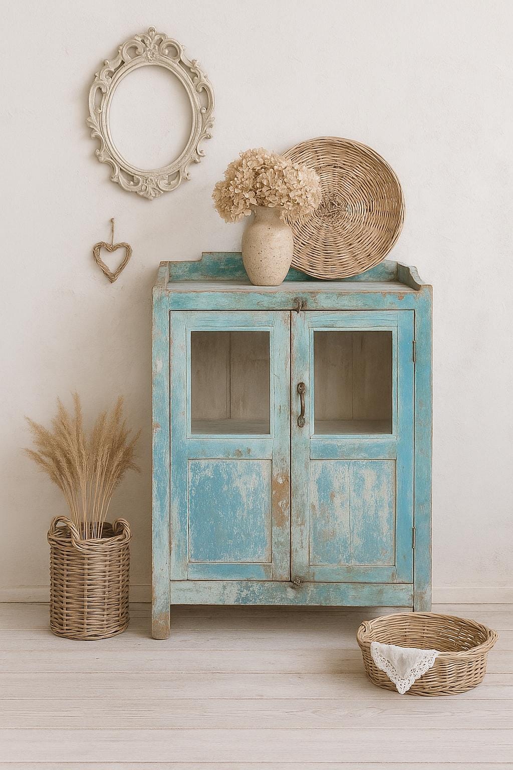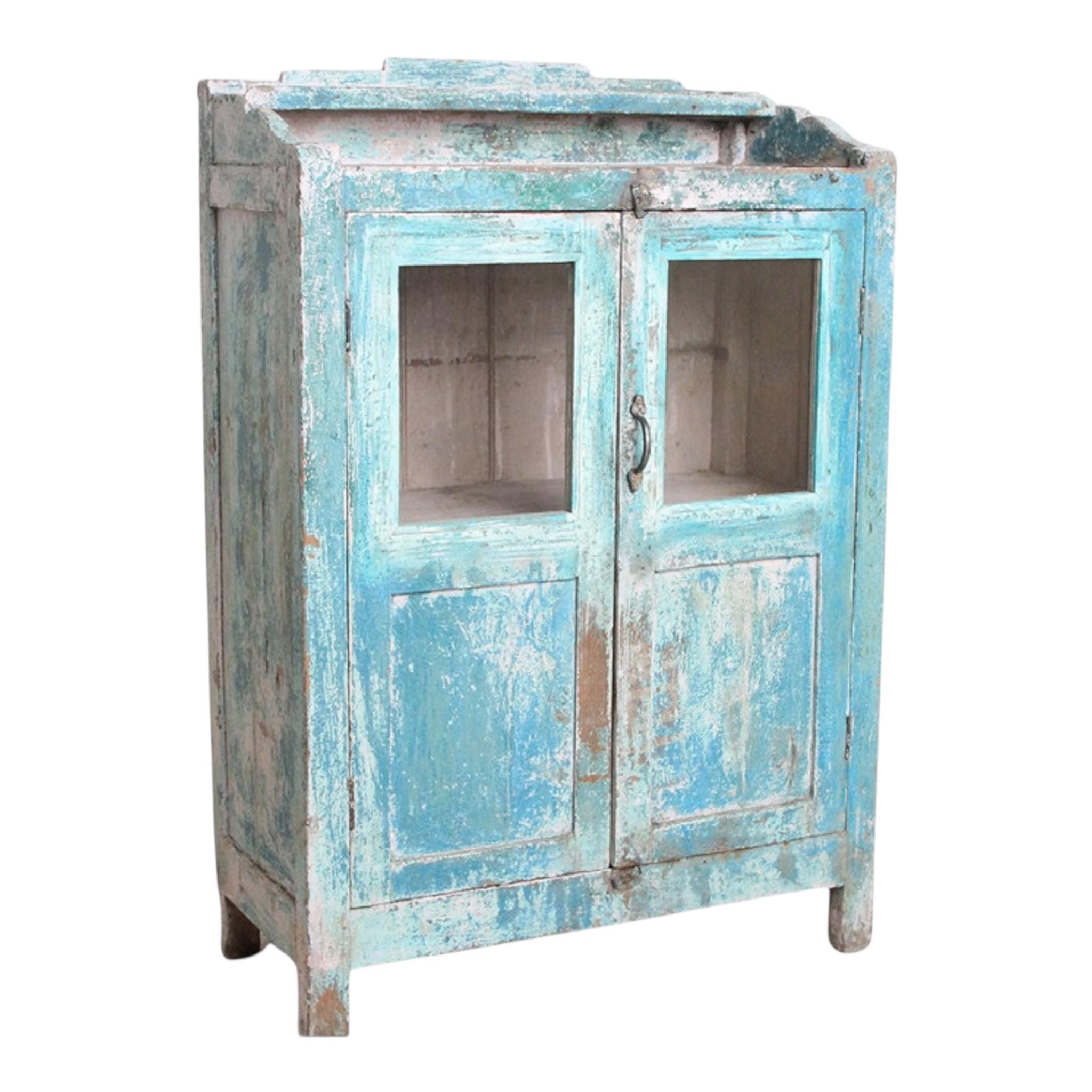 Greta's unique display cabinet - an incredibly beautiful azure blue display cabinet with a small light pink touch, with glass doors, for storing your favorite items.