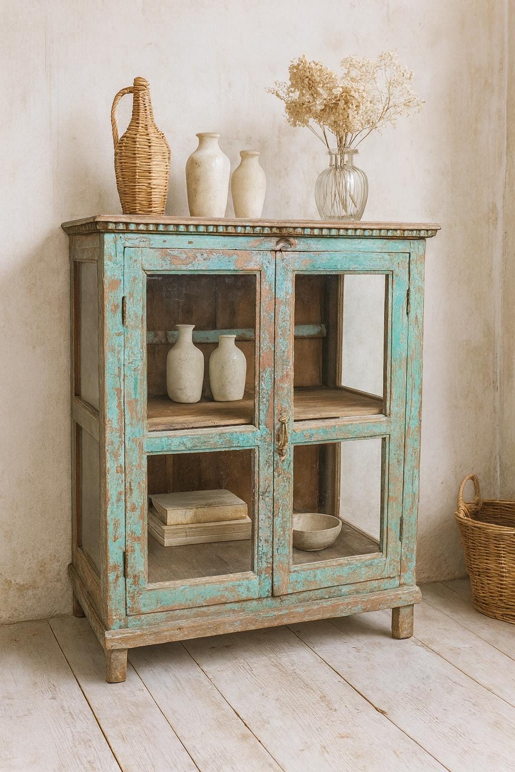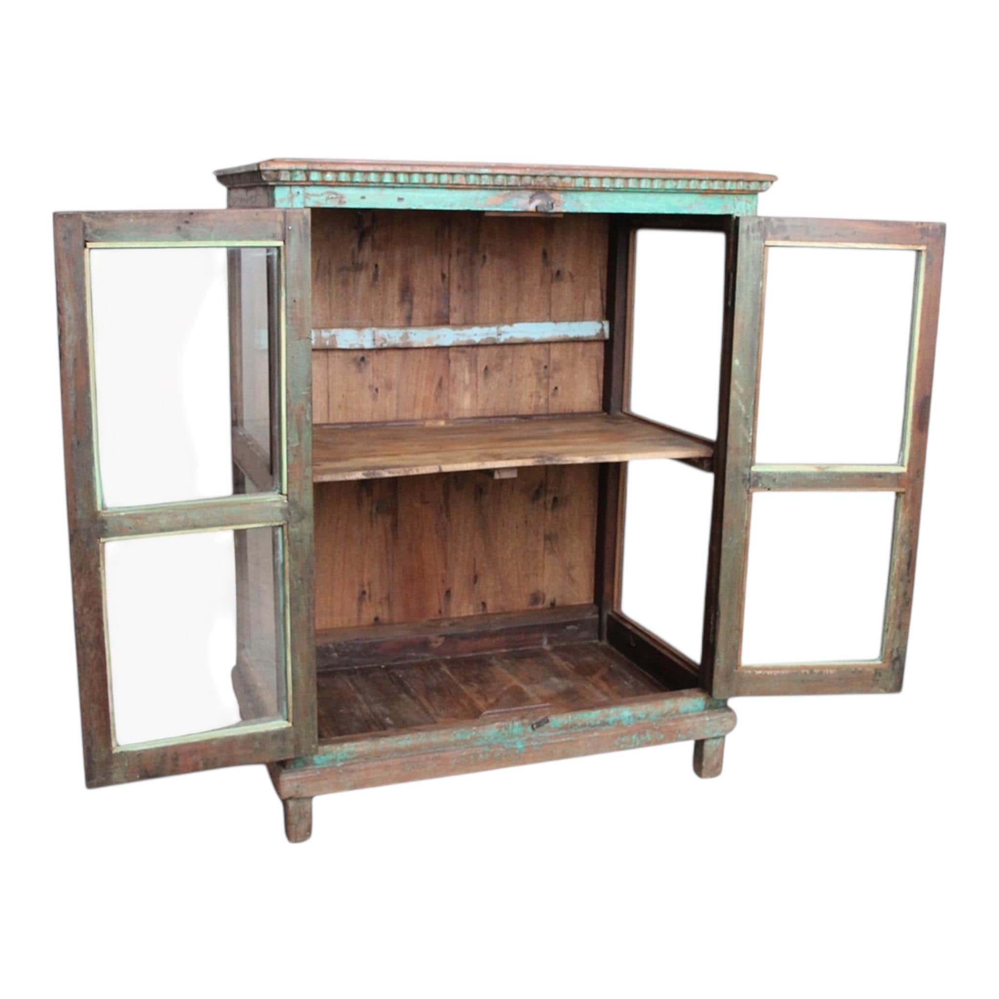 This display cabinet presents the old, rustic living feeling, not perfect but unique and dreamy in its charisma in its vintage - an old patina, the old fittings and the funny closure - small details with a big effect, if you are looking for something special this is exactly the right thing.