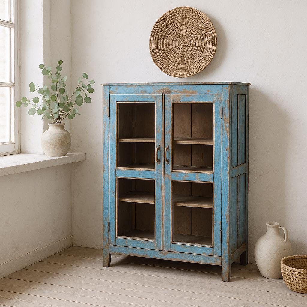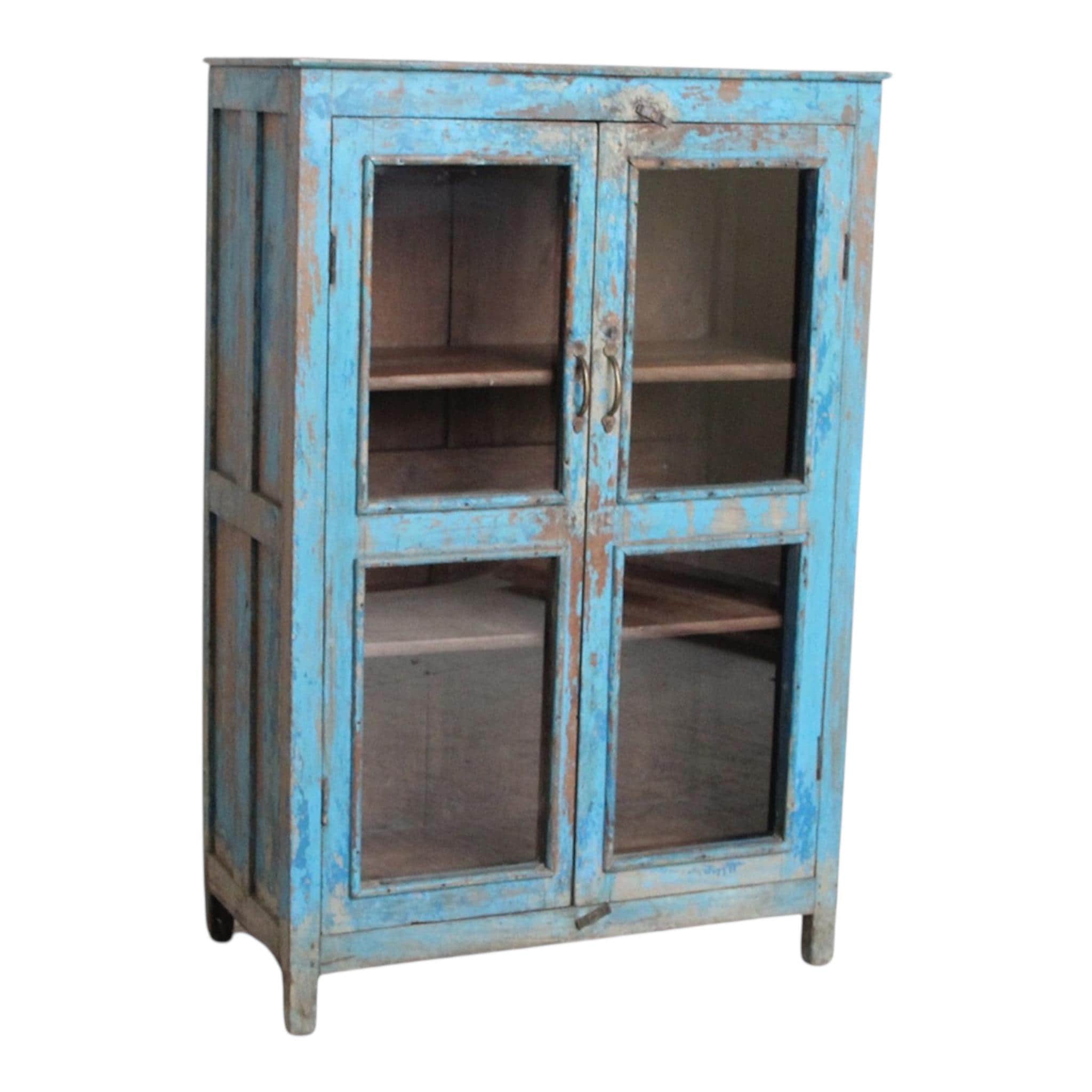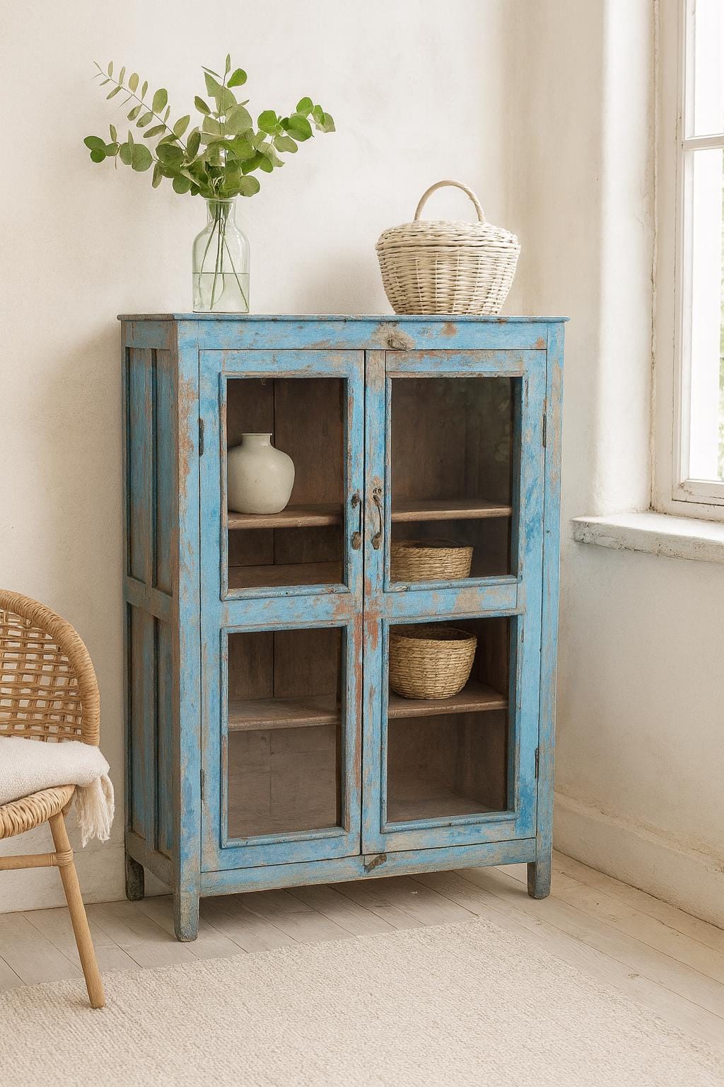 This display cabinet presents the old, rustic feeling of living, not perfect but unique and dreamy in its charisma with its vintage azure blue, the old fittings and the funny closure - small details with a big effect, if you are looking for something special this is exactly the right thing.