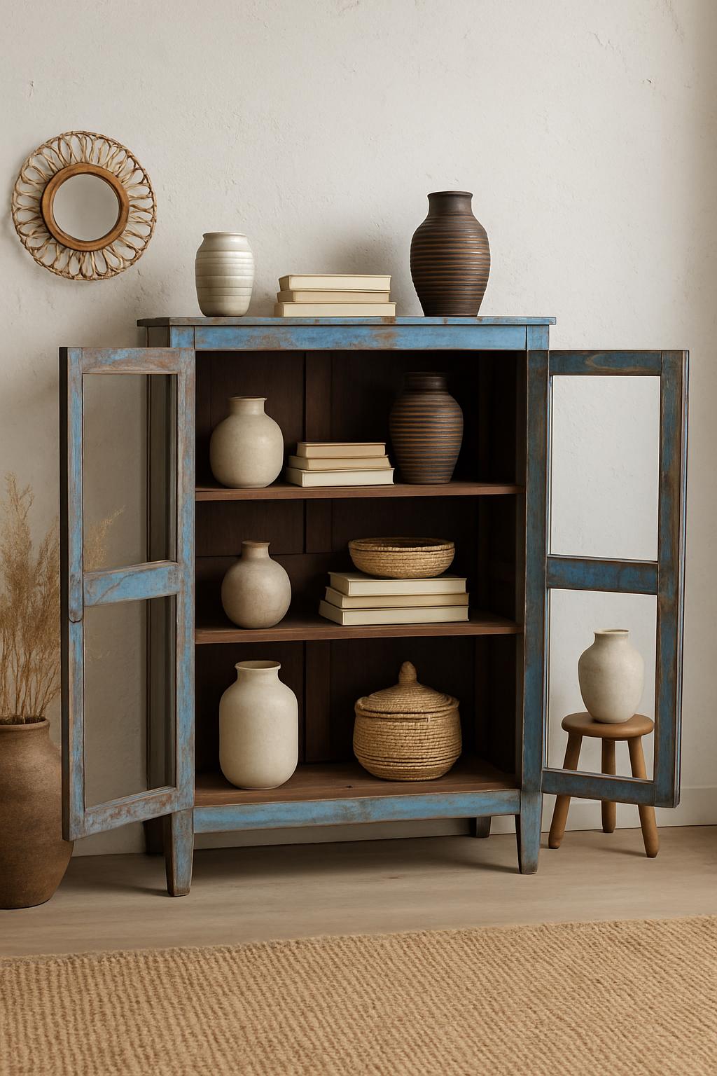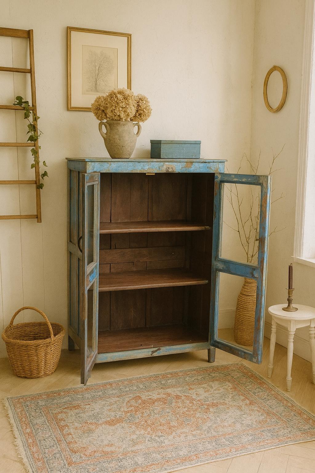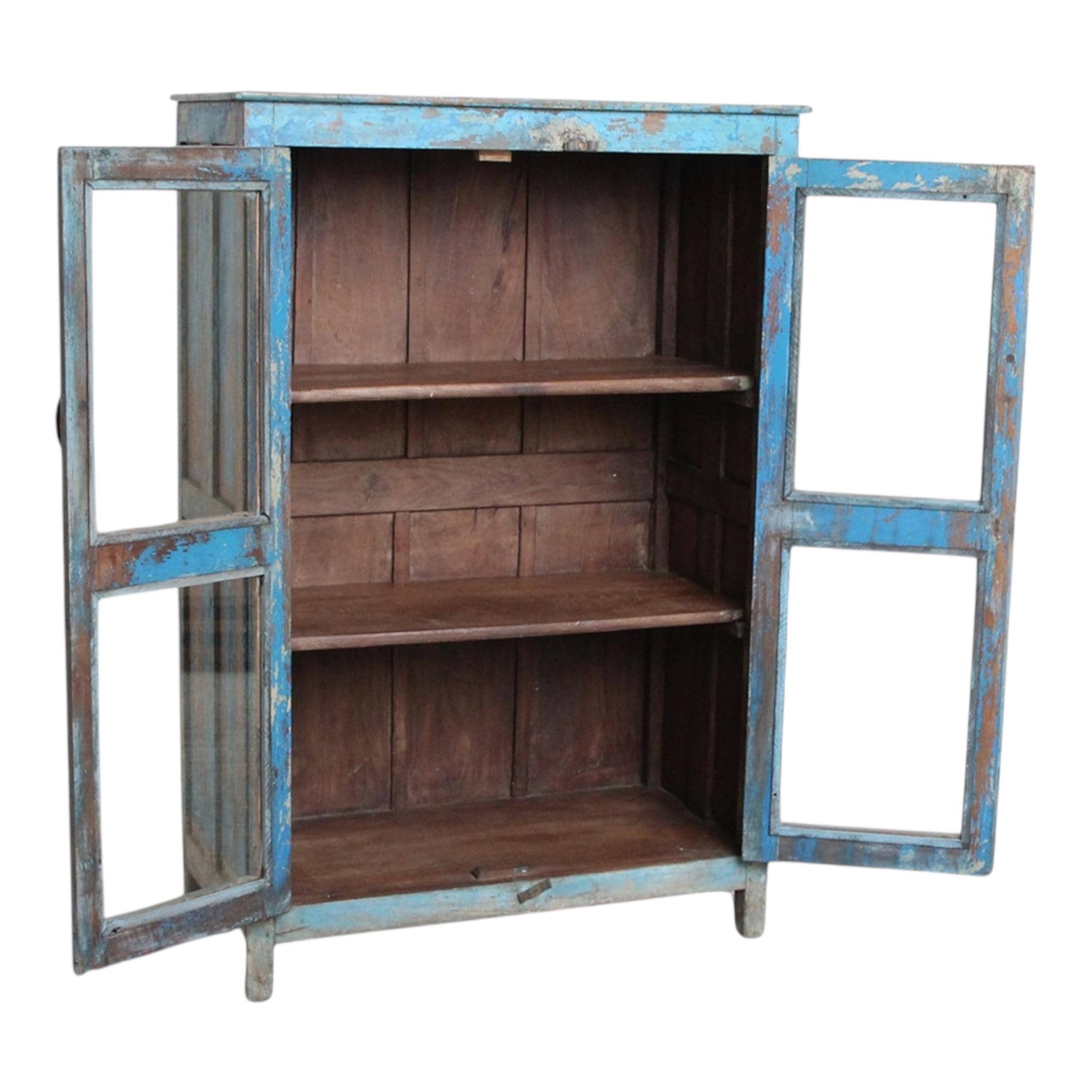 This display cabinet presents the old, rustic feeling of living, not perfect but unique and dreamy in its charisma with its vintage azure blue, the old fittings and the funny closure - small details with a big effect, if you are looking for something special this is exactly the right thing.