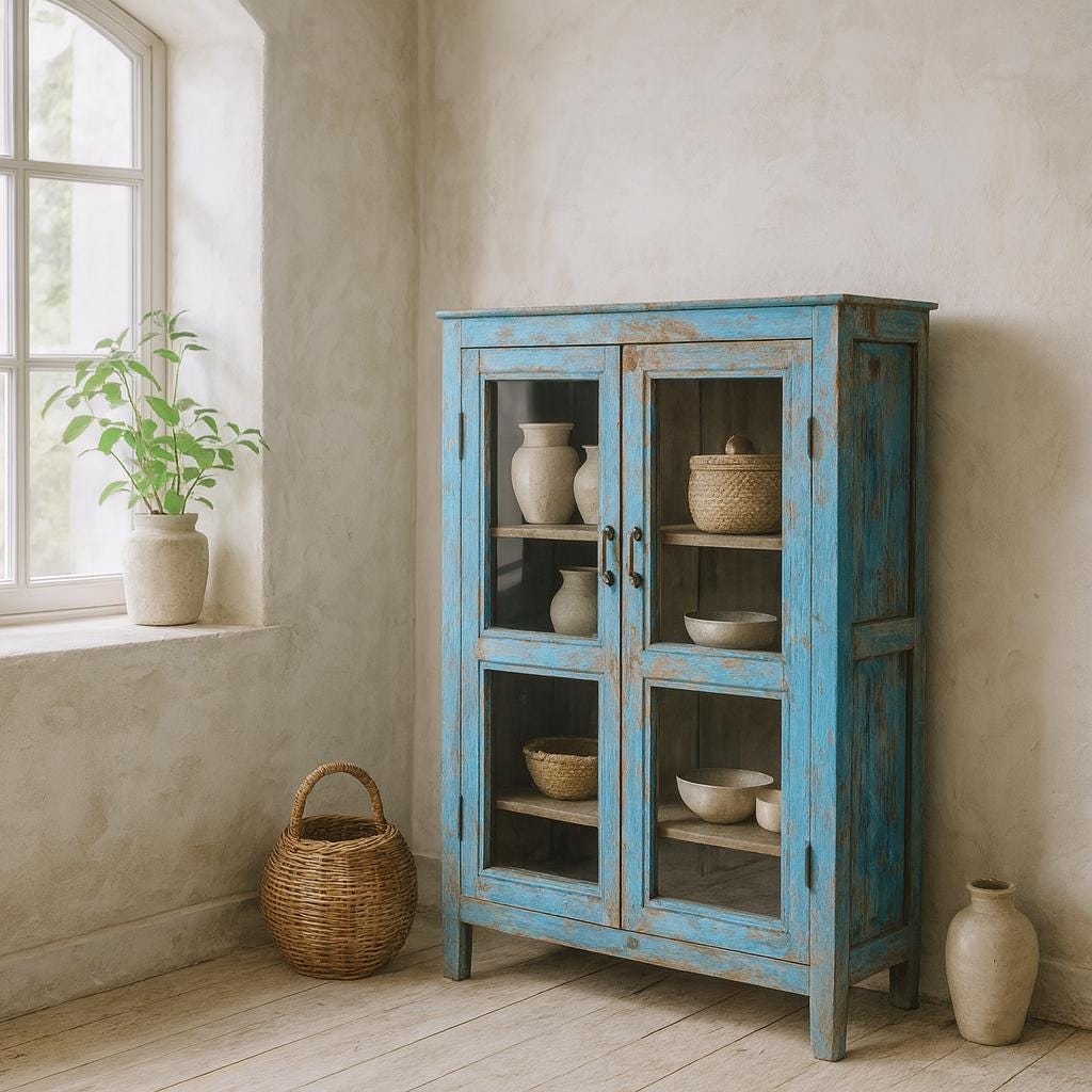 Greta's unique display cabinet - an incredibly beautiful blue display cabinet with glass doors, for storing your favorite pieces.