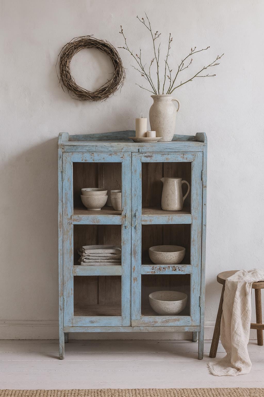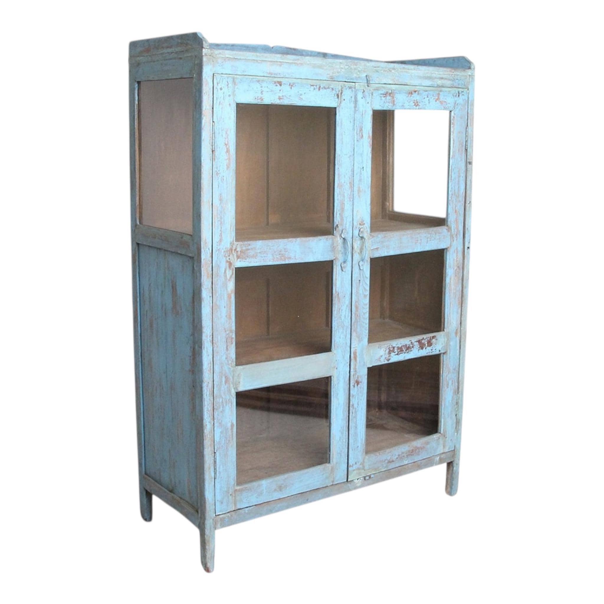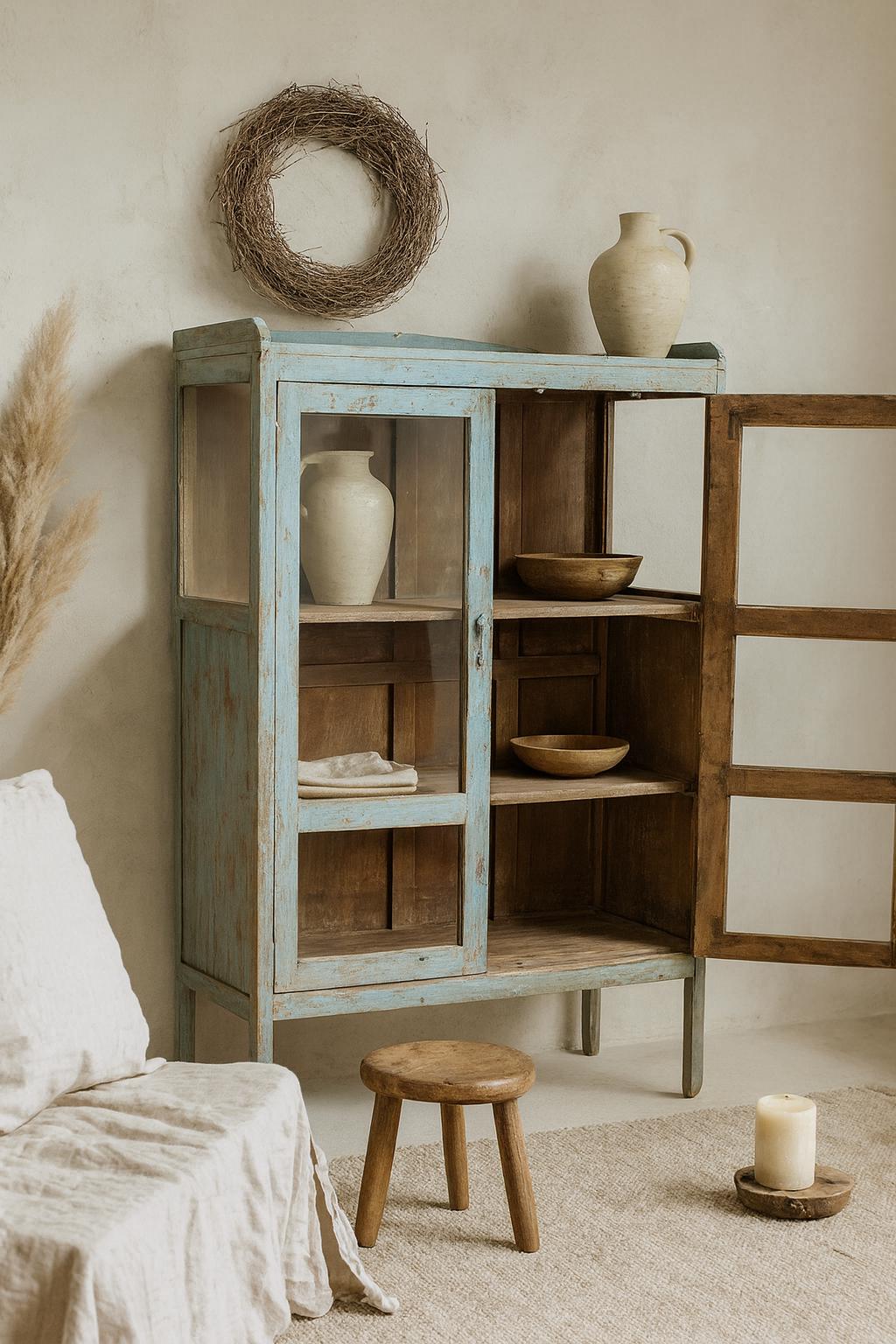 This display cabinet presents the old, rustic feeling of living, not perfect but unique and dreamy in its charisma with its vintage azure blue, the old fittings and the funny closure - small details with a big effect, if you are looking for something special this is exactly the right thing.