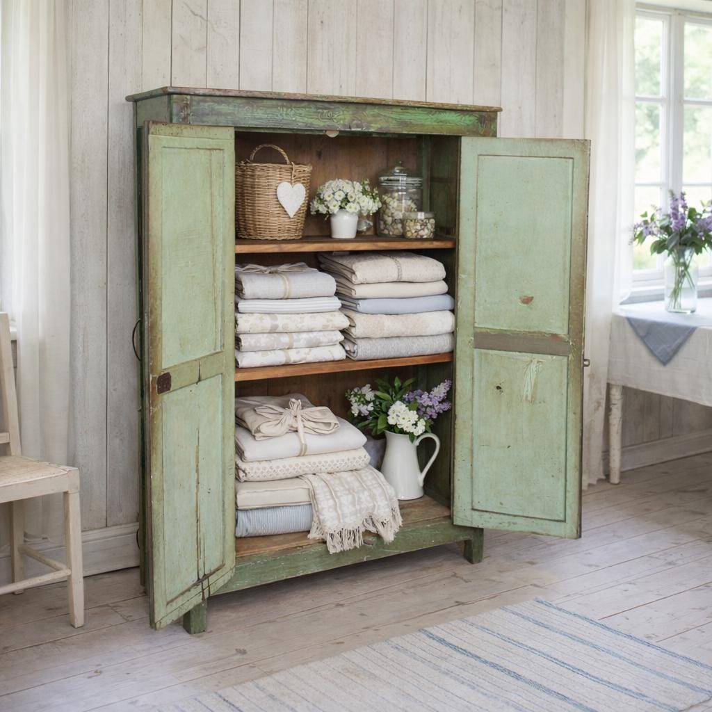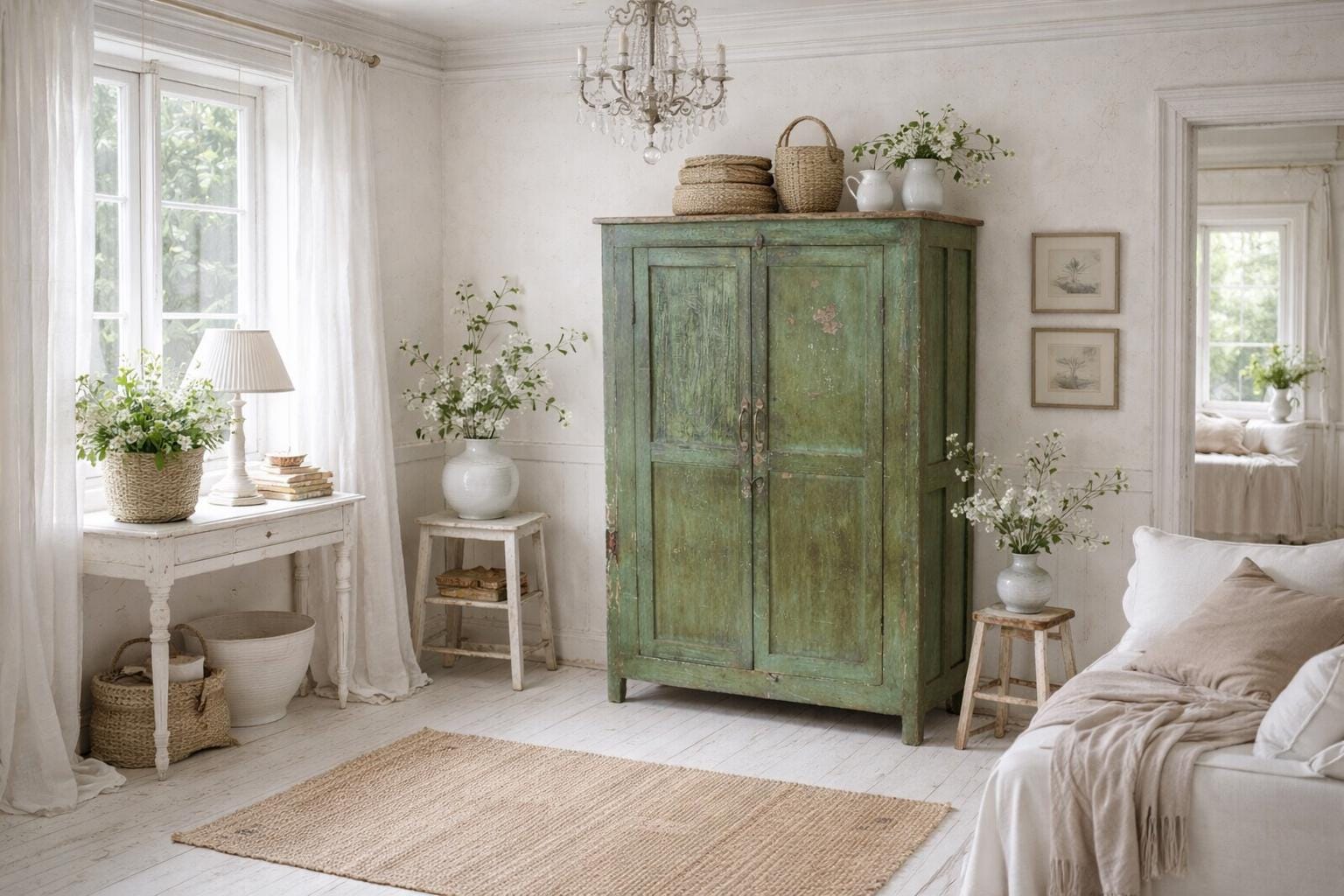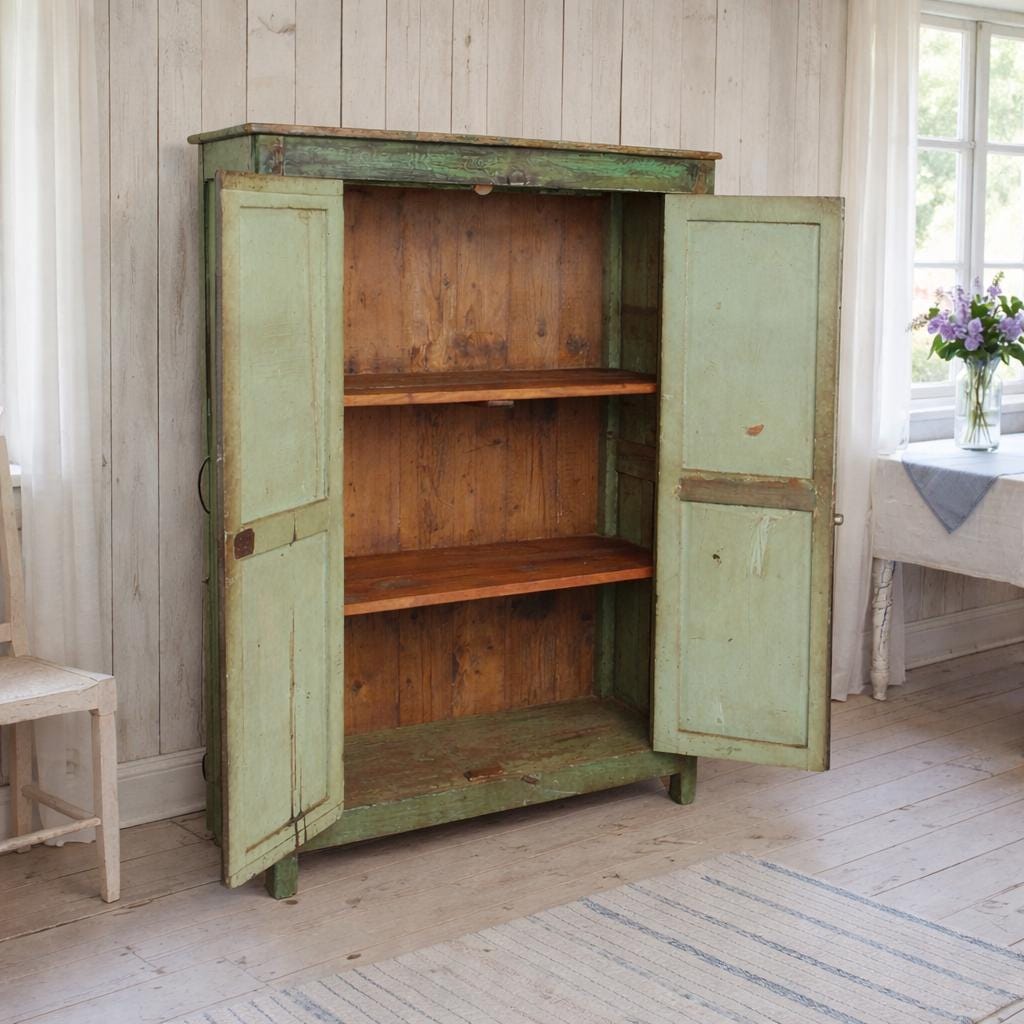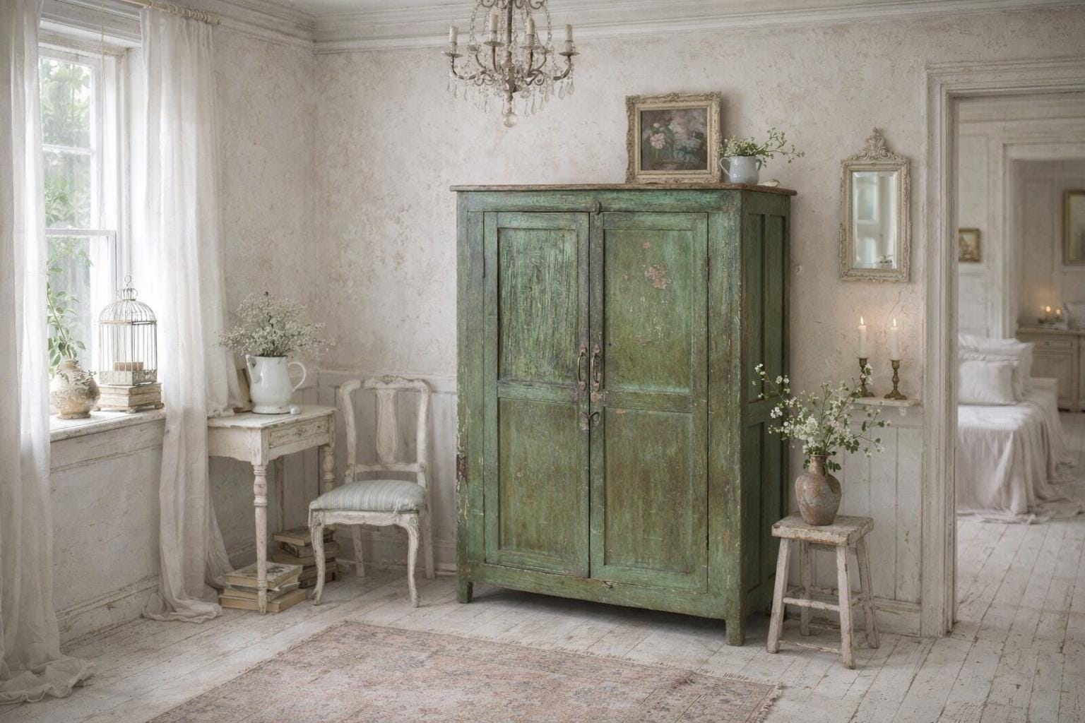 Greta's dreamy chest of drawers - an incredibly beautiful green patina with this floral painting, for storing your favorite pieces.