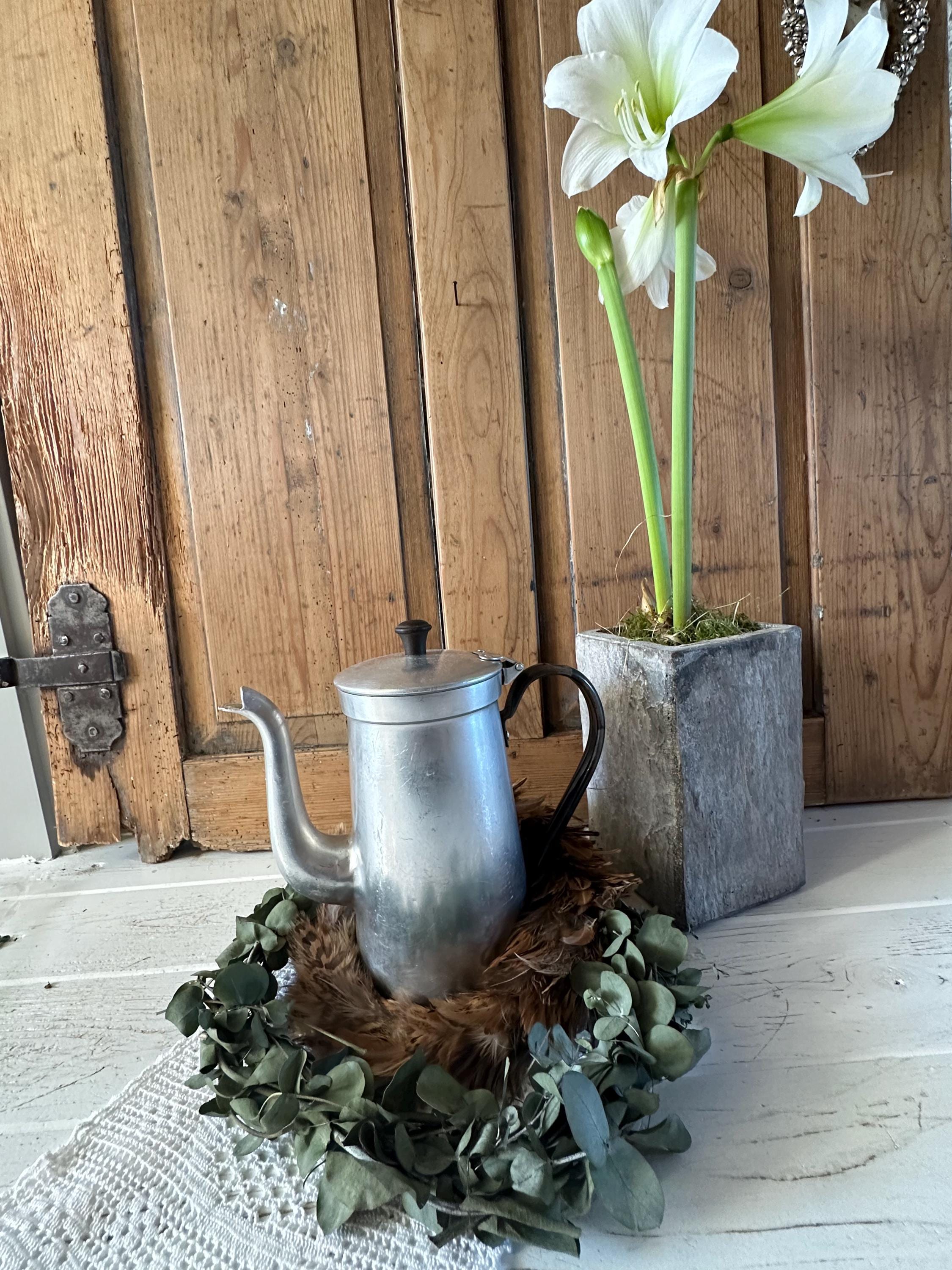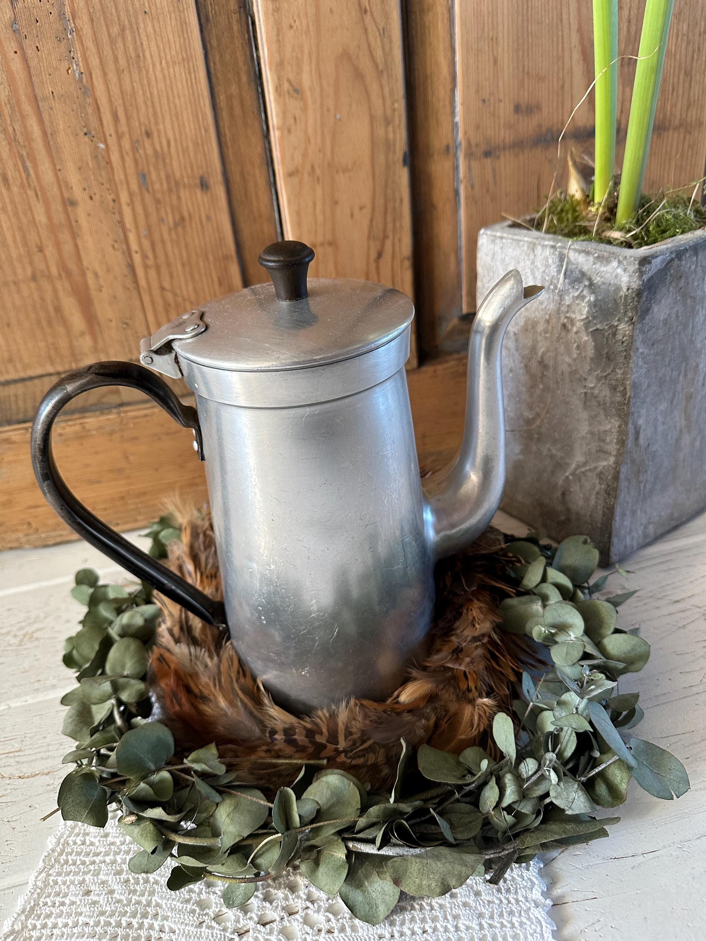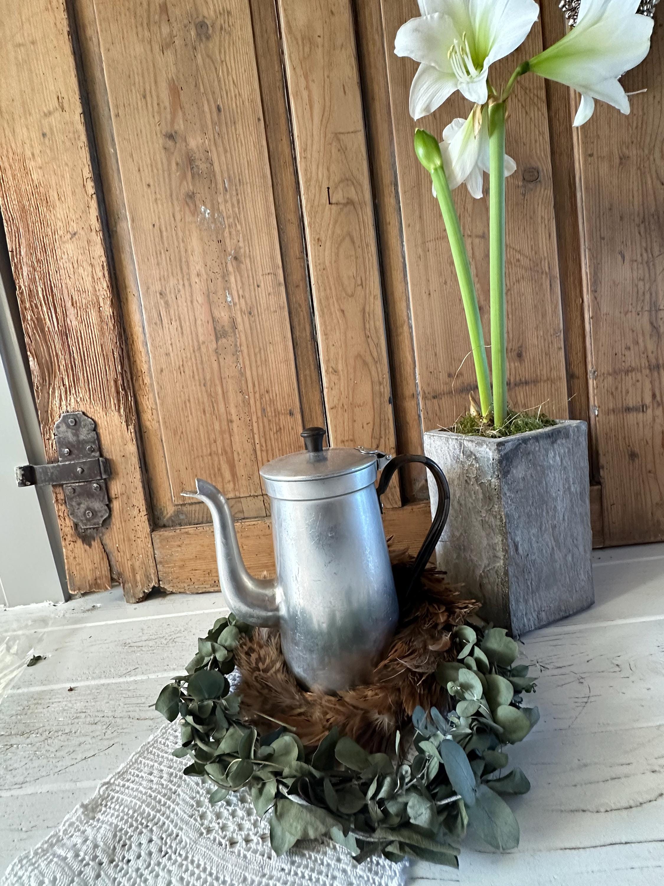Old aluminum cookware found in Grandma's kitchen - in aluminum gray - an old teapot with lots of vintage charm - decorative containers for indoors or outdoors - each one adds a touch and is also an alternative storage solution - used and old with all its quirks ❤️