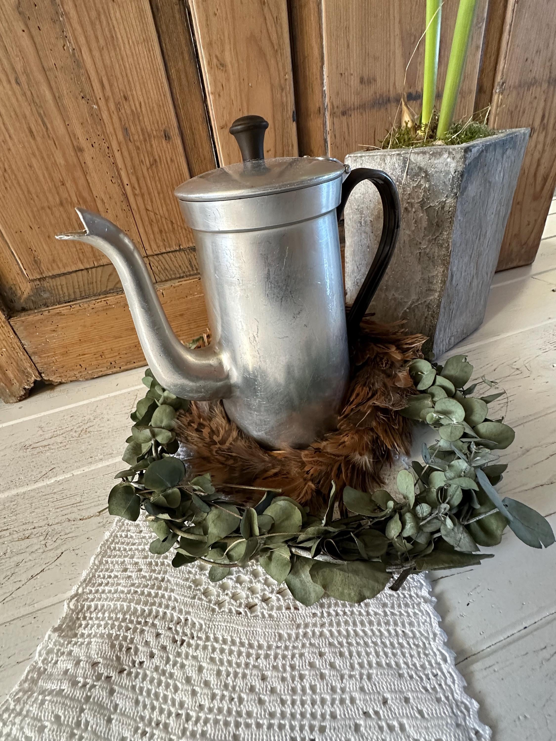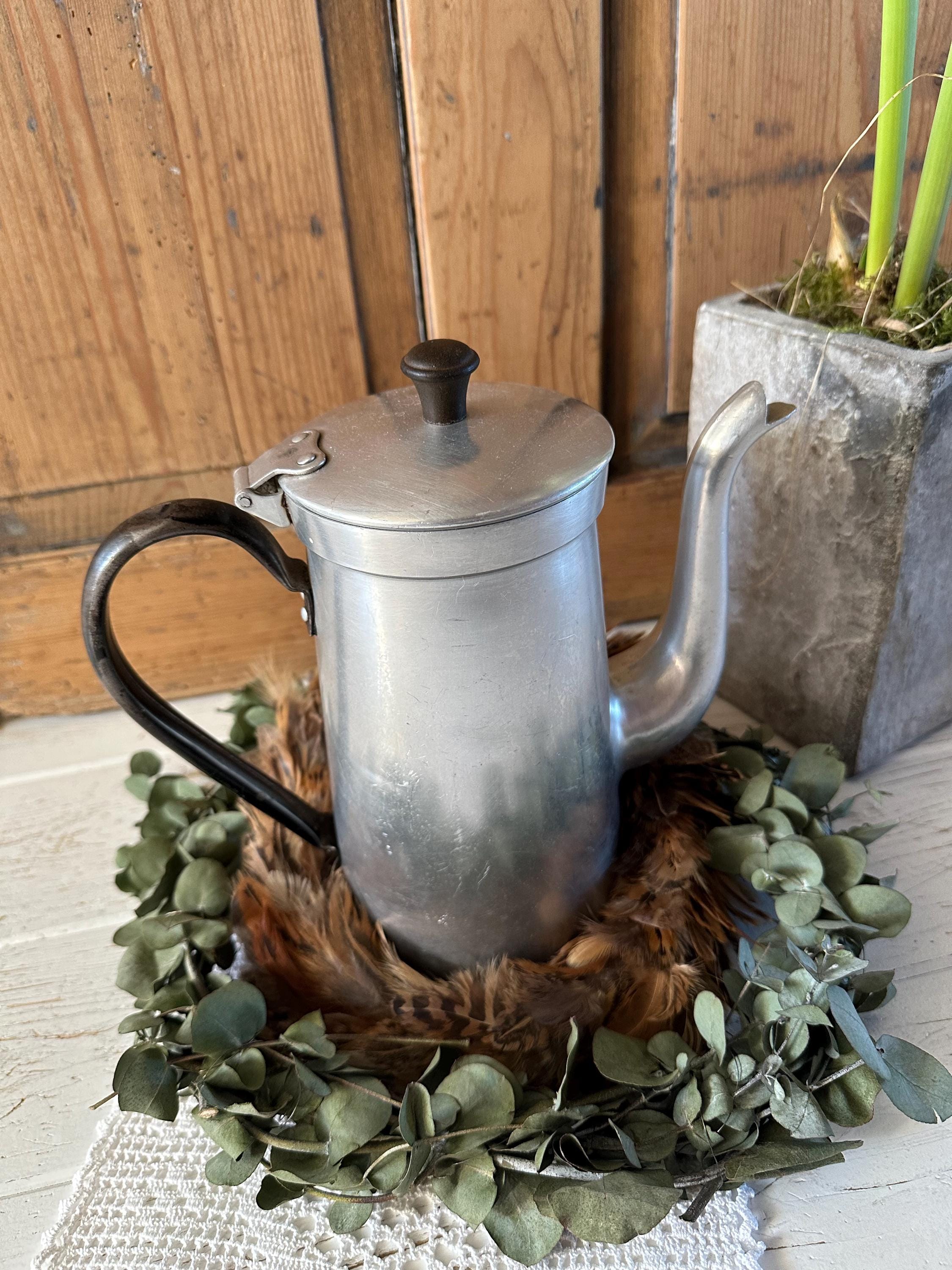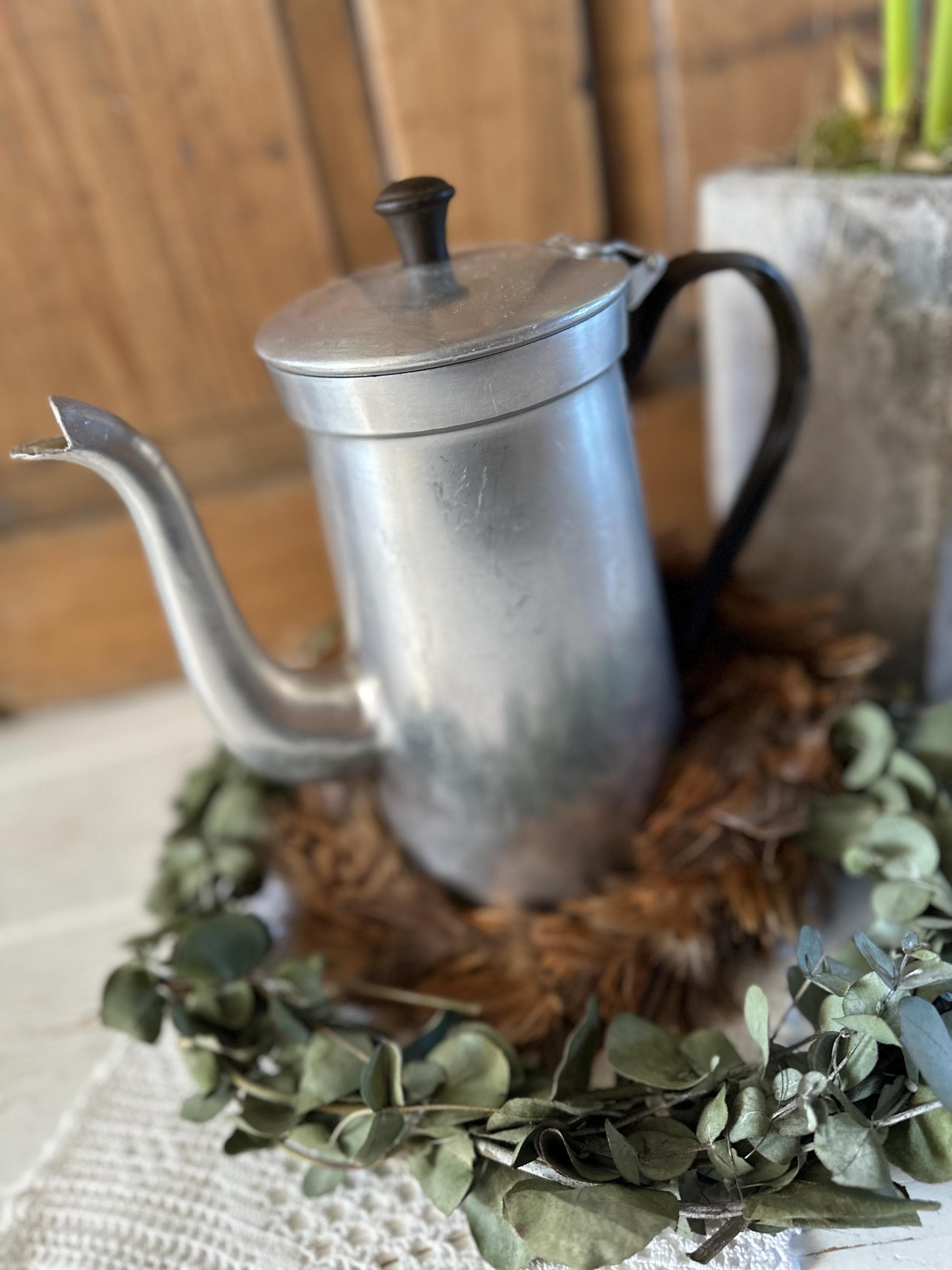 Old aluminum cookware found in Grandma's kitchen - in aluminum gray - an old teapot with lots of vintage charm - decorative containers for indoors or outdoors - each one adds a touch and is also an alternative storage solution - used and old with all its quirks ❤️