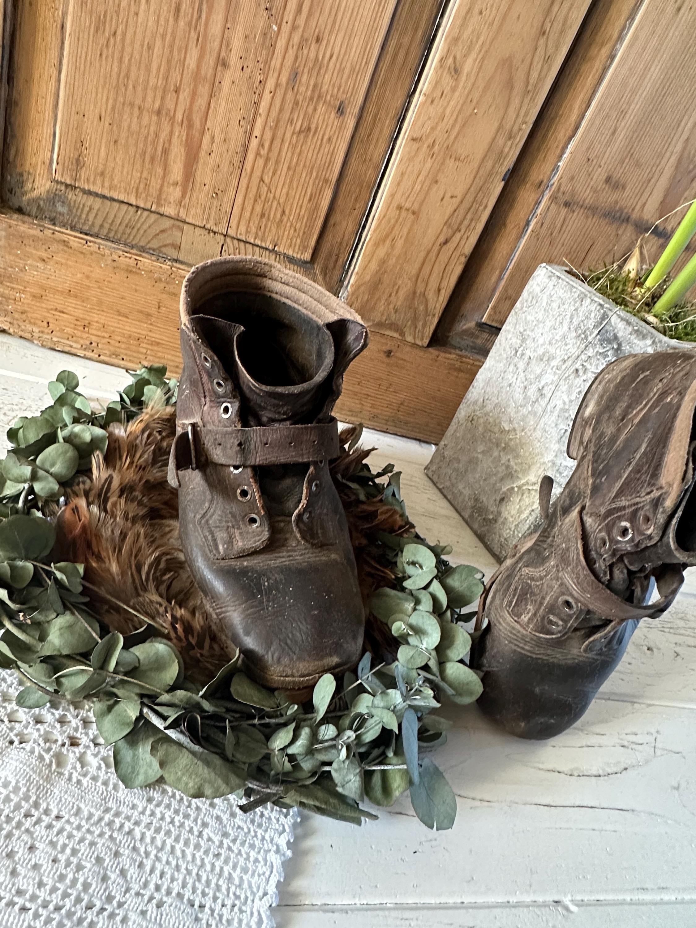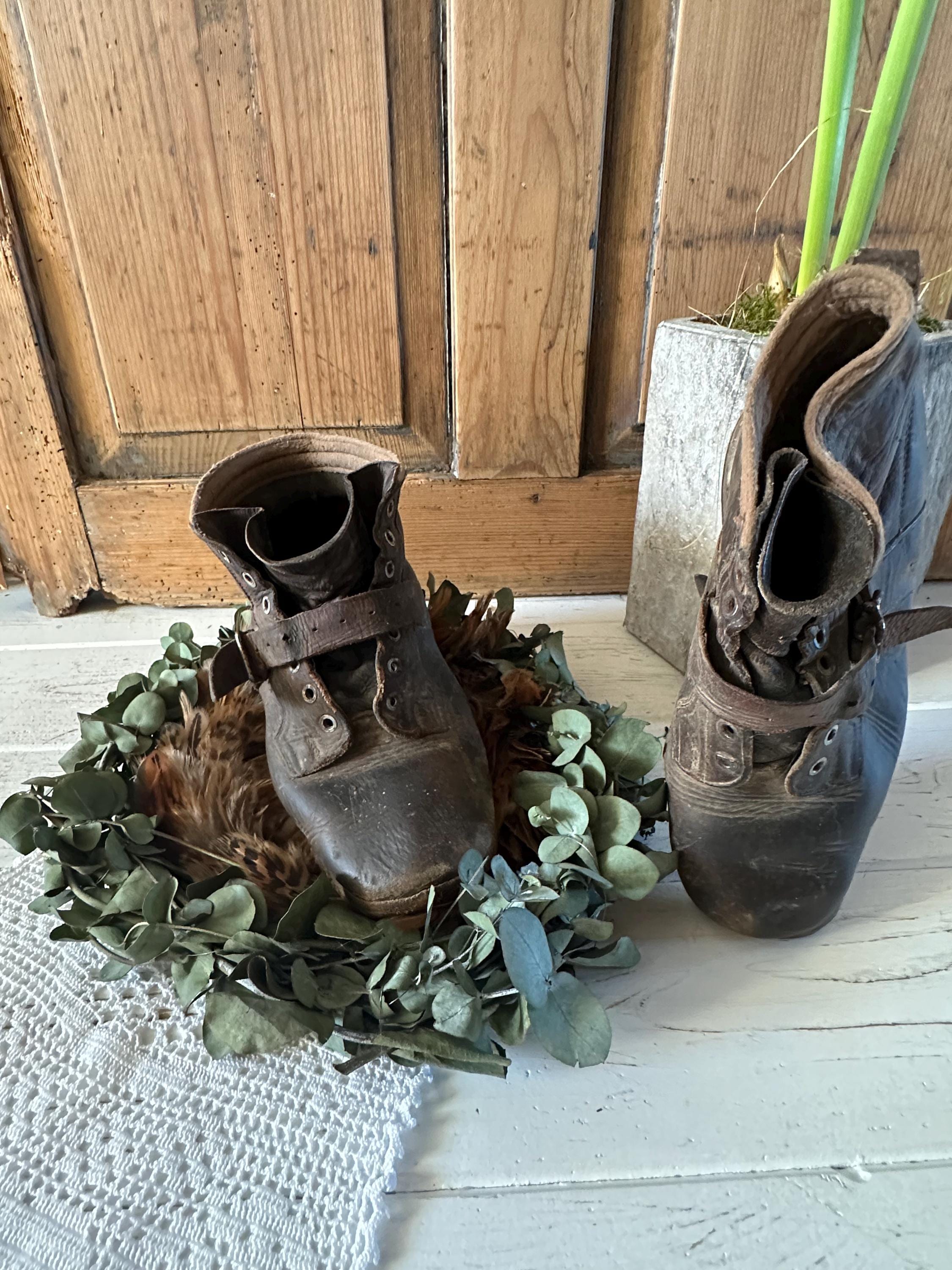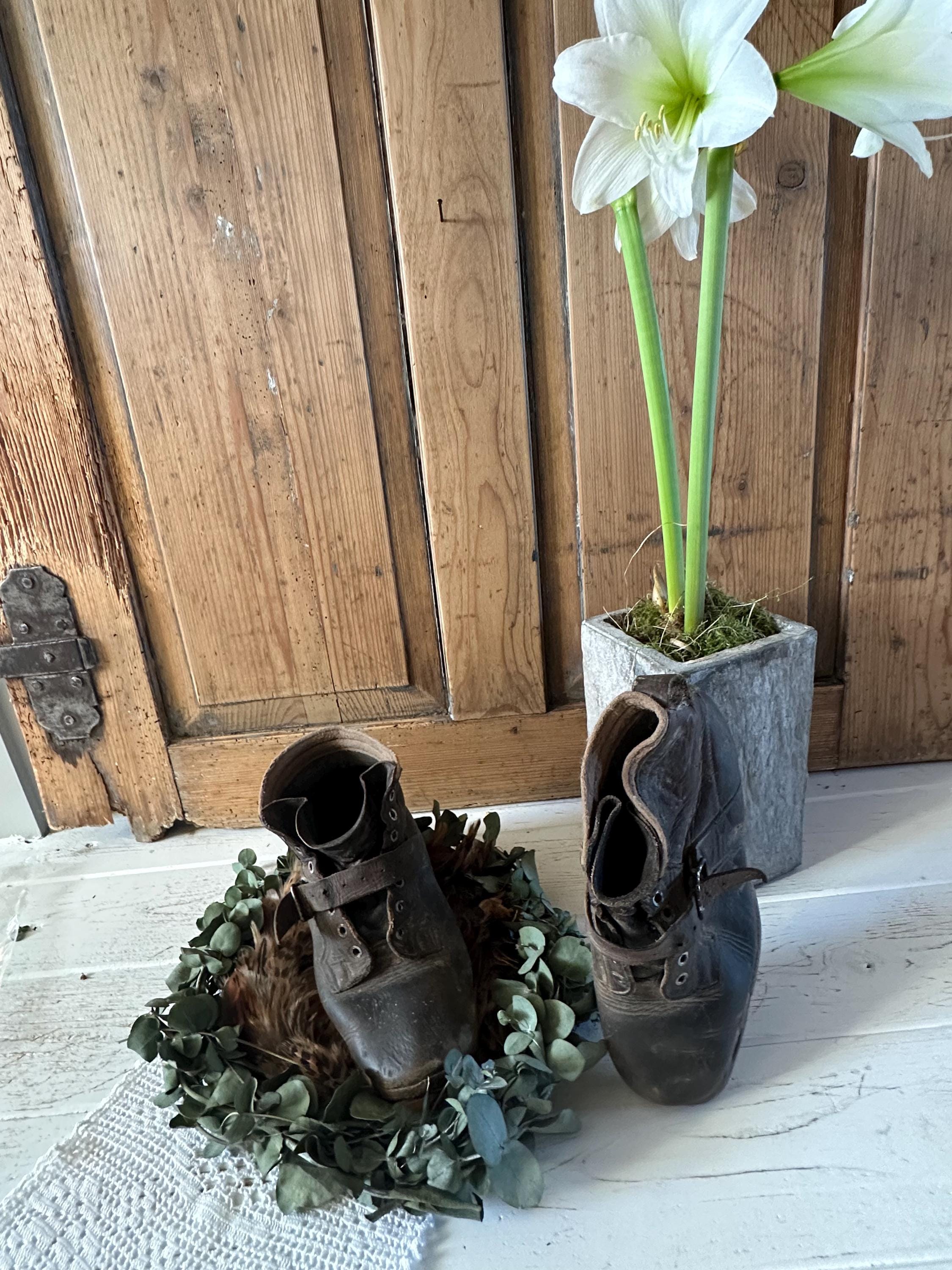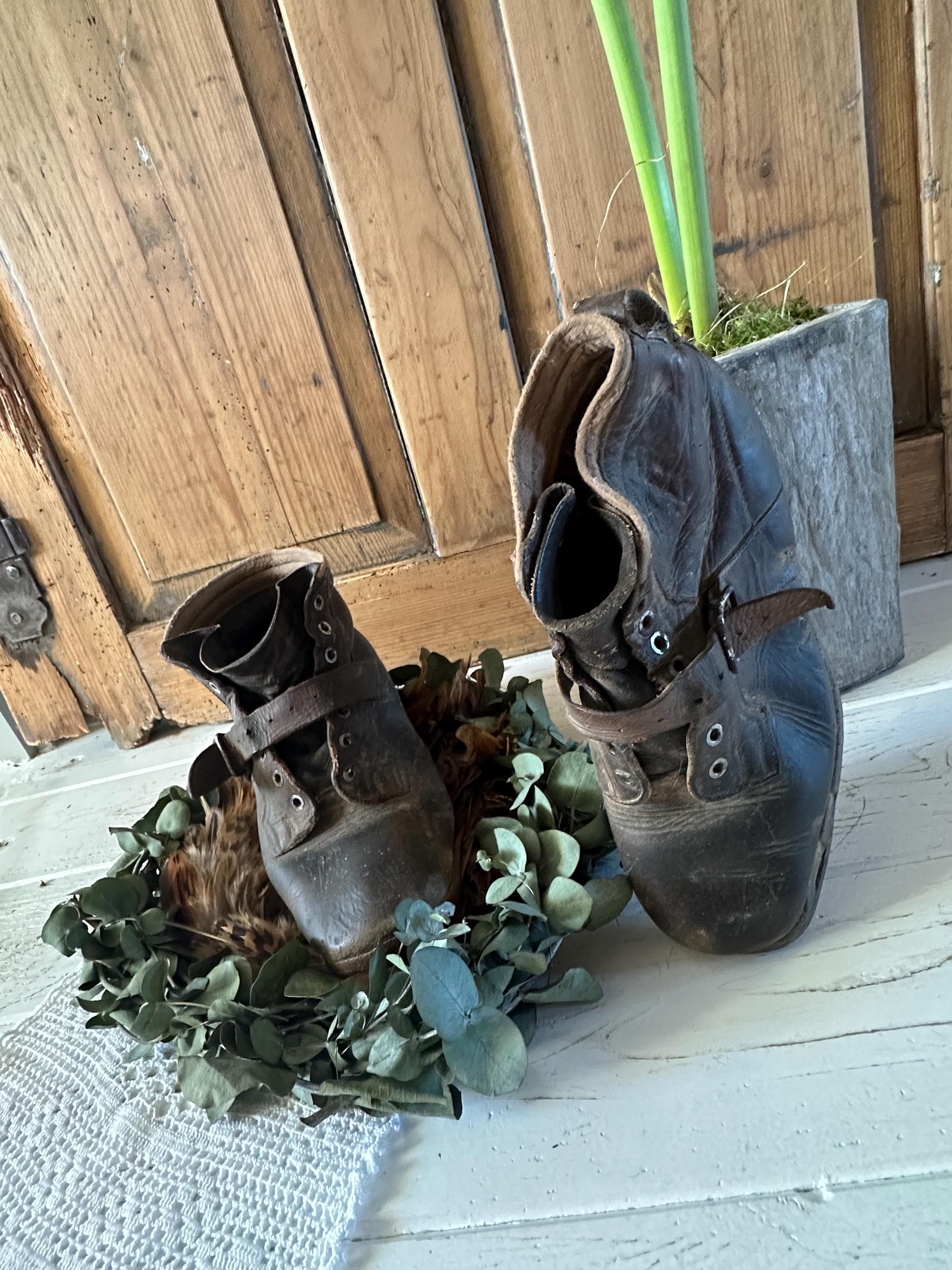 Old antique Swedish leather shoes – from Michel's time – were worn for fieldwork in bygone days – today a beautiful reminder of that era and a wonderful decorative element, perfect for small arrangements with flowers and grasses, or as a welcoming touch in the entryway ❤️ a unique piece with a beautiful old patina ❤️