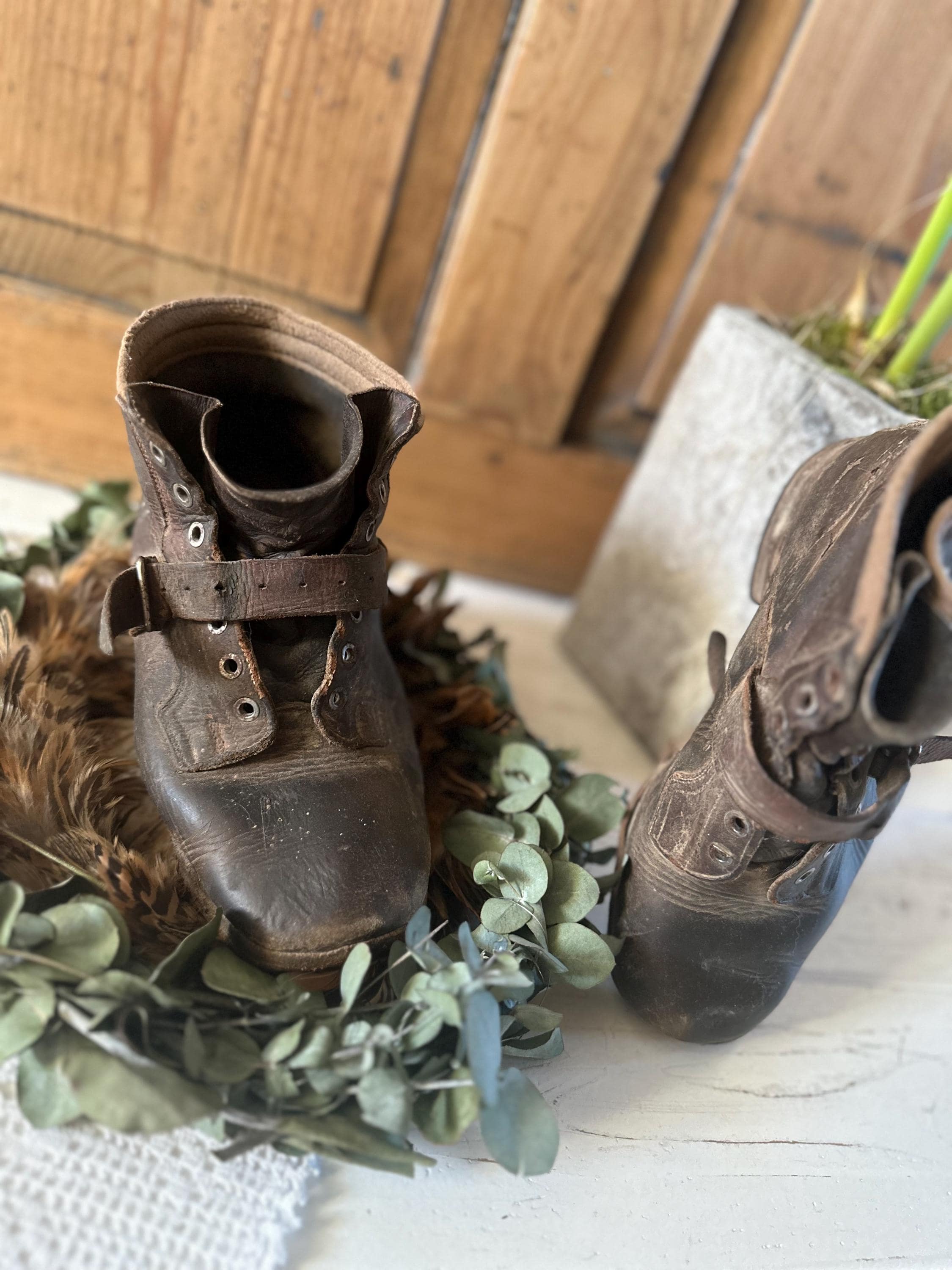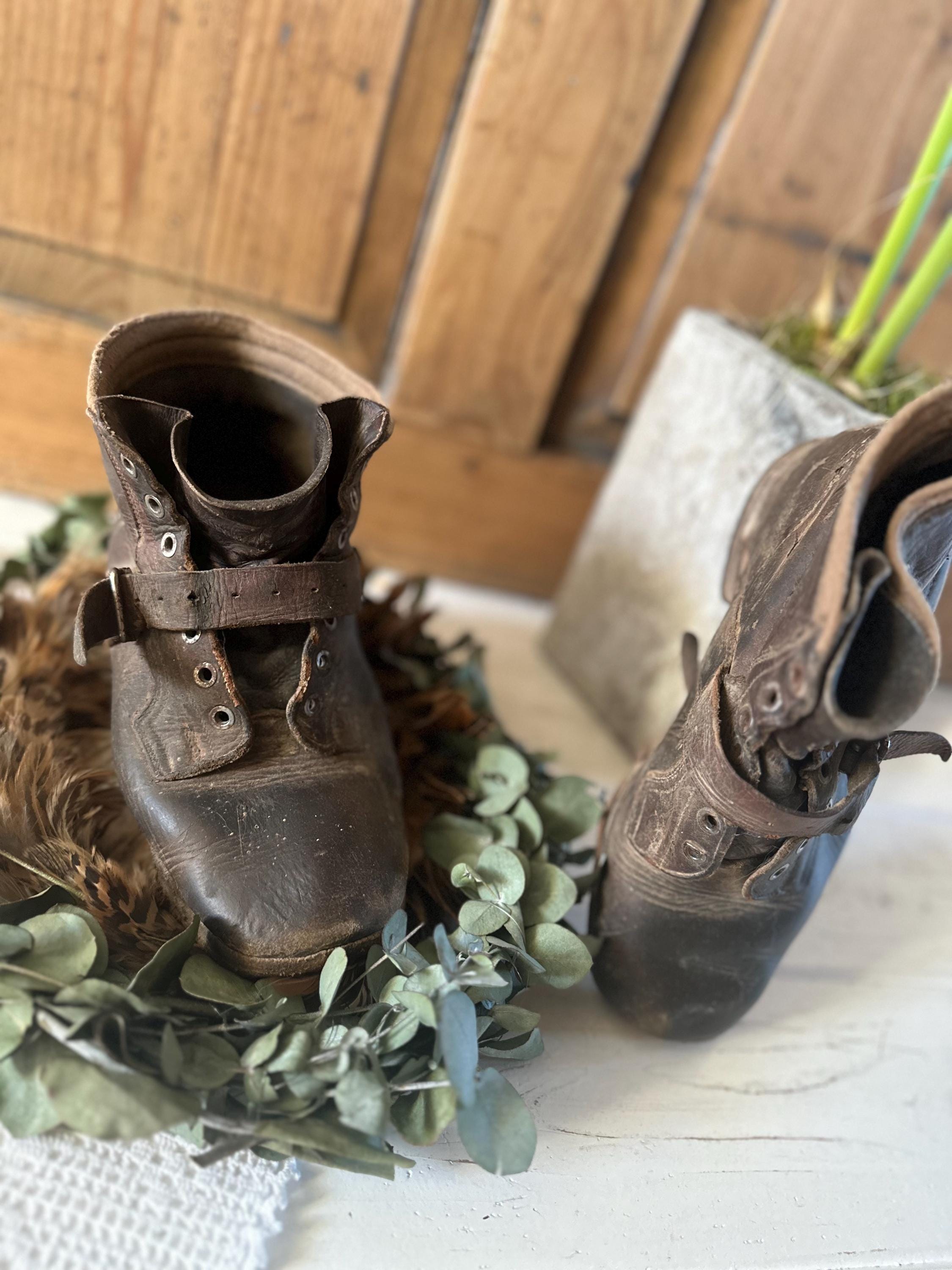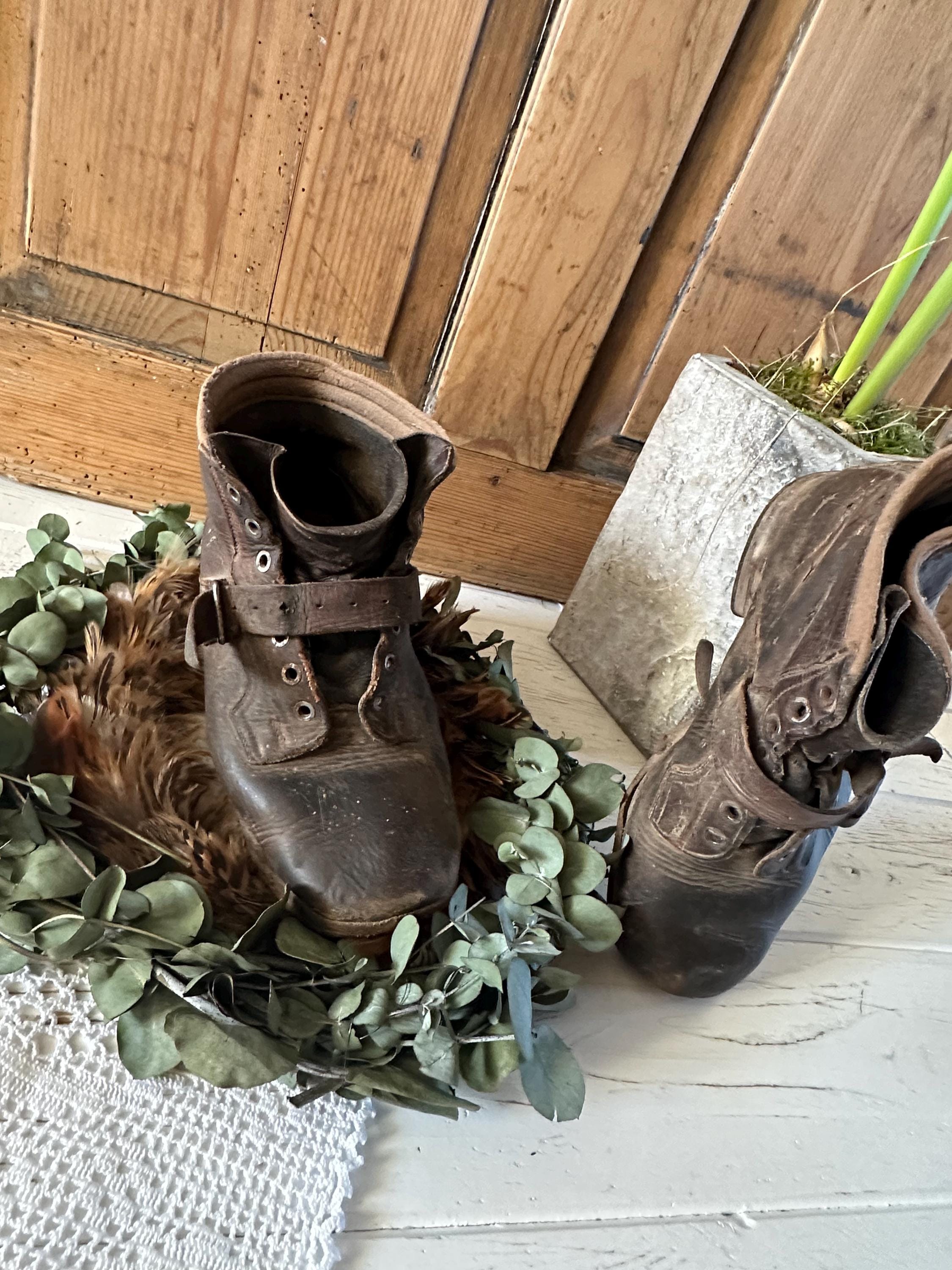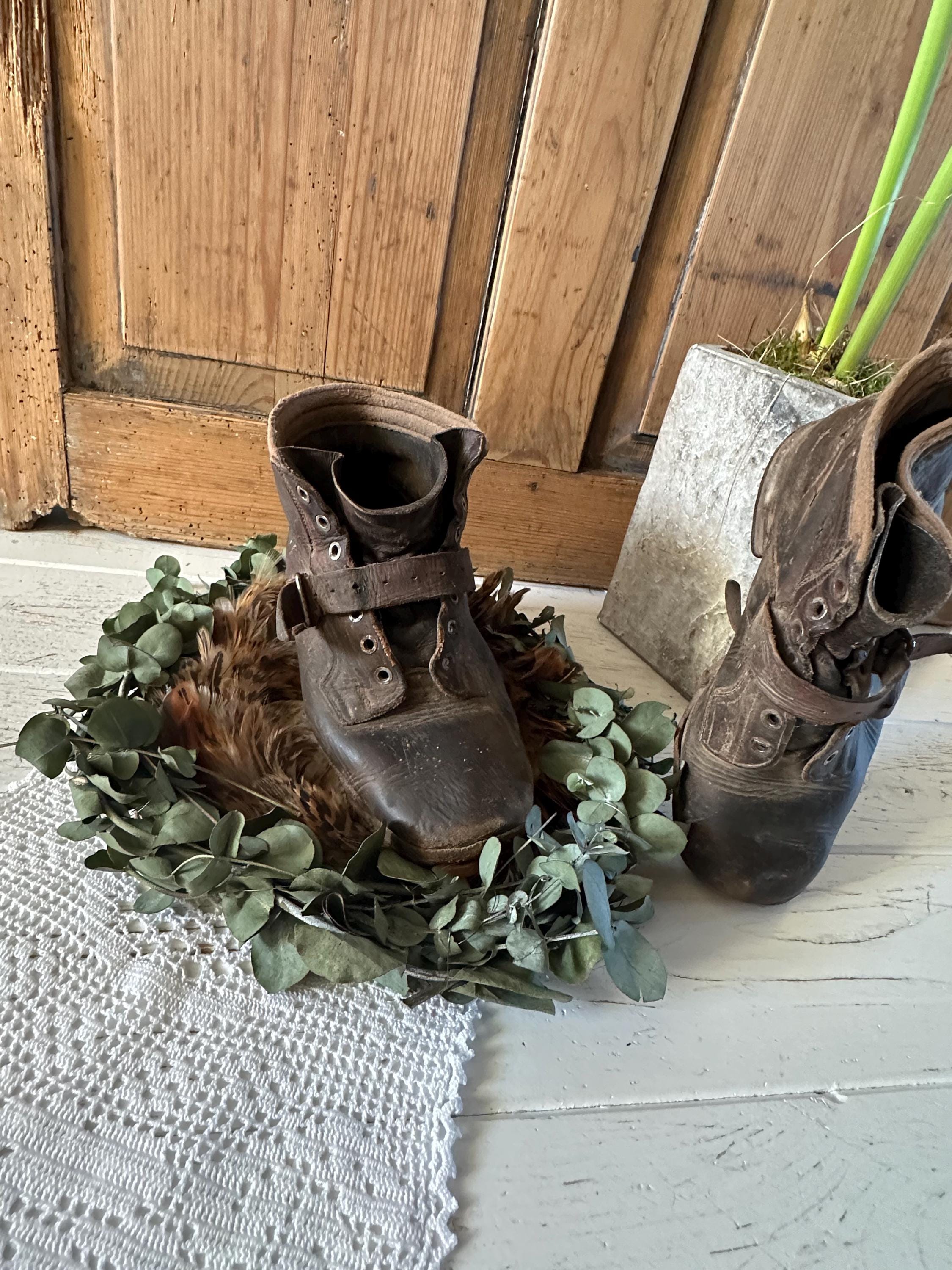 Old antique Swedish leather shoes – from Michel's time – were worn for fieldwork in bygone days – today a beautiful reminder of that era and a wonderful decorative element, perfect for small arrangements with flowers and grasses, or as a welcoming touch in the entryway ❤️ a unique piece with a beautiful old patina ❤️