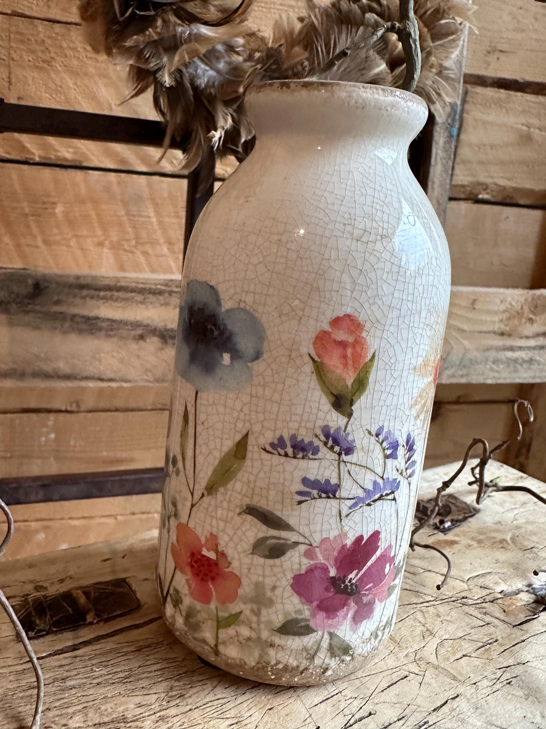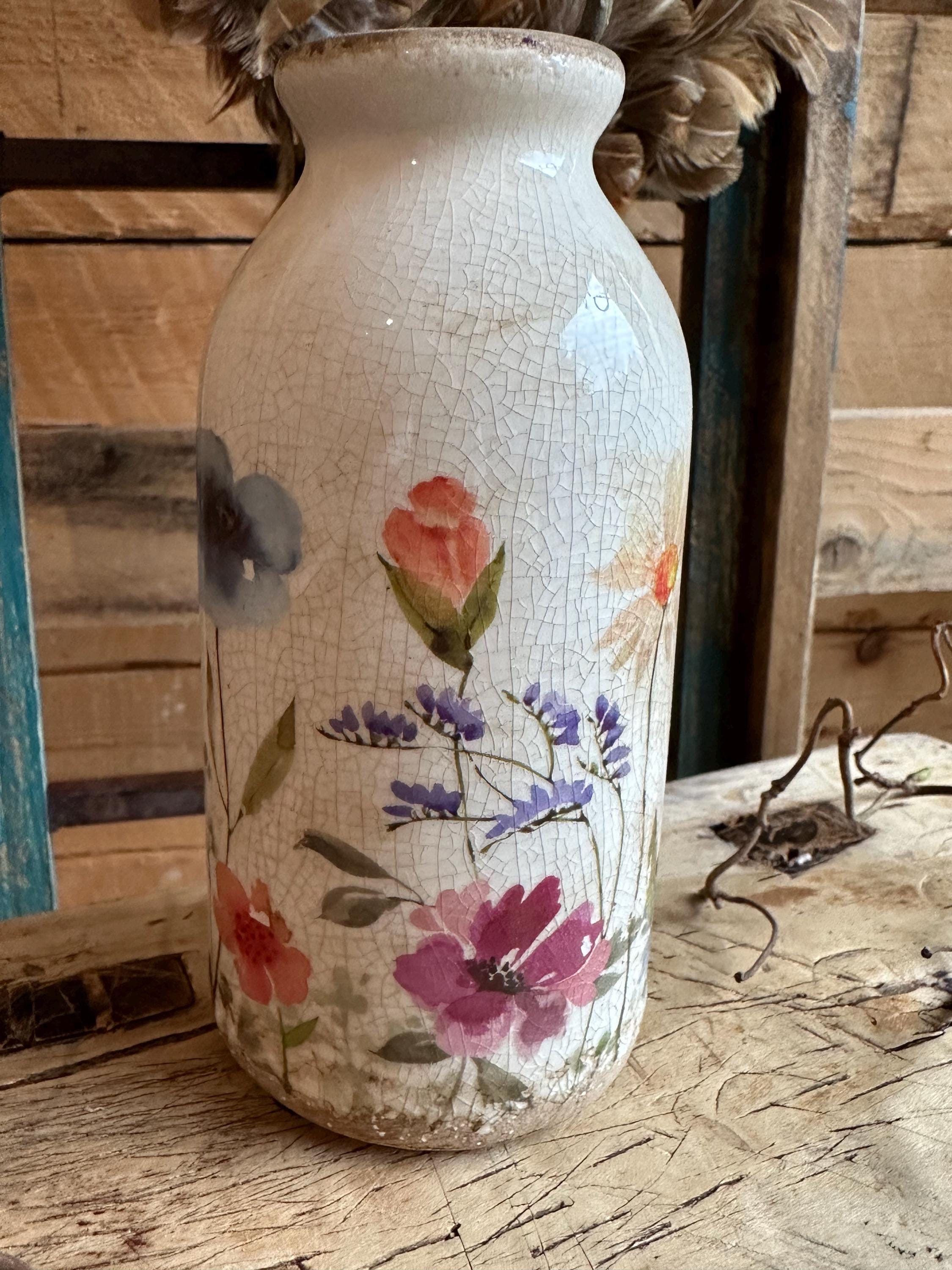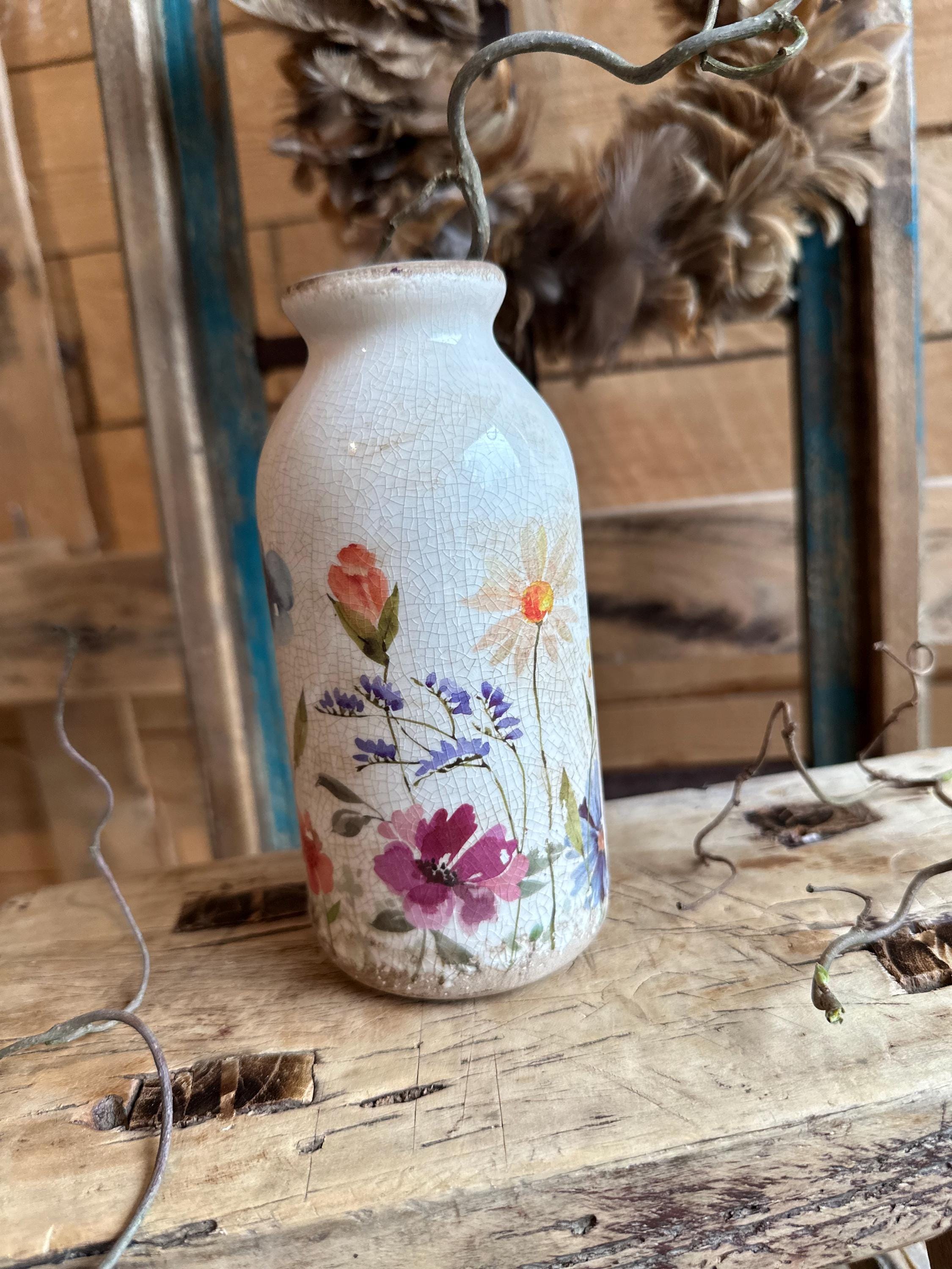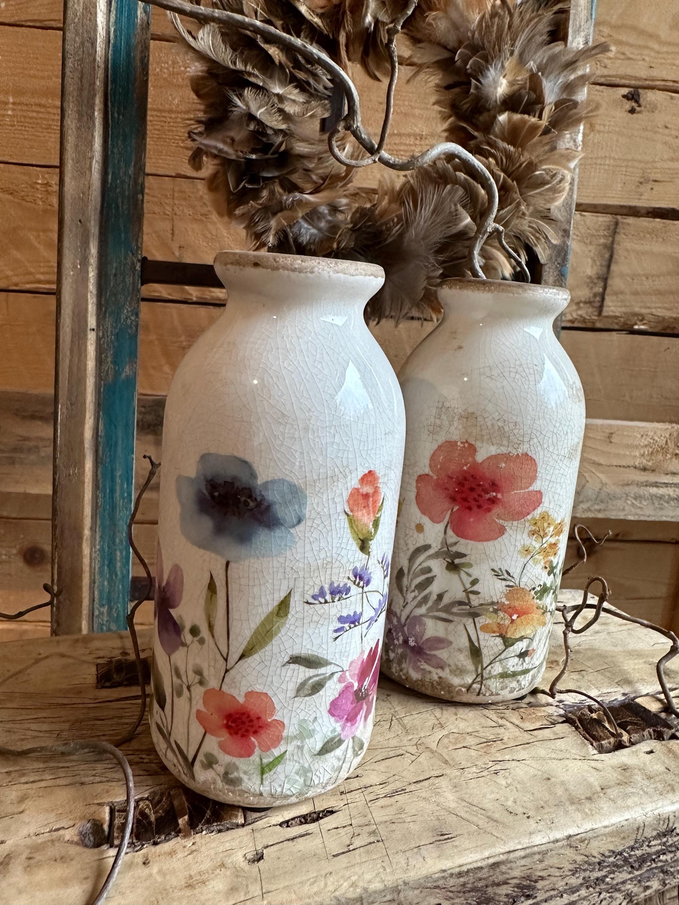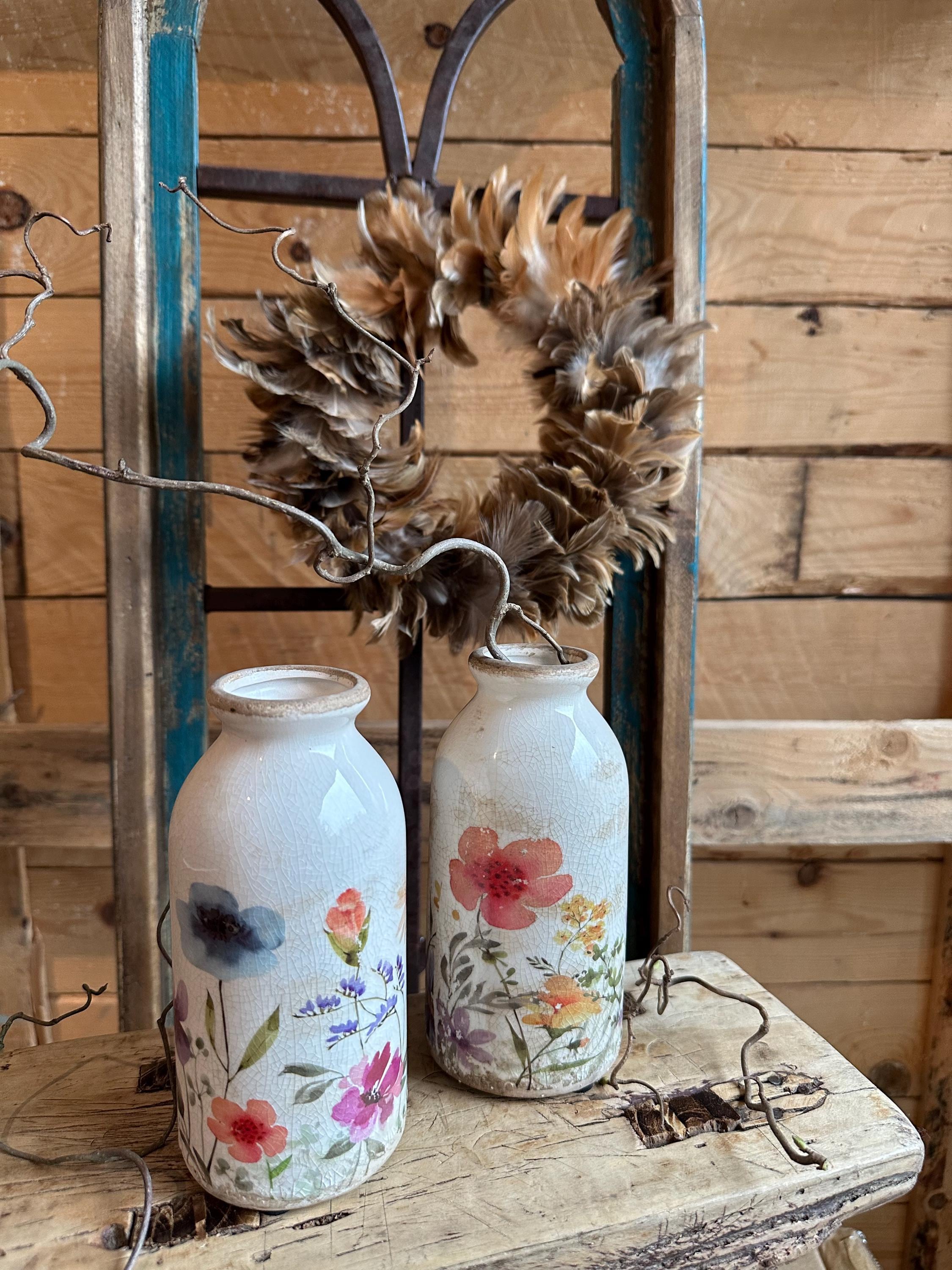 Greta's decor for your favorite places - a heart amidst happiness and clutter - in love with beautiful home accessories - here are beautiful bottle vases with a summery meadow pattern, modeled after old French originals - with the graceful pattern and the old cracked patina - enjoy the arranged view.