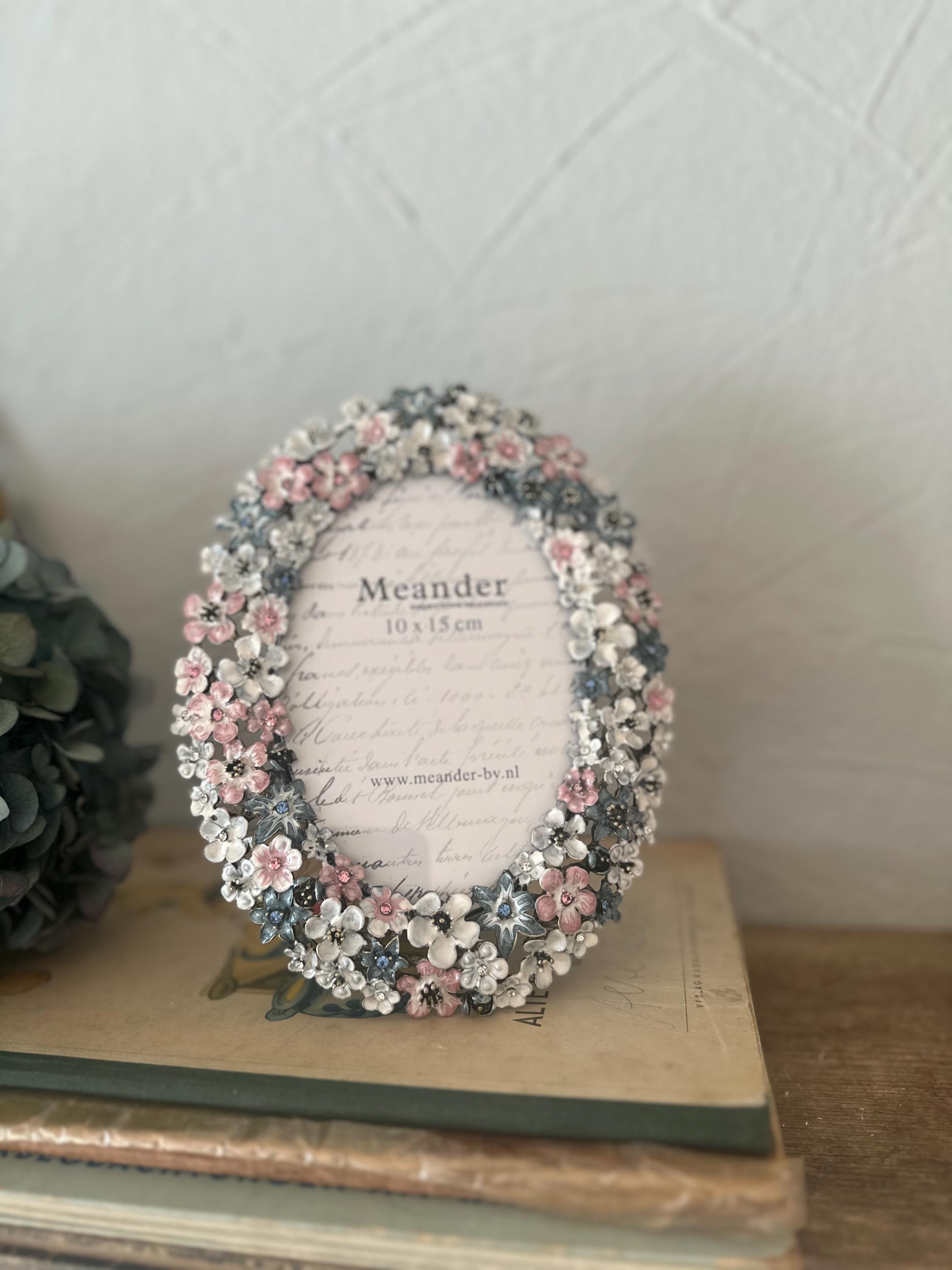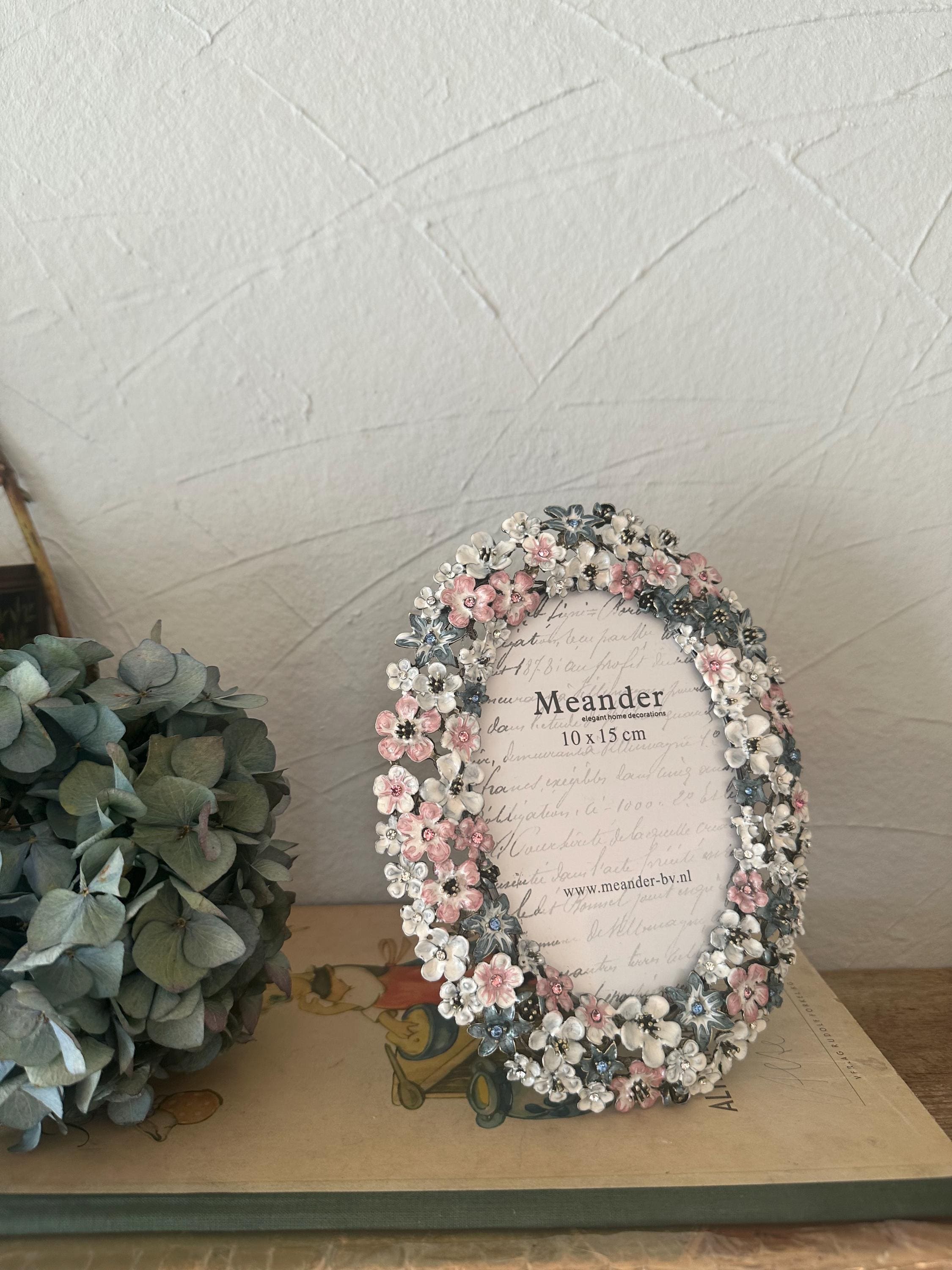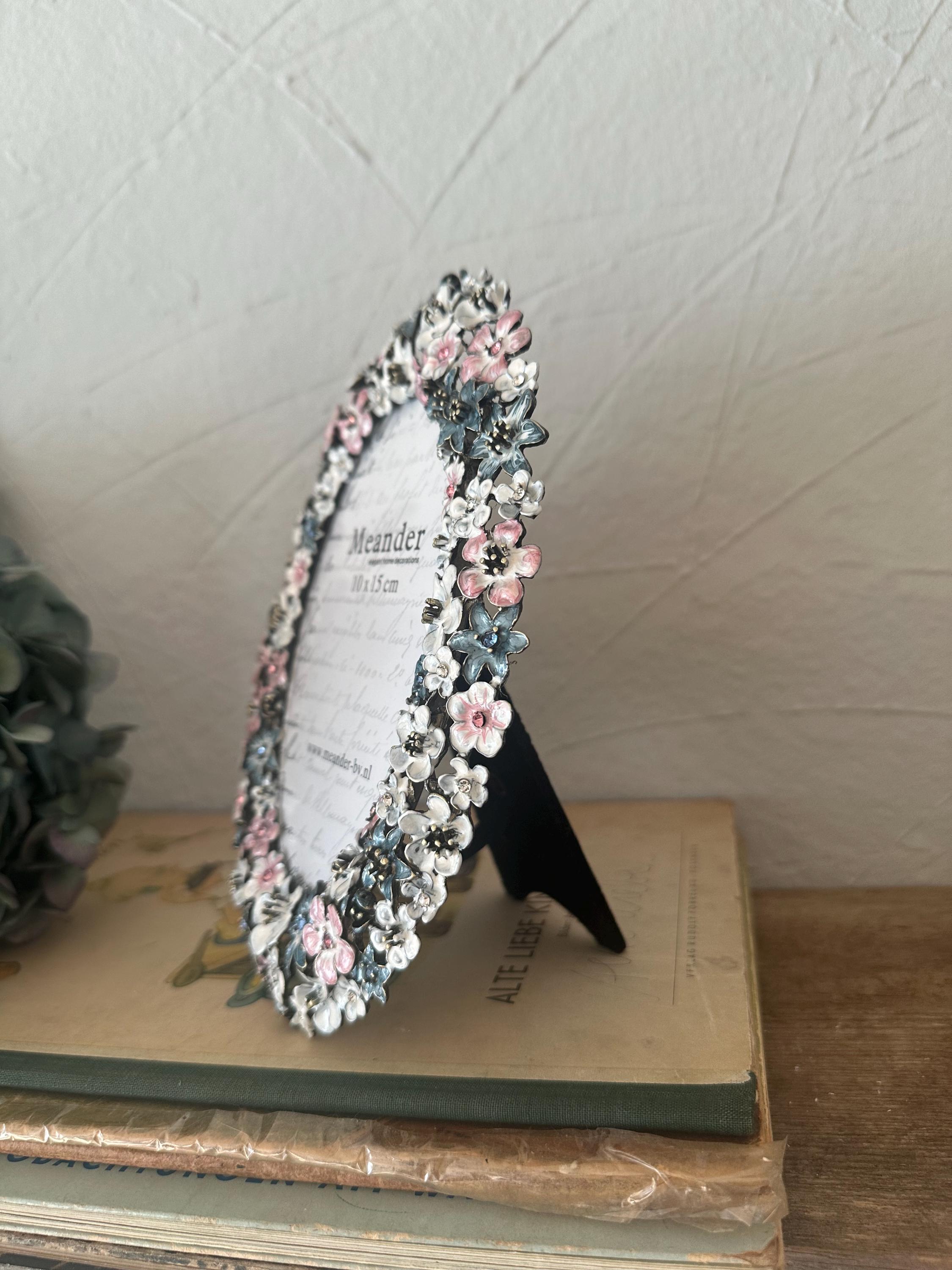 Dreamy picture frames with a striking design. The frame is adorned with sparkling rhinestones in a floral shape, creating a chic and decorative look. The floral motif in soft yellow and beige tones gives it a warm and inviting feel. This photo frame is a wonderful way to beautifully display and enhance your favorite photos or artwork. Patinated, ornate picture frames for beautiful arrangements of cherished photos – perfect for displaying favorite pieces – anything but boring! That's the effect of these dreamily decorated picture frames ❤️