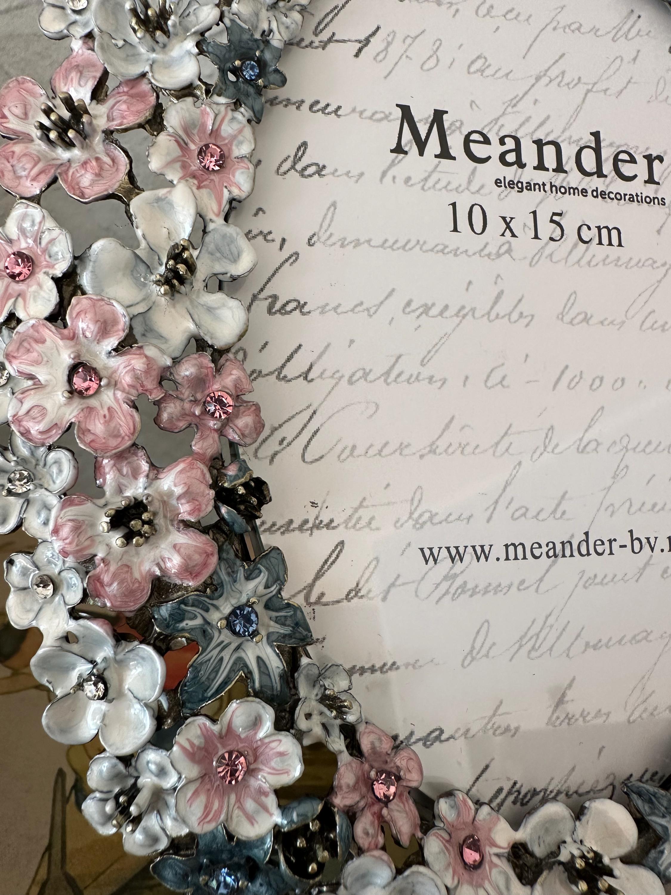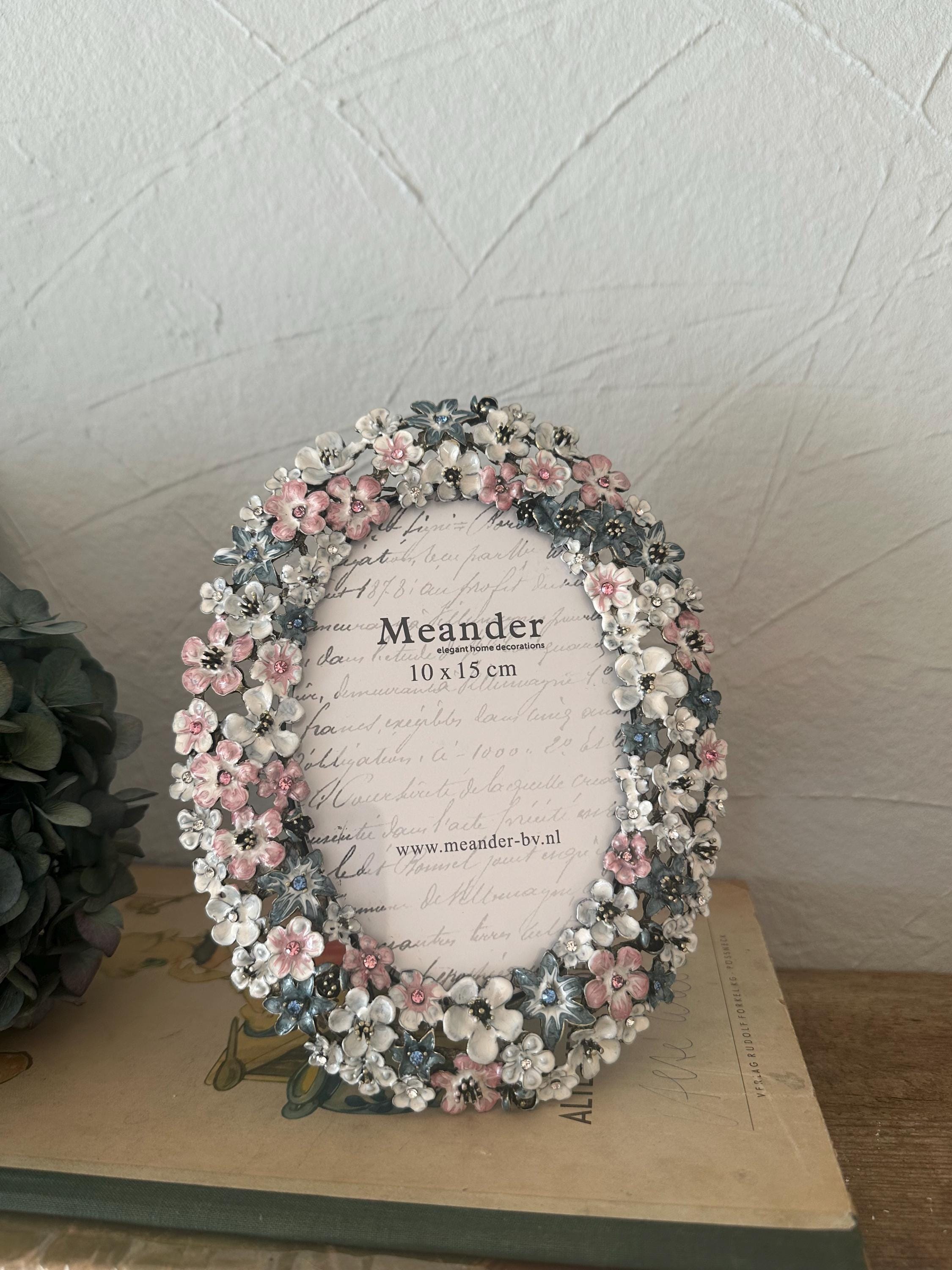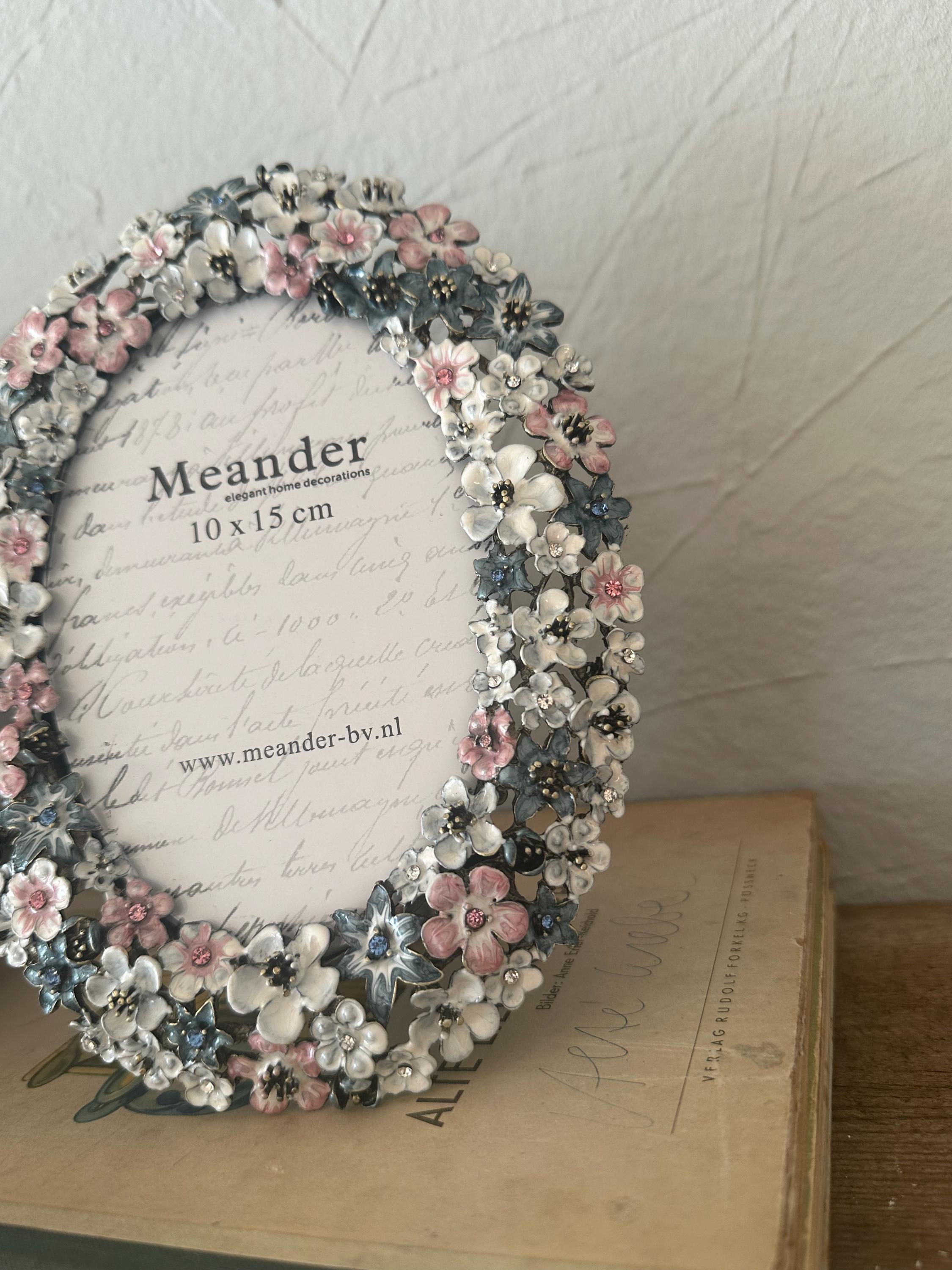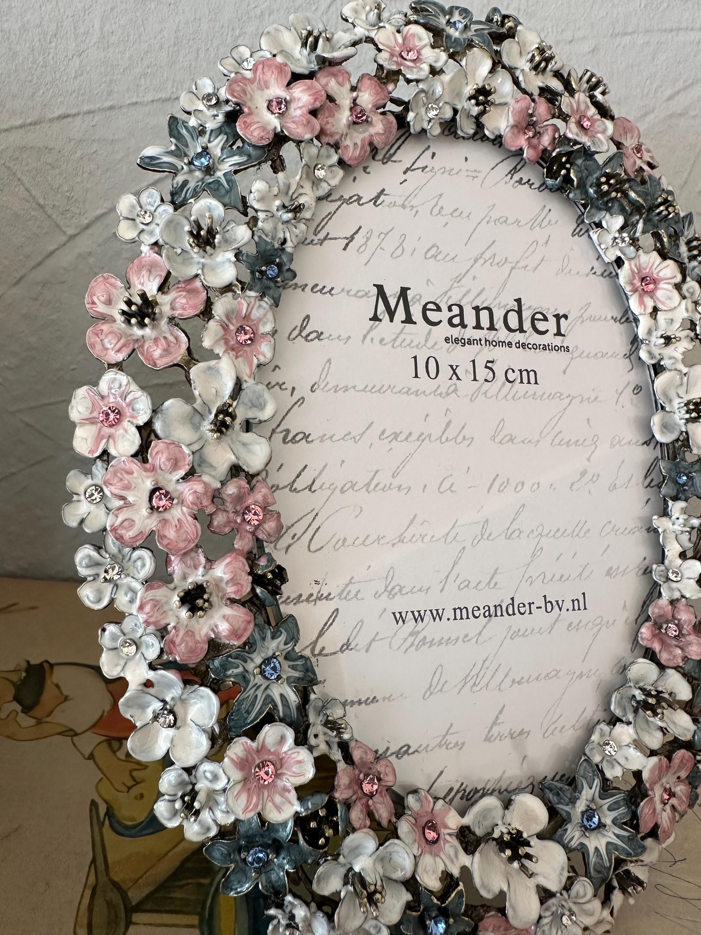 Dreamy picture frames with a striking design. The frame is adorned with sparkling rhinestones in a floral shape, creating a chic and decorative look. The floral motif in soft yellow and beige tones gives it a warm and inviting feel. This photo frame is a wonderful way to beautifully display and enhance your favorite photos or artwork. Patinated, ornate picture frames for beautiful arrangements of cherished photos – perfect for displaying favorite pieces – anything but boring! That's the effect of these dreamily decorated picture frames ❤️