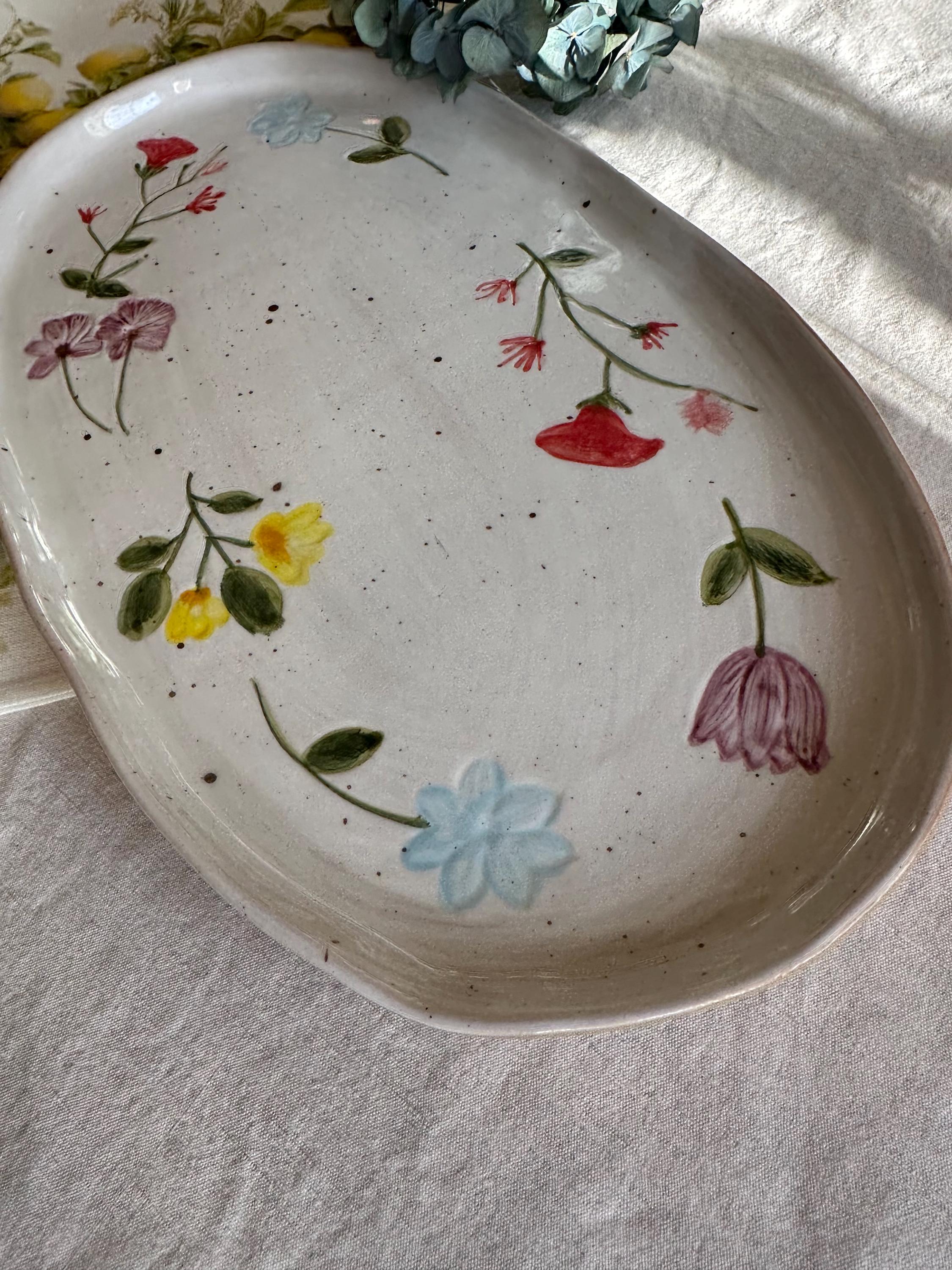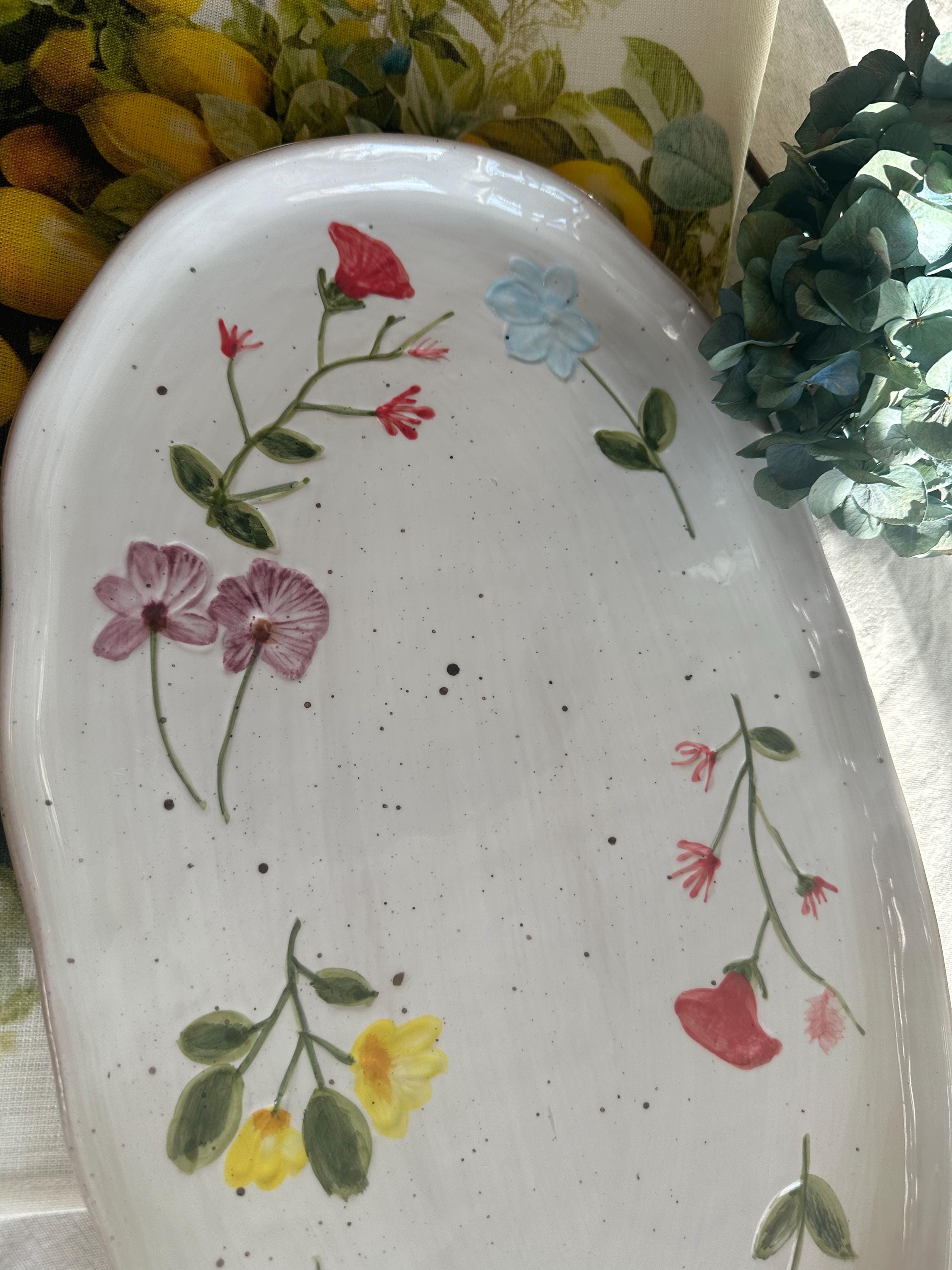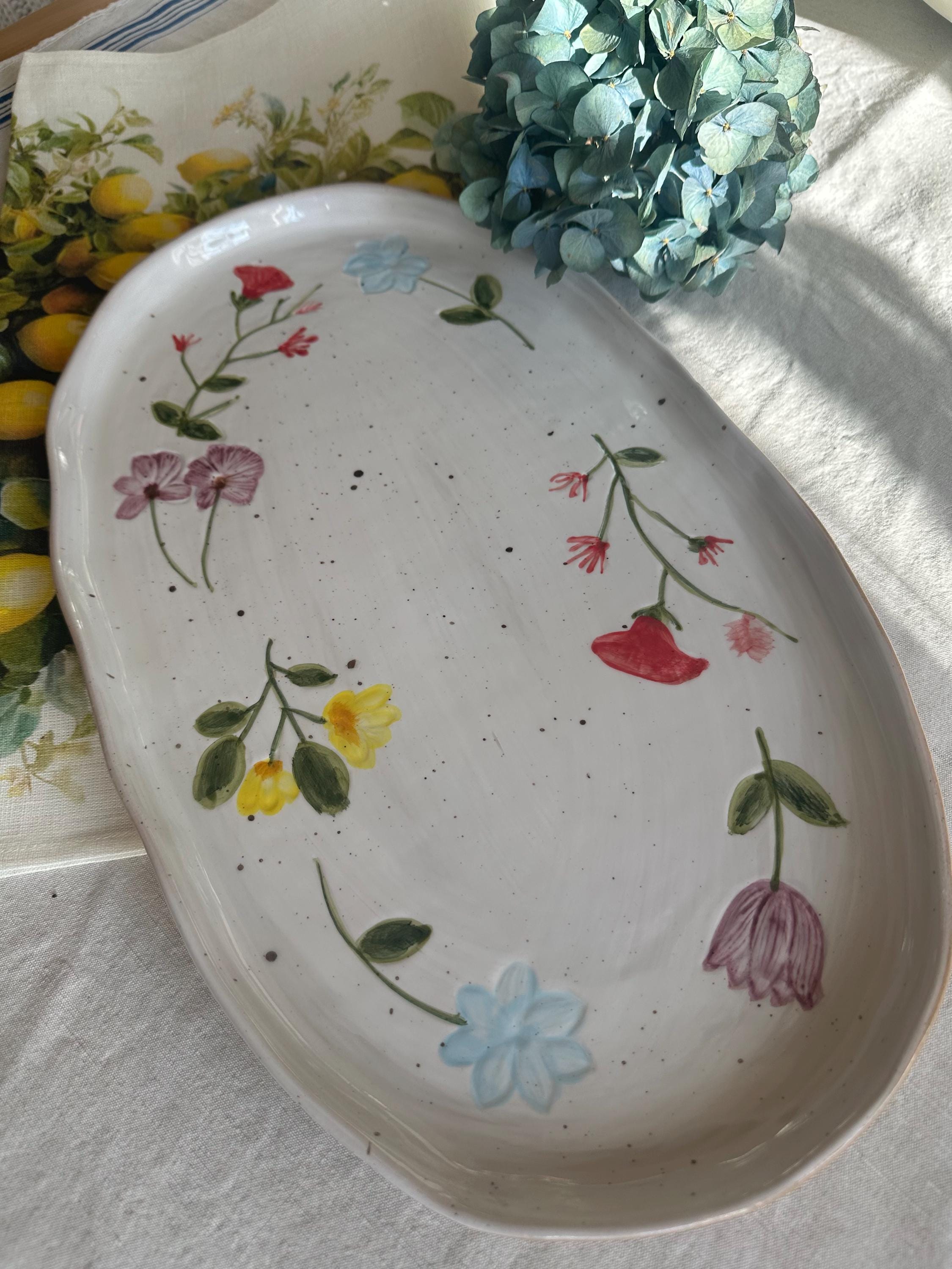 The Camilla serving platter from Creative Collection is a decorative stoneware plate featuring a hand-painted floral motif in beautiful, vibrant hues. The soft edges and hand-painted design lend it a charming look, making it ideal for both serving and display. The reactive glaze creates subtle variations in color and pattern, ensuring that each piece is unique.