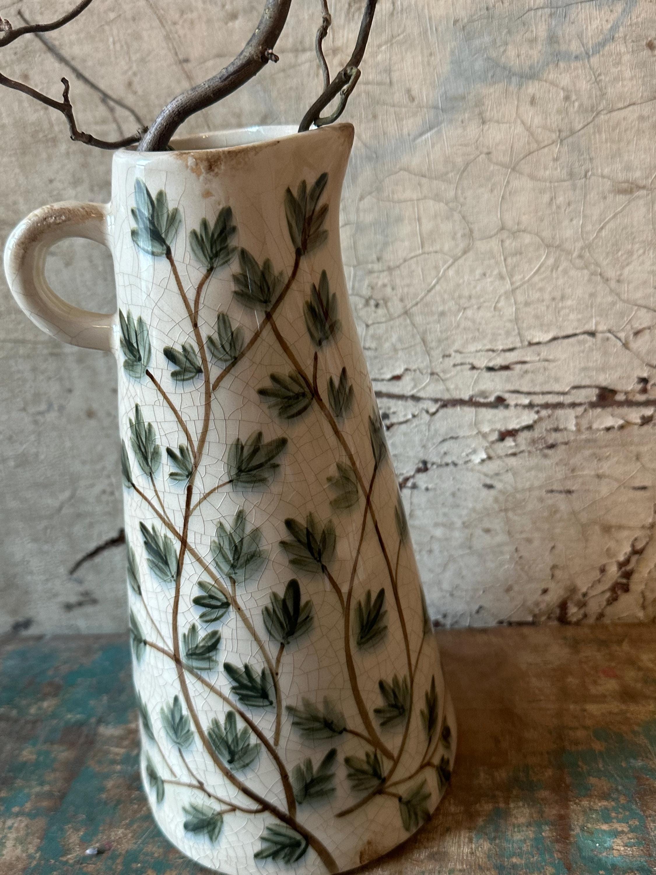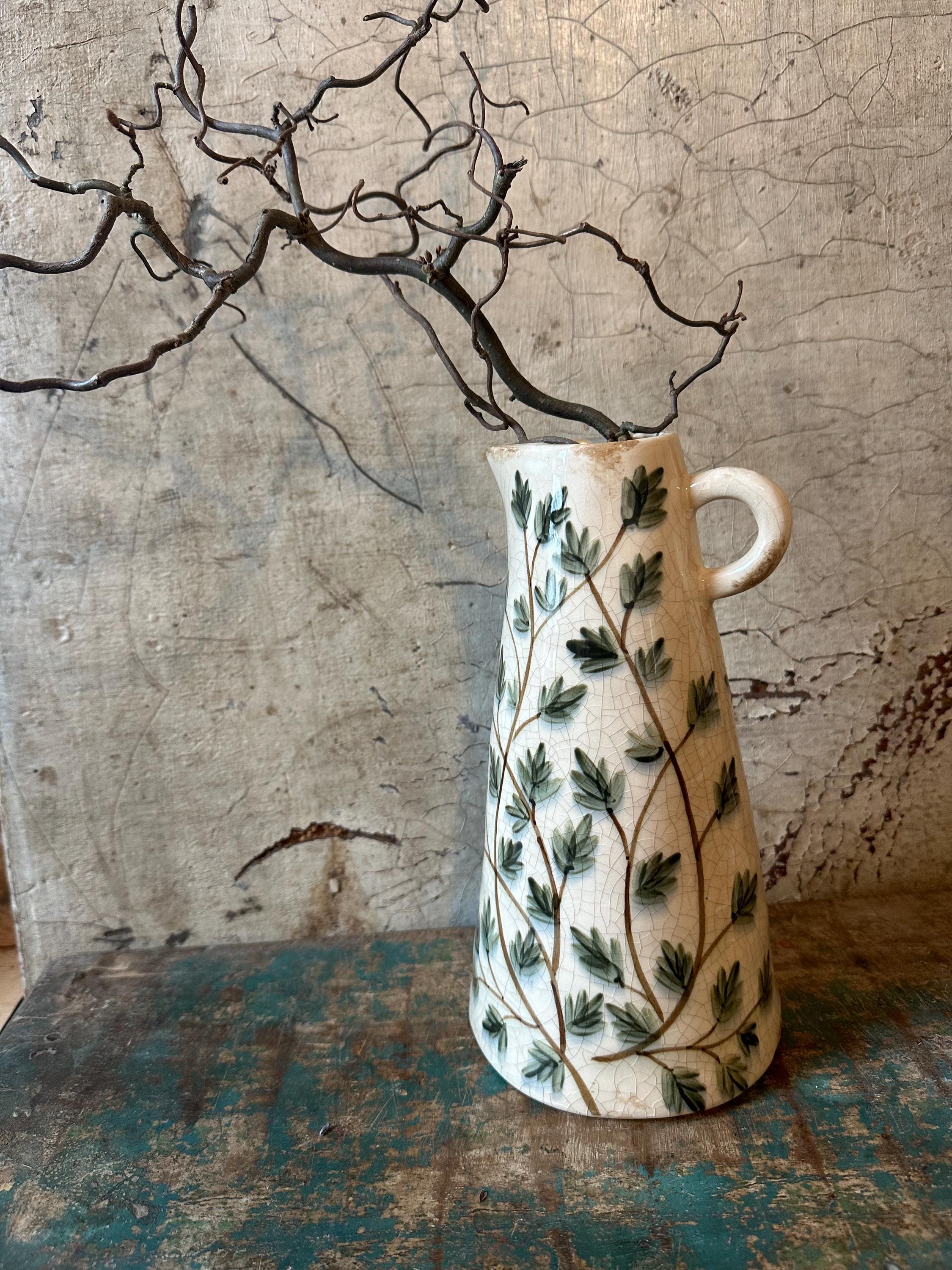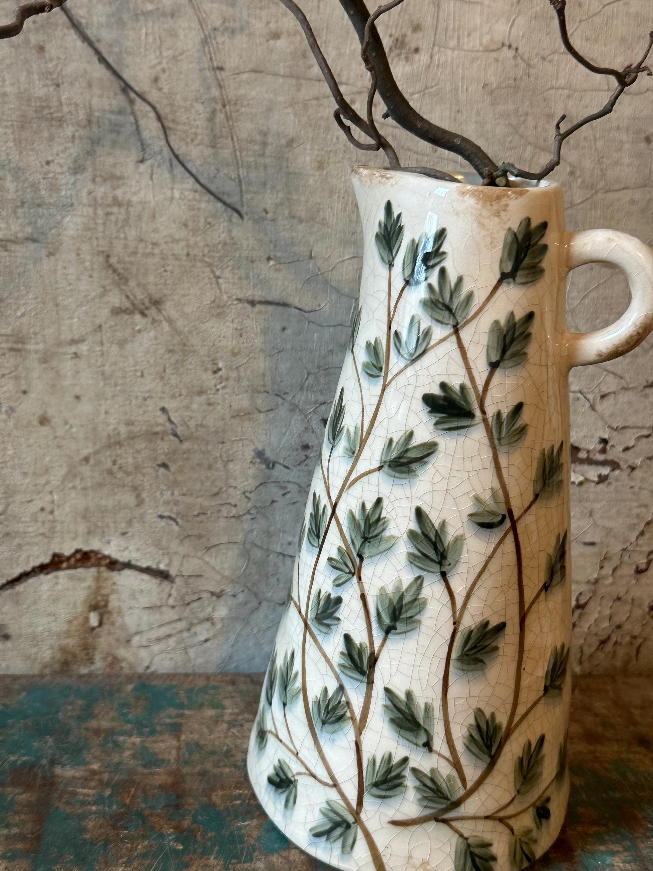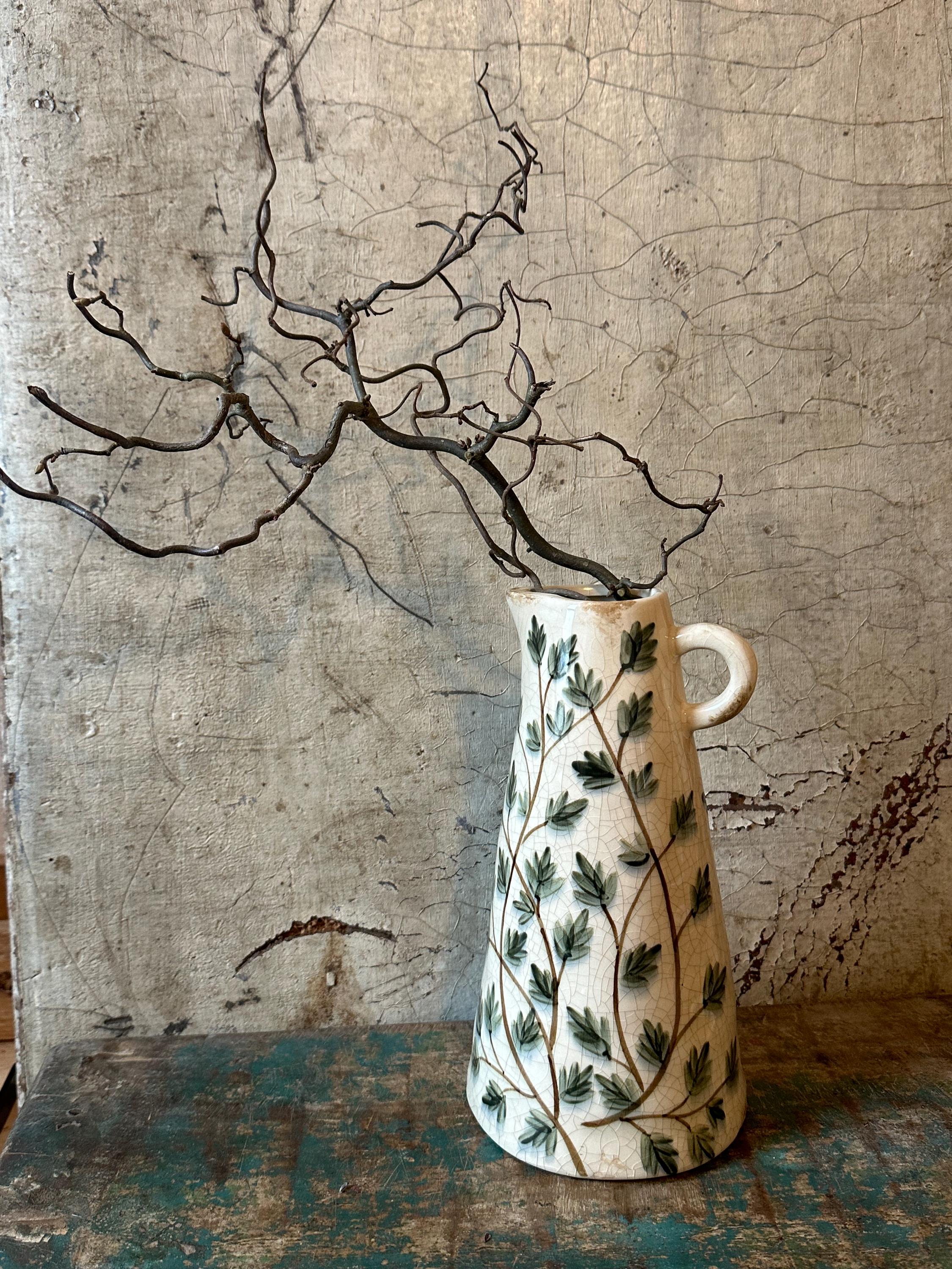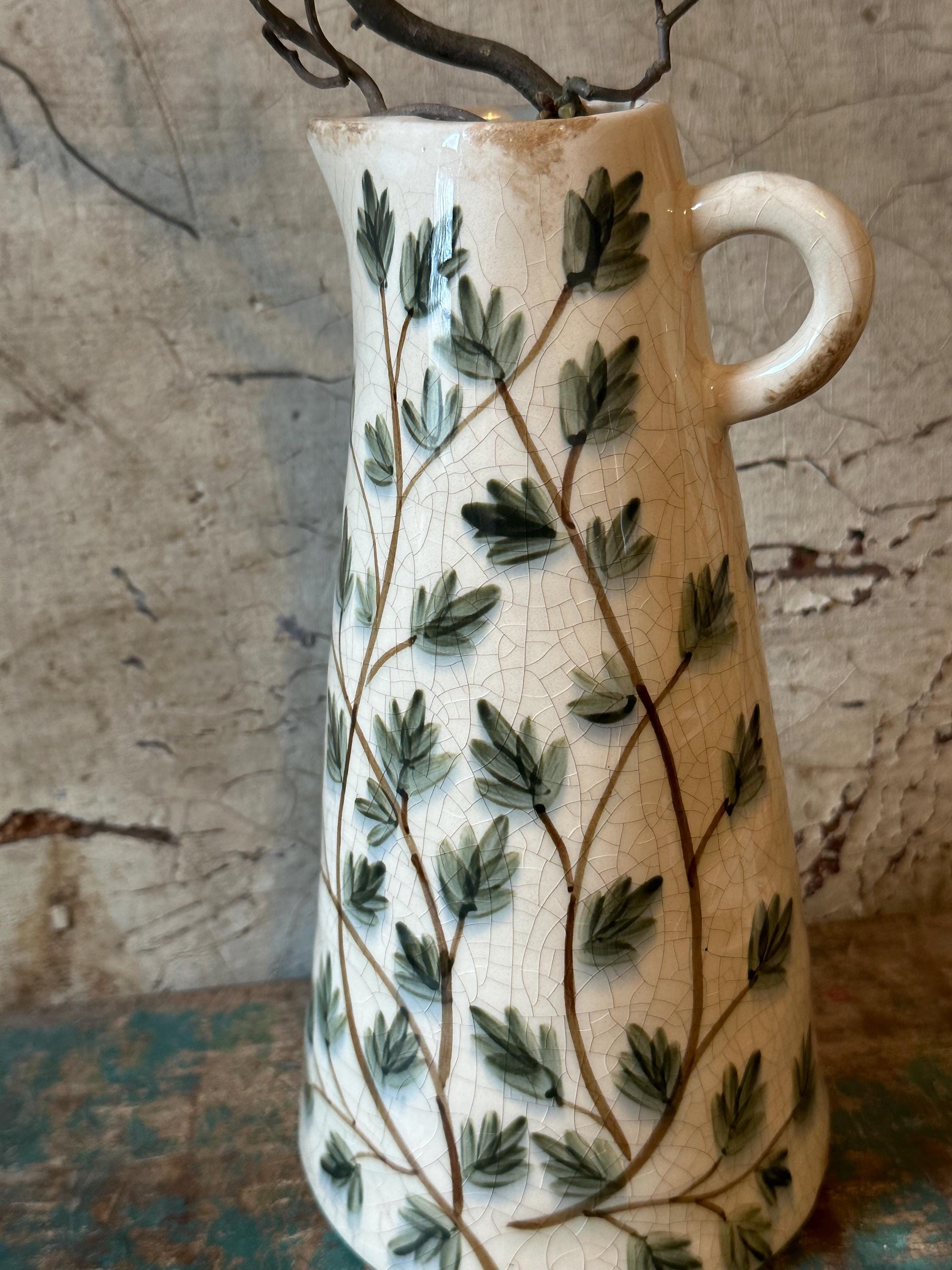 A ceramic jug - this enchanting jug is modeled after the Swedish country house look - a lovely leaf pattern combined with this beautiful old cracked patina, as if the jug were decades old - it evokes memories of bygone times and is a beautiful companion for fresh meadow bouquets, branches or dried grasses - create your own ambience.