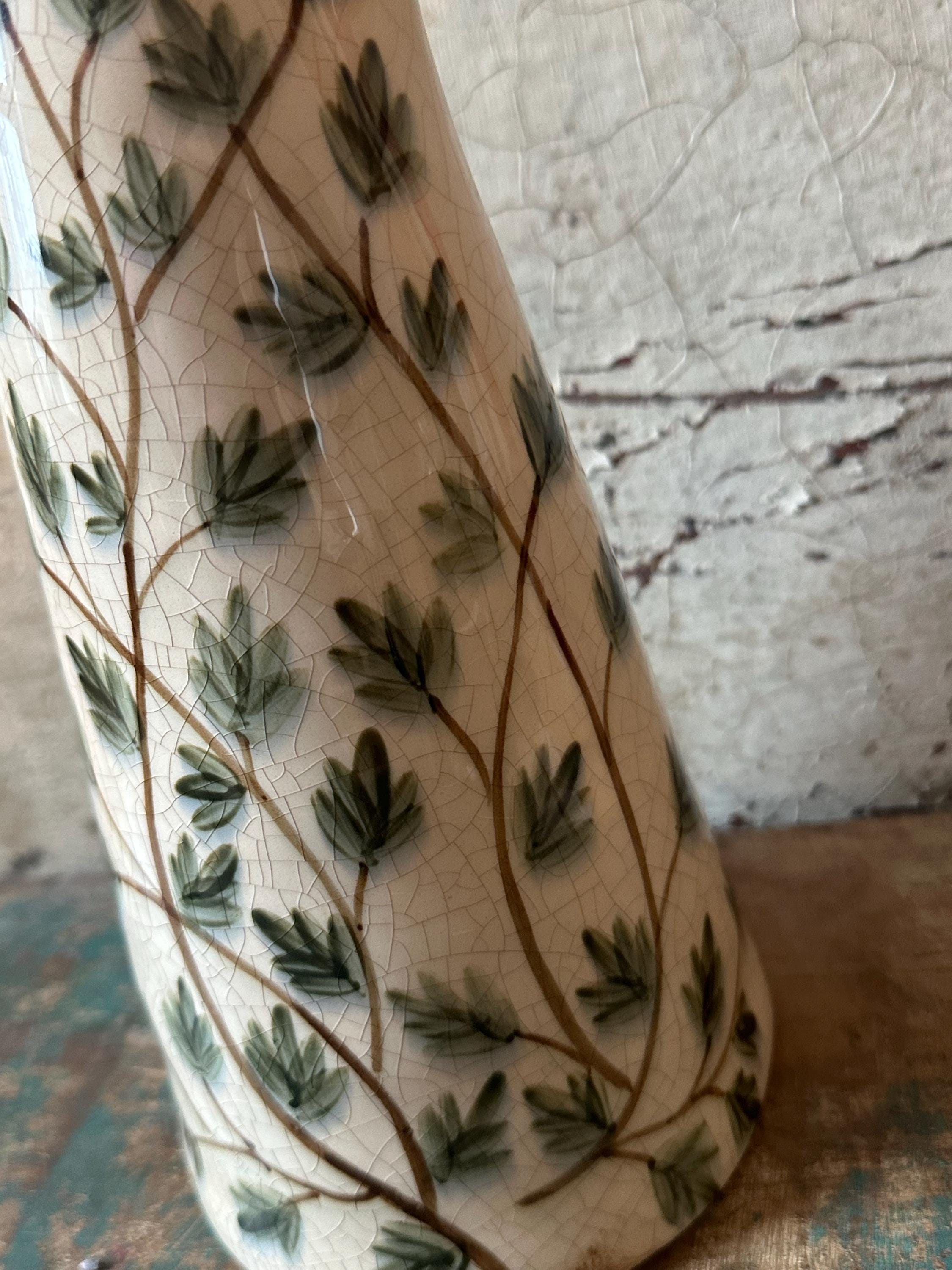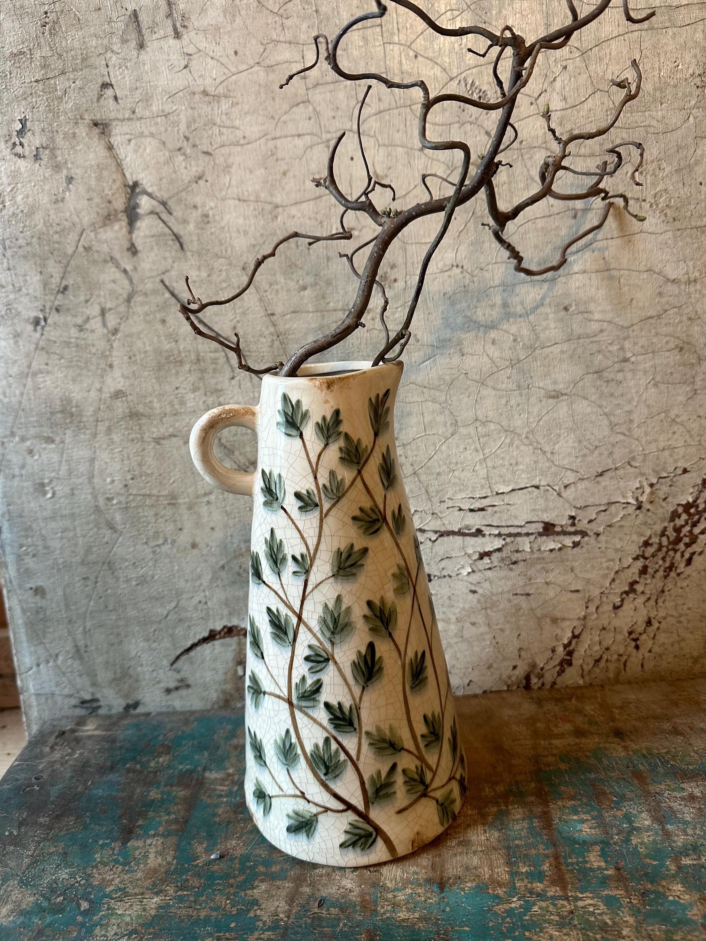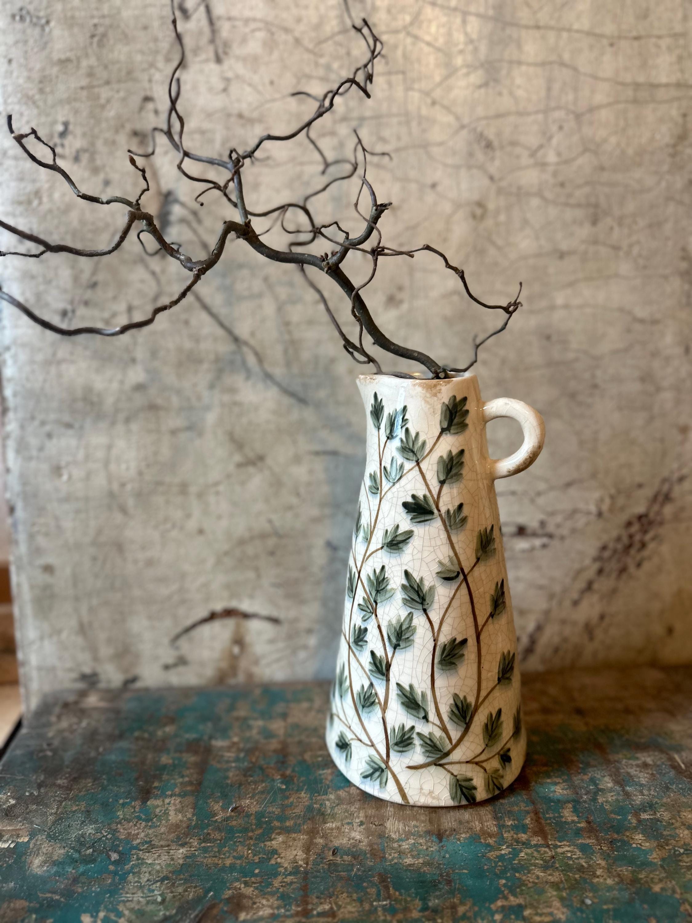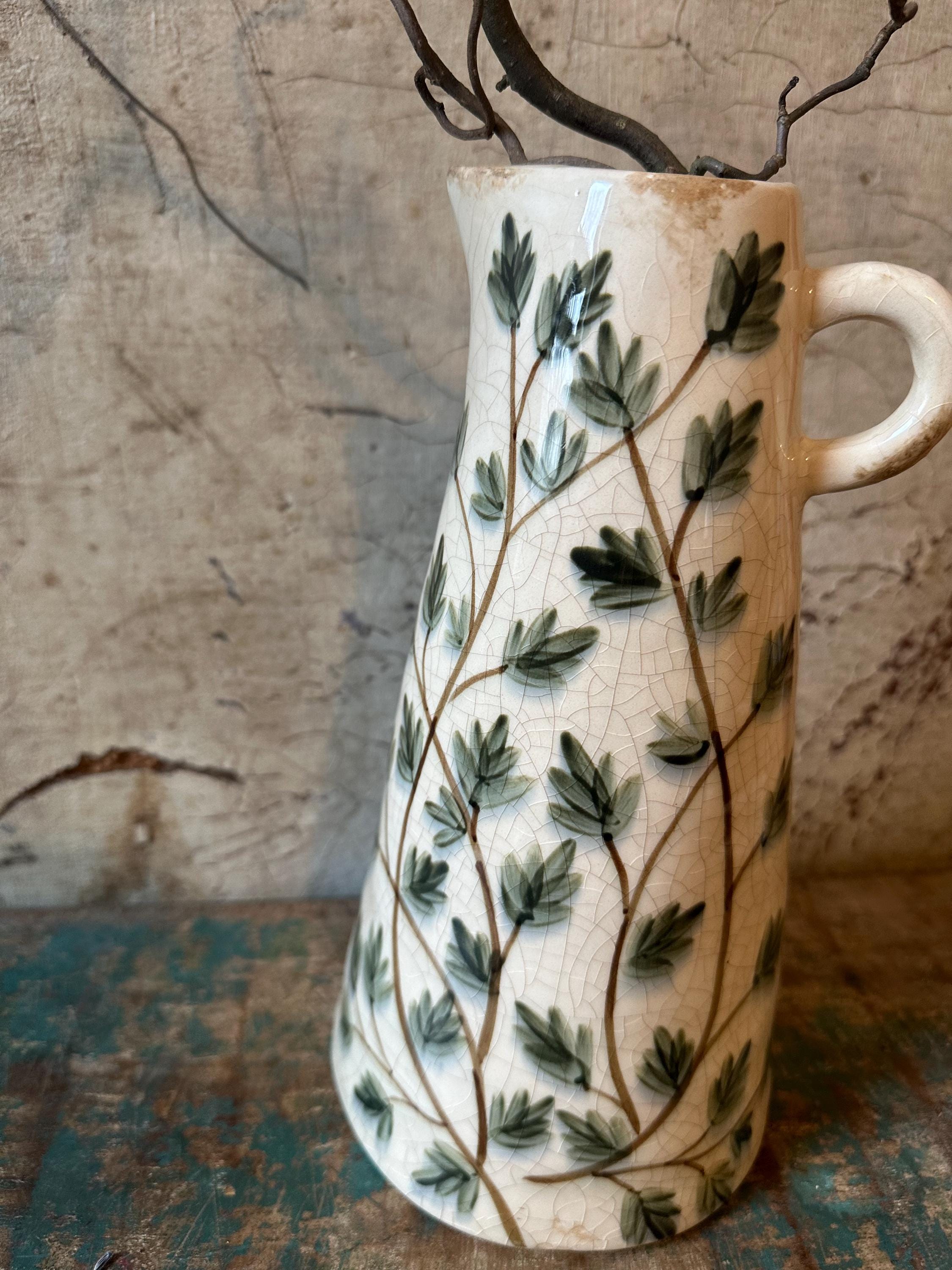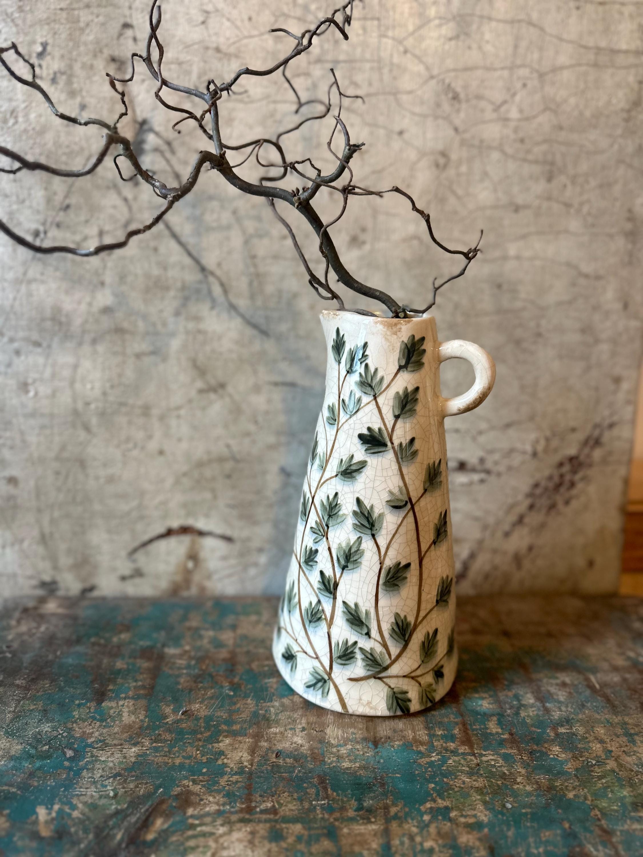 A ceramic jug - this enchanting jug is modeled after the Swedish country house look - a lovely leaf pattern combined with this beautiful old cracked patina, as if the jug were decades old - it evokes memories of bygone times and is a beautiful companion for fresh meadow bouquets, branches or dried grasses - create your own ambience.